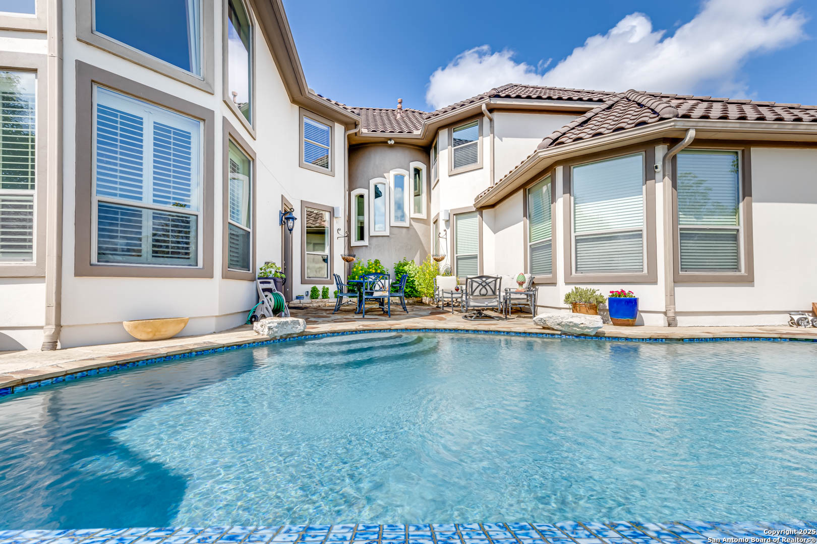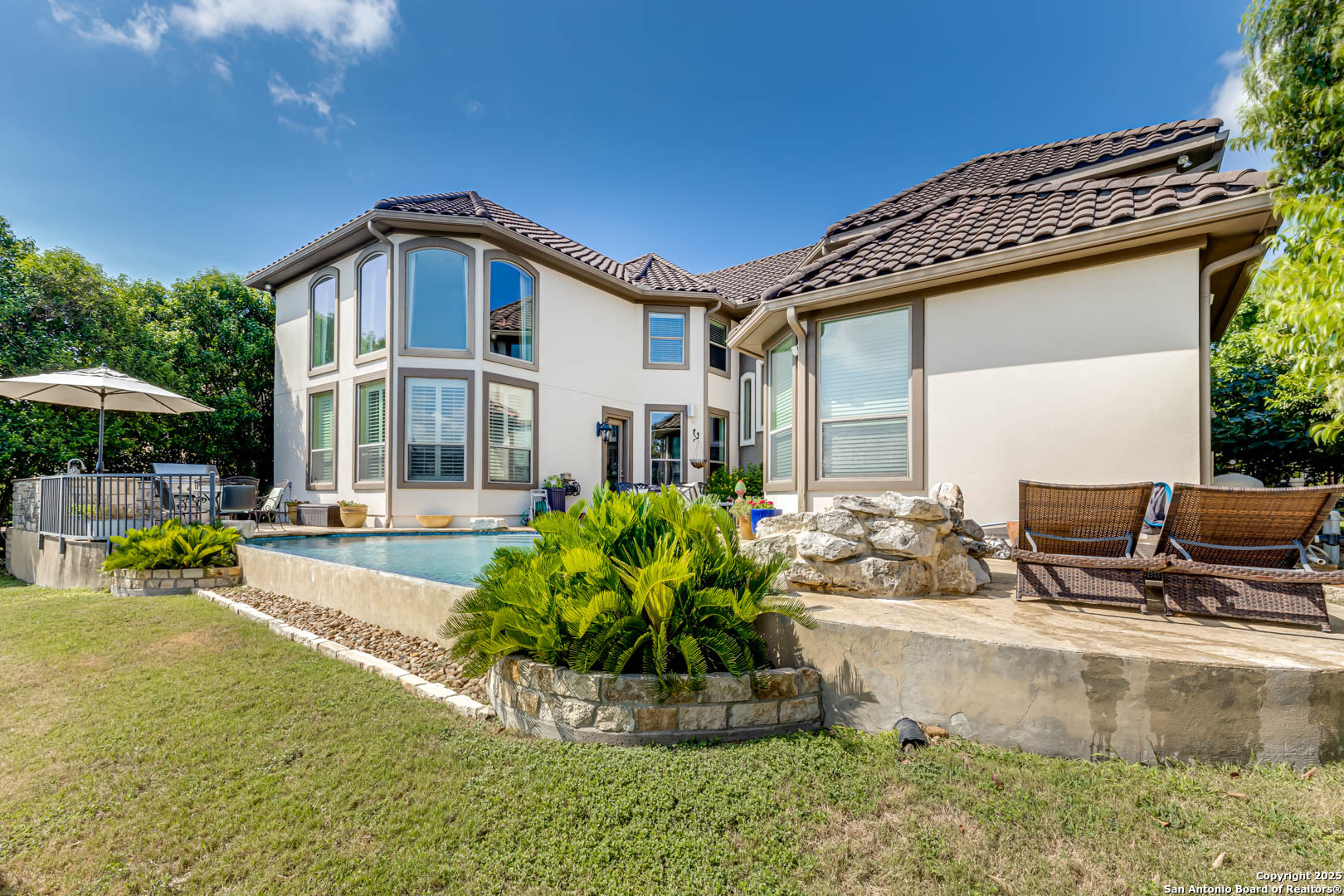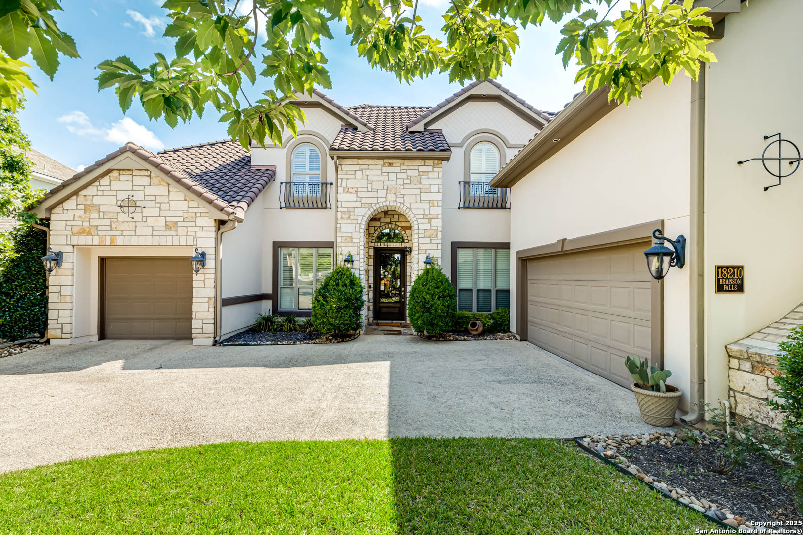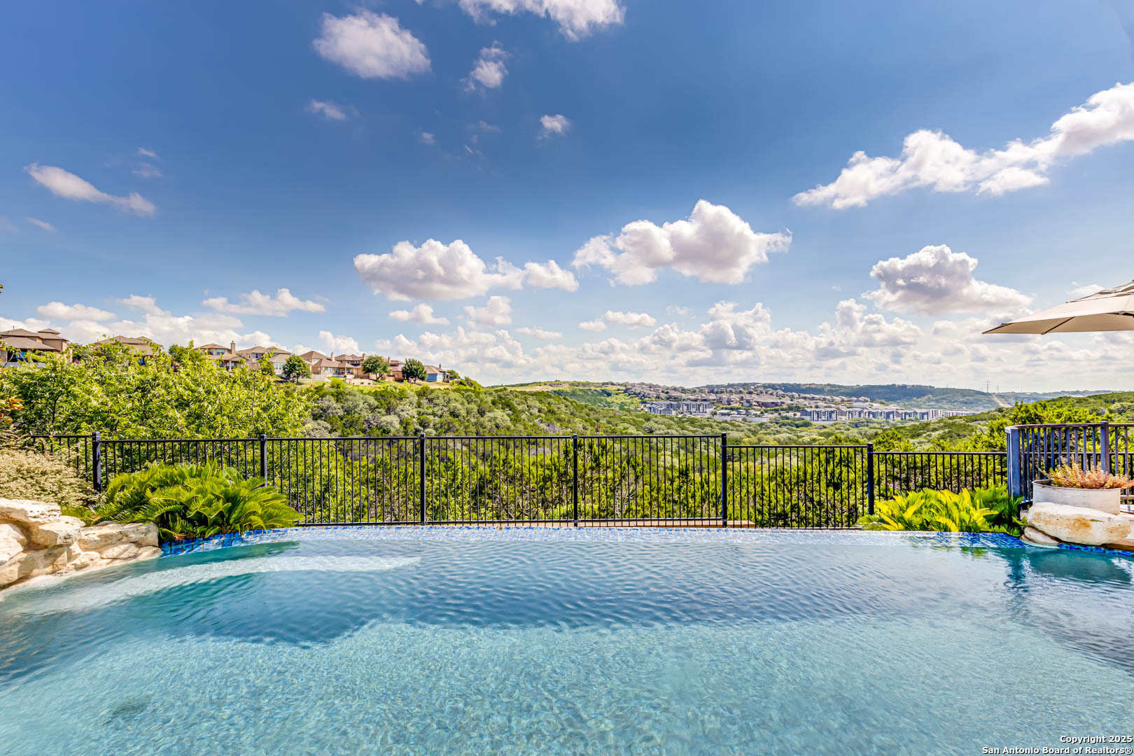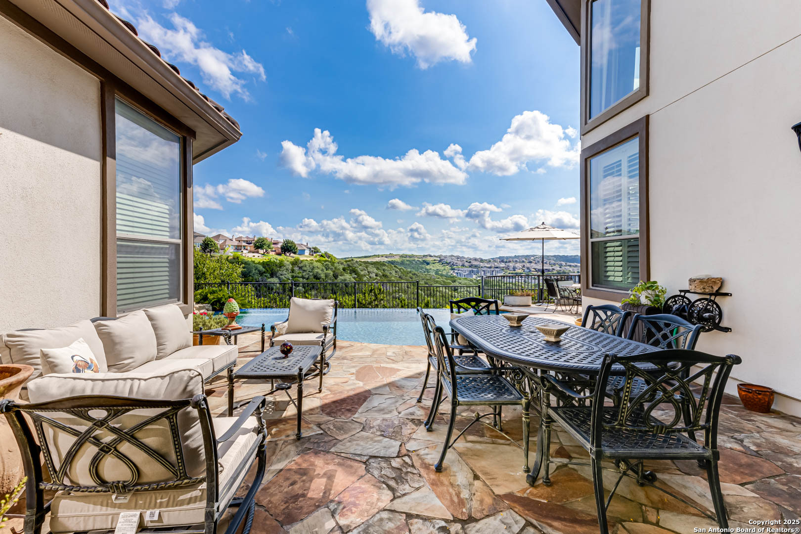 Step into luxury living with this Toll Brothers built estate located in the highly sought after gated community of Sonoma Verde. This is not your average listing. This is a statement home. With over 4500 square feet of elevated design and craftsmanship, 18210 Branson Falls is where elegance, comfort, and jaw dropping views come together in a way that stops buyers in their tracks. From the moment you pull up, the curb appeal sets the tone. Meticulously manicured landscaping, grand stone and stucco exterior, and a clay tile roof built to last decades. It is the kind of presence that commands attention. Walk through the front door and the high ceilings, natural light, custom plantation shutters and blinds, and grand staircase welcome you with serious wow factor. Every inch of this home was built to impress. It features four spacious bedrooms, plus a full sized dedicated office downstairs that offers a true work from home setup without sacrificing a bedroom. The luxurious primary suite is tucked away on the main floor and feels like a private retreat. The primary bath features dual vanities, a jetted tub, separate shower, and a walk in closet that can handle the wardrobe of someone who lives big. Upstairs, the home continues to deliver with a massive game room, oversized media room equipped with projector and screen, and three additional large bedrooms with ample closet space. The kitchen is a showstopper. Forty two inch cabinets, double oven, gas cooktop, expansive island, and open sightlines that make entertaining seamless. Whether it is a holiday dinner or casual breakfast, this kitchen is where everyone will want to gather. The open layout flows effortlessly into the living area, complete with fireplace, custom finishes, and a wall of windows looking out to your private slice of heaven. Now let's talk about the backyard. This is the one. Hands down one of the best views in all of San Antonio. You get bluff top scenery that stretches for miles, and it is all yours. Step outside and it feels like you have been transported to a luxury resort. The backyard features a custom pool with waterfall feature, built in outdoor kitchen, flagstone patio, wrought iron fencing, and lush landscaping that creates the kind of outdoor space that makes you want to entertain every weekend. Sunrise coffees, sunset dinners, late night swims. You can live outside here and never get tired of the view. Additional features include a water softener system, updated water heaters, main floor laundry room with natural light, private study with French doors, and a spacious three car garage. Every detail has been thought through. This home is not just beautiful. It is functional, practical, and built for someone who lives with intention and style. The Ridge at Sonoma Verde is one of the premier gated communities in the city. You are zoned to top tier NISD schools, minutes from La Cantera, The Rim, golf courses, and major employers, yet tucked away enough to enjoy peace and privacy. When people say location is everything, this is what they mean. This home checks every box. Luxury build. Immaculate condition. Elite neighborhood. And that view. This is not a listing that gets overlooked. This is the one they remember. Serious buyers only. This is where elevated living begins.