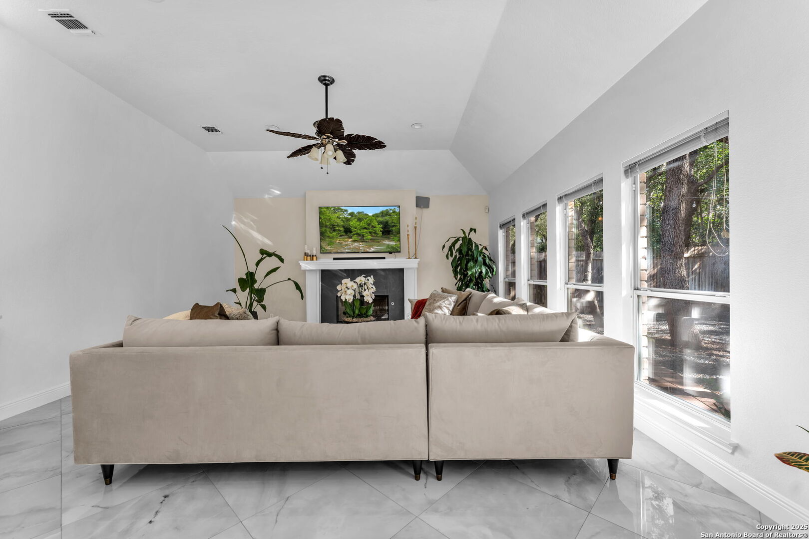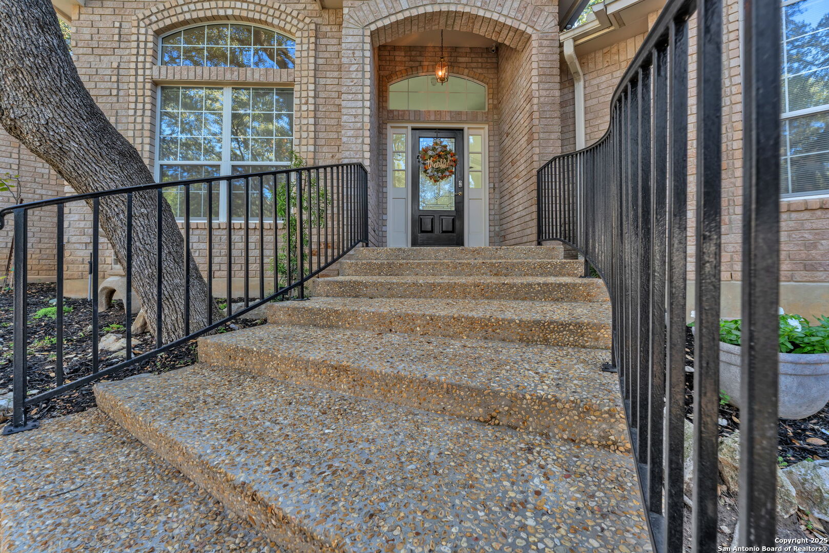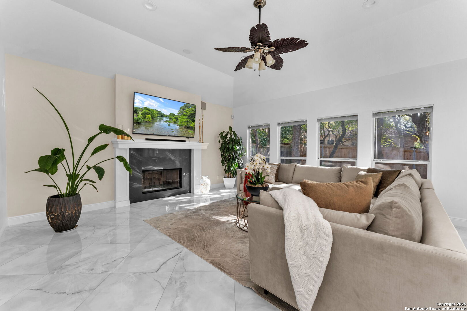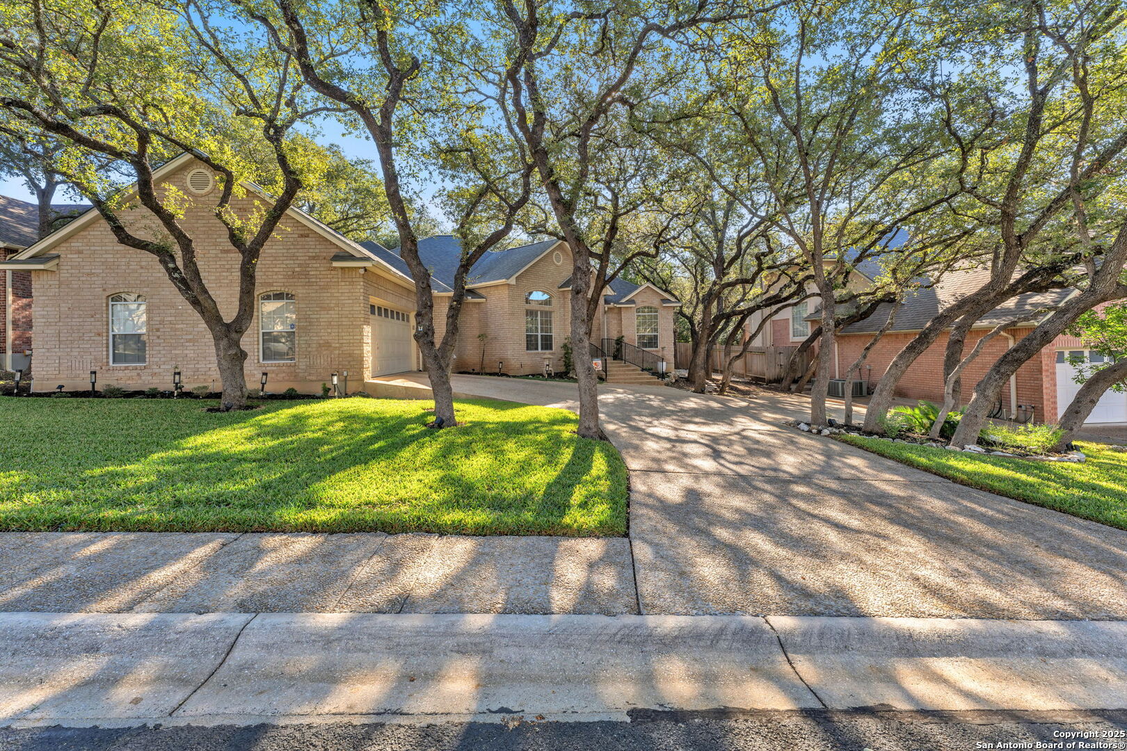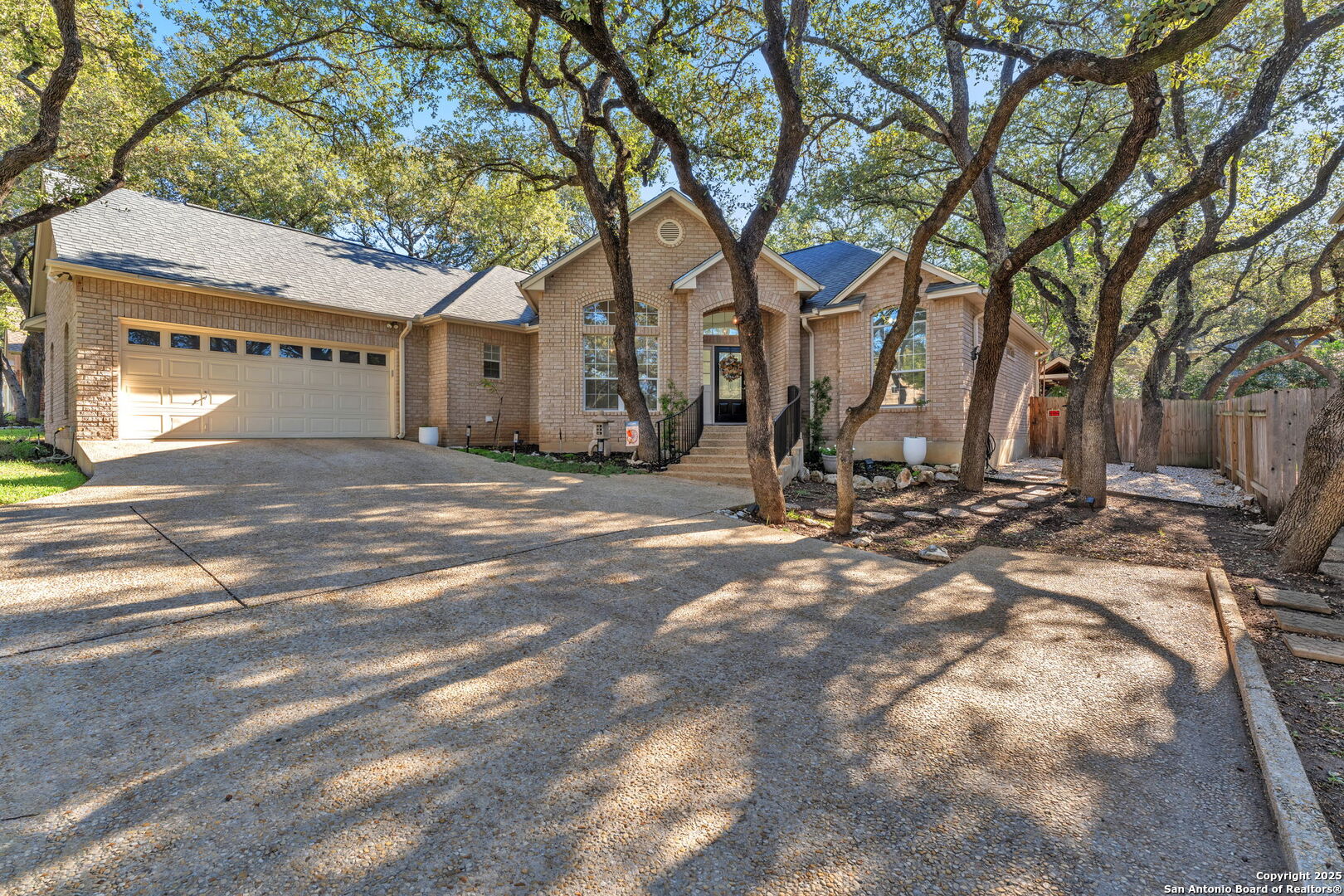 Welcome to this beautifully maintained single-story residence located in the prestigious, guard-gated community of Emerald Forest. Offering approximately 2,439 square feet of living space, this home sits on a generous, tree-shaded lot and combines timeless curb appeal with thoughtful modern updates. Inside, you'll find a spacious open floor plan designed for both everyday living and entertaining. The living area features vaulted ceilings, a cozy fireplace, and large picture windows that fill the home with natural light, creating a warm and inviting atmosphere. The kitchen has been tastefully updated with custom cabinetry, quartz countertops, and premium ceramic tile flooring, providing both style and function. Adjacent to the kitchen, the dining area offers an elegant space for family meals or gatherings with friends. The primary suite is privately situated and serves as a relaxing retreat with a large walk-in closet and a spa-inspired bath showcasing dual vanities, a soaking tub, and a separate shower. Two additional bedrooms provide flexibility for guests, a home office, or hobby space, each complemented by an updated full bath. Outside, enjoy a well-landscaped yard with mature trees and an oversized deck, perfect for outdoor dining, entertaining, or simply unwinding in the peaceful surroundings. The property has been lovingly cared for, with a newer roof, fresh exterior paint, and meticulous attention to detail throughout. Located within Emerald Forest, residents enjoy a secure, guard-gated environment and access to community amenities including a pool, tennis courts, sports courts, walking trails, and a clubhouse. The neighborhood's convenient North San Antonio location offers easy access to shopping, dining, highly rated schools, and major highways, ensuring comfort and convenience without sacrificing tranquility. Combining modern updates, classic design, and a premier location, 18210 Crystal Ridge Dr. is an exceptional opportunity to own a move-in-ready home in one of San Antonio's most desirable gated communities.