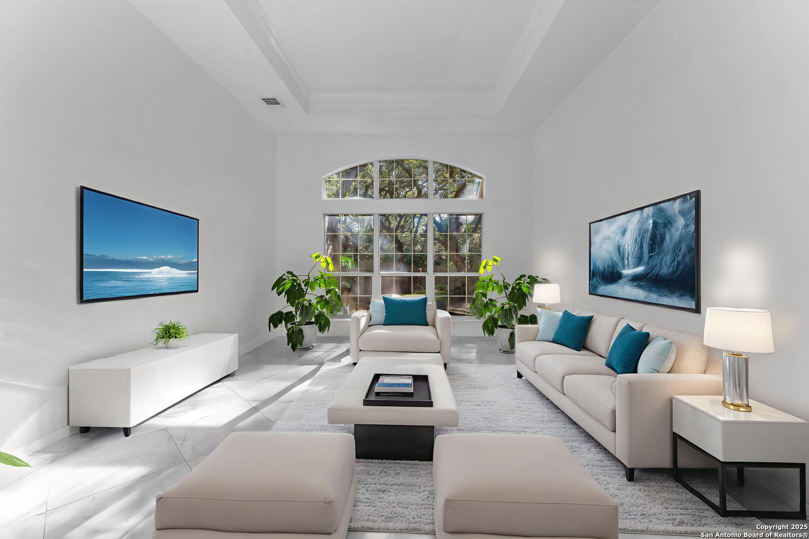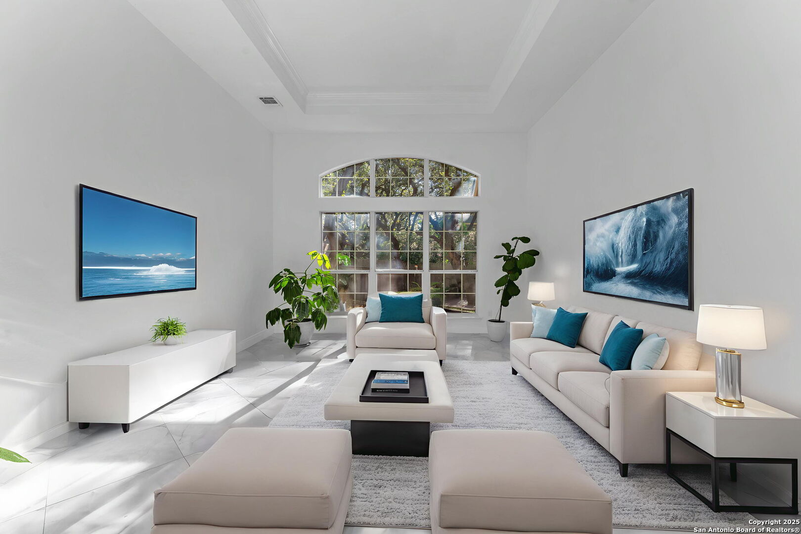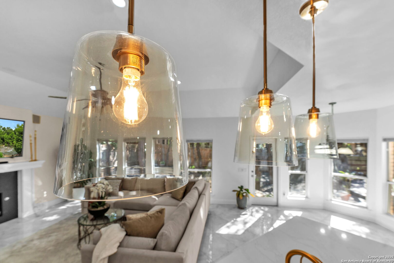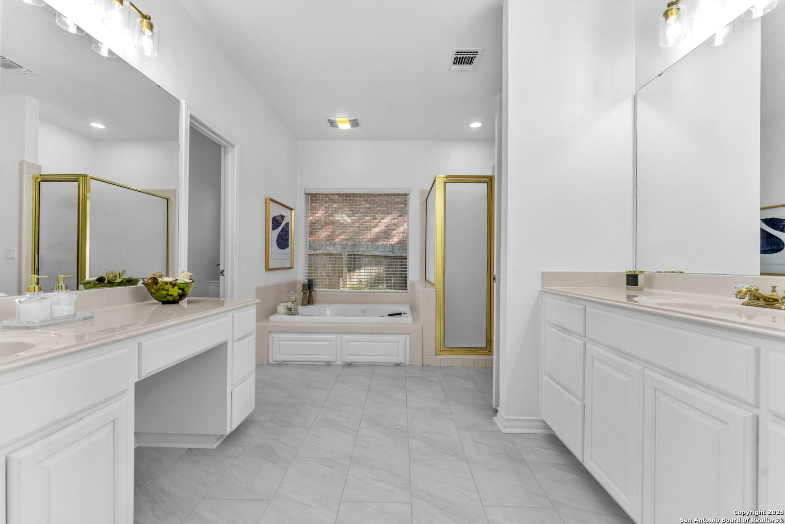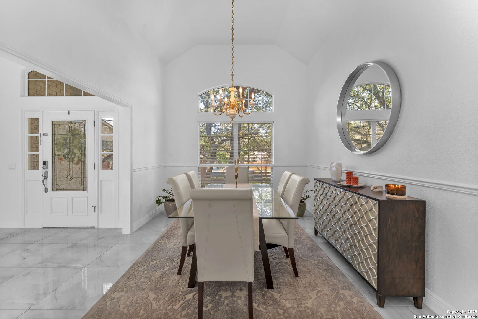 Welcome to this beautifully maintained single-story residence located in the prestigious, guard-gated community of Emerald Forest. Offering approximately 2,439 square feet of living space, this home sits on a generous, tree-shaded lot and combines timeless curb appeal with thoughtful modern updates. Inside, you'll find a spacious open floor plan designed for both everyday living and entertaining. The living area features vaulted ceilings, a cozy fireplace, and large picture windows that fill the home with natural light, creating a warm and inviting atmosphere. The kitchen has been tastefully updated with custom cabinetry, quartz countertops, and premium ceramic tile flooring, providing both style and function. Adjacent to the kitchen, the dining area offers an elegant space for family meals or gatherings with friends. The primary suite is privately situated and serves as a relaxing retreat with a large walk-in closet and a spa-inspired bath showcasing dual vanities, a soaking tub, and a separate shower. Two additional bedrooms provide flexibility for guests, a home office, or hobby space, each complemented by an updated full bath. Outside, enjoy a well-landscaped yard with mature trees and an oversized deck, perfect for outdoor dining, entertaining, or simply unwinding in the peaceful surroundings. The property has been lovingly cared for, with a newer roof, fresh exterior paint, and meticulous attention to detail throughout. Located within Emerald Forest, residents enjoy a secure, guard-gated environment and access to community amenities including a pool, tennis courts, sports courts, walking trails, and a clubhouse. The neighborhood's convenient North San Antonio location offers easy access to shopping, dining, highly rated schools, and major highways, ensuring comfort and convenience without sacrificing tranquility. Combining modern updates, classic design, and a premier location, 18210 Crystal Ridge Dr. is an exceptional opportunity to own a move-in-ready home in one of San Antonio's most desirable gated communities.