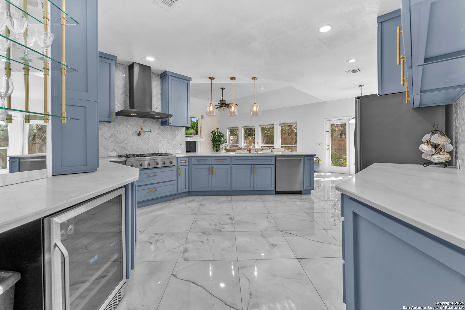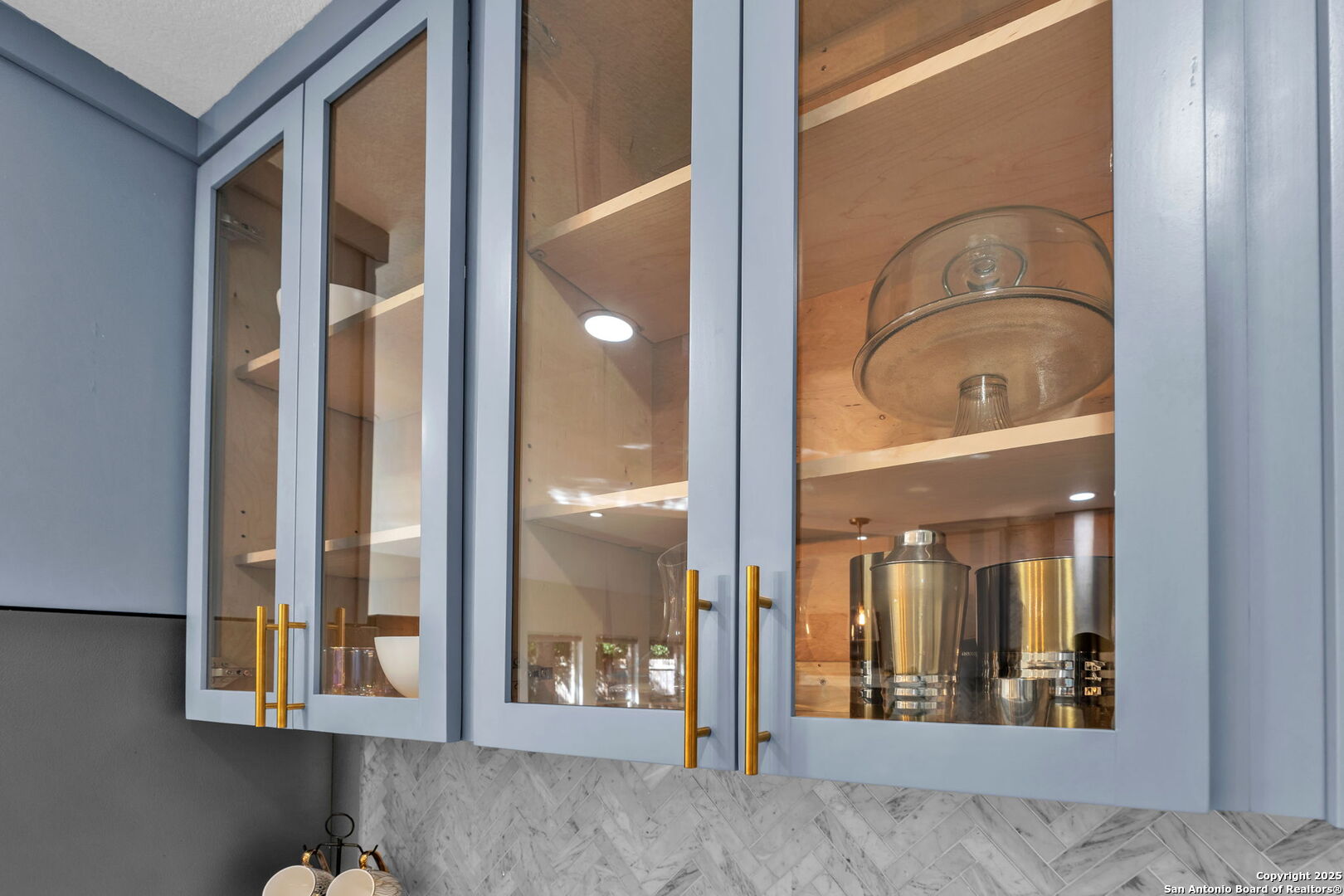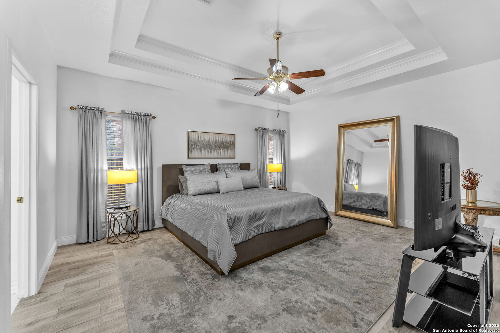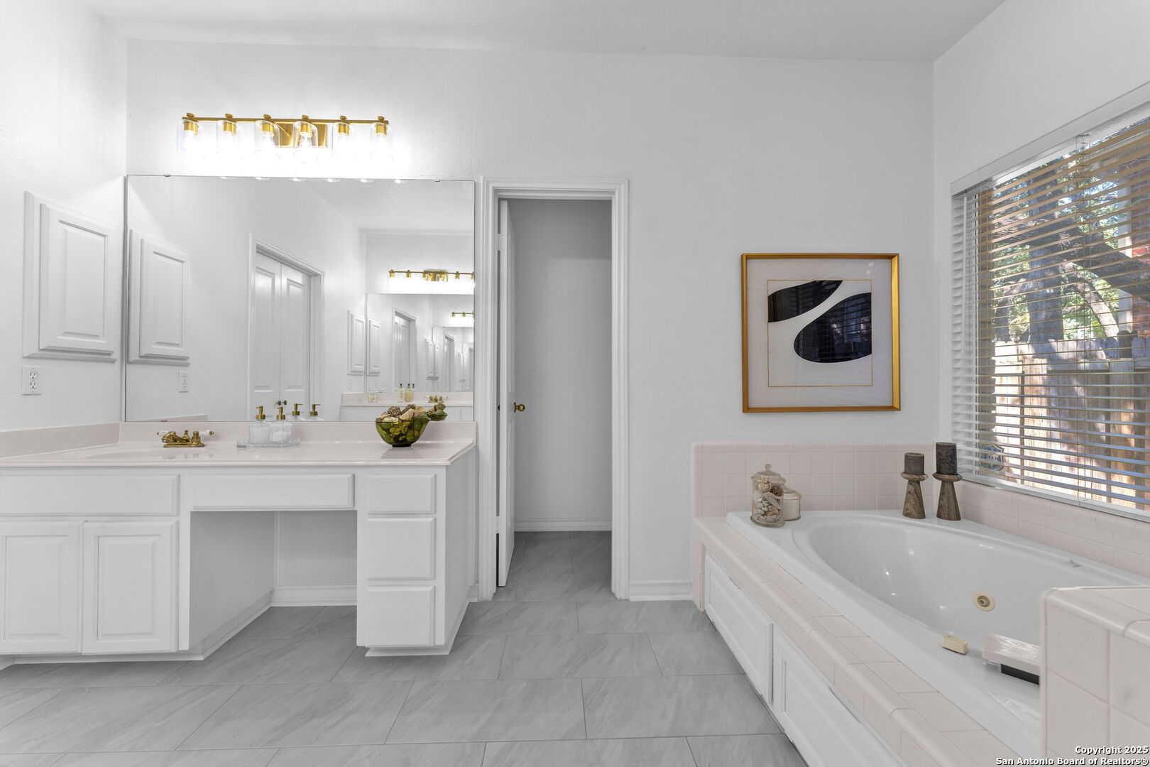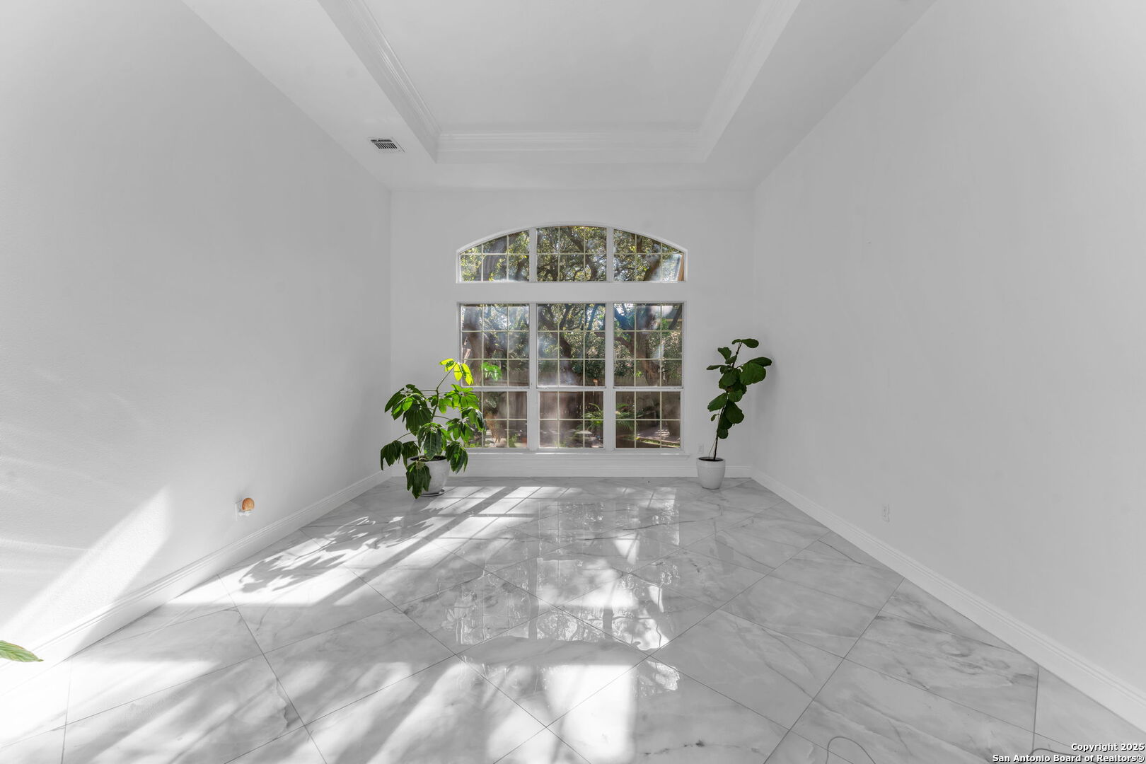 Welcome to this beautifully maintained single-story residence located in the prestigious, guard-gated community of Emerald Forest. Offering approximately 2,439 square feet of living space, this home sits on a generous, tree-shaded lot and combines timeless curb appeal with thoughtful modern updates. Inside, you'll find a spacious open floor plan designed for both everyday living and entertaining. The living area features vaulted ceilings, a cozy fireplace, and large picture windows that fill the home with natural light, creating a warm and inviting atmosphere. The kitchen has been tastefully updated with custom cabinetry, quartz countertops, and premium ceramic tile flooring, providing both style and function. Adjacent to the kitchen, the dining area offers an elegant space for family meals or gatherings with friends. The primary suite is privately situated and serves as a relaxing retreat with a large walk-in closet and a spa-inspired bath showcasing dual vanities, a soaking tub, and a separate shower. Two additional bedrooms provide flexibility for guests, a home office, or hobby space, each complemented by an updated full bath. Outside, enjoy a well-landscaped yard with mature trees and an oversized deck, perfect for outdoor dining, entertaining, or simply unwinding in the peaceful surroundings. The property has been lovingly cared for, with a newer roof, fresh exterior paint, and meticulous attention to detail throughout. Located within Emerald Forest, residents enjoy a secure, guard-gated environment and access to community amenities including a pool, tennis courts, sports courts, walking trails, and a clubhouse. The neighborhood's convenient North San Antonio location offers easy access to shopping, dining, highly rated schools, and major highways, ensuring comfort and convenience without sacrificing tranquility. Combining modern updates, classic design, and a premier location, 18210 Crystal Ridge Dr. is an exceptional opportunity to own a move-in-ready home in one of San Antonio's most desirable gated communities.
