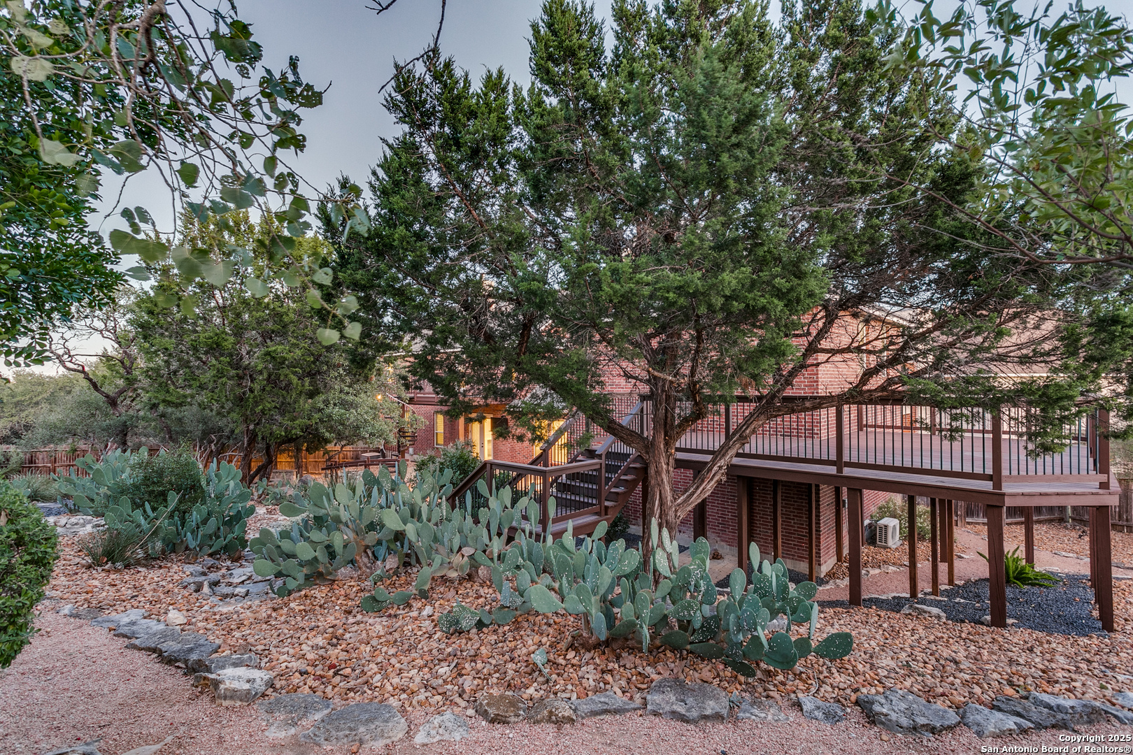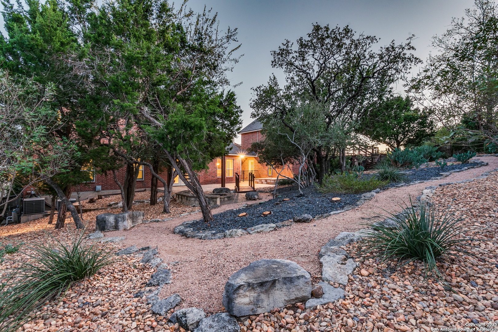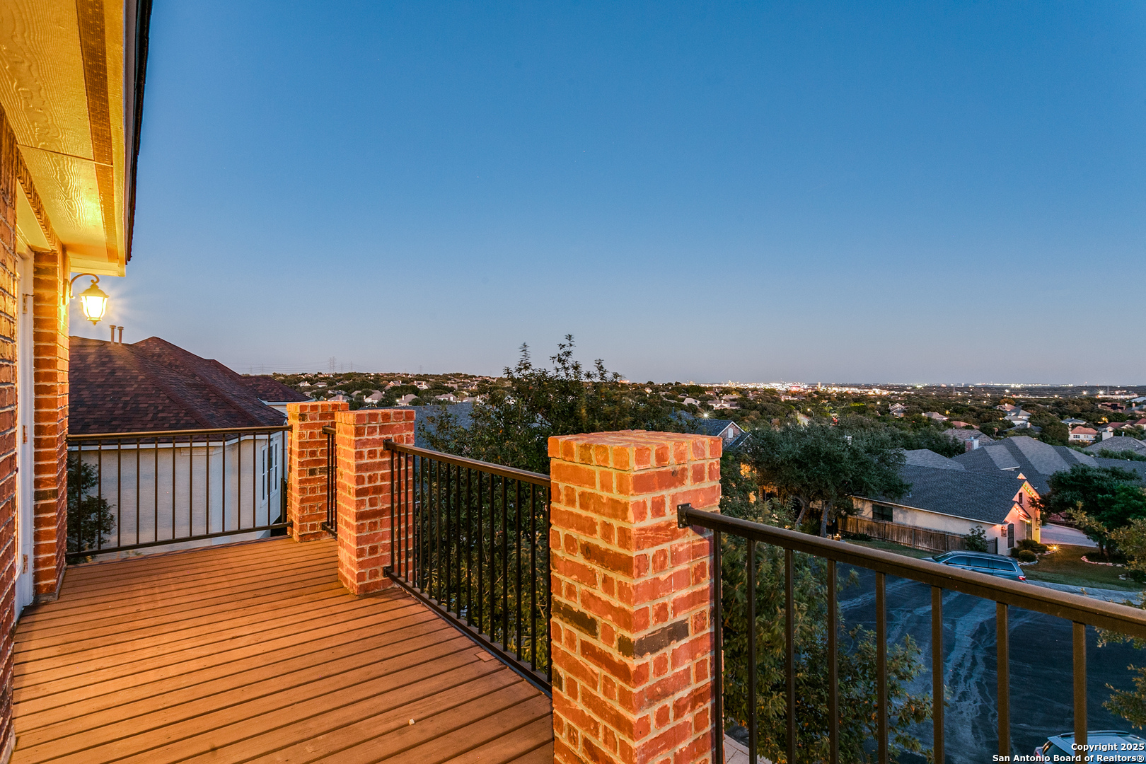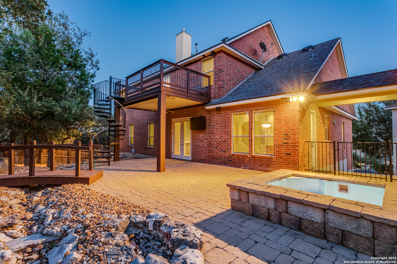Nestled on an elevated cul-de-sac, this custom-built brick home offers flexibility and private spaces alike, along with a detached apartment! Enter into a welcoming vestibule with a private office and formal dining room on either side. Open family room with fireplace adjoins the spacious island kitchen with separate breakfast area, overlooking the green space outside. Powder room and a spacious primary suite complete this spacious first floor. Upstairs, an open game room with rear balcony with stair descends to the exterior lot, while the guest suite has downtown skyline views. A custom studio space (Bedroom 3)-formerly bedrooms 3 & 4-could easily be converted back, if needed. The oversized 2-car detached garage is topped by an efficient 528 SF apartment-21x21 ADDW-, accessed by an interior stair lift. An additional balcony, hot tub, fire pit, and wooden footbridge over a recirculating water feature make the yard a relaxing and unique getaway. Neighborhood is in highly ranked Northside school district, with Rogers Ranch and Point Bluff neighborhood amenities, and nearby shopping. End 2025 on a high note by calling this handsome property your new home.