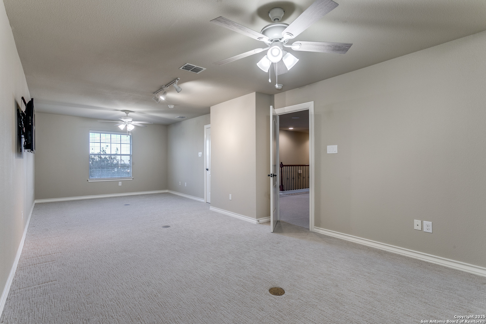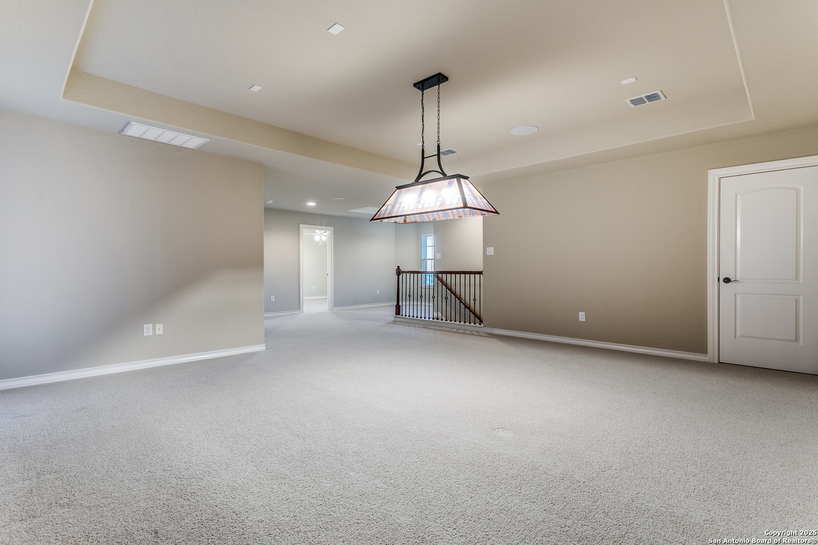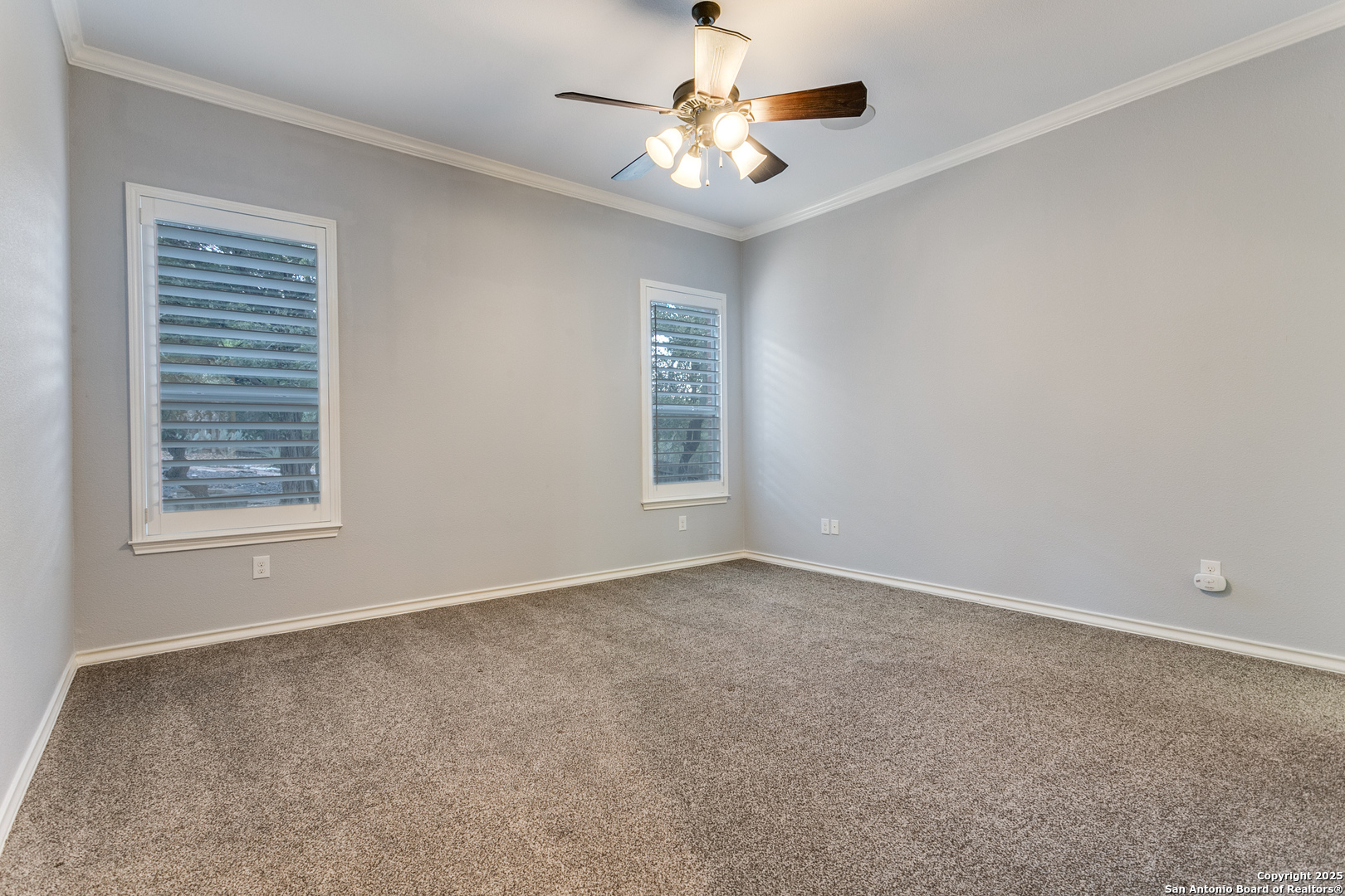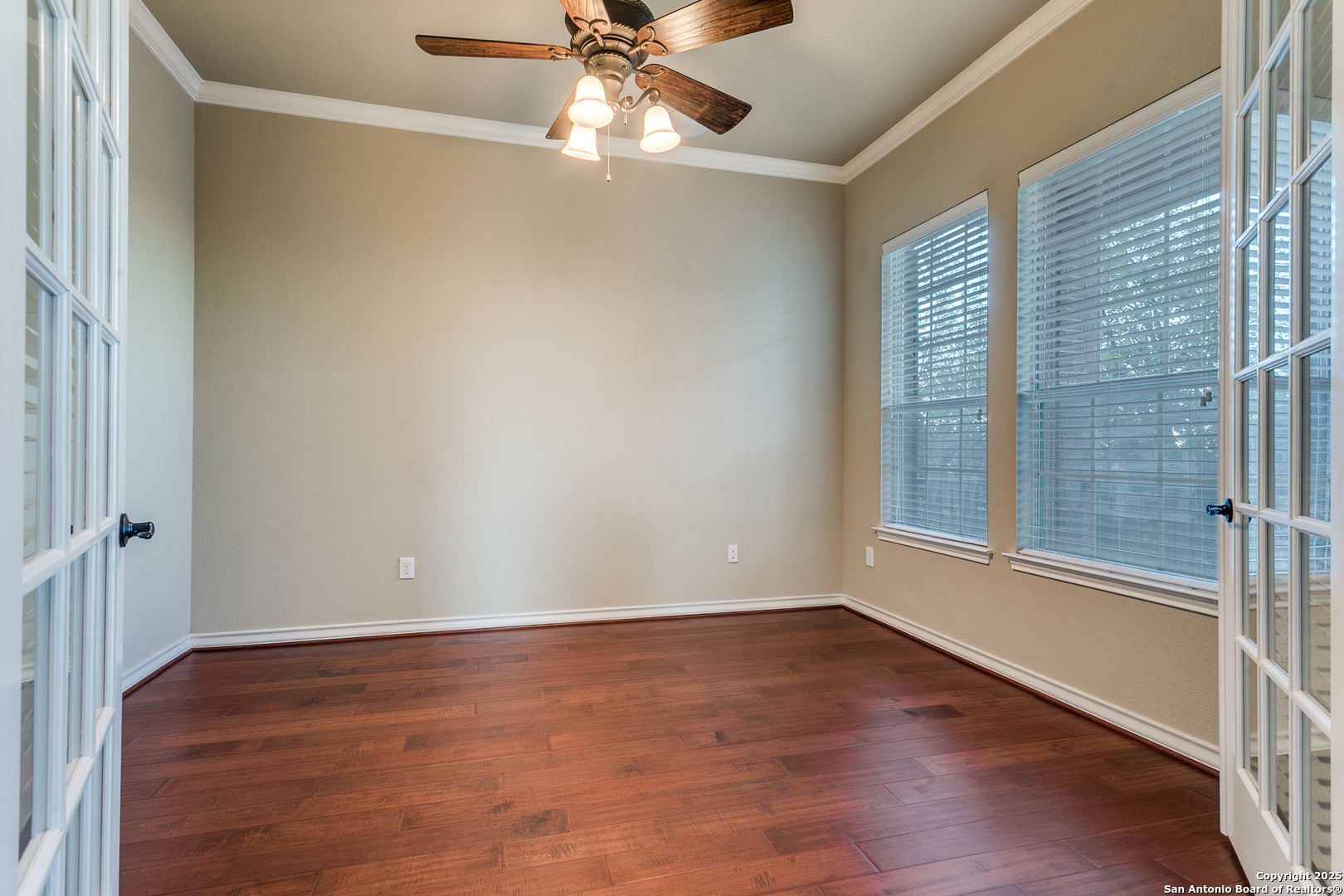 Nestled on an elevated cul-de-sac, this custom-built brick home offers flexibility and private spaces alike, along with a detached apartment! Enter into a welcoming vestibule with a private office and formal dining room on either side. Open family room with fireplace adjoins the spacious island kitchen with separate breakfast area, overlooking the green space outside. Powder room and a spacious primary suite complete this spacious first floor. Upstairs, an open game room with rear balcony with stair descends to the exterior lot, while the guest suite has downtown skyline views. A custom studio space (Bedroom 3)-formerly bedrooms 3 & 4-could easily be converted back, if needed. The oversized 2-car detached garage is topped by an efficient 528 SF apartment-21x21 ADDW-, accessed by an interior stair lift. An additional balcony, hot tub, fire pit, and wooden footbridge over a recirculating water feature make the yard a relaxing and unique getaway. Neighborhood is in highly ranked Northside school district, with Rogers Ranch and Point Bluff neighborhood amenities, and nearby shopping. End 2025 on a high note by calling this handsome property your new home.