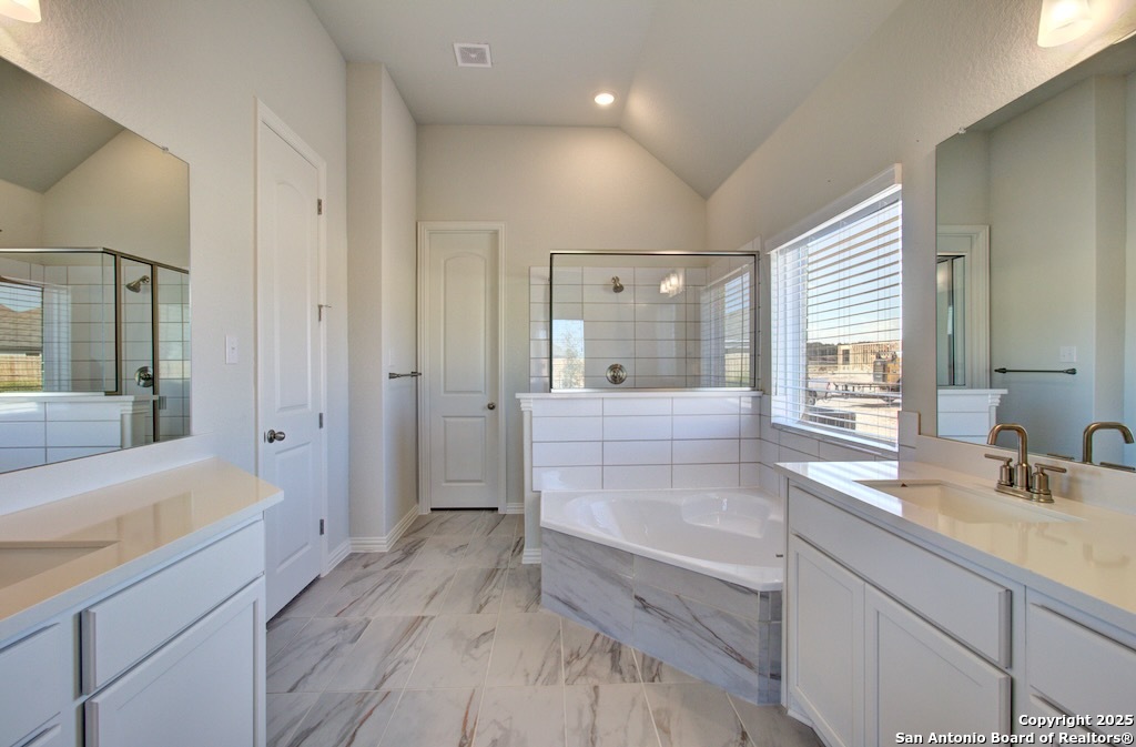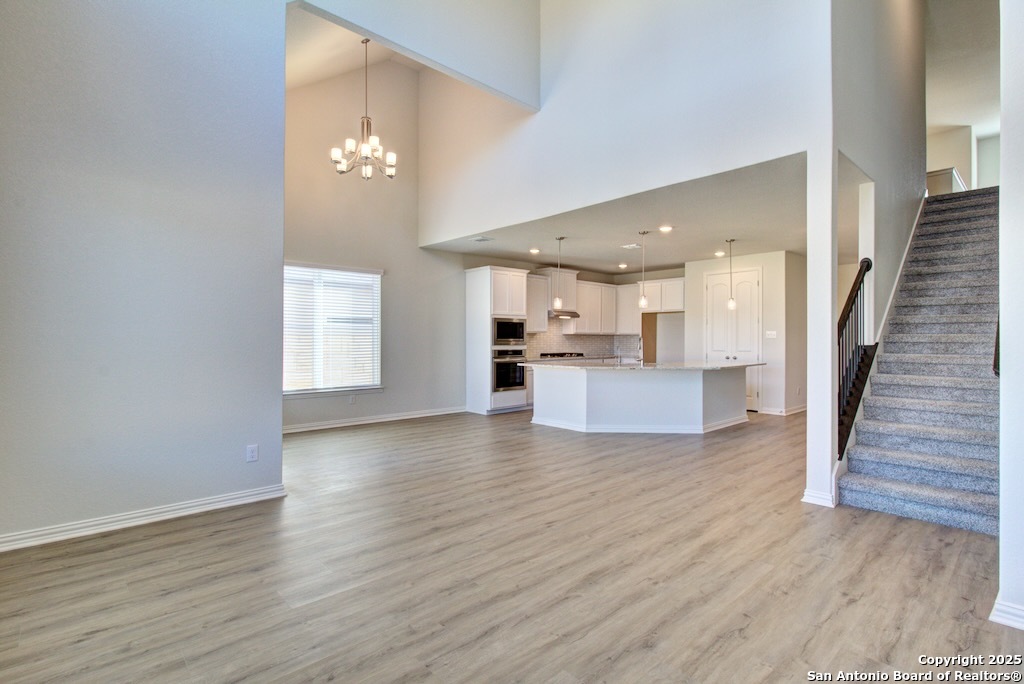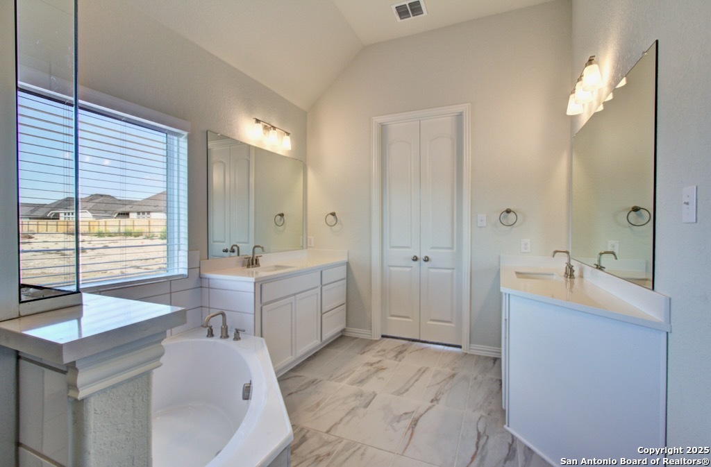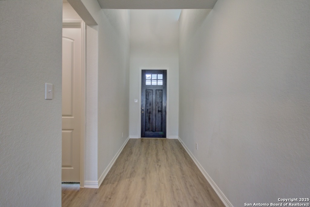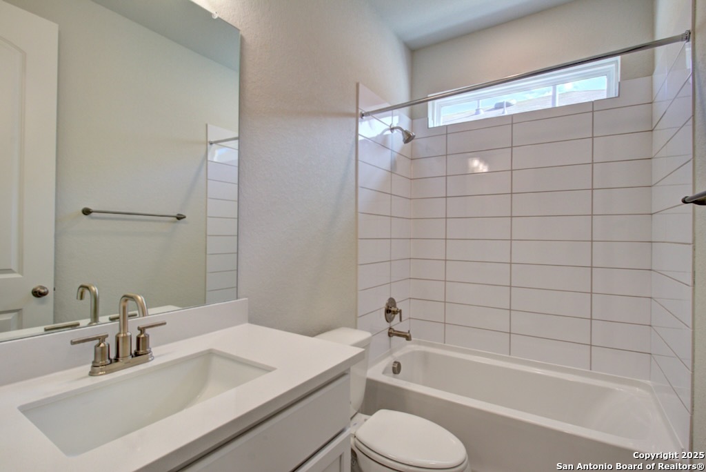 Experience the best in elevated living with soaring 11 ft ceilings, grand 8 ft doors and upgraded 5 1/4 inch baseboards, an Executive Package you'll only find here. Welcome to the Mahogany plan by DRB Homes at Veranda. The exterior features a professionally landscaped yard, covered patio, six foot privacy fence, upgraded shrub package, and a full yard sprinkler system. The kitchen includes an upgraded layout with granite countertops, ceramic tile backsplash, a large kitchen island, and forty two inch wood cabinetry with crown molding. It is equipped with a built in stainless steel oven and microwave, gas cooktop, and stainless steel dishwasher, providing both style and functionality. The owner suite offers a garden bath and an enlarged separate shower with tile surround and glass door. A marble composite vanity with dual sinks, forty two inch tall mirrors, chrome fixtures, and a spacious closet complete the suite. Veranda residents enjoy a swimming pool and playground. The community is close to major destinations including Lackland Air Force Base, Seaworld, Northwest Vista College, and other local attractions, offering convenience and easy access to work and entertainment. This home combines practical design, quality features, and a desirable location, making it an ideal choice.