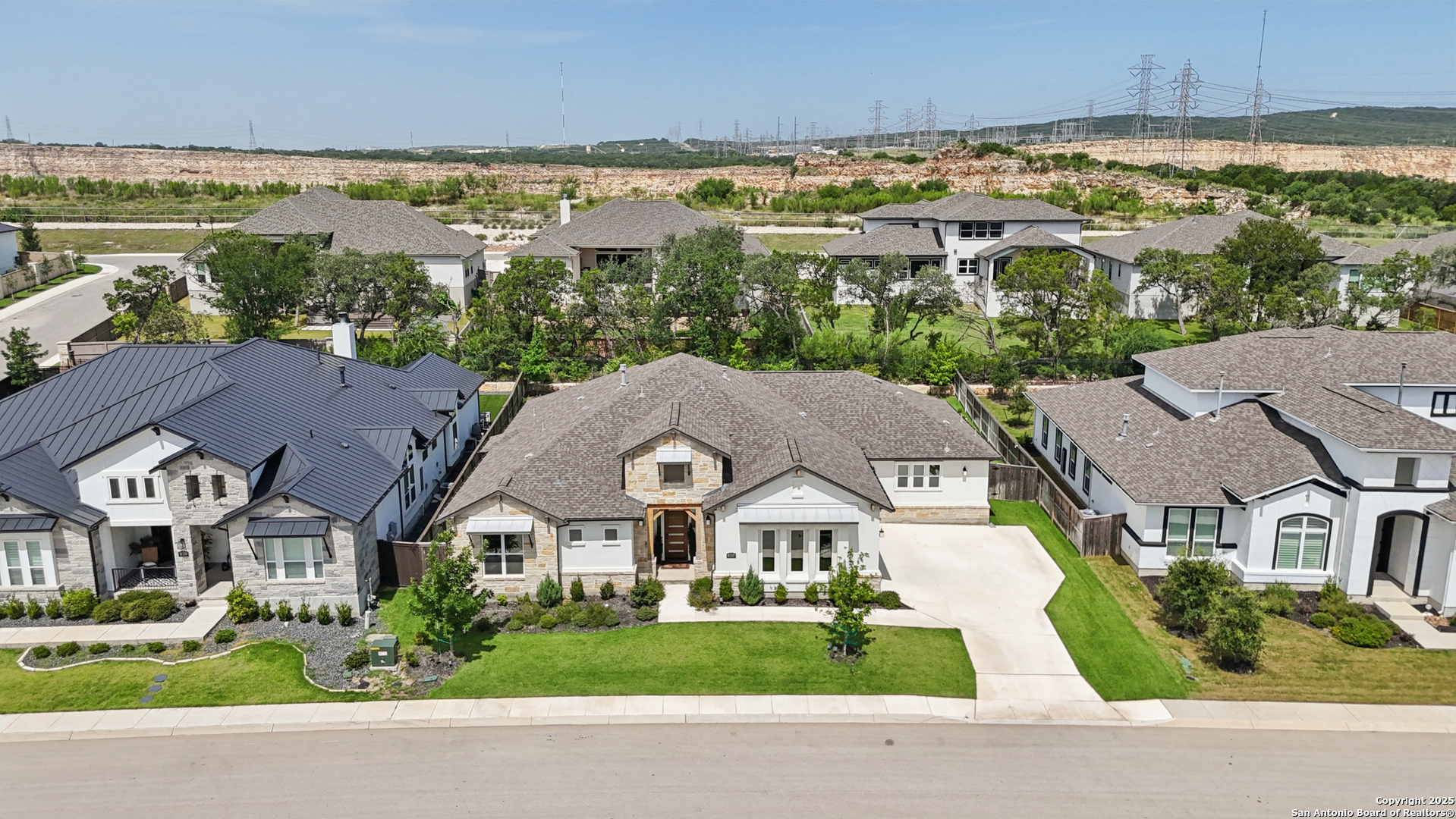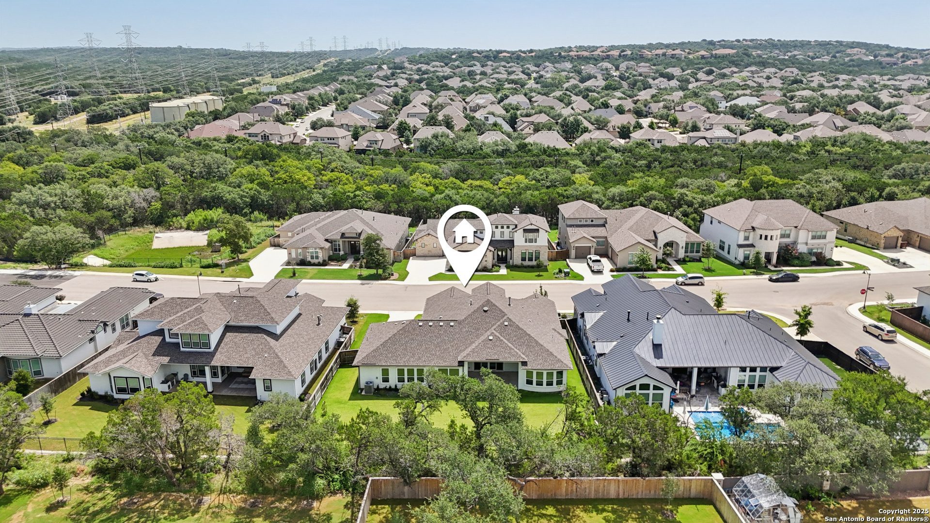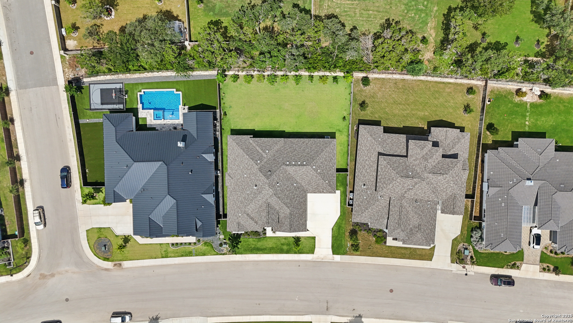 Located in the gated community of Shavano Highland, this beautiful one-story home sits on a spacious .28-acre lot and backs to a serene greenbelt. With private gated access to the Salado Creek Trail, enjoy nature at your doorstep, complete with multiple reservation ponds, jogging and bike trails. The like-new home was completed in 2022. Inside, the spacious living room features a cozy fireplace, built-in cabinetry, and easy patio access. The open island kitchen is designed for convenience, offering a large breakfast bar, gas cooking, built-in refrigerator and a walk-in pantry. The dining room, with backyard views, also opens to the patio, creating a seamless indoor-outdoor flow. The split primary suite is a retreat of its own, featuring a spa-like ensuite bath with a free-standing soaking tub, an open walk-in shower, separate vanities, dual walk-in closets, and plenty of natural light. A dedicated home office with double doors provides a quiet workspace, while the home's light and bright floor plan is enhanced by neutral tones throughout. Additional features include a water softener, reverse osmosis system, blackout window shades, and an outdoor automated sunshade. The backyard is lined with mature crape myrtles and features lush Zoysia grass, a covered patio pre-plumbed for an outdoor kitchen. Practical upgrades include an insulated garage, hard-wired security cameras, and an extra-wide residential road with a large driveway for easy access and parking. Furniture is negotiable. Don't miss this opportunity to own a well-appointed home in a sought-after location, book your personal tour today!
