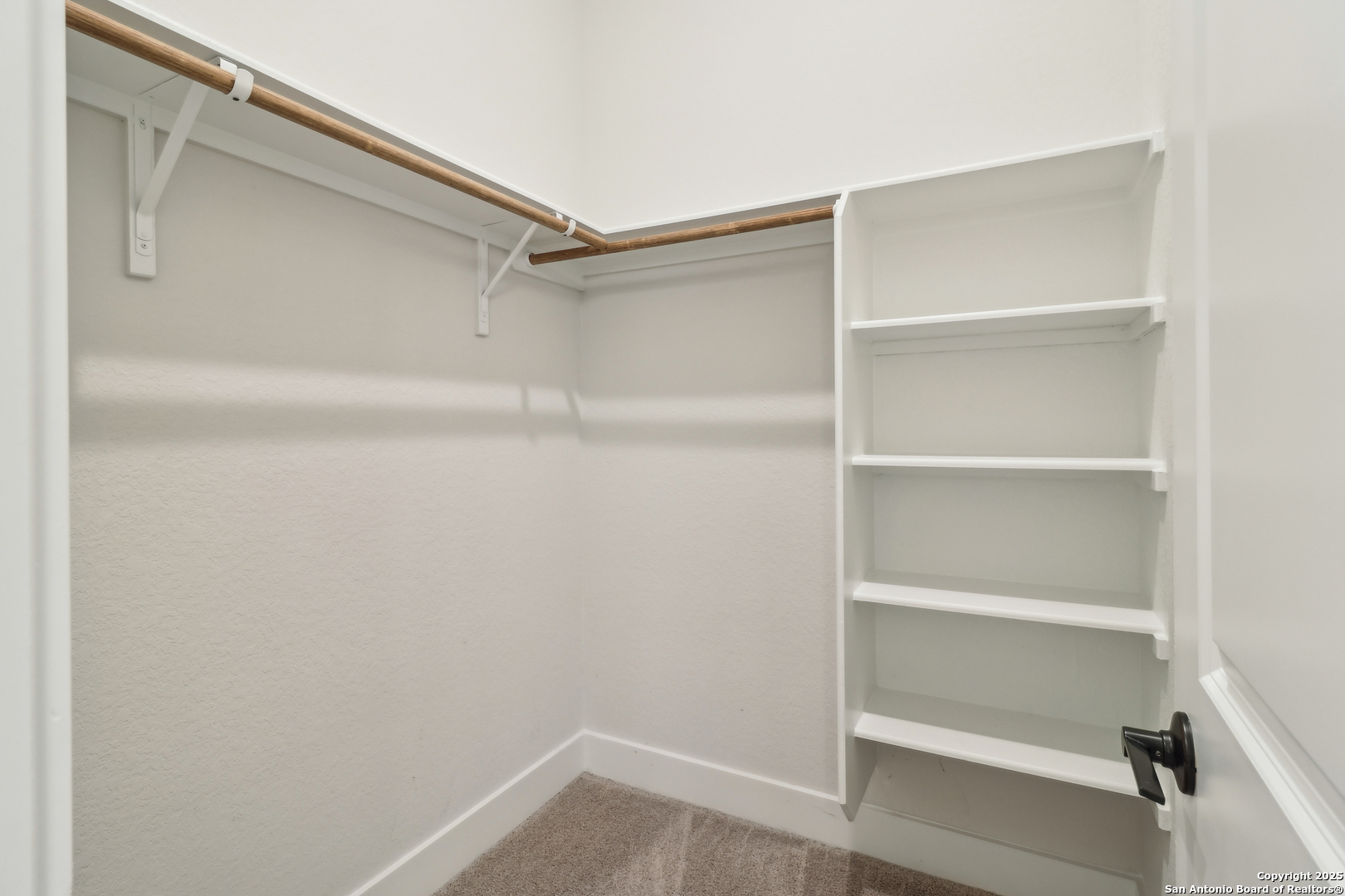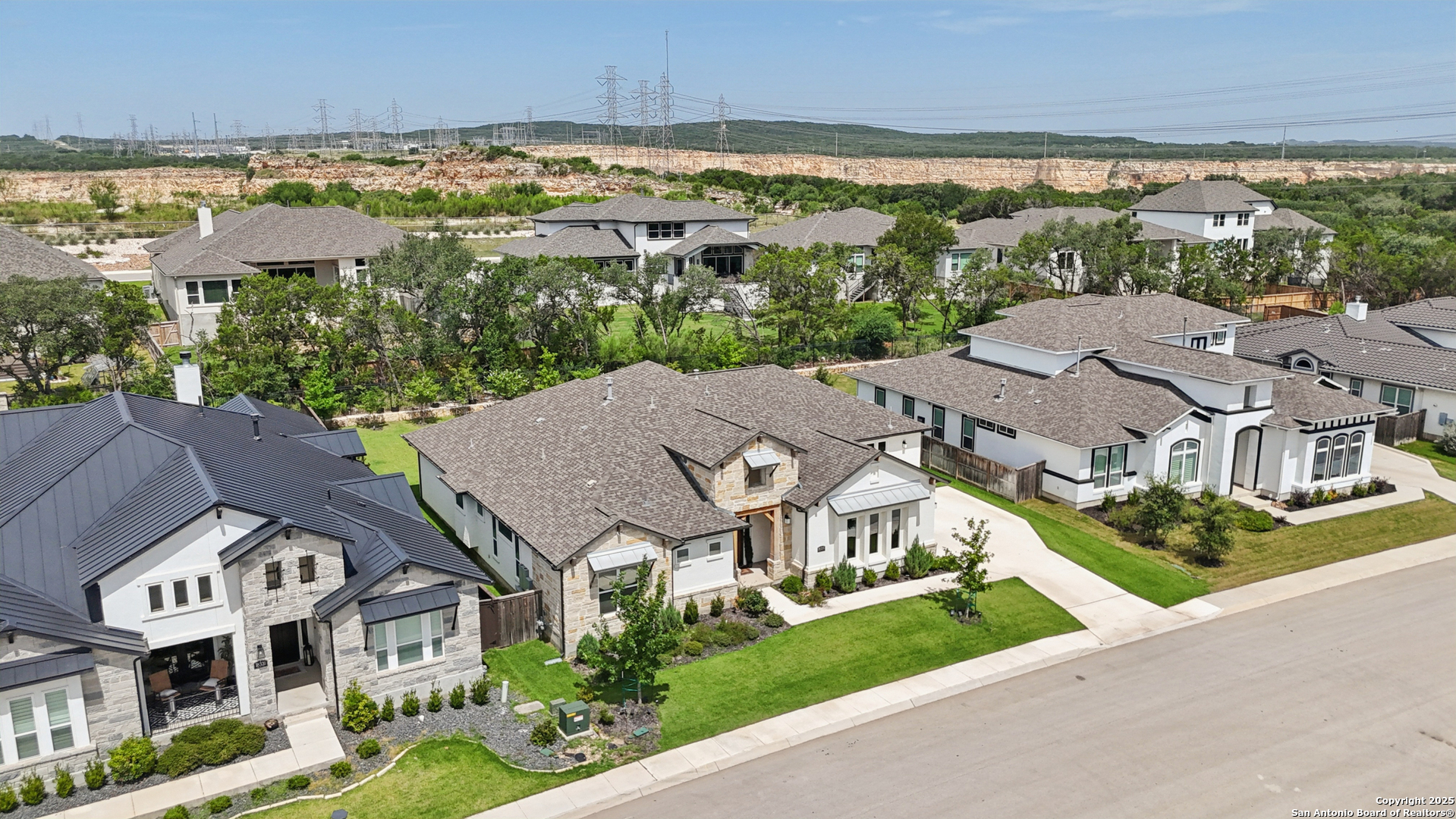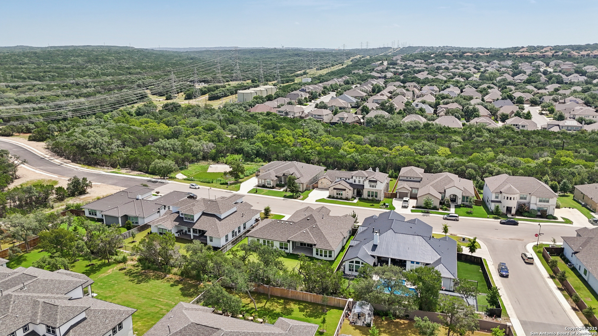 Located in the gated community of Shavano Highland, this beautiful one-story home sits on a spacious .28-acre lot and backs to a serene greenbelt. With private gated access to the Salado Creek Trail, enjoy nature at your doorstep, complete with multiple reservation ponds, jogging and bike trails. The like-new home was completed in 2022. Inside, the spacious living room features a cozy fireplace, built-in cabinetry, and easy patio access. The open island kitchen is designed for convenience, offering a large breakfast bar, gas cooking, built-in refrigerator and a walk-in pantry. The dining room, with backyard views, also opens to the patio, creating a seamless indoor-outdoor flow. The split primary suite is a retreat of its own, featuring a spa-like ensuite bath with a free-standing soaking tub, an open walk-in shower, separate vanities, dual walk-in closets, and plenty of natural light. A dedicated home office with double doors provides a quiet workspace, while the home's light and bright floor plan is enhanced by neutral tones throughout. Additional features include a water softener, reverse osmosis system, blackout window shades, and an outdoor automated sunshade. The backyard is lined with mature crape myrtles and features lush Zoysia grass, a covered patio pre-plumbed for an outdoor kitchen. Practical upgrades include an insulated garage, hard-wired security cameras, and an extra-wide residential road with a large driveway for easy access and parking. Furniture is negotiable. Don't miss this opportunity to own a well-appointed home in a sought-after location, book your personal tour today!