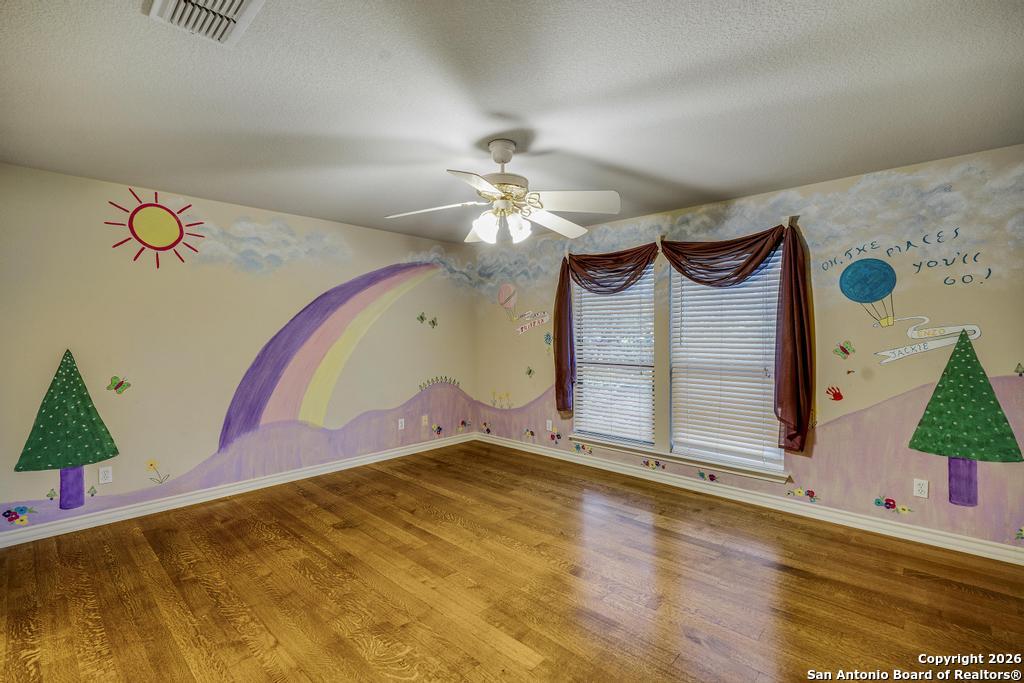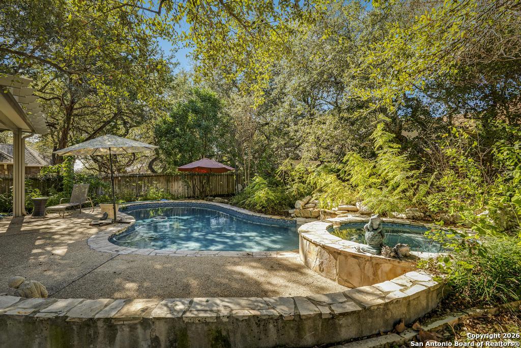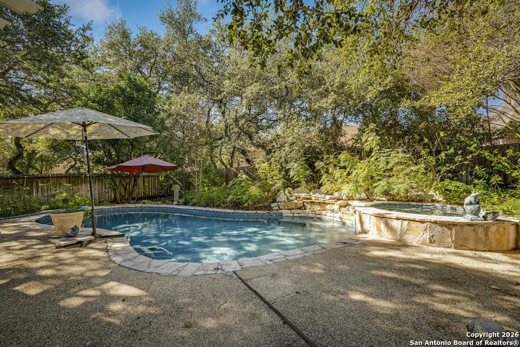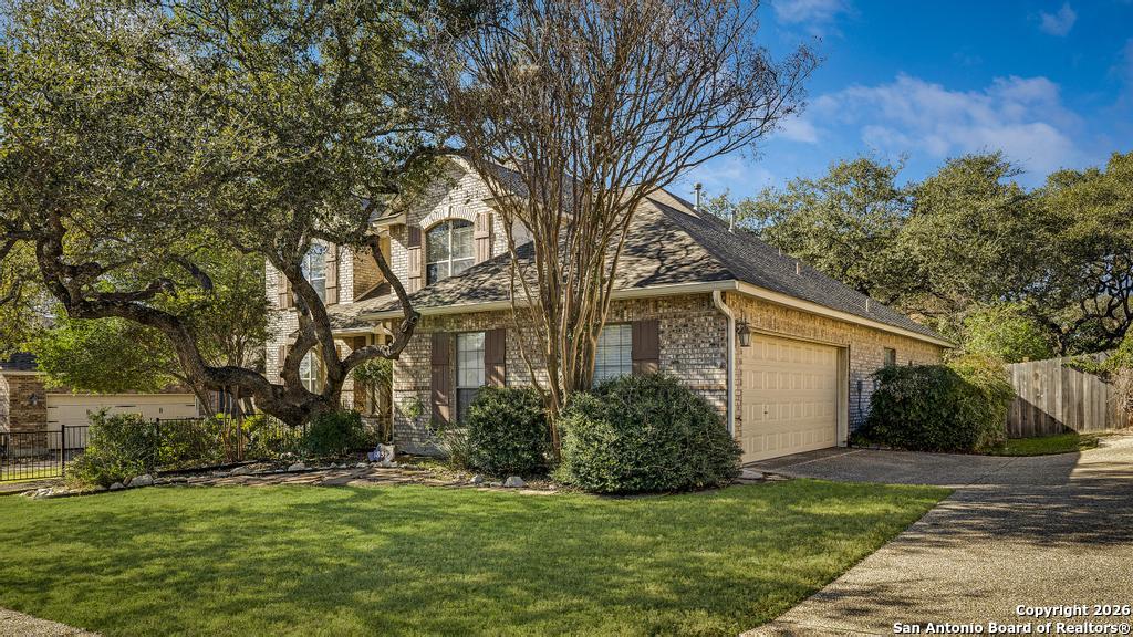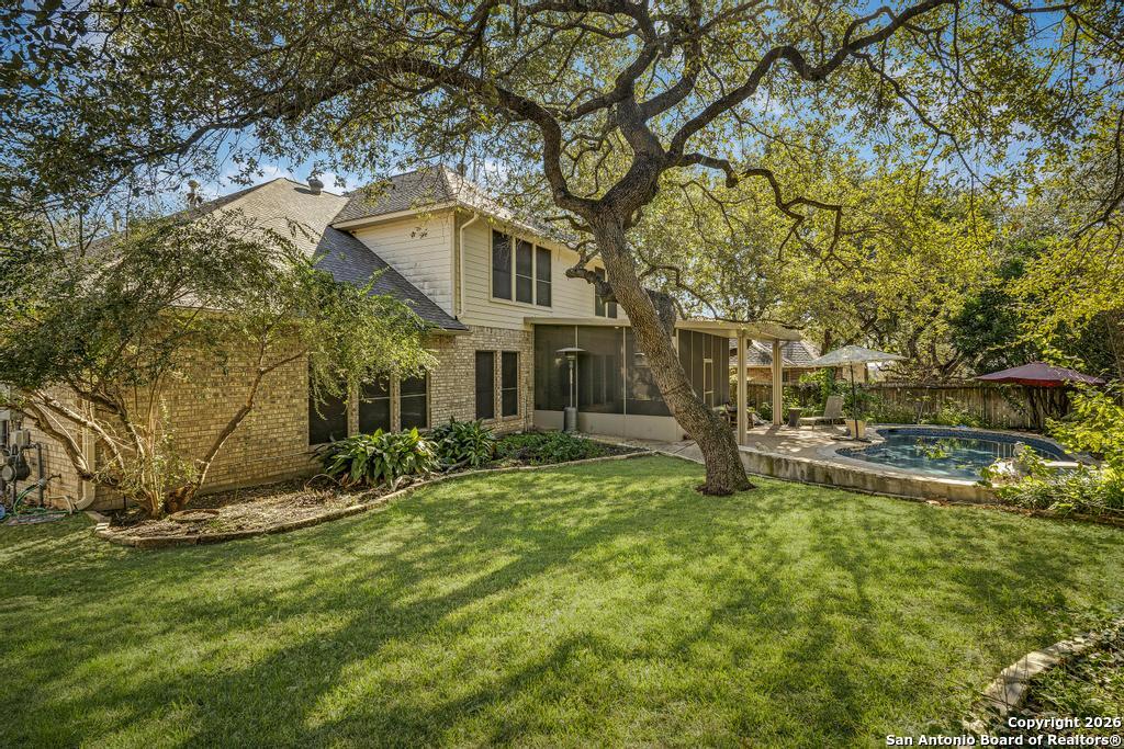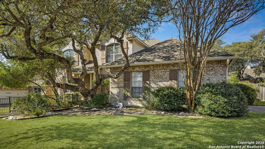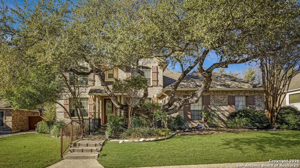 Step into this timeless all-brick home, beautifully shaded by freshly pruned, majestic oak trees. A spacious living and dining area welcomes you off the entry, highlighted by rich wood flooring. The inviting family room features recessed lighting and a gas log fireplace, overlooking the newly added sunroom. A generous breakfast area opens to the island kitchen, offering abundant counter space, custom cabinetry, stainless steel appliances, double ovens, gas cooking, and an exceptional walk-in pantry. All bedrooms feature wood flooring, with the primary suite located downstairs and three additional bedrooms upstairs, centered around a large game room. The backyard is a true oasis with a stunning pool, adjoining spa and fountain, expansive yard, and vegetable garden. Additional upgrades include a new water softener, irrigation system, and gutters.
