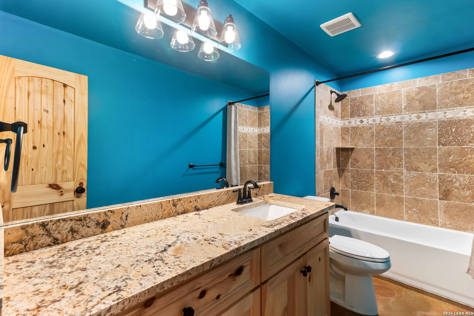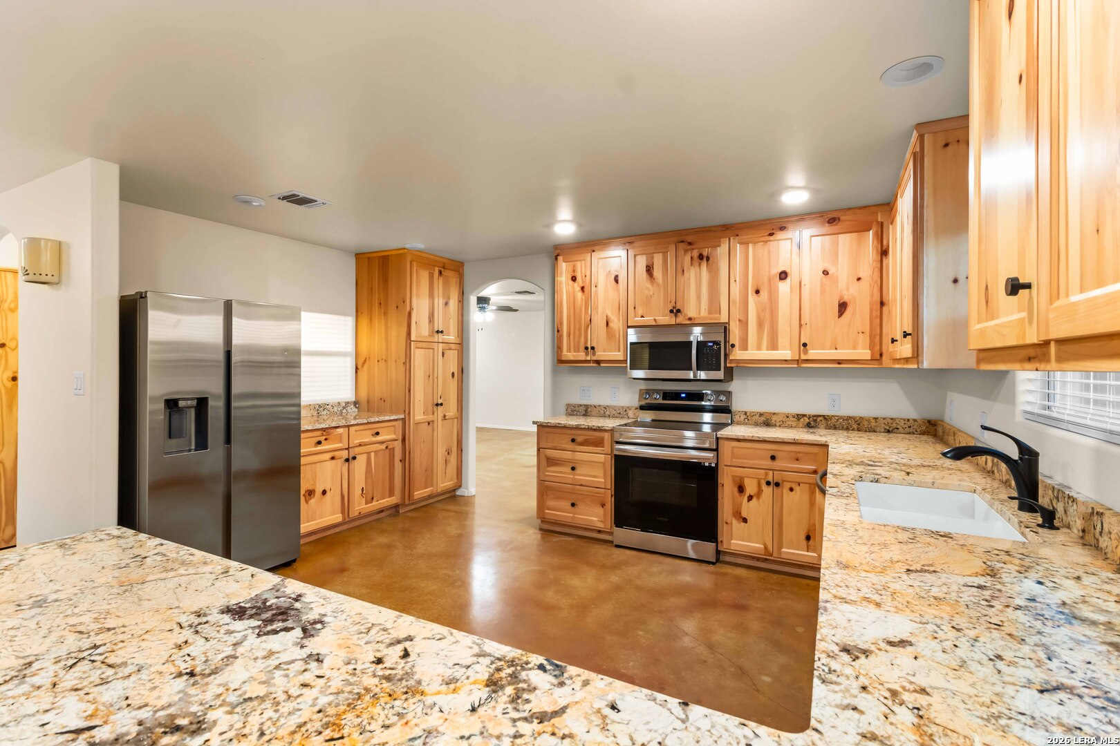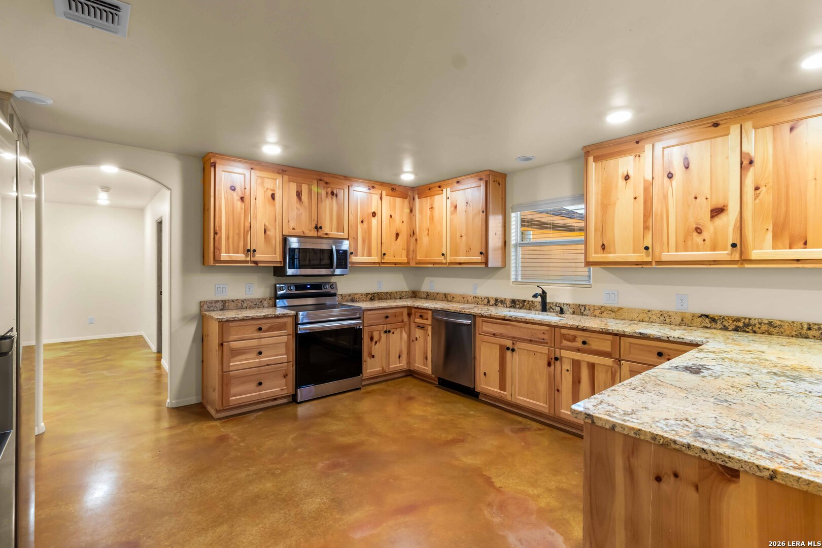Stunning new construction just blocks from downtown Bandera and Bandera High School. This 5-bedroom, 2-bath custom home offers flexible living spaces ideal for a fitness room, game room, or home office. Features include granite countertops, custom soft-close cabinetry, stained concrete floors, and a striking wooden front door. The rear entry opens to an oversized backyard and spacious patio, perfect for outdoor gatherings. Enjoy Bandera's vibrant cowboy culture, nightlife, and close-knit community, with easy access to San Antonio, Boerne, Kerrville, and Fredericksburg.