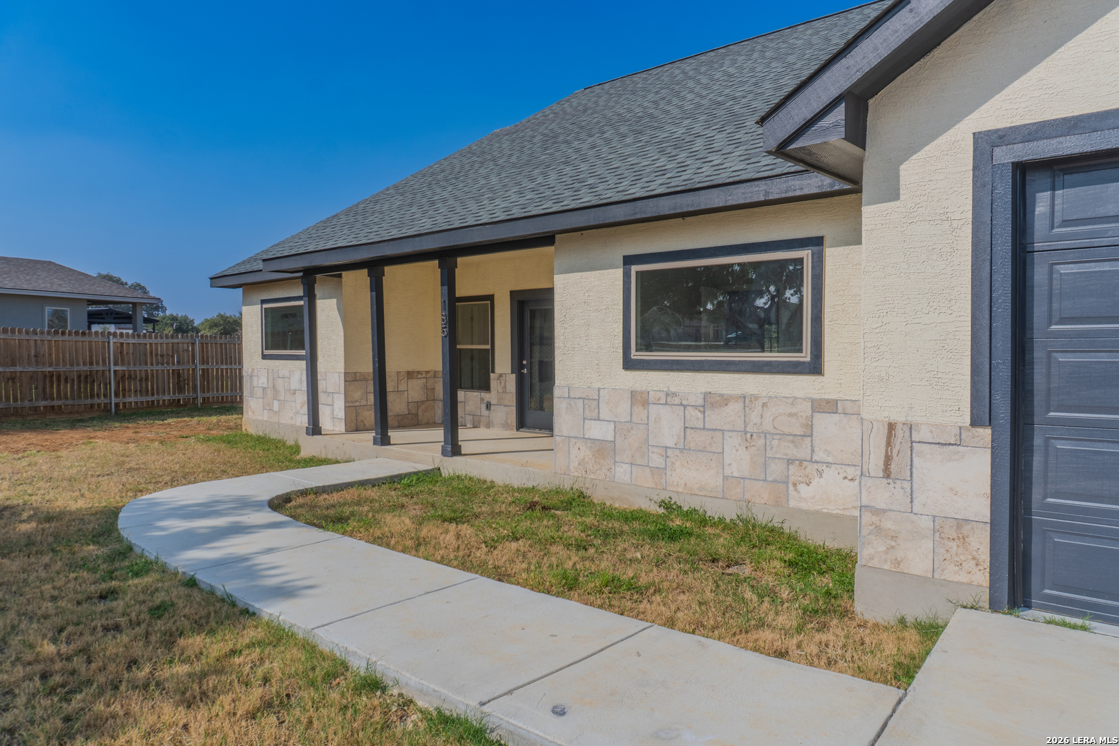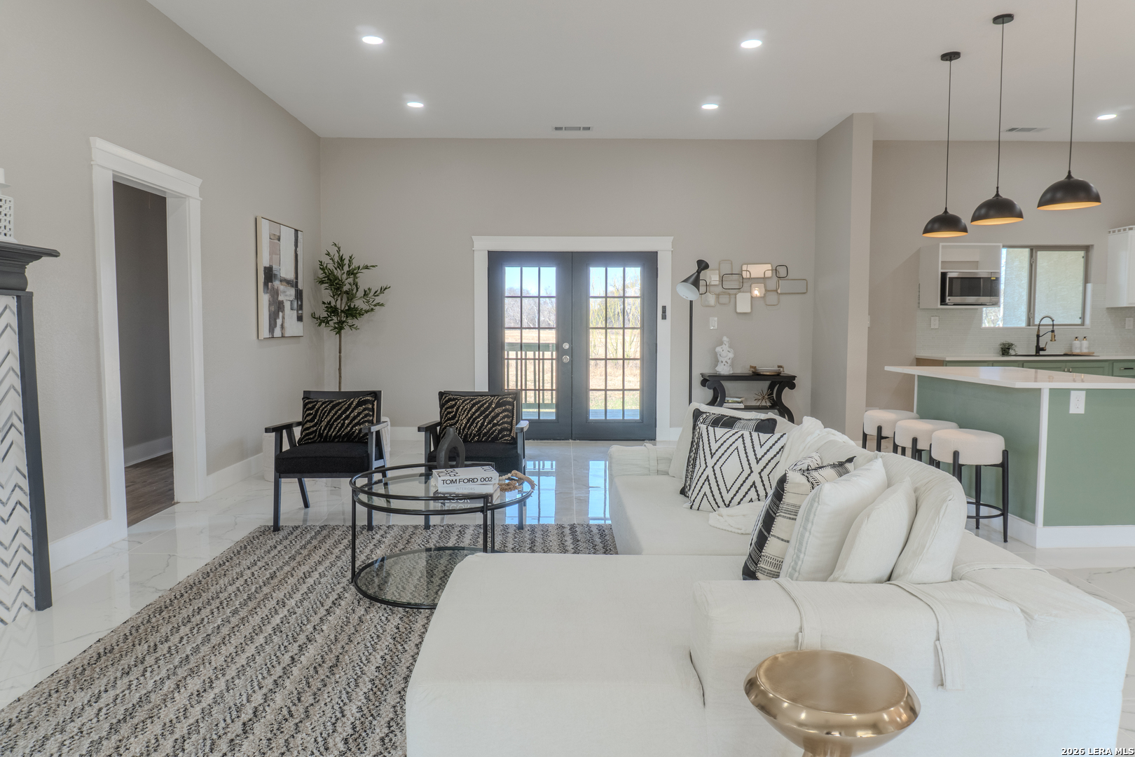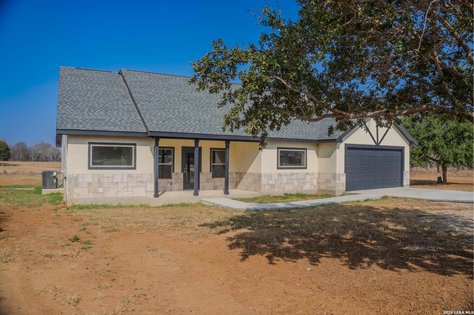 Brand-new ranch-style home, situated on a quiet cul-de-sac just minutes from San Antonio. Set on a spacious 0.75-acre lot in a community of large homesites, this property offers peaceful surroundings with convenient city access. The open-concept layout features soaring ceilings, abundant natural light, and stunning porcelain flooring throughout the main living areas. The living room includes an electric fireplace and scenic countryside views. The island kitchen is equipped with generous cabinetry, ample prep space, and a pot filler over the stove. Recent enhancements include custom closet shelving, added pantry shelving, and additional improvements that elevate both functionality and finish. Bedrooms and closets feature upgraded luxury vinyl flooring for durability and style. The primary suite offers a soaking tub, separate shower with newly installed sliding barn-style glass door, and a spacious retreat-like layout. Three additional bedrooms plus a dedicated office provide flexible living options. Enjoy the covered back patio with scenic views. USDA financing eligible with potential $0 down. Seller offering buyer closing cost assistance with preferred lender. New construction on acreage without the wait - ready for its first owner.