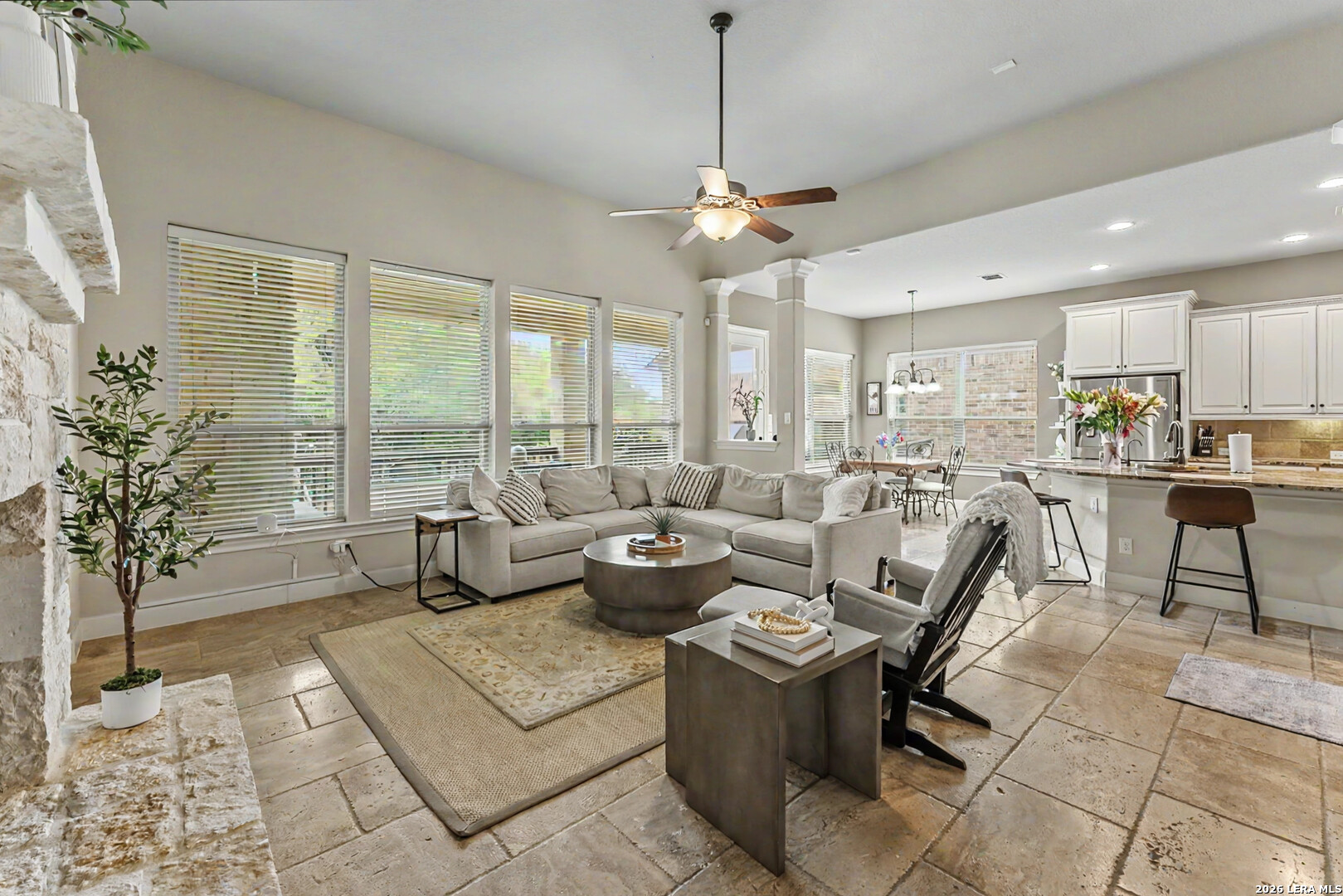 Welcome to 18506 Golden Maize - a stunning 5-bedroom, 3.5-bath, three-car attached garage home on a greenbelt lot in the gated community of Rogers Ranch. With over 4,000 square feet of thoughtfully designed living space, this Energy Star-certified two-story home delivers refined finishes, a flexible layout, and comfortable outdoor living. The open floor plan greets you with travertine flooring, soaring ceilings, and a private study with hardwood floors - ideal for remote work or a home office. Formal and casual dining areas flow into a spacious family room anchored by a stone fireplace, creating a natural rhythm for everyday living and entertaining. The gourmet kitchen features plenty of cabinetry, granite countertops, gas cooking, and a breakfast bar - all open to the main living spaces. A dedicated mudroom and oversized laundry complete the main level. The downstairs primary suite is a true retreat with a generous walk-in closet featuring professional shelving, garden tub, standalone shower, and a dual vanity. Looking for a home with a dedicated media room and game room? The upstairs delivers both, along with four secondary bedrooms and two full bathrooms - giving every member of the household room to spread out. Step outside to a covered patio complete with a fireplace, built-in gas grill, and outdoor kitchen, all overlooking serene greenbelt views with no rear neighbors. Zoned to top-rated Northside ISD schools - Blattman Elementary, Rawlinson Middle, and Clark High School - with The Montessori School of San Antonio also located near the community entrance. Neighborhood amenities include a community pool, tennis courts, hiking and biking trails, a clubhouse, and basketball courts. Conveniently located to Loop 1604, IH-10, and 281.