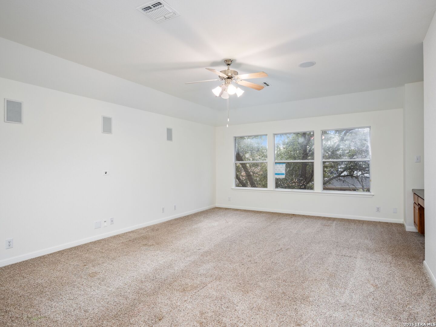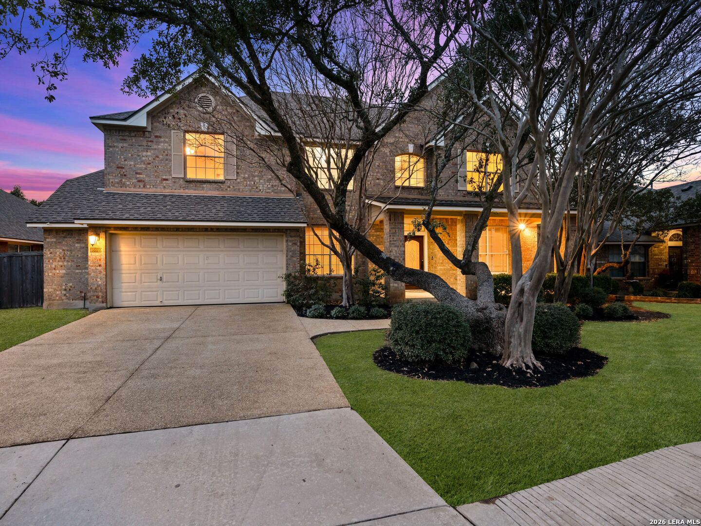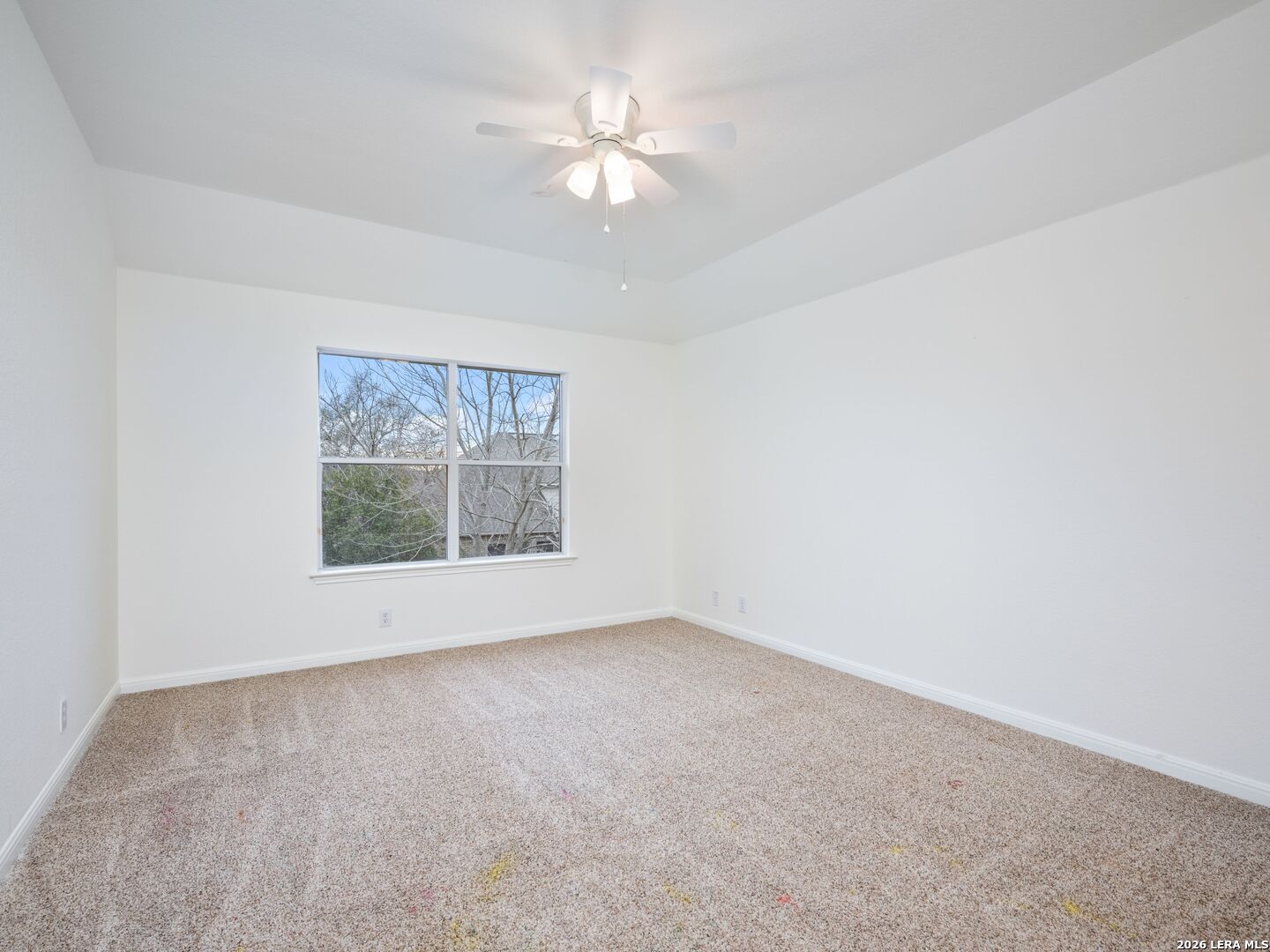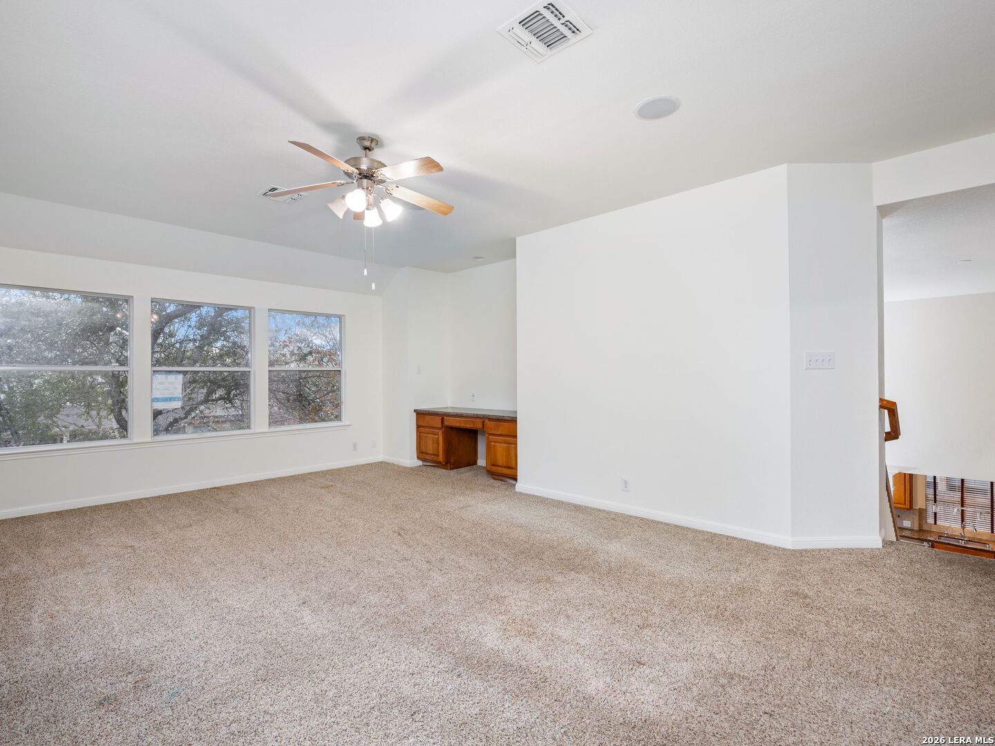 Situated within the established Rogers Ranch community, this David Weekley residence offers a well balanced two story floor plan designed for both everyday comfort and functional entertaining. The main level is anchored by a spacious primary suite featuring bay windows that introduce natural light and create a private retreat. The primary bath includes dual vanities, a soaking tub, separate walk in shower, and a generously sized walk in closet. The central living spaces are thoughtfully connected, highlighted by a family room with a two story ceiling and fireplace that opens naturally into the kitchen and breakfast area. The kitchen is equipped with stainless steel appliances, gas cooking, an island workspace, and bar seating, creating a practical and inviting gathering space. A secondary living area at the front of the home provides flexibility for a study, sitting room, or additional entertaining space, while an upstairs game room expands the home's overall livability. Large windows throughout provide consistent natural light, while neutral interior selections allow for an easy transition into a variety of design styles.