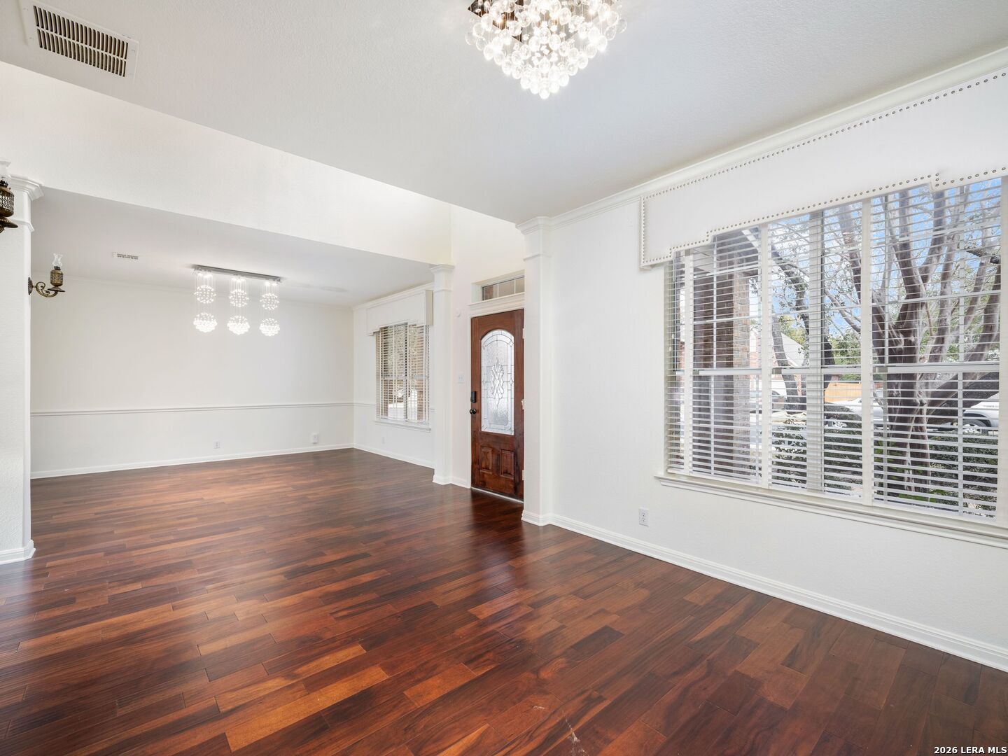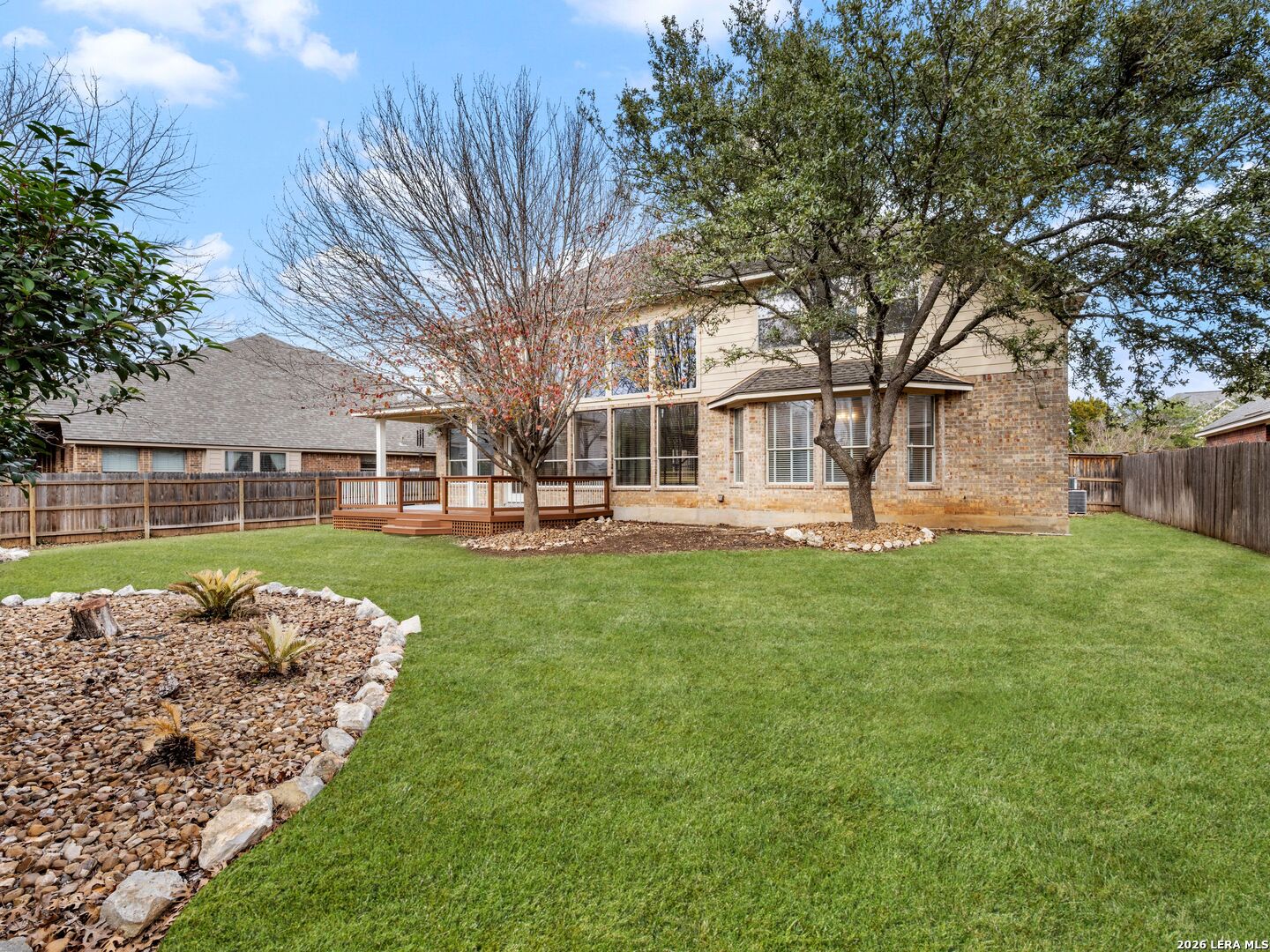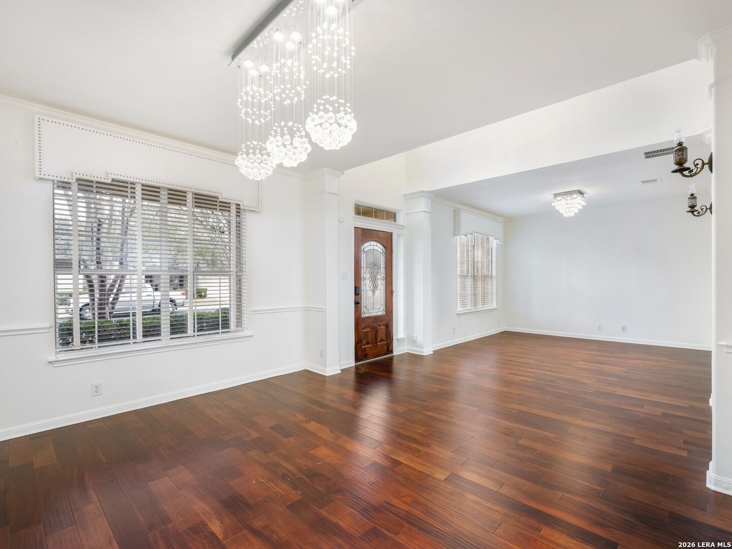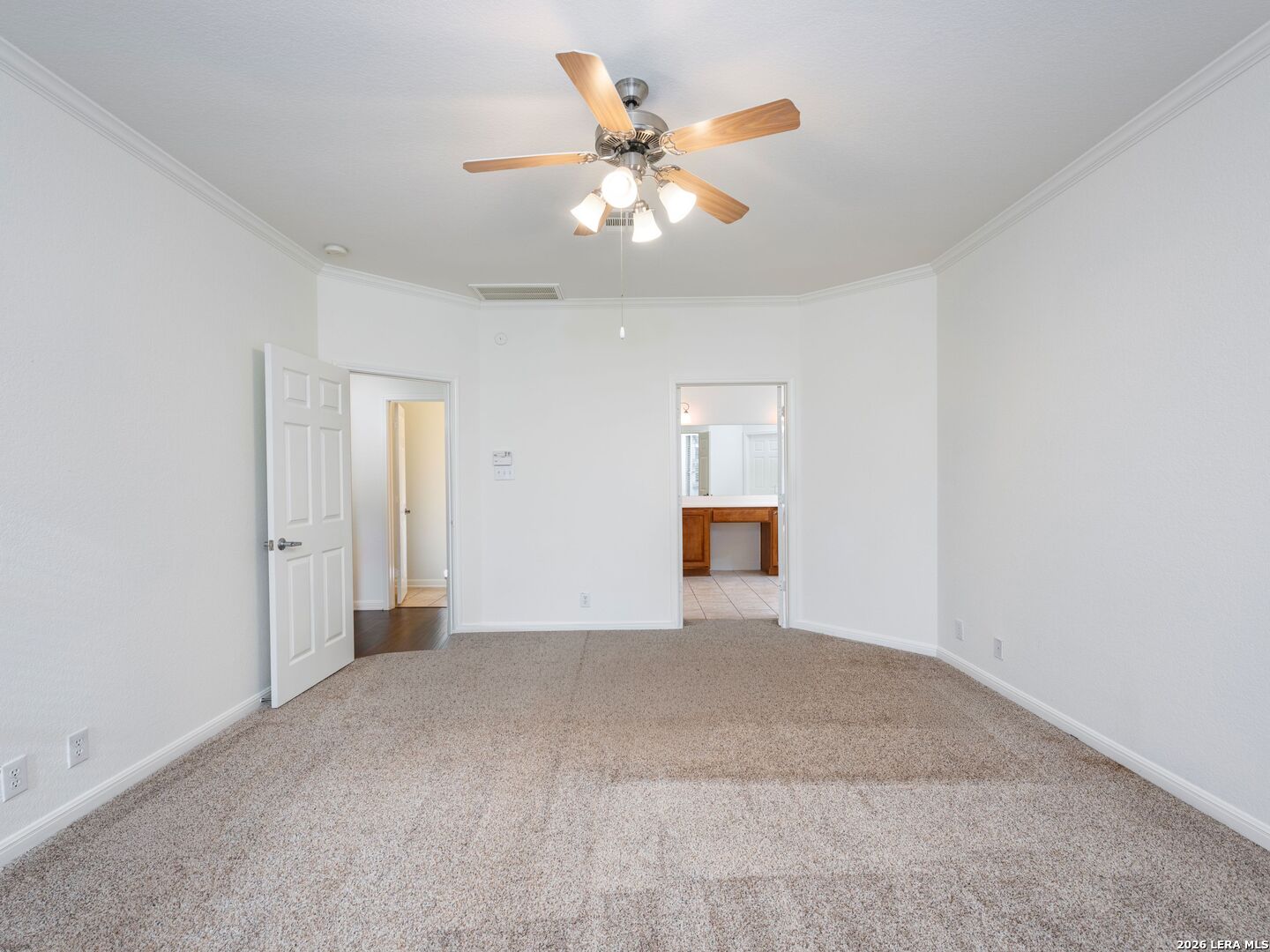Situated within the established Rogers Ranch community, this David Weekley residence offers a well balanced two story floor plan designed for both everyday comfort and functional entertaining. The main level is anchored by a spacious primary suite featuring bay windows that introduce natural light and create a private retreat. The primary bath includes dual vanities, a soaking tub, separate walk in shower, and a generously sized walk in closet. The central living spaces are thoughtfully connected, highlighted by a family room with a two story ceiling and fireplace that opens naturally into the kitchen and breakfast area. The kitchen is equipped with stainless steel appliances, gas cooking, an island workspace, and bar seating, creating a practical and inviting gathering space. A secondary living area at the front of the home provides flexibility for a study, sitting room, or additional entertaining space, while an upstairs game room expands the home's overall livability. Large windows throughout provide consistent natural light, while neutral interior selections allow for an easy transition into a variety of design styles.