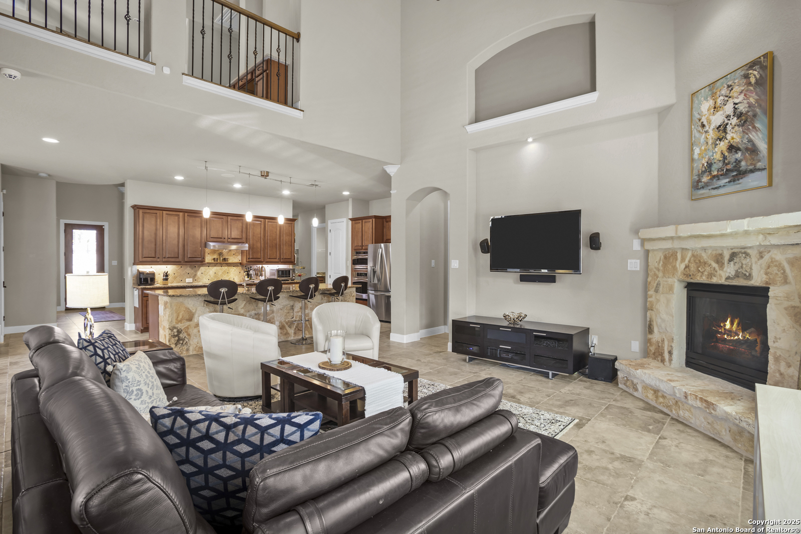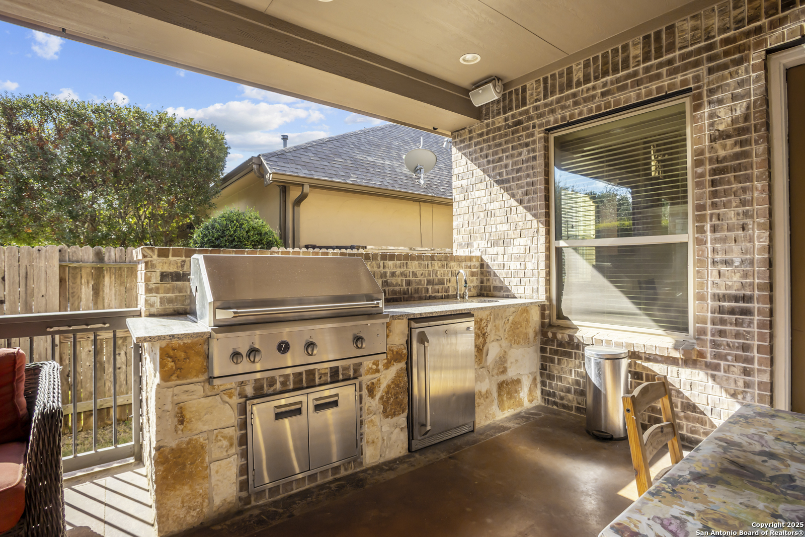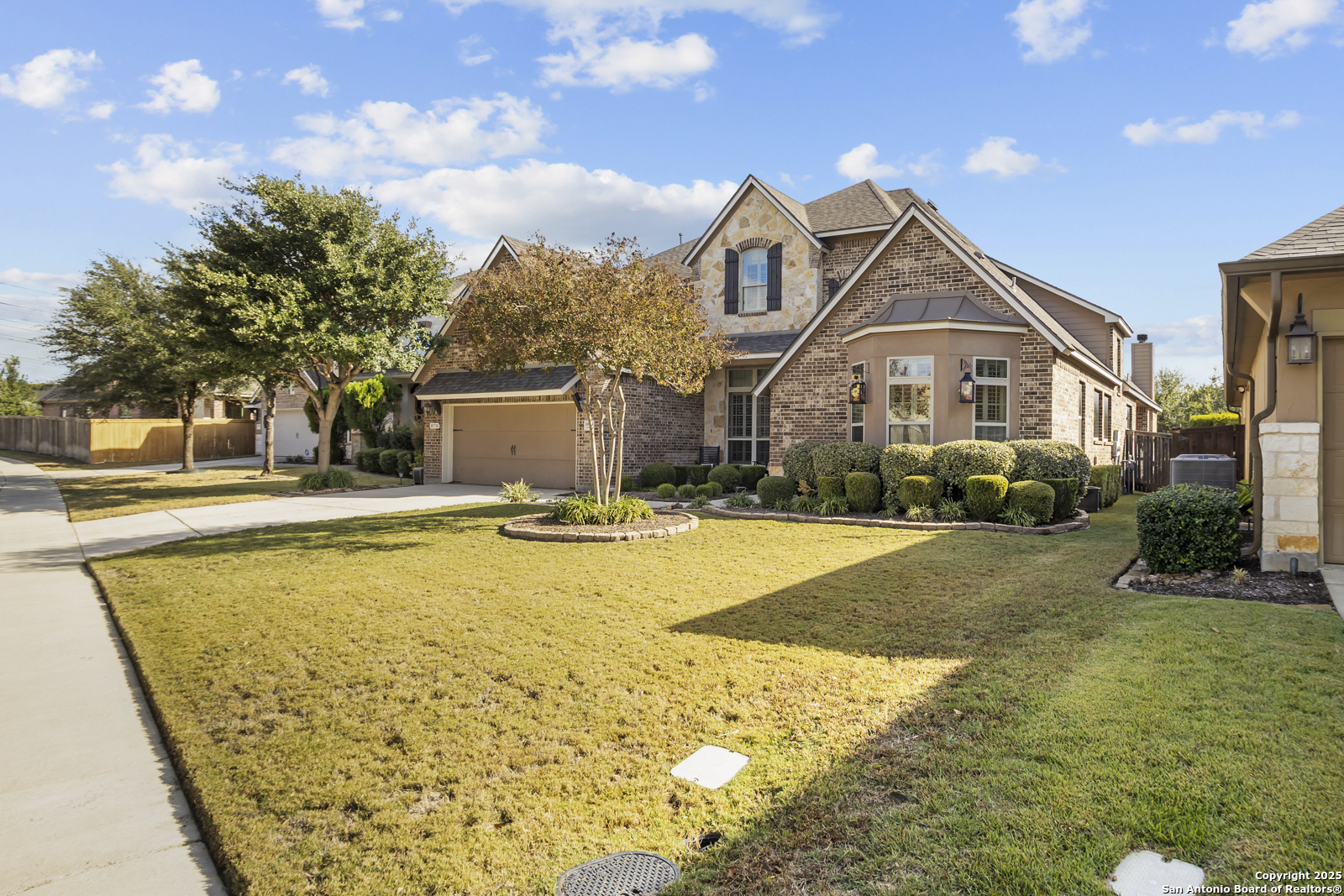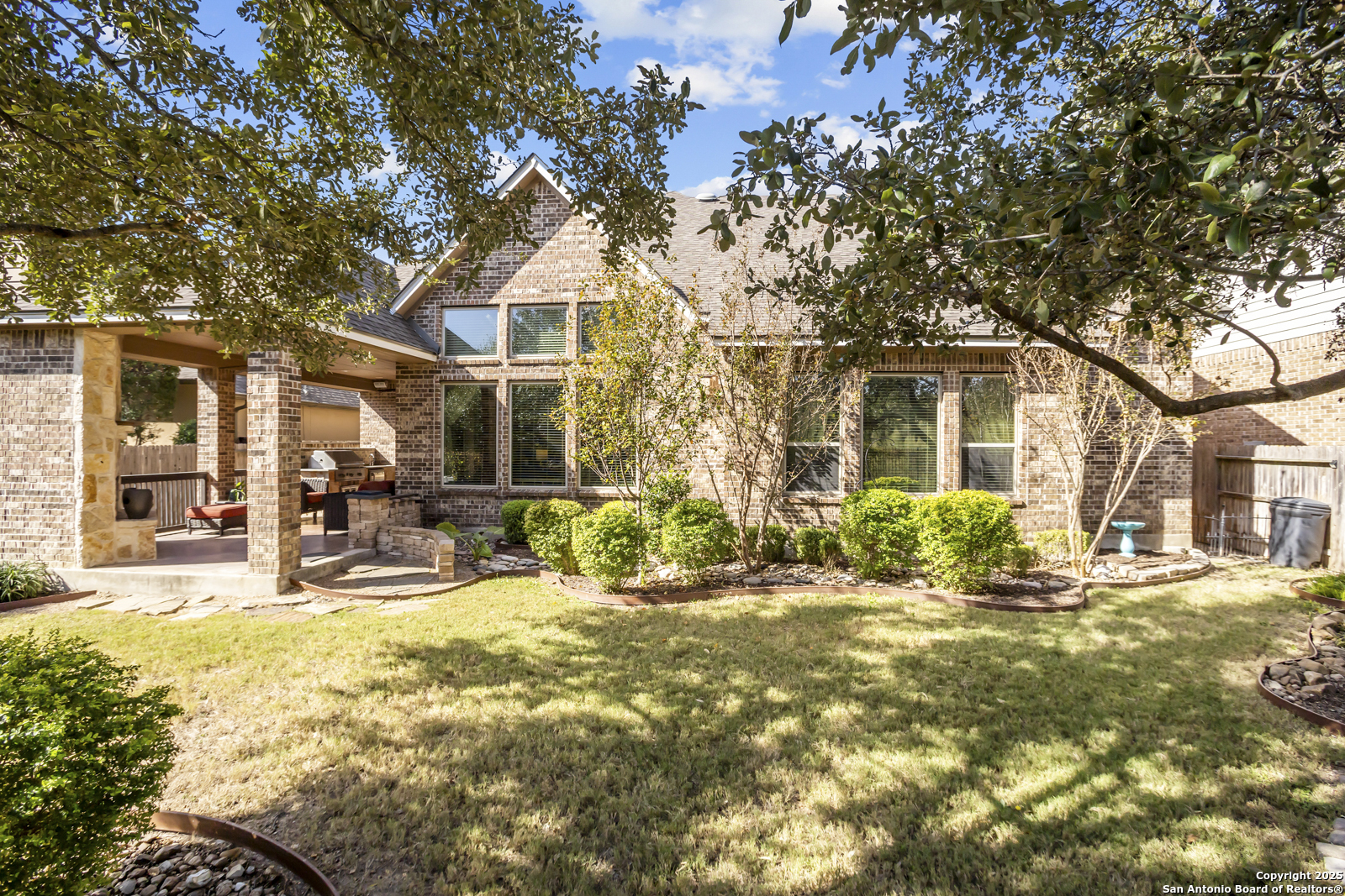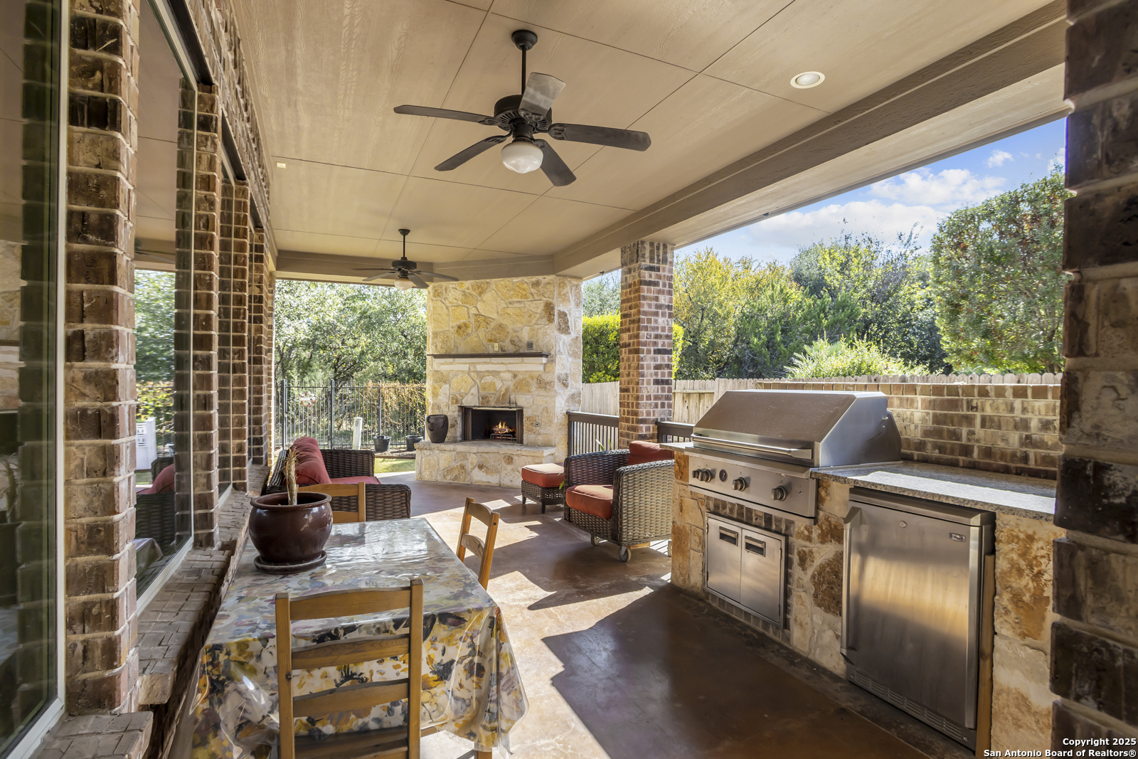 Welcome to this beautifully appointed home in the highly desirable Rogers Ranch community in San Antonio. This spacious 4-bedroom residence offers an ideal blend of comfort, style, and functionality with an open-concept layout, tall ceilings, and abundant natural light throughout. The gourmet kitchen serves as the heart of the home, featuring expansive granite countertops, custom cabinetry, stainless steel appliances, and an oversized island perfect for gathering and entertaining. The living room is anchored by a cozy fireplace and flows seamlessly into the dining area and outdoor living spaces. The primary suite is a private retreat with a large walk-in closet, double vanities, and a separate soaking tub and walk-in shower. A dedicated office on the main level plus a versatile upstairs loft provide flexible spaces for work, play, or relaxation. Outdoors, enjoy a covered patio complete with an outdoor fireplace and a full outdoor kitchen, creating the perfect setting for year-round hosting. Located within the sought-after Rogers Ranch community, residents enjoy access to amenities such as a sparkling pool, sports courts, walking paths, and a prime location near top-rated schools, shopping, dining, and major highways.