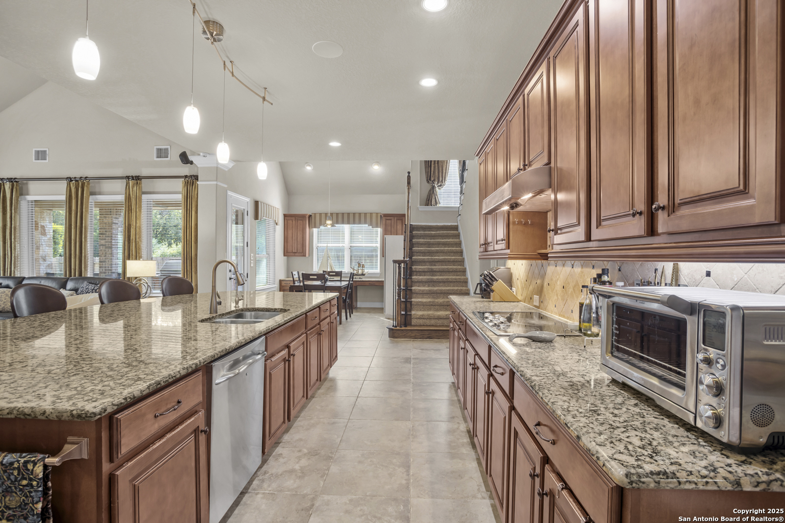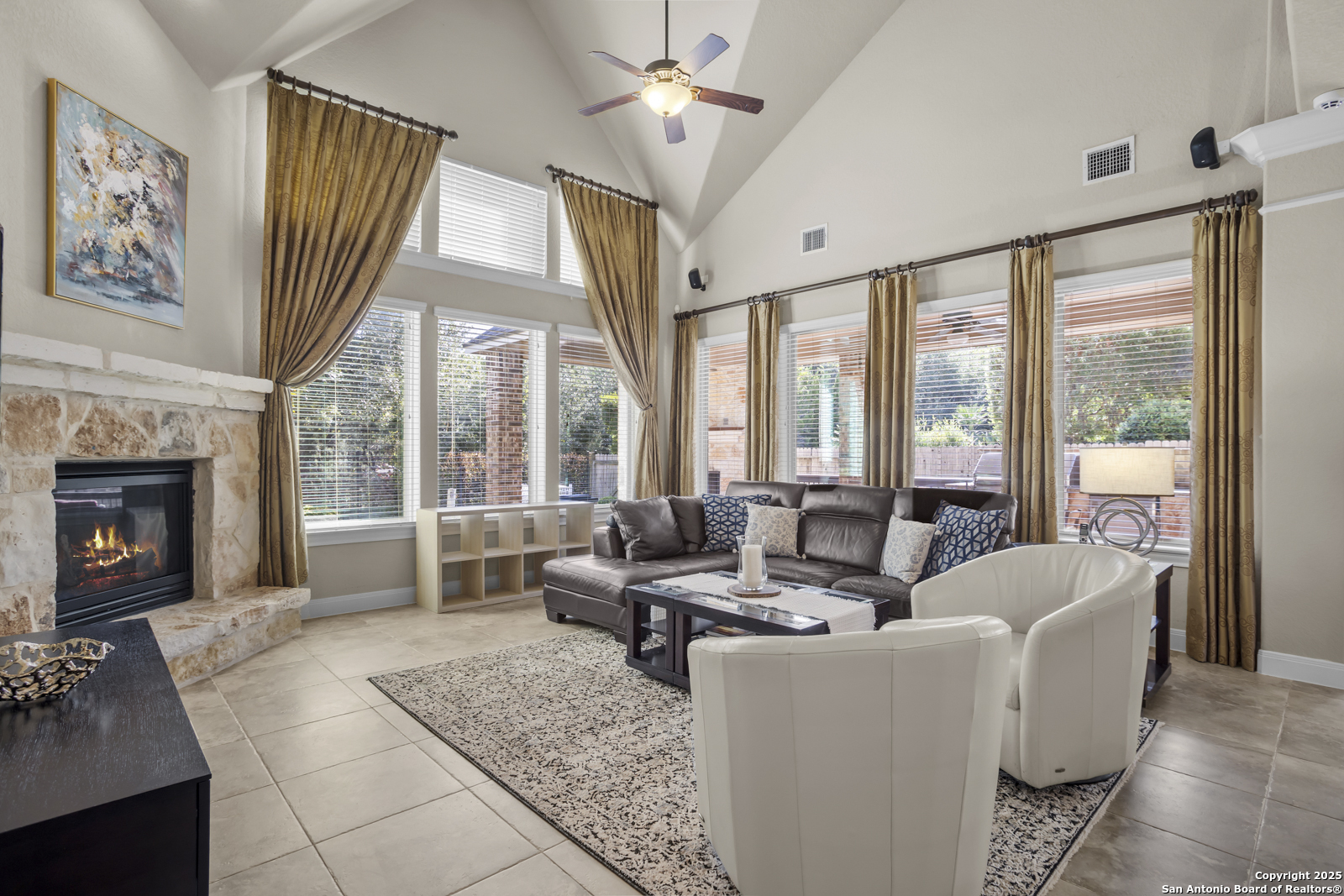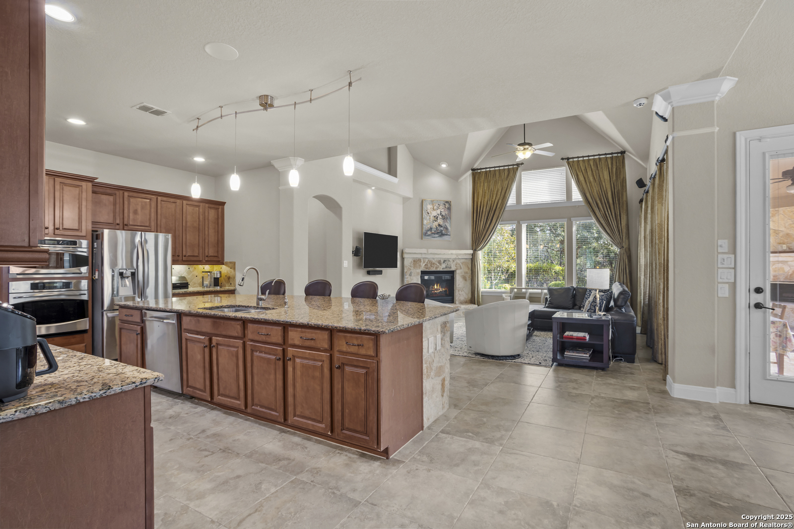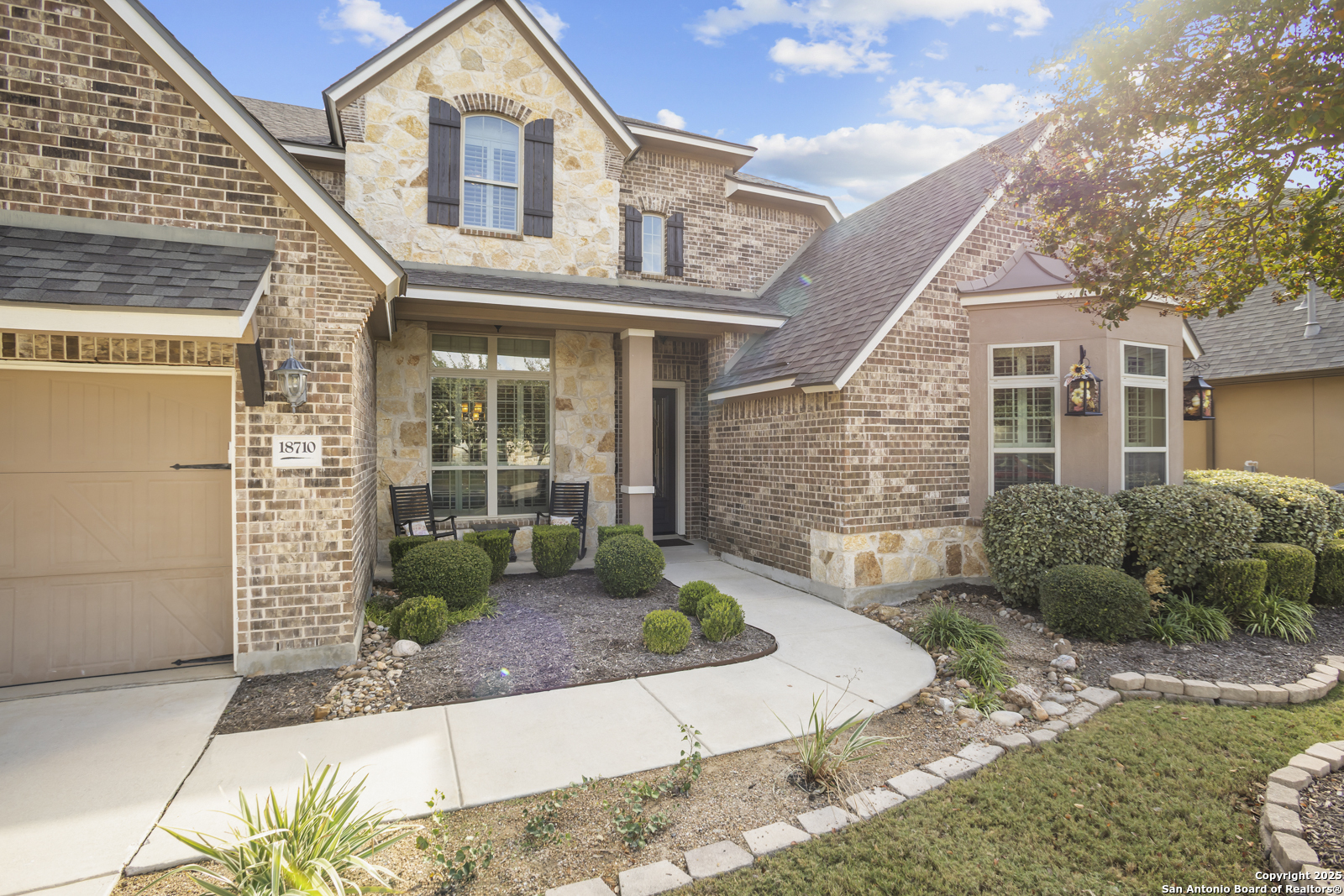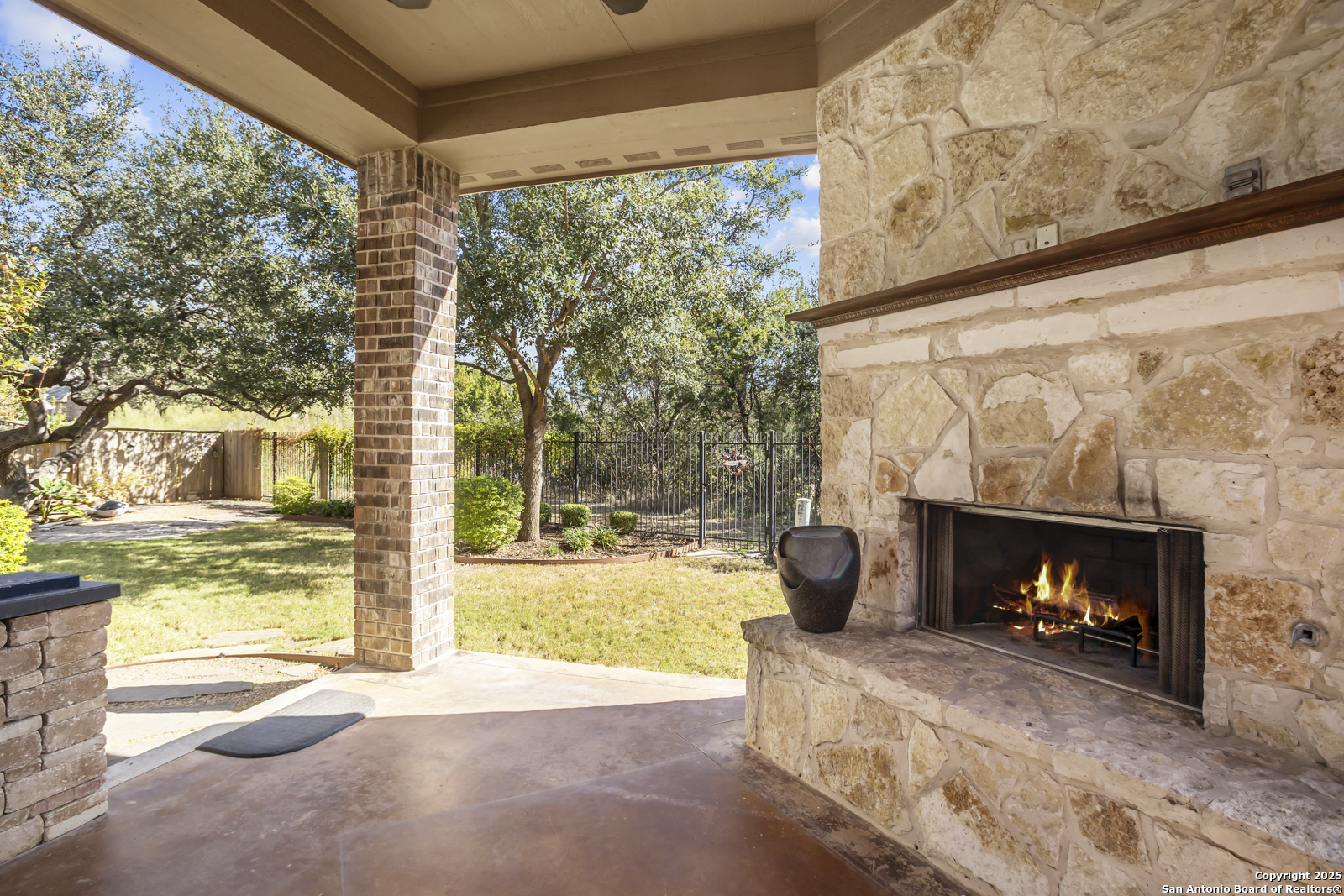 Welcome to this beautifully appointed home in the highly desirable Rogers Ranch community in San Antonio. This spacious 4-bedroom residence offers an ideal blend of comfort, style, and functionality with an open-concept layout, tall ceilings, and abundant natural light throughout. The gourmet kitchen serves as the heart of the home, featuring expansive granite countertops, custom cabinetry, stainless steel appliances, and an oversized island perfect for gathering and entertaining. The living room is anchored by a cozy fireplace and flows seamlessly into the dining area and outdoor living spaces. The primary suite is a private retreat with a large walk-in closet, double vanities, and a separate soaking tub and walk-in shower. A dedicated office on the main level plus a versatile upstairs loft provide flexible spaces for work, play, or relaxation. Outdoors, enjoy a covered patio complete with an outdoor fireplace and a full outdoor kitchen, creating the perfect setting for year-round hosting. Located within the sought-after Rogers Ranch community, residents enjoy access to amenities such as a sparkling pool, sports courts, walking paths, and a prime location near top-rated schools, shopping, dining, and major highways.