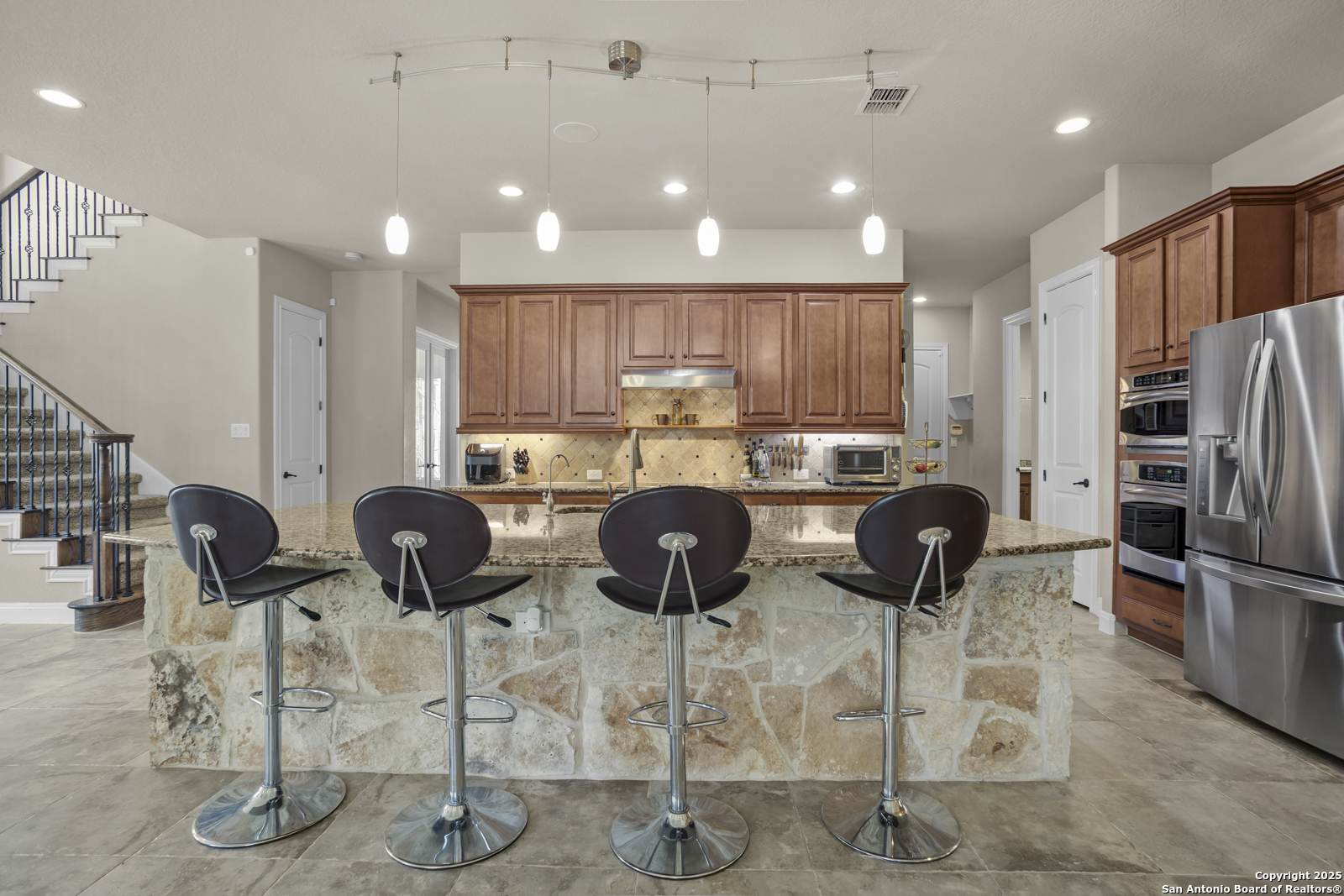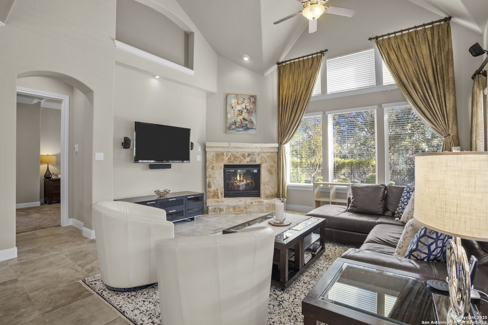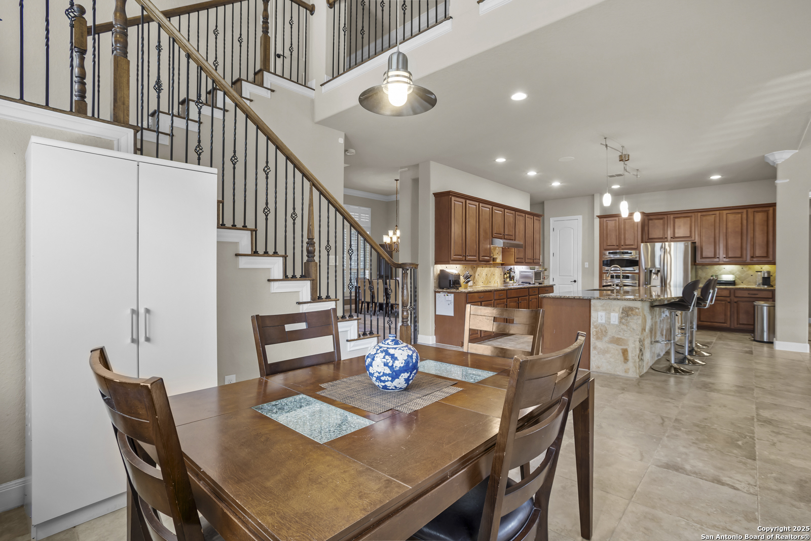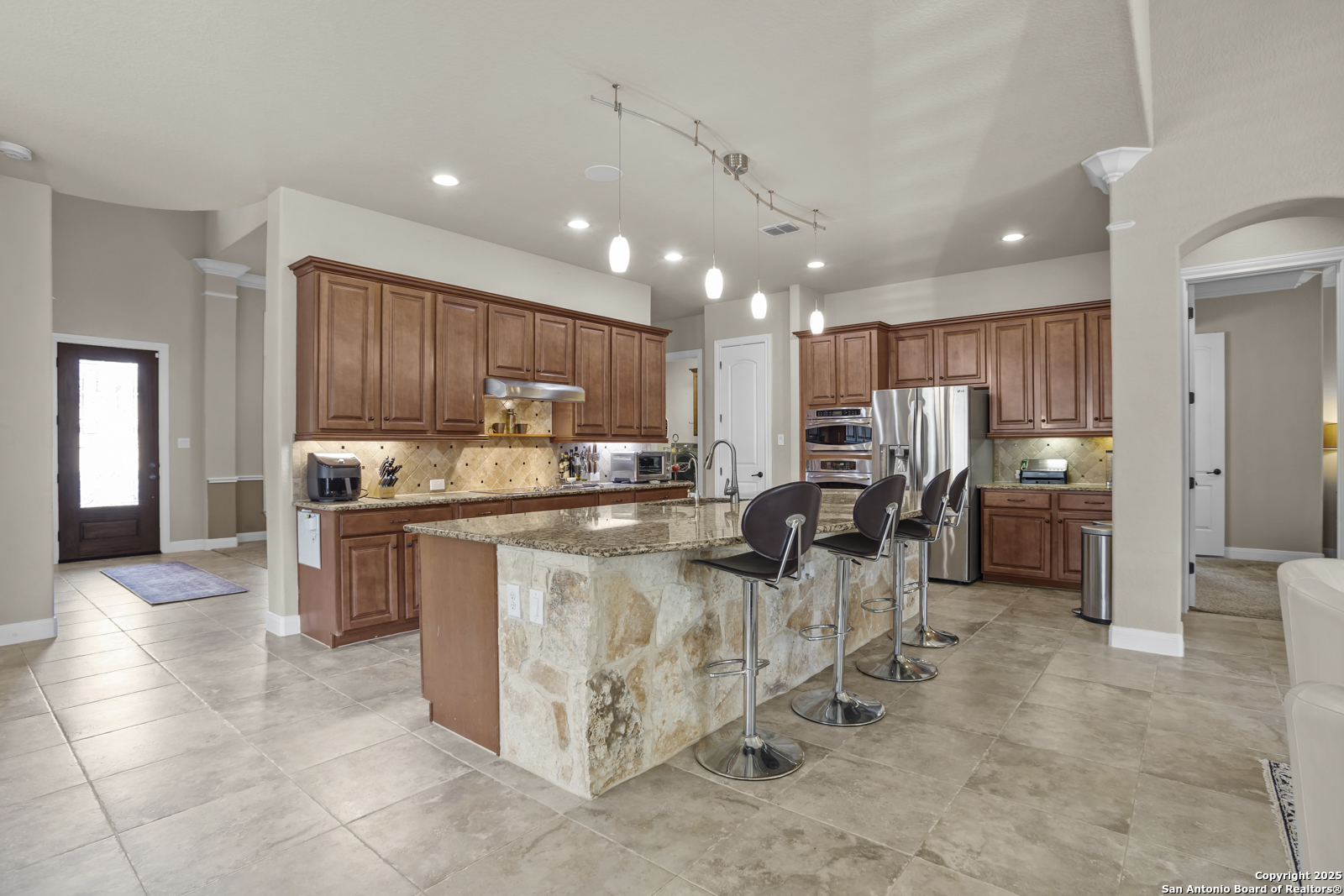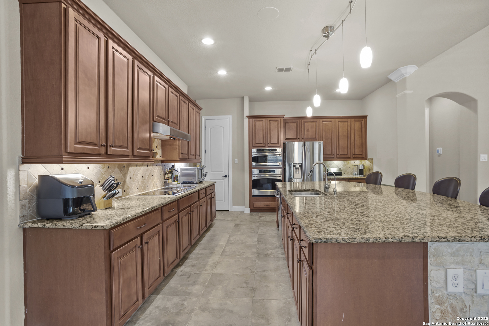 Welcome to this beautifully appointed home in the highly desirable Rogers Ranch community in San Antonio. This spacious 4-bedroom residence offers an ideal blend of comfort, style, and functionality with an open-concept layout, tall ceilings, and abundant natural light throughout. The gourmet kitchen serves as the heart of the home, featuring expansive granite countertops, custom cabinetry, stainless steel appliances, and an oversized island perfect for gathering and entertaining. The living room is anchored by a cozy fireplace and flows seamlessly into the dining area and outdoor living spaces. The primary suite is a private retreat with a large walk-in closet, double vanities, and a separate soaking tub and walk-in shower. A dedicated office on the main level plus a versatile upstairs loft provide flexible spaces for work, play, or relaxation. Outdoors, enjoy a covered patio complete with an outdoor fireplace and a full outdoor kitchen, creating the perfect setting for year-round hosting. Located within the sought-after Rogers Ranch community, residents enjoy access to amenities such as a sparkling pool, sports courts, walking paths, and a prime location near top-rated schools, shopping, dining, and major highways.