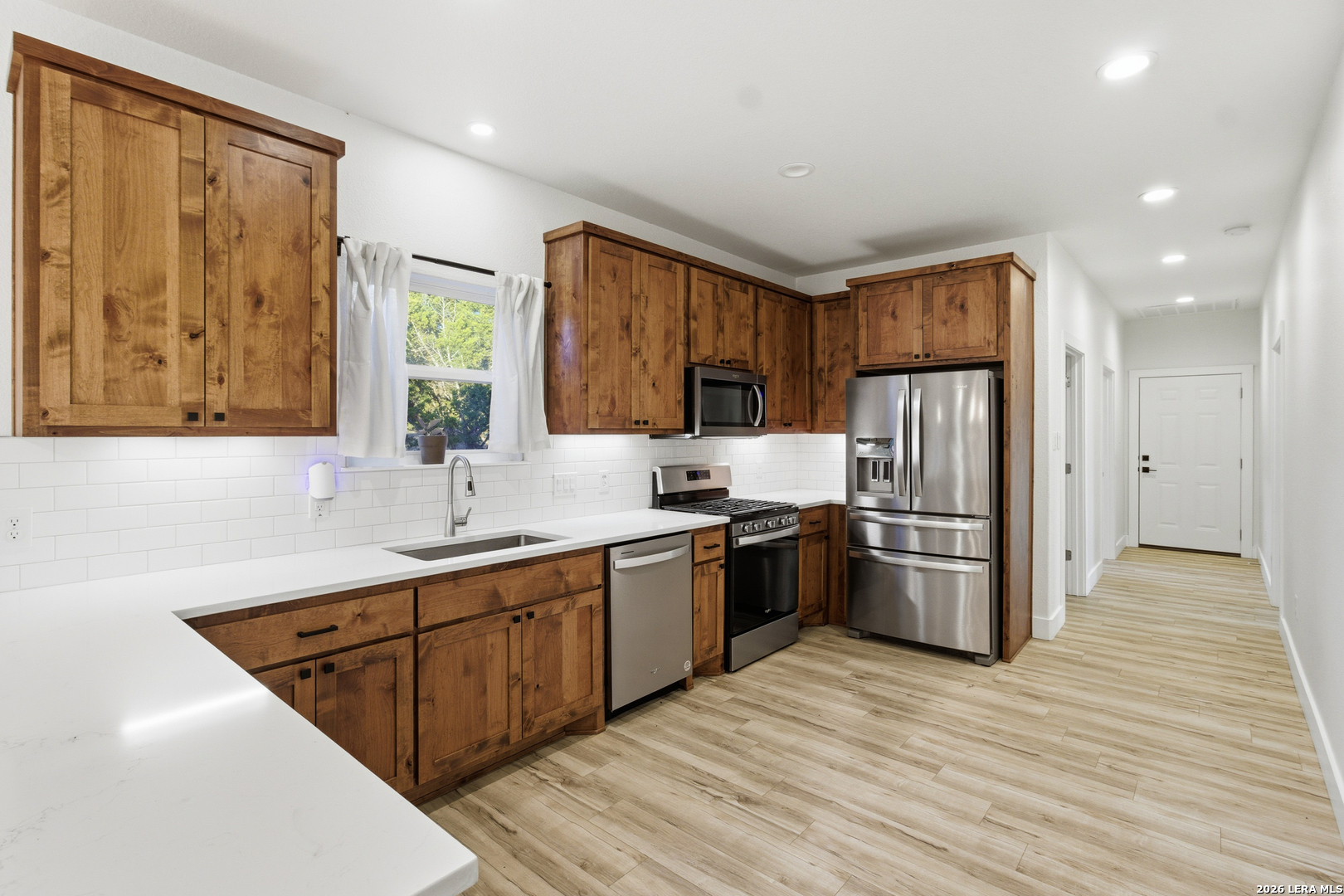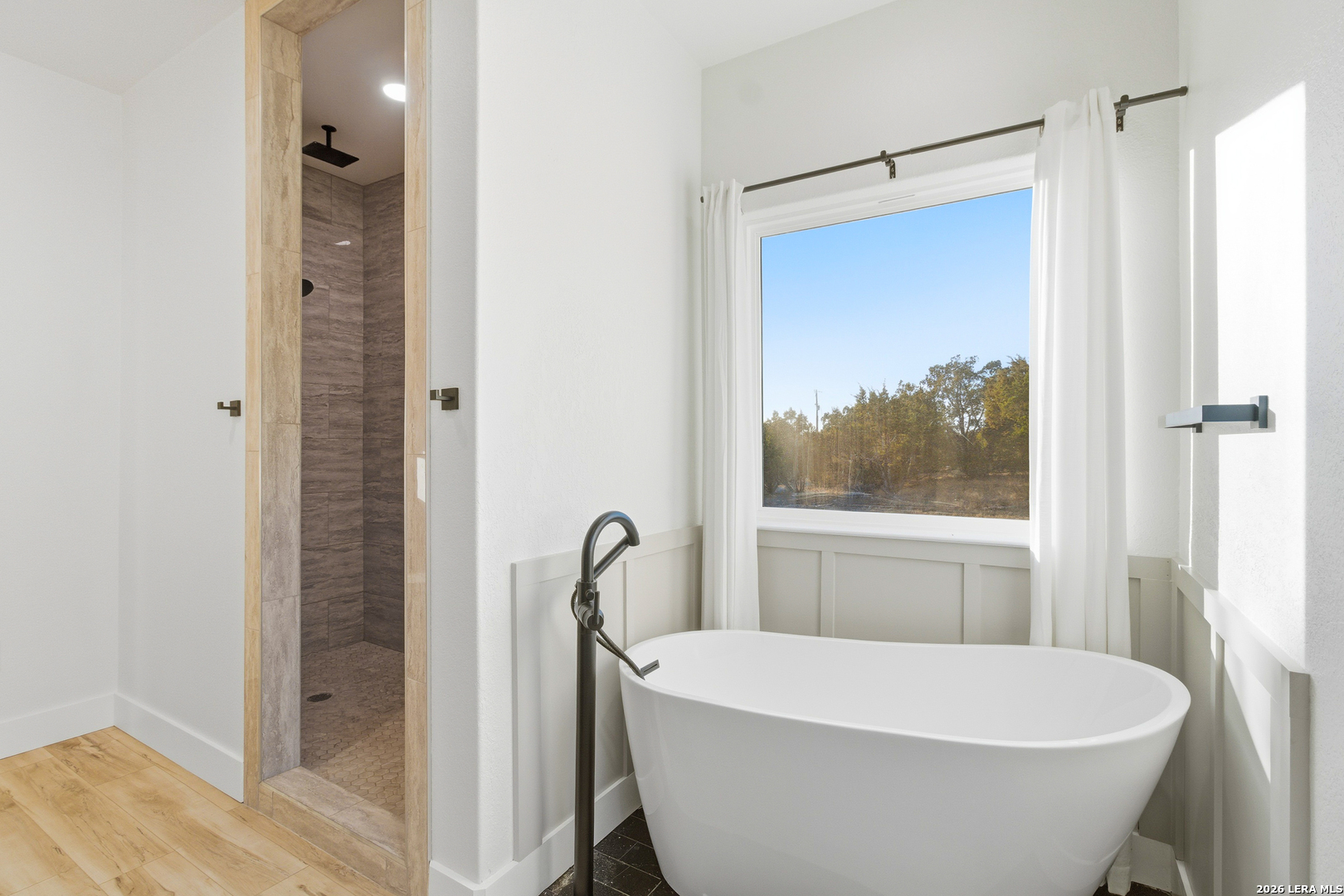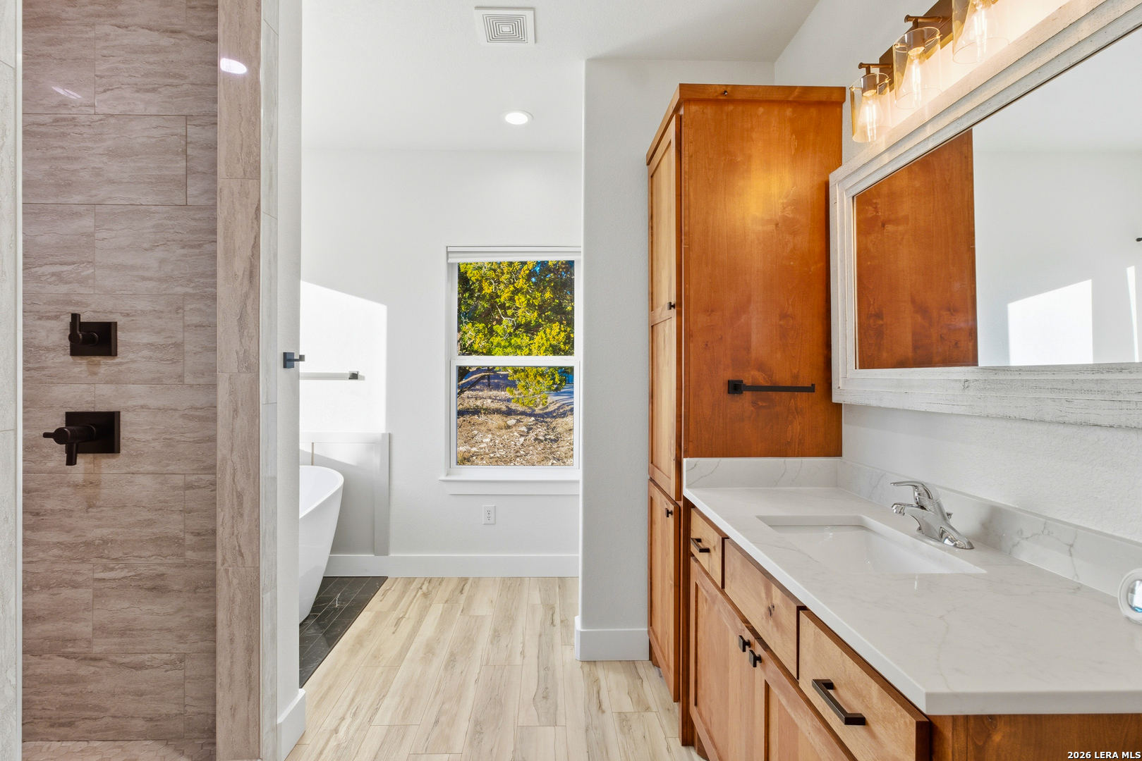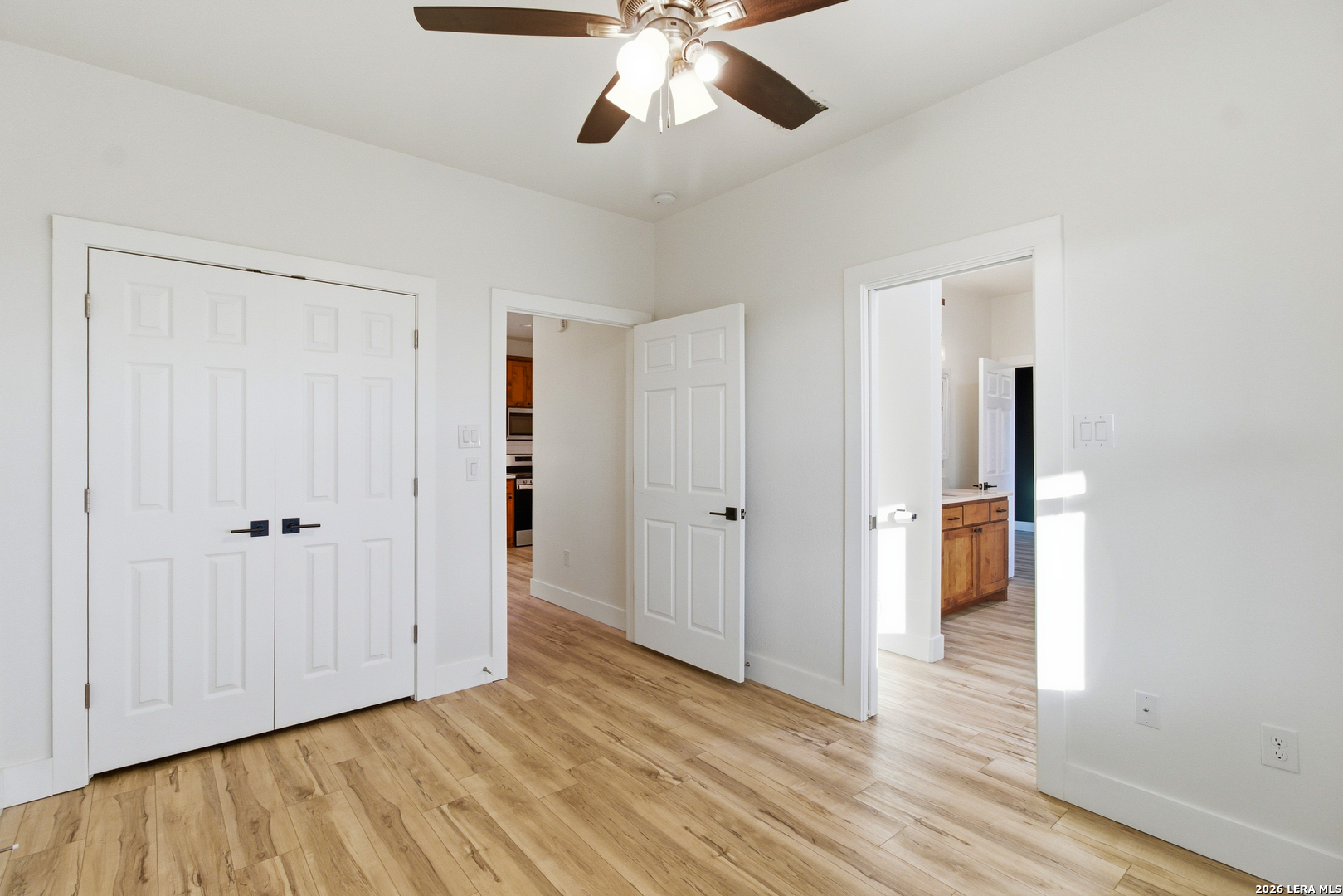 Experience peaceful Hill Country living with convenient access to nearby city amenities in this custom-built 2022 home, perfectly positioned to capture sweeping views in every direction. A newly added covered deck spans the back of the home, creating an ideal space for quiet mornings, evening gatherings, or simply soaking in the stunning scenery. Inside, the bright, open concept living area is designed for connection and comfort, with large windows that frame the landscape and fill the home with natural light. The thoughtful layout includes a Jack and Jill bathroom connecting two secondary bedrooms-one of which features an exceptionally large, primary sized walk-in closet. Originally designed with the flexibility of two primary style suites, this setup offers versatility for guests, multigenerational living, or a luxurious secondary bedroom. The private primary suite provides a relaxing retreat with a freestanding soaking tub, separate shower, and spacious walk-in closet. Ceiling fans throughout add year-round comfort. The property is fully fenced and equipped with both electric and solar powered gates for privacy and ease of access. Modern finishes, a functional layout, and a serene Hill Country setting make this home truly move in ready.