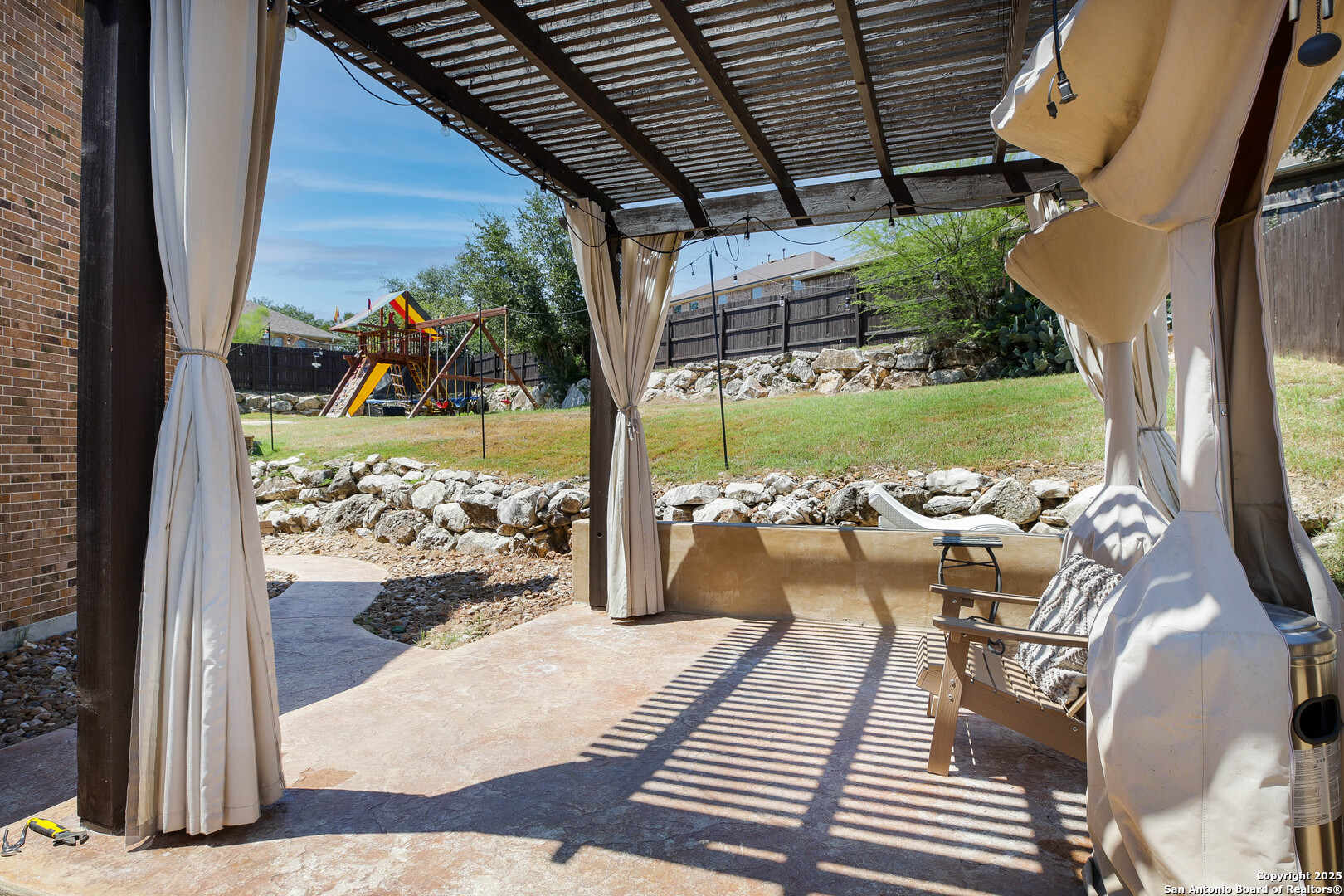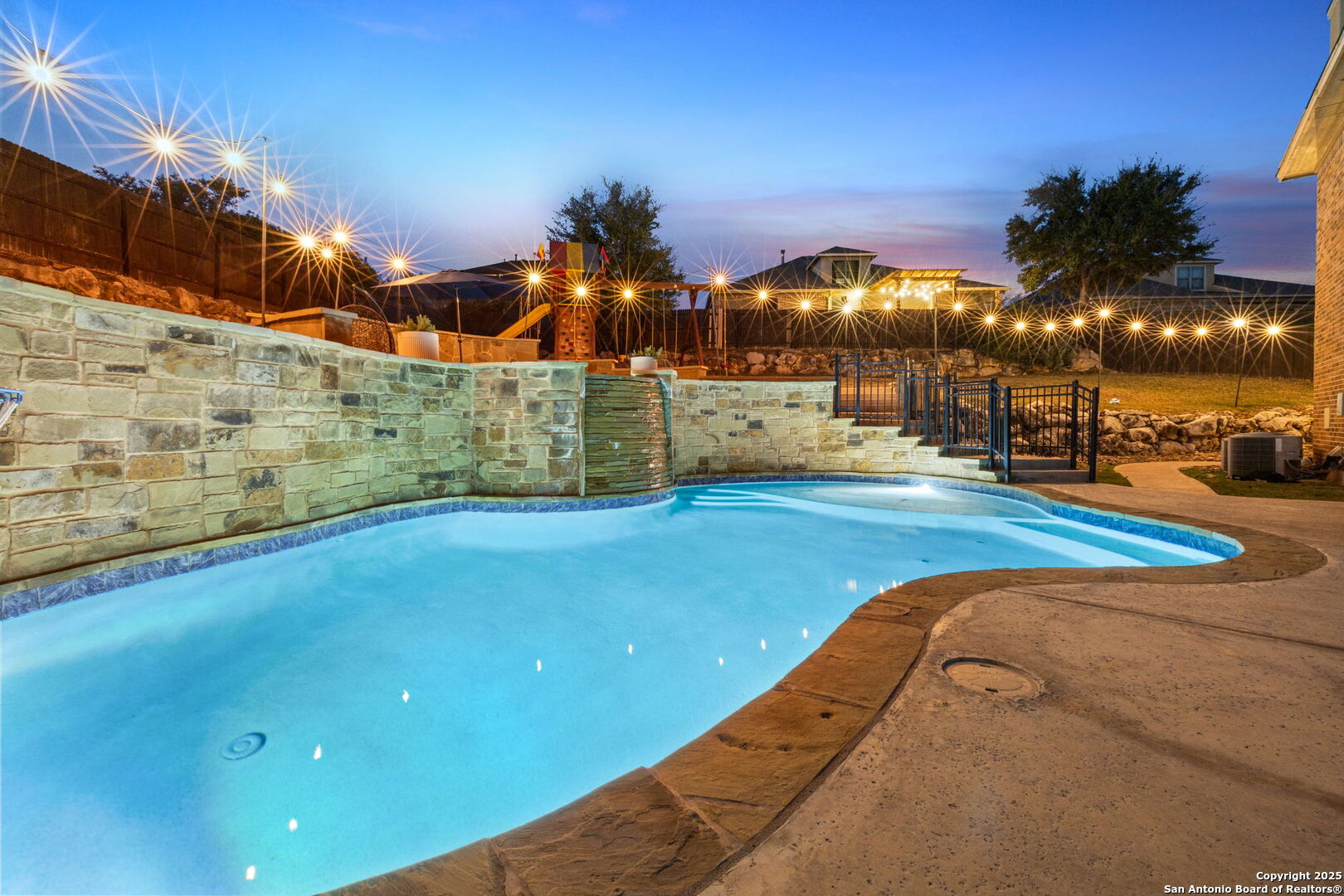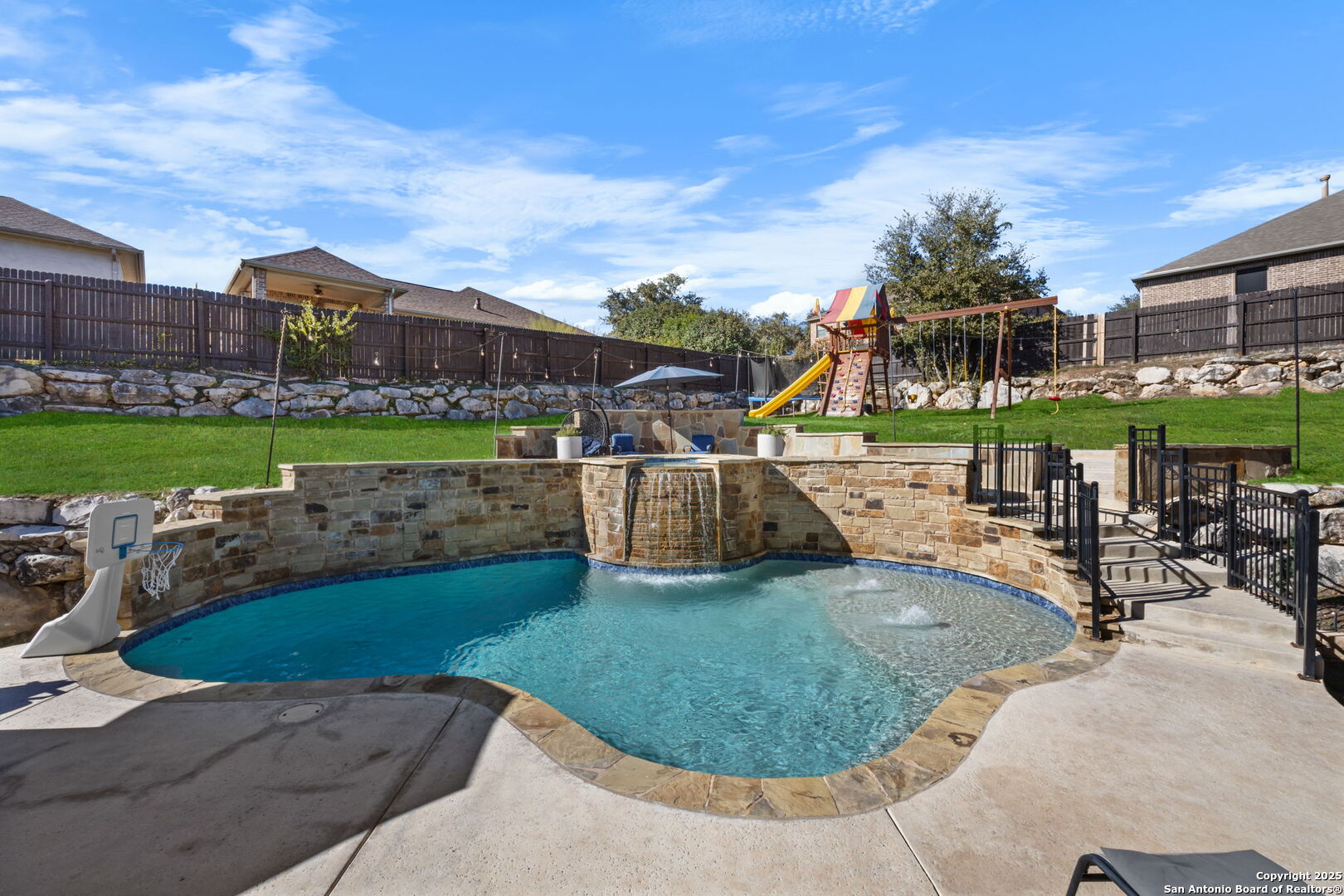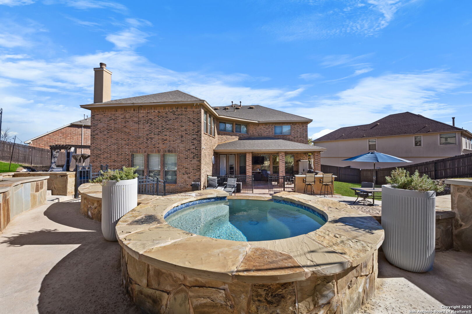 Timeless Elegance Meets Modern Luxury. Tucked away on a quiet cul-de-sac, this 5-bedroom, 3-bath residence blends classic design with modern comfort. With three spacious living areas, the home offers both refined entertaining spaces and inviting retreats. Featuring secondary bedroom on main level. Rich wood details and architectural character add warmth and timeless sophistication throughout. The expansive owner's suite is a private sanctuary-extra large in scale and featuring its own balcony, the perfect place to begin and end each day with that cup of coffee or sipping on a glass of wine. Outdoors, discover a resort-style haven designed for every occasion. The newer built pool-with cascading waterfall and integrated hot tub-this Texas Pools and Patio features this masterpiece for its beauty, design and craftsmanship. Two in-pool loungers, 3 in-pool stools and in-pool table w/ umbrella convey. A covered patio with built-in BBQ and mini-fridge and television creates the ideal space to watch the game or host gatherings in comfort.Beyond the pool and covered patio, a charming gazebo invites al fresco dining and evening conversations, while a newer playscape offers a perfect spot for laughter and adventure-making the backyard a retreat for all ages. Together, these features make the backyard a destination all its own. This rare offering combines elegance, comfort, and a lifestyle meant to be enjoyed. Situated just behind Methodist hospital in Stone Oak, with quick access to 281 and 1604. Minutes from the airport, and nearby world class dining and shopping makes this a convenient location for all. Seller willing to negotiate concessions
