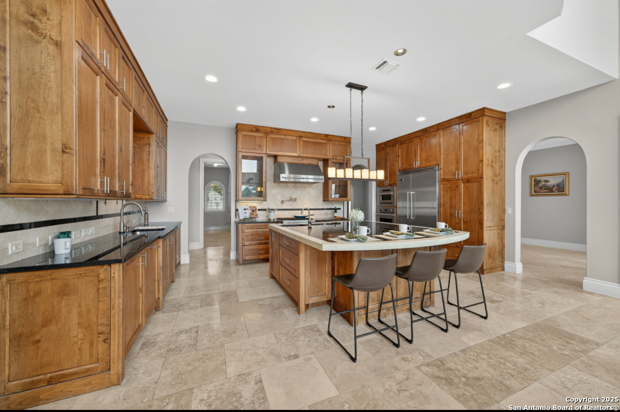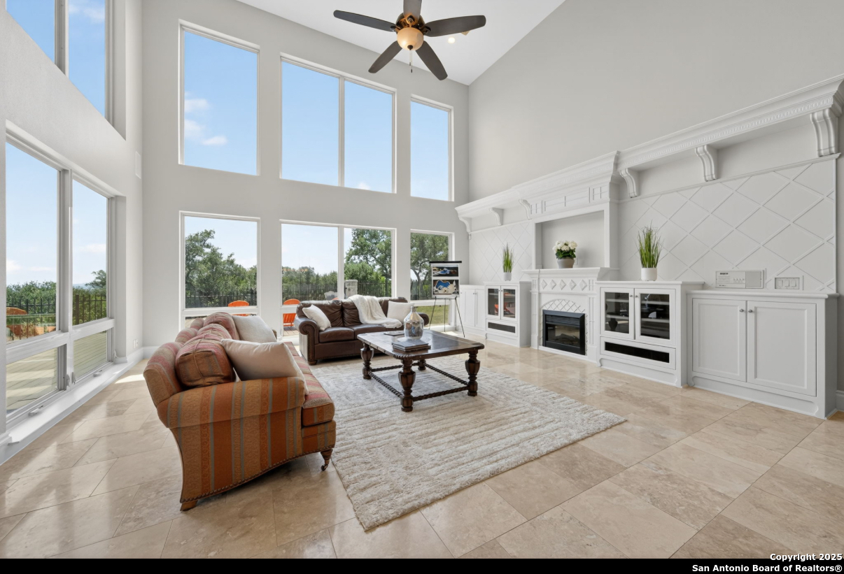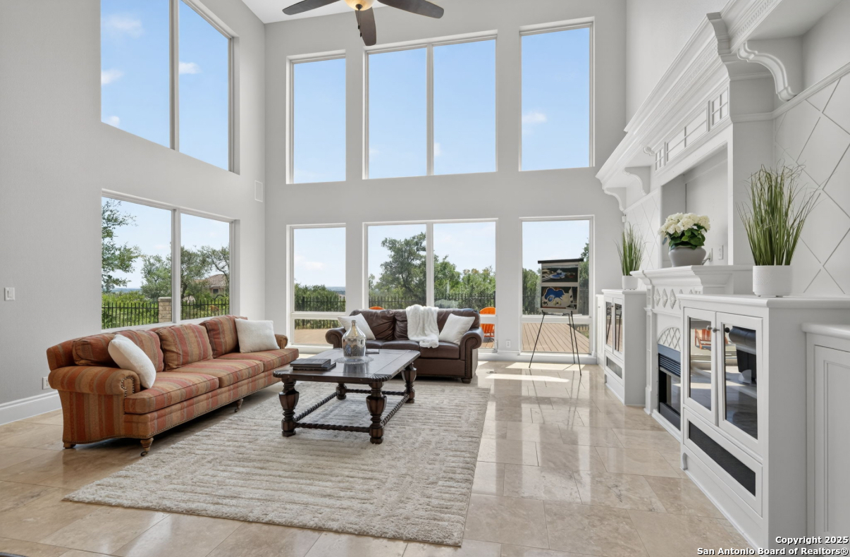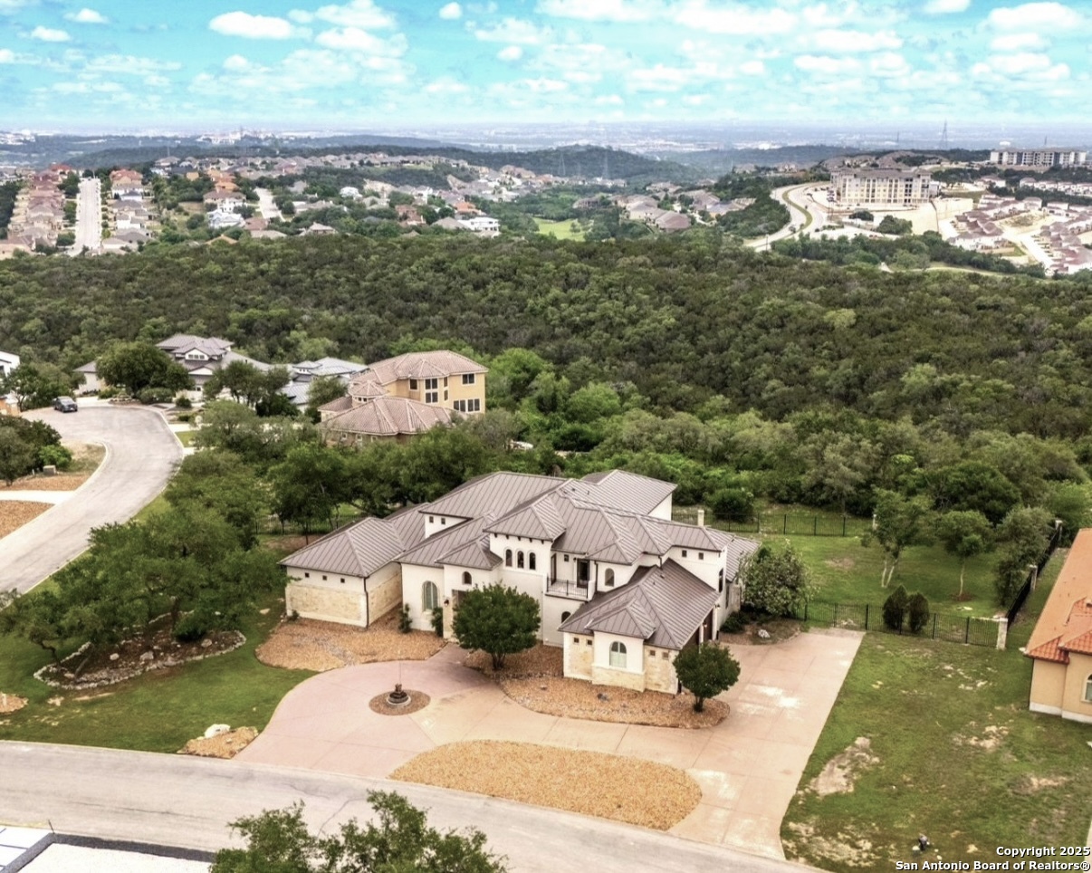 Welcome to 19223 Terra Rock, a residence in the Texas Hill Country designed to blend comfort and sophistication. This home is positioned on a 0.691-acre lot, offering scenic views of San Antonio and the surrounding Texas Hill Country. It features an open floor plan with ceilings that range from ten to twenty feet high, large windows, travertine flooring, and elegantly arched doorways. At the center of the home is a gourmet kitchen, which includes a spacious granite island, high-end "Viking" appliances, custom wood cabinetry, a six-burner gas cooktop, a dedicated vegetable sink, dual-element induction cooking, and an integrated refrigerator, catering to those who enjoy cooking. The property also contains two living areas and three dining areas, a study, a spacious exercise room, a media room, and a game room. The primary suite features an expansive bedroom with a walk-in closet and a luxurious bathroom, which includes a Jacuzzi tub and a multi-head shower. Additionally, there are two secondary bedrooms located on the first floor and two more bedrooms on the upper level. At the back of the home, there is a deck equipped with an outdoor kitchen, allowing for outdoor dining while taking in the views of the surrounding landscape. The neighborhood offers various amenities, including walking trails, a pavilion, sports courts, a swimming pool, and a basketball court. The property's location is convenient, with easy access to The Rim, La Cantera, the University of Texas at San Antonio (UTSA), the United Services Automobile Association (USAA), Valero Headquarters, and other notable landmarks in San Antonio, making it ideal for both work and leisure. For those interested in additional outdoor space, there is an option to purchase the adjacent 1.026-acre lot at 19219 Terra Rock, and the community is guard-gated for added security. This home is ready to move into today and convenience, incredible views and luxury living awaits!