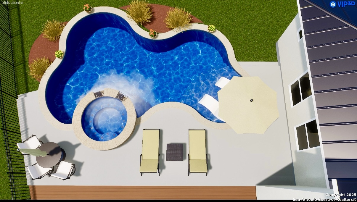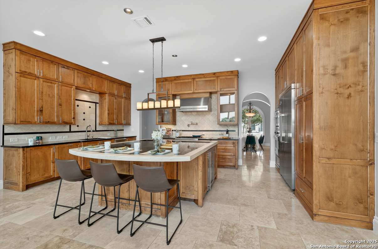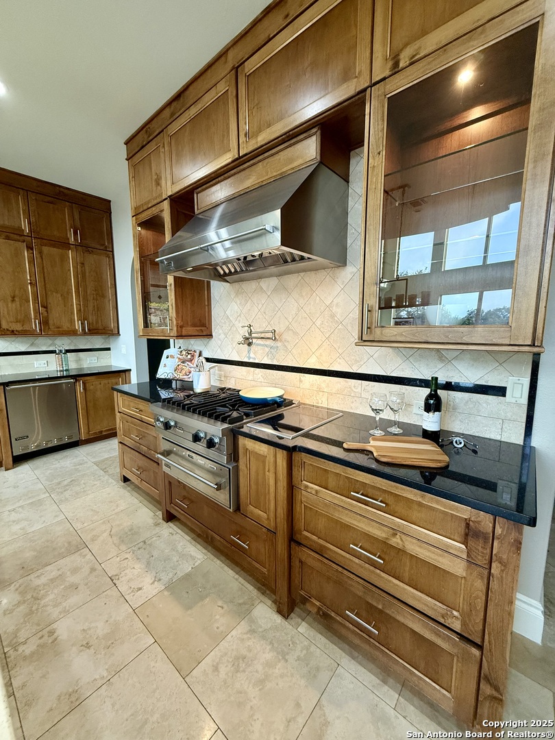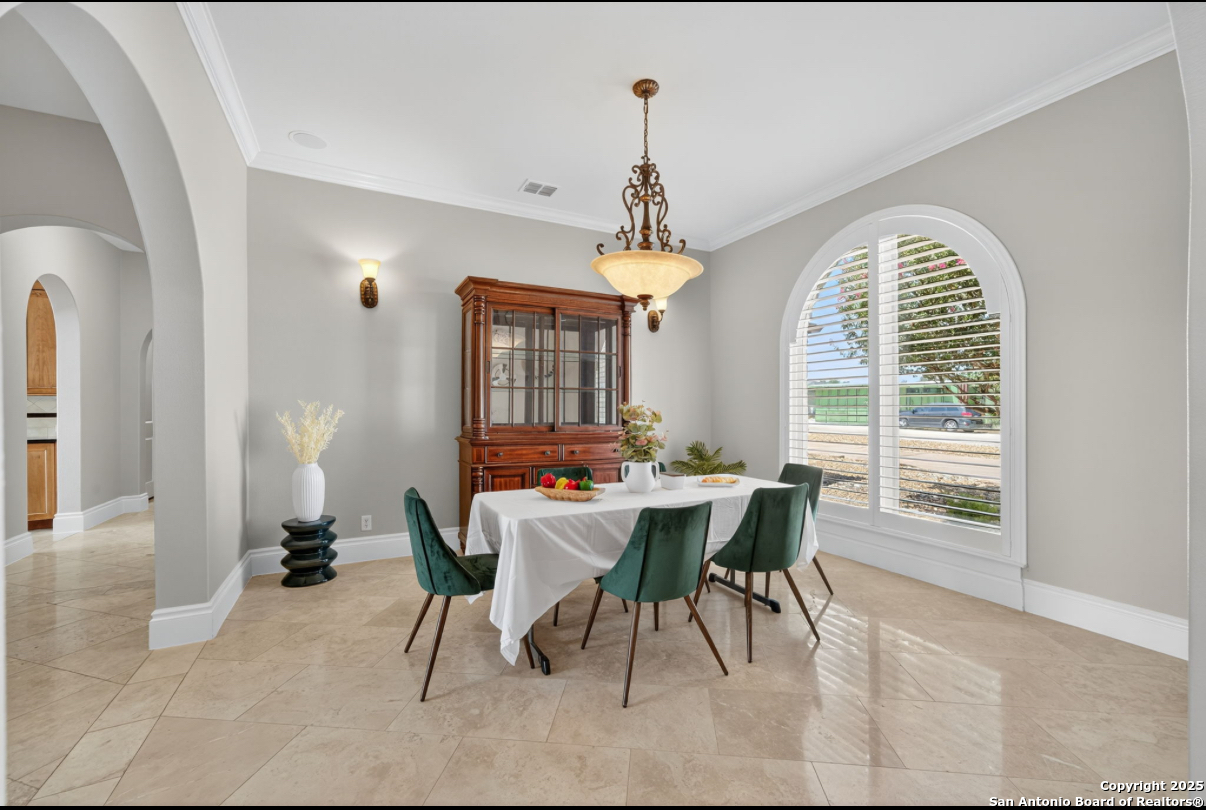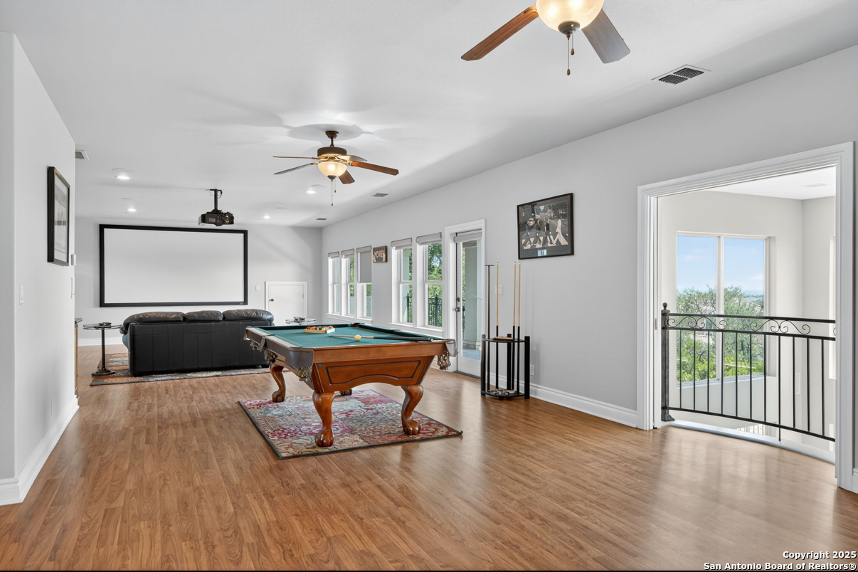 Welcome to 19223 Terra Rock, a residence in the Texas Hill Country designed to blend comfort and sophistication. This home is positioned on a 0.691-acre lot, offering scenic views of San Antonio and the surrounding Texas Hill Country. It features an open floor plan with ceilings that range from ten to twenty feet high, large windows, travertine flooring, and elegantly arched doorways. At the center of the home is a gourmet kitchen, which includes a spacious granite island, high-end "Viking" appliances, custom wood cabinetry, a six-burner gas cooktop, a dedicated vegetable sink, dual-element induction cooking, and an integrated refrigerator, catering to those who enjoy cooking. The property also contains two living areas and three dining areas, a study, a spacious exercise room, a media room, and a game room. The primary suite features an expansive bedroom with a walk-in closet and a luxurious bathroom, which includes a Jacuzzi tub and a multi-head shower. Additionally, there are two secondary bedrooms located on the first floor and two more bedrooms on the upper level. At the back of the home, there is a deck equipped with an outdoor kitchen, allowing for outdoor dining while taking in the views of the surrounding landscape. The neighborhood offers various amenities, including walking trails, a pavilion, sports courts, a swimming pool, and a basketball court. The property's location is convenient, with easy access to The Rim, La Cantera, the University of Texas at San Antonio (UTSA), the United Services Automobile Association (USAA), Valero Headquarters, and other notable landmarks in San Antonio, making it ideal for both work and leisure. For those interested in additional outdoor space, there is an option to purchase the adjacent 1.026-acre lot at 19219 Terra Rock, and the community is guard-gated for added security. This home is ready to move into today and convenience, incredible views and luxury living awaits!