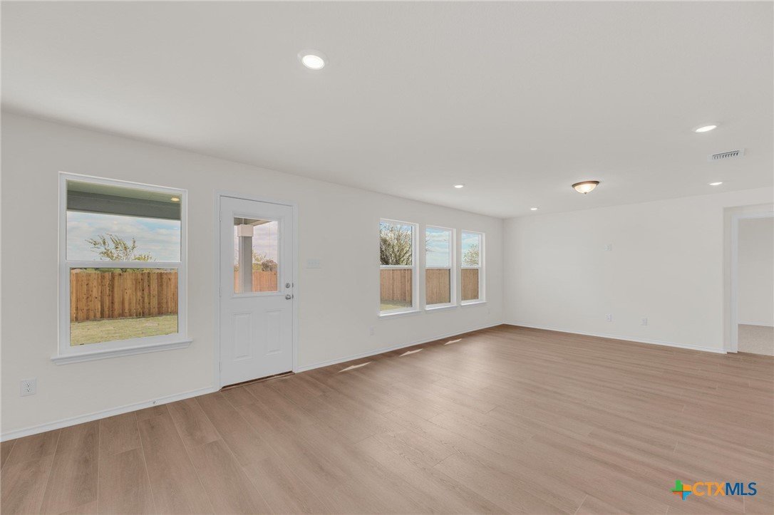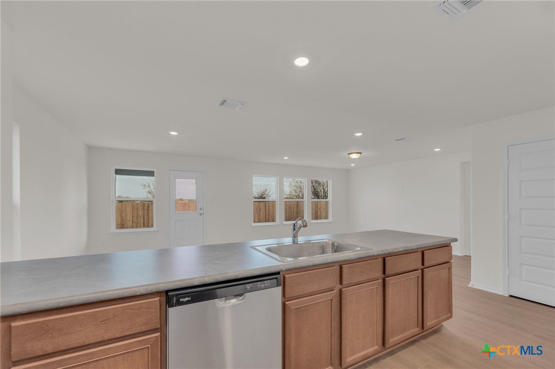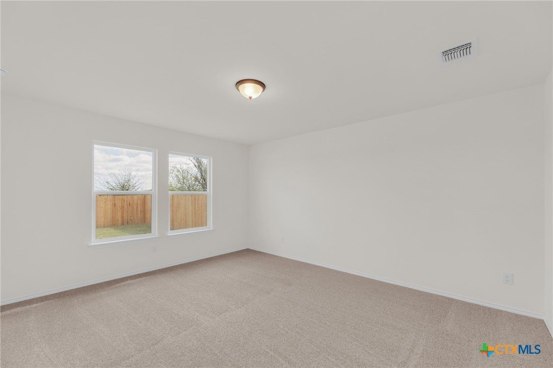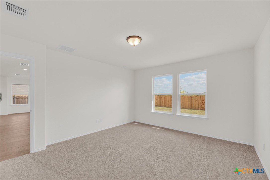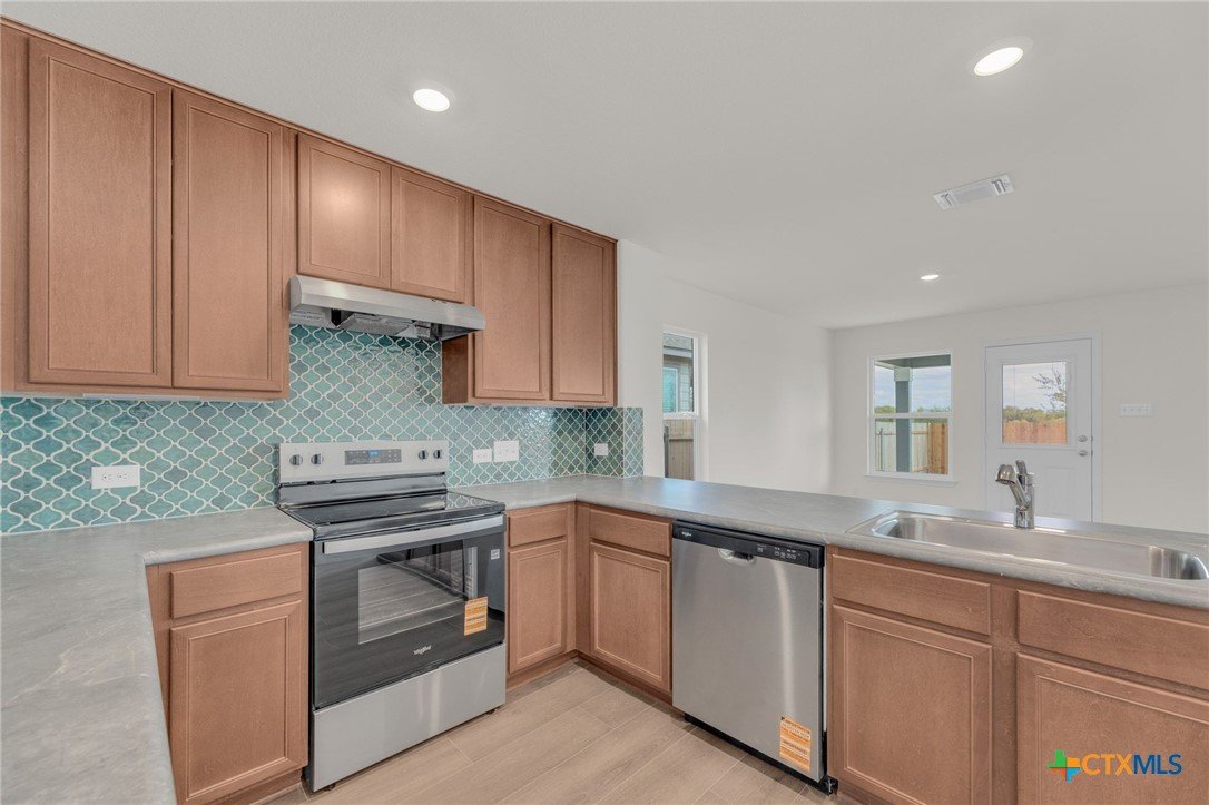 Discover this charming single-story home featuring a spacious great room, perfect for relaxing or entertaining. A versatile den offers space for a home office or retreat. The kitchen boasts flat panel upper cabinets in Ginger, complemented by durable laminate countertops in Roca Bosco, and a sleek tile backsplash. The primary bedroom features a walk-in closet, while the connecting bath offers a dual sink vanity with Silestone® countertops, and a tub/shower combination with a tile surround. Enjoy stylish luxury vinyl plank flooring in the kitchen and great room, plush carpet in the den and bedrooms, and timeless tile flooring in the bathrooms. Additional highlights include a smart thermostat, Sherwin-Williams® interior paint, and Moen® fixtures throughout. Outside, the covered back patio provides the ideal spot for outdoor relaxation.