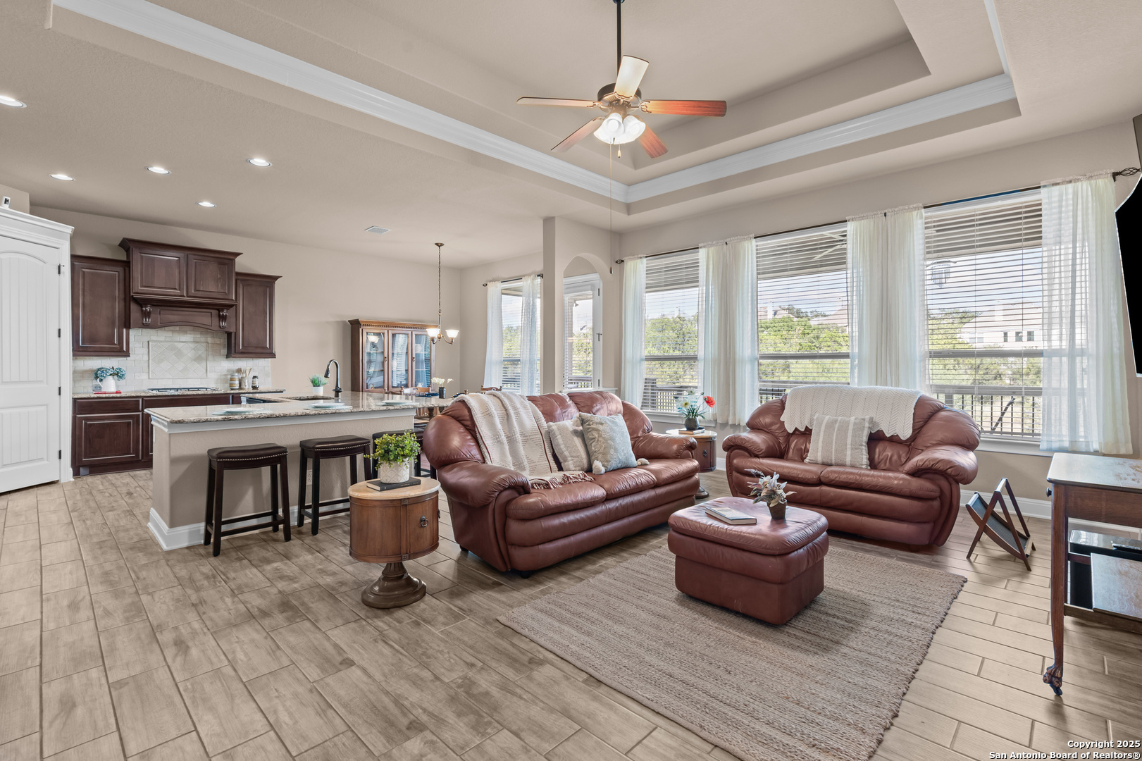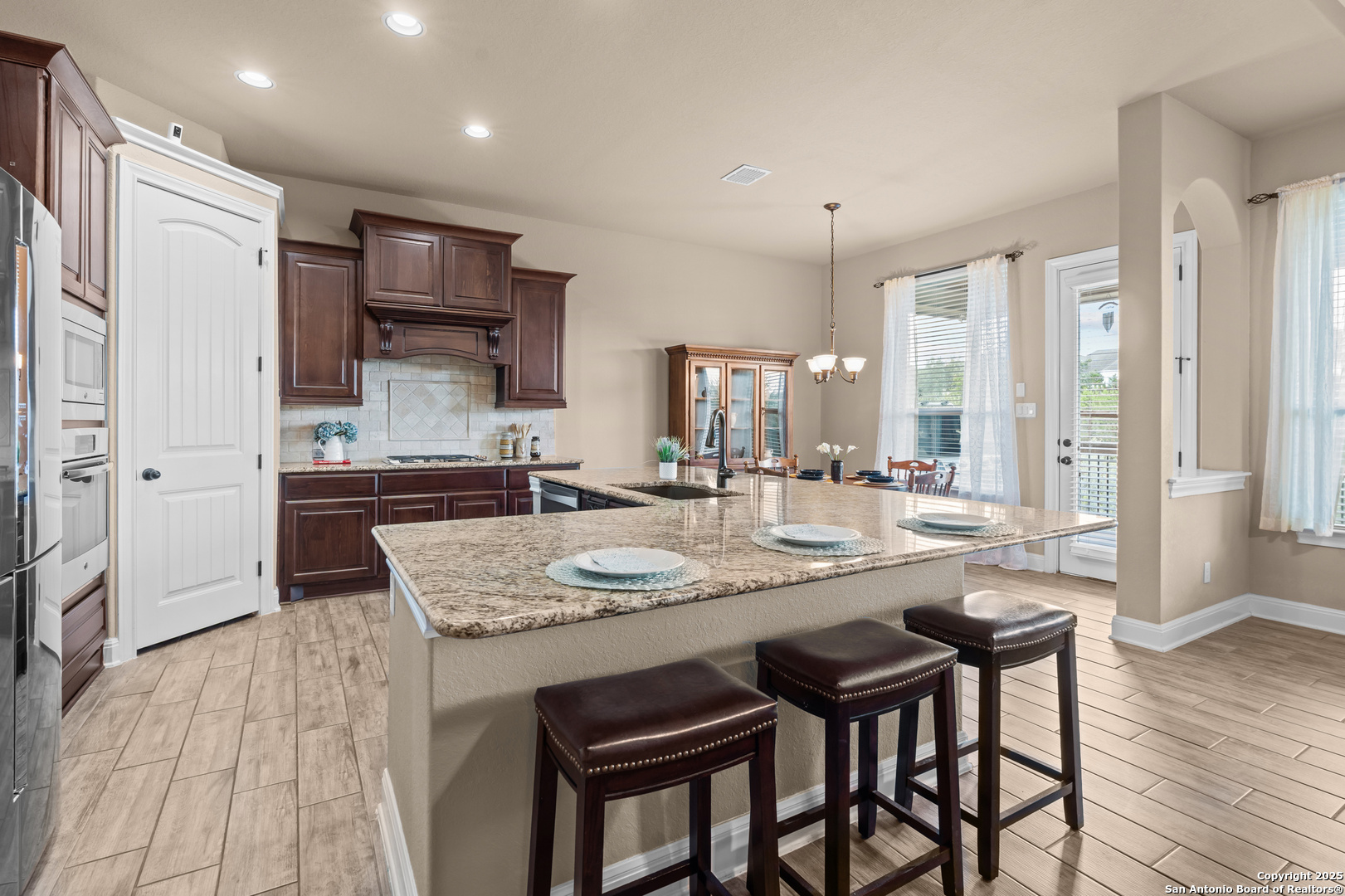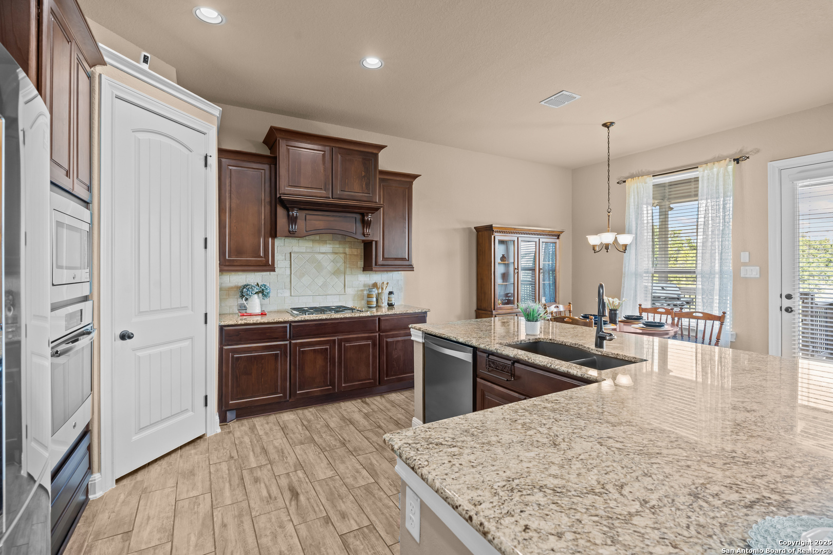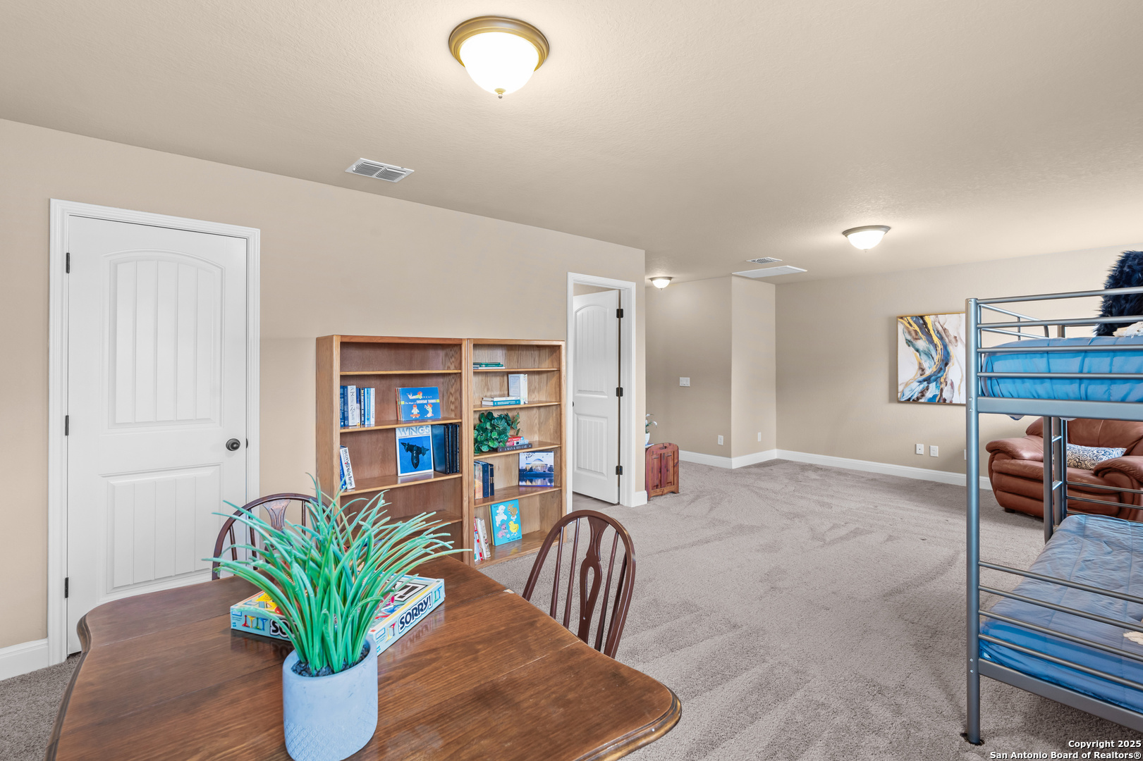 WELCOME HOME to this immaculate 1.5-story home tucked away on a cul-de-sac street and backing to a beautiful greenbelt in highly desirable Mountain Lodge! **VA Assumable for eligible veterans at 2.25%.** Designed for both comfort and flexibility, this open and thoughtfully planned layout features three spacious bedrooms and three full baths, a formal dining room, plus a versatile flex room ideal for a home office, workout space, or fourth bedroom (note: no closet, but not a Texas requirement for a bedroom), all on the main level. Upstairs, a large game room with its own full bath and walk-in closet offers the perfect opportunity for a private guest suite, or even a fifth bedroom, if desired. At the heart of the home is a chef's kitchen featuring stainless steel appliances, gas cooking, granite countertops, a walk-in pantry, and an oversized L-shaped island with counter-height seating that opens to the breakfast area and family room perfect for everyday living or gathering with friends and family. A wall of windows along the back of the home fills the space with natural light and showcases the serene greenbelt views. The primary suite serves as a relaxing retreat with new wood-like tile flooring in the bedroom, a large walk-in shower with full tile surround, a garden tub, and a spacious walk-in closet. Additional highlights include tall and coffered ceilings, wood-look tile throughout the main level, granite counters and framed mirrors in all bathrooms, a three-car garage, a recently replaced water heater, whole-house water filtration system, water softener, gutters, and so much more. Out back, enjoy an extended covered patio with a rich wood ceiling and two ceiling fans perfect for peaceful mornings, outdoor dining, or unwinding in the evening. There's under-deck storage and plenty of space to run, play, or explore the greenbelt. A gas stub on the patio makes outdoor grilling a breeze. This home offers the perfect blend of style, comfort, and relaxed Hill Country living all just a short walk from one of the community pools. Mountain Lodge is a gated community with two entrances, two large pools, baby pools with sunshades, a park, and a basketball court. The home is zoned to award-winning NEISD schools and is within walking distance to Tuscany Heights Elementary. With the completion of highway construction, HWY 281 now provides quick access to 1604 and beyond. This location is convenient to the JW Marriott TPC golf course, Stone Oak shopping and dining, hospitals, and major employers-all with no city taxes. Don't miss out!