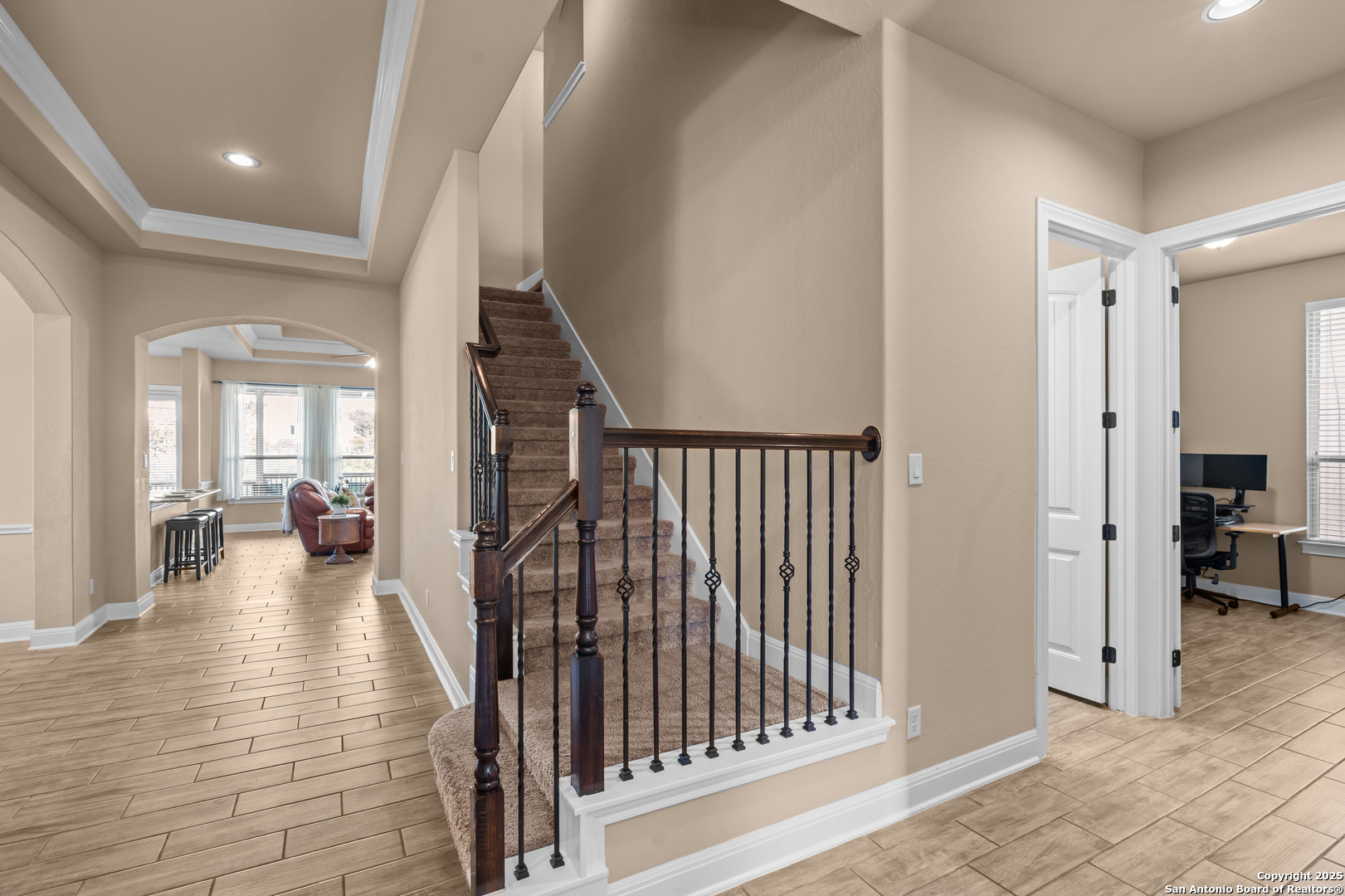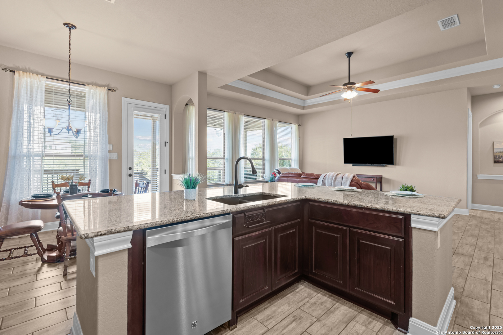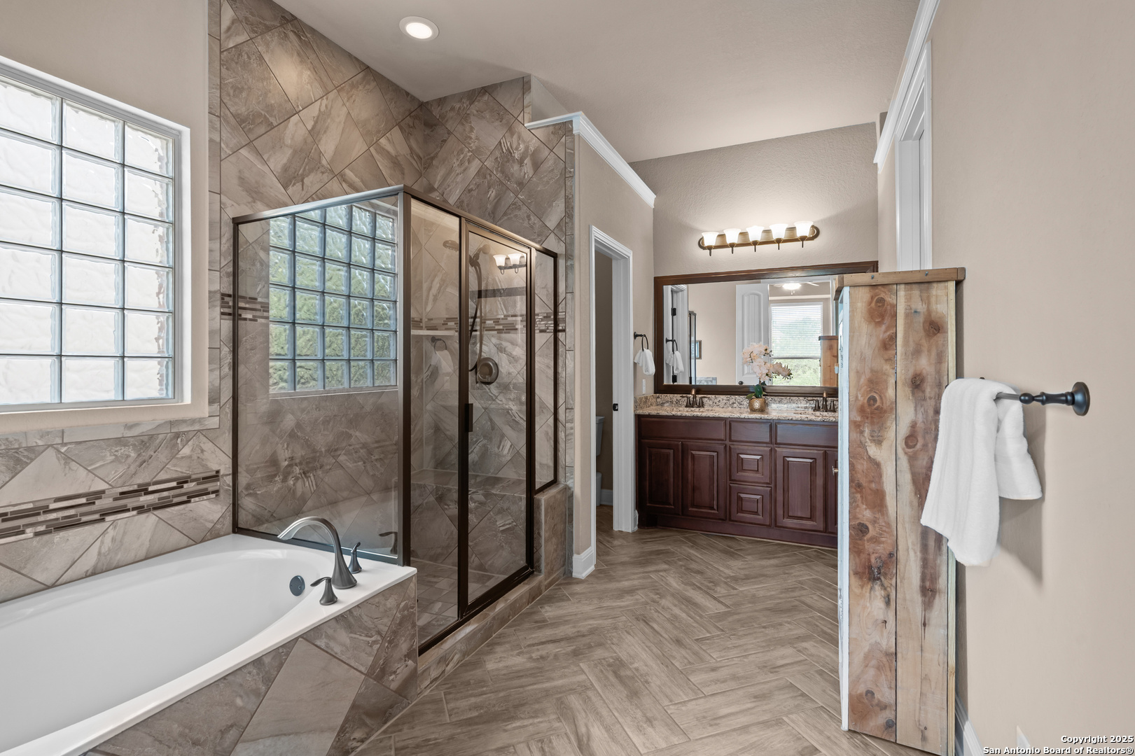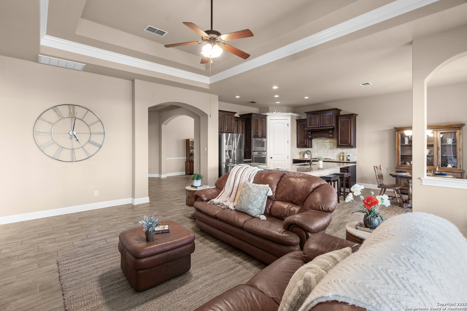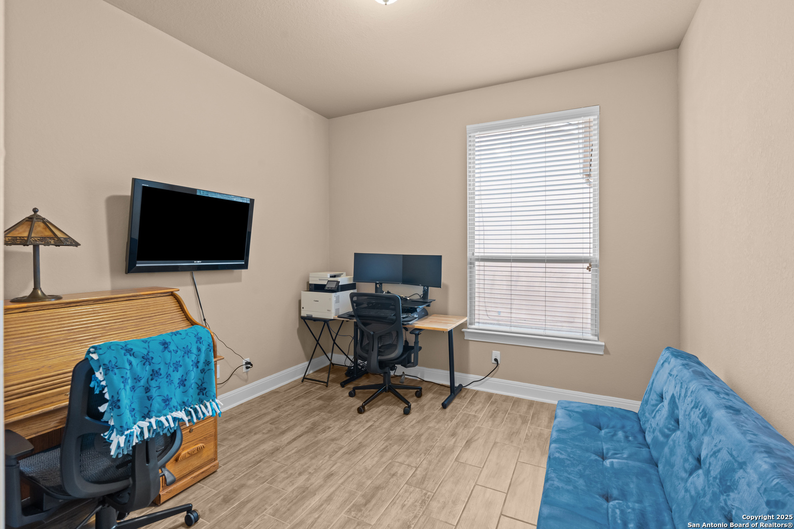 WELCOME HOME to this immaculate 1.5-story home tucked away on a cul-de-sac street and backing to a beautiful greenbelt in highly desirable Mountain Lodge! **VA Assumable for eligible veterans at 2.25%.** Designed for both comfort and flexibility, this open and thoughtfully planned layout features three spacious bedrooms and three full baths, a formal dining room, plus a versatile flex room ideal for a home office, workout space, or fourth bedroom (note: no closet, but not a Texas requirement for a bedroom), all on the main level. Upstairs, a large game room with its own full bath and walk-in closet offers the perfect opportunity for a private guest suite, or even a fifth bedroom, if desired. At the heart of the home is a chef's kitchen featuring stainless steel appliances, gas cooking, granite countertops, a walk-in pantry, and an oversized L-shaped island with counter-height seating that opens to the breakfast area and family room perfect for everyday living or gathering with friends and family. A wall of windows along the back of the home fills the space with natural light and showcases the serene greenbelt views. The primary suite serves as a relaxing retreat with new wood-like tile flooring in the bedroom, a large walk-in shower with full tile surround, a garden tub, and a spacious walk-in closet. Additional highlights include tall and coffered ceilings, wood-look tile throughout the main level, granite counters and framed mirrors in all bathrooms, a three-car garage, a recently replaced water heater, whole-house water filtration system, water softener, gutters, and so much more. Out back, enjoy an extended covered patio with a rich wood ceiling and two ceiling fans perfect for peaceful mornings, outdoor dining, or unwinding in the evening. There's under-deck storage and plenty of space to run, play, or explore the greenbelt. A gas stub on the patio makes outdoor grilling a breeze. This home offers the perfect blend of style, comfort, and relaxed Hill Country living all just a short walk from one of the community pools. Mountain Lodge is a gated community with two entrances, two large pools, baby pools with sunshades, a park, and a basketball court. The home is zoned to award-winning NEISD schools and is within walking distance to Tuscany Heights Elementary. With the completion of highway construction, HWY 281 now provides quick access to 1604 and beyond. This location is convenient to the JW Marriott TPC golf course, Stone Oak shopping and dining, hospitals, and major employers-all with no city taxes. Don't miss out!