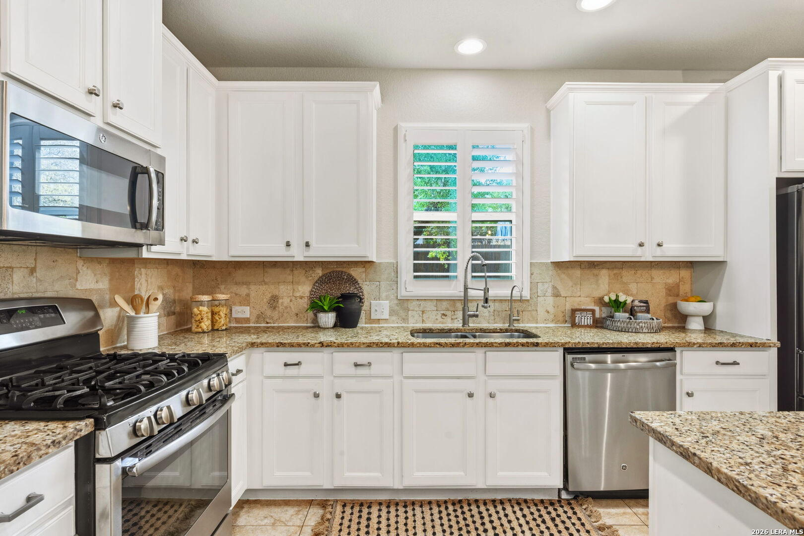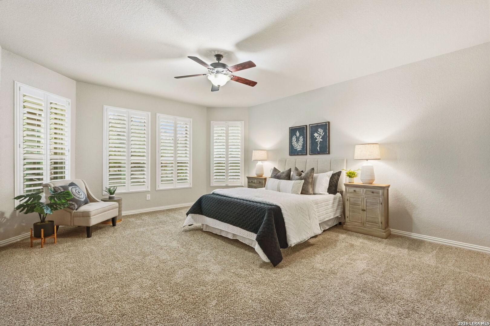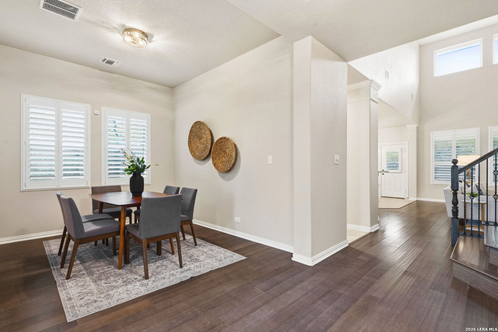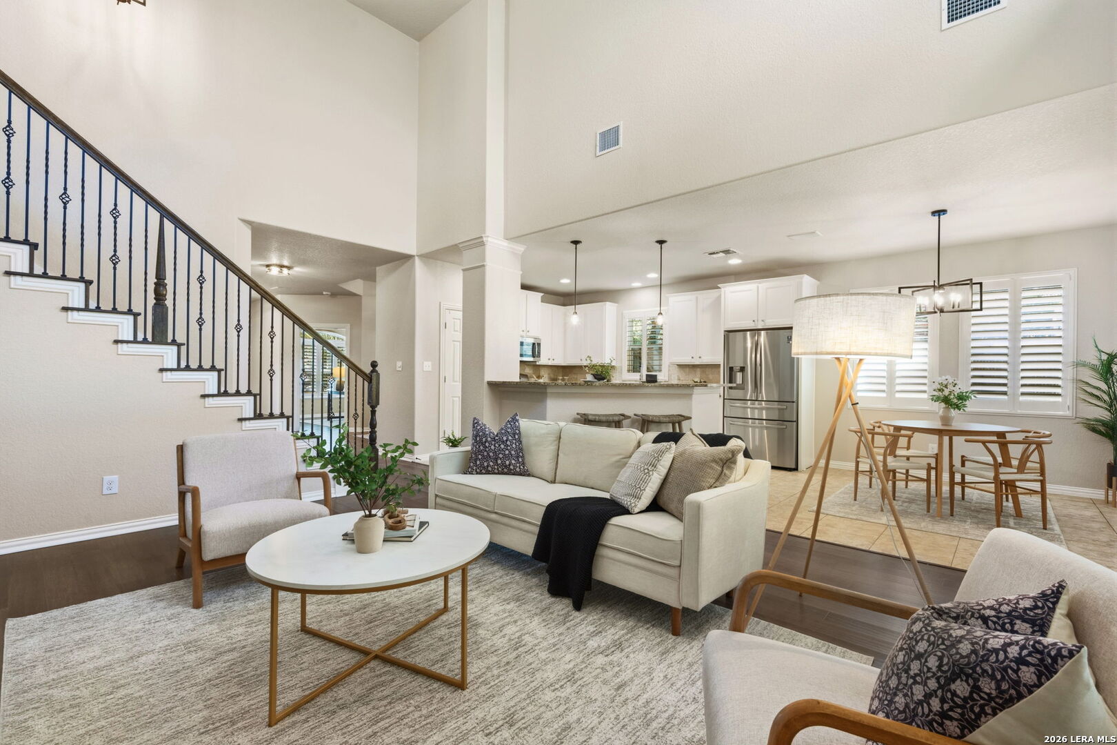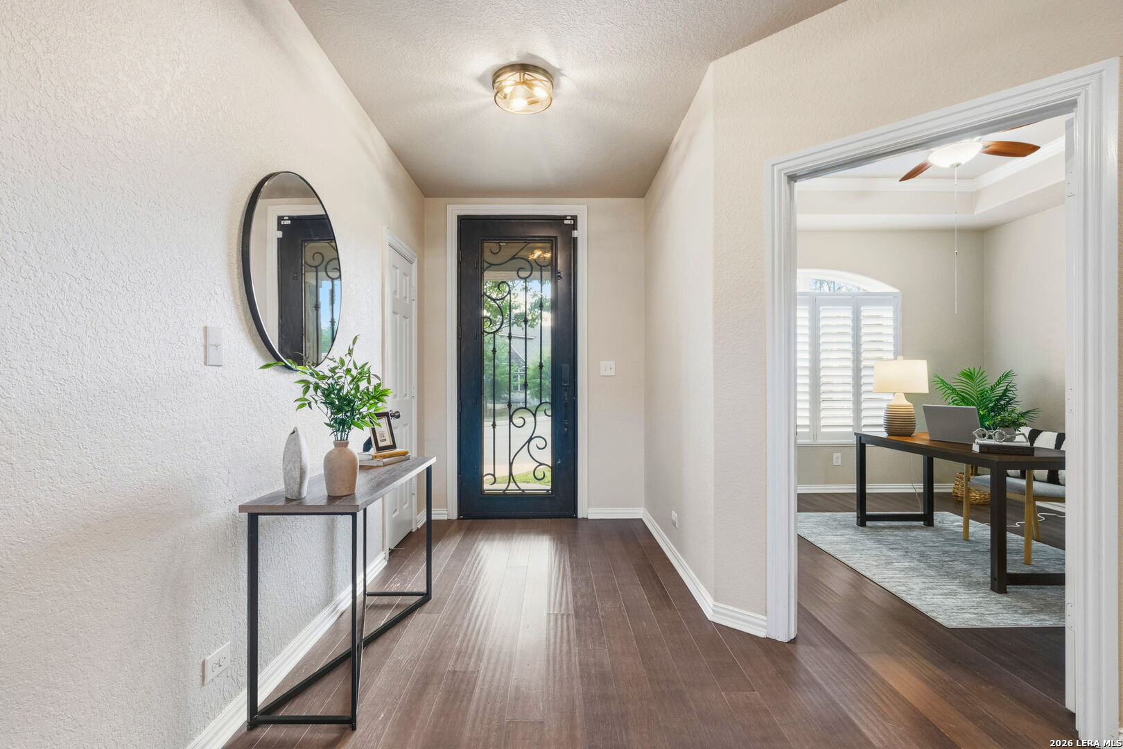 Exceptional opportunity in the gated community of Kinder Ranch-offering a rare advantage in today's market with a VA assumable loan at an incredible 2.75% interest rate (for qualified buyers). Situated on a generously sized lot, this beautifully maintained David Weekley home delivers the space, upgrades, and value buyers are searching for-without the wait or added expense of new construction. Step inside through a custom iron door into a grand foyer featuring rich bamboo flooring and a light-filled interior. The impressive two-story family room showcases soaring ceilings, plantation shutters, and an open-concept design ideal for both everyday living and entertaining. The thoughtfully designed kitchen offers a breakfast bar, eat-in dining space, and seamless flow into the main living areas, complemented by surround sound throughout the downstairs. A separate dining room provides flexibility for formal gatherings or could be used as a flex room. Enjoy outdoor living at its finest with an expansive covered patio, basketball pad, and a spacious backyard-perfect for entertaining or relaxing in your own private retreat. Located within highly sought-after Comal ISD, this home combines lifestyle, value, and location-making it a standout option in a neighborhood where homes are competing with new construction. Motivated seller-bring your buyers.