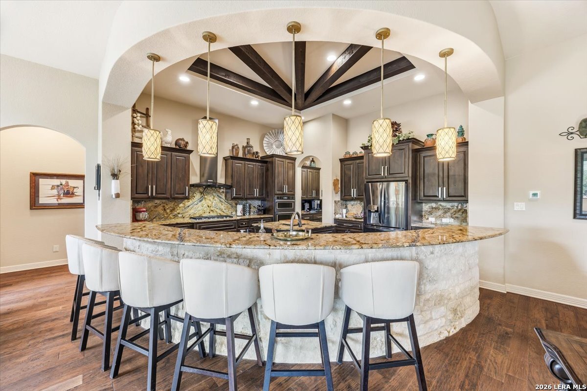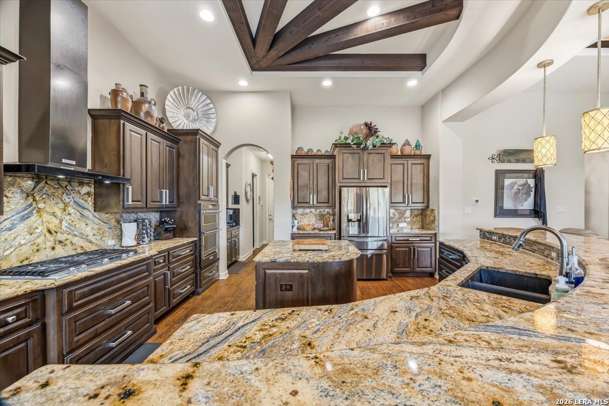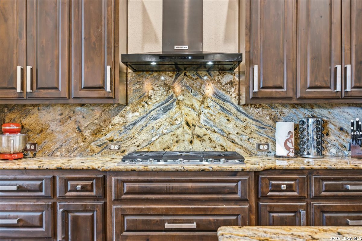 Custom single-story home in Vintage Oaks at the Vineyard on a 1-acre lot with mature oaks. Stucco and natural limestone exterior with a xeriscaped front and curved concrete drive. Inside, an open floor plan connects the great room, kitchen, and dining areas. The great room features a floor-to-ceiling limestone fireplace and exposed wood beam ceiling. The kitchen offers custom espresso cabinetry, granite countertops and backsplash, a curved island with seating, oven/microwave combination, pro-grade gas cooktop with range hood, walk-in pantry, and a butler's bar. The primary suite includes a wood-inlay tray ceiling, sitting area, dual vessel-sink vanities, Jacuzzi tub, walk-in shower, and large walk-in closet. The two secondary bedrooms each feature their own private sink area and custom window cornices, sharing a Jack-and-Jill bath with tub and commode. A dedicated office, powder room, and laundry room complete the interior. Outdoors: a covered limestone-column patio with wood ceiling and ceiling fan, plus an extended flagstone patio with fire pit. The attached three-car garage features an insulated, walled-off third bay ideal as a shop or additional storage. Nestled in an established Hill Country community with native terrain and proximity to Canyon Lake. This custom-built, single-owner residence delivers quality craftsmanship on a generous, tree-studded acre. Schedule your showing today!