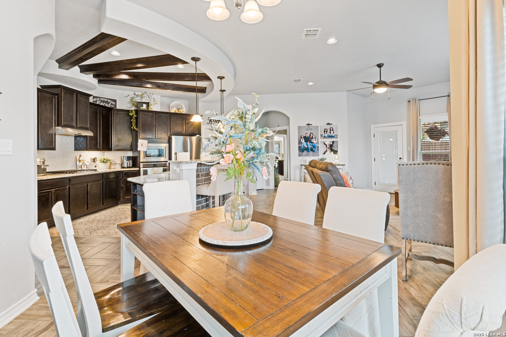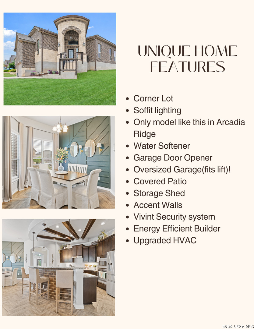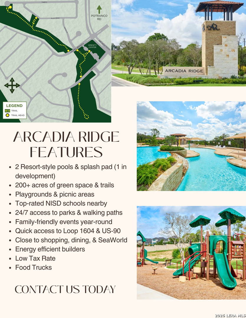 This stunning 2018 NewLeaf home sits on a prime corner lot in the highly sought-after Arcadia Ridge community and offers the perfect blend of style, comfort, and functionality. Featuring 3 spacious bedrooms, 2 bathrooms, and 2,158 square feet, this home is designed to impress from the moment you walk in. The architectural details truly set this one apart... from the beautiful wood beam accents to the thoughtfully designed accent walls, every inch of this home feels elevated. The kitchen is an absolute showpiece, opening seamlessly to the main living area, making it perfect for entertaining or just enjoying everyday life. Step outside and enjoy the added privacy and curb appeal that comes with a corner lot, all within a vibrant, growing neighborhood. Arcadia Ridge is known for its lifestyle. Residents enjoy resort-style amenities including pools, a splash pad, playgrounds, picnic areas, and over 200 acres of green space with walking trails. It's a community built for connection, with family-friendly events, food trucks, and plenty of room to get outside and enjoy. Location-wise, it doesn't get much better. You're just minutes from shopping, dining, and SeaWorld, with quick access to Loop 1604 and US-90 for an easy commute. Plus, you're conveniently located near Lackland Air Force Base and zoned to top-rated NISD schools. Did I mention a low tax rate! Homes like this don't come around often...Schedule your showing and come see it for yourself.