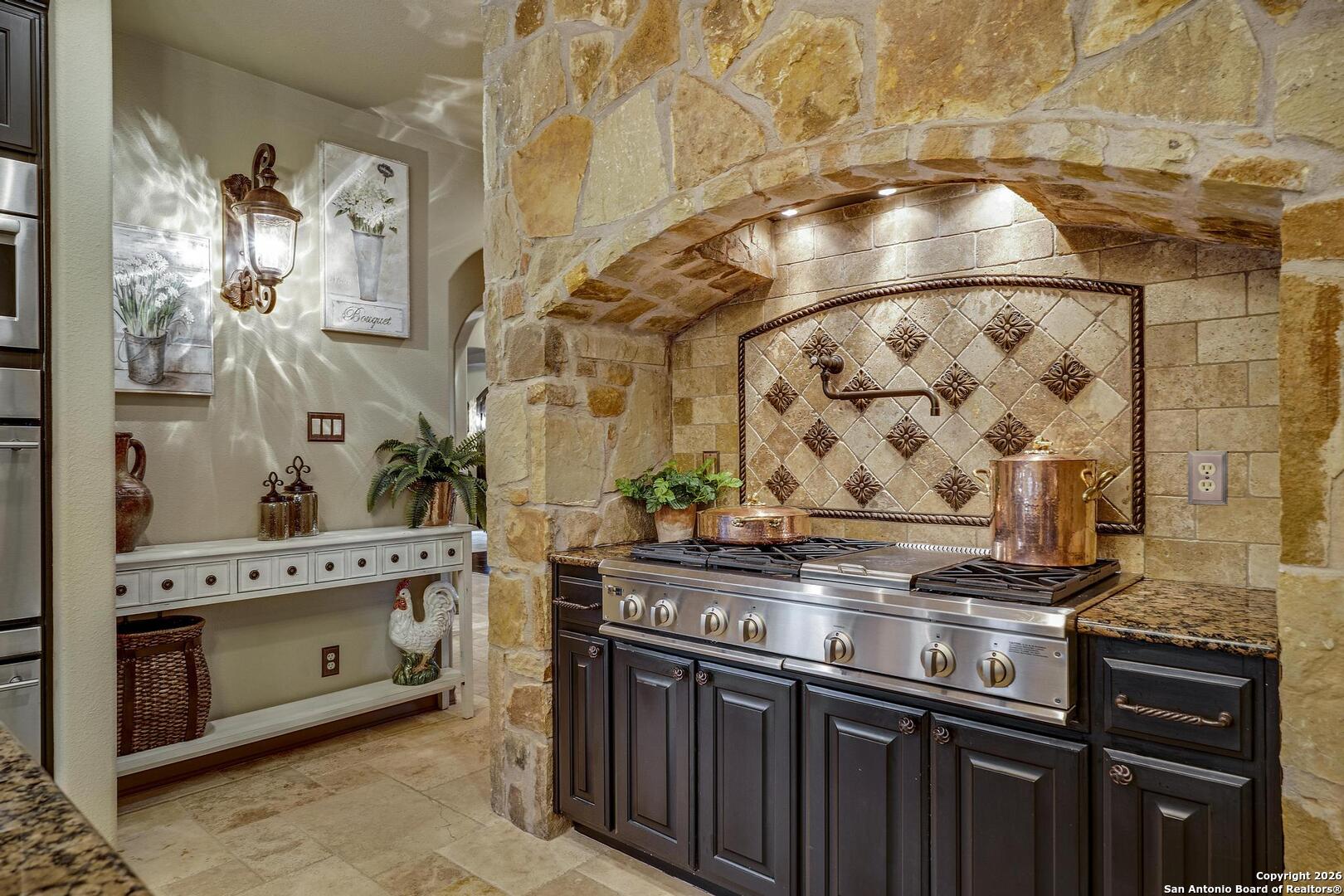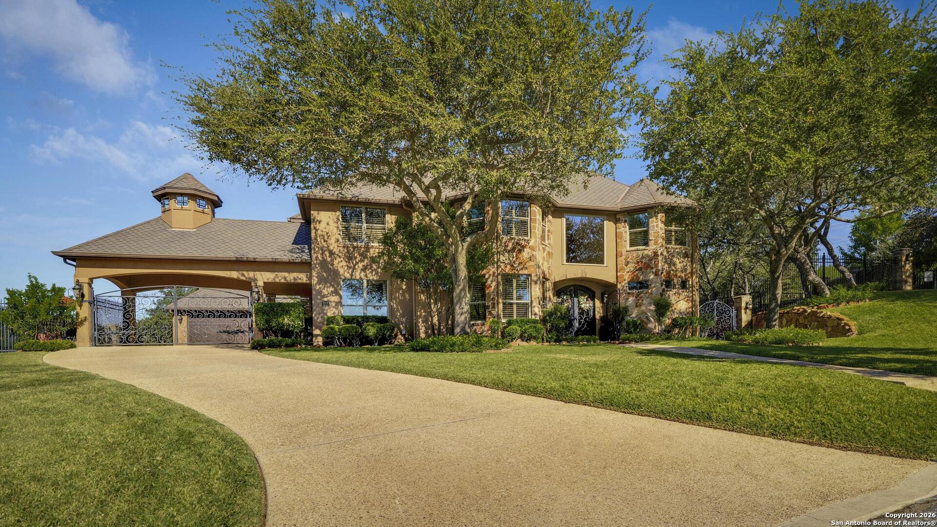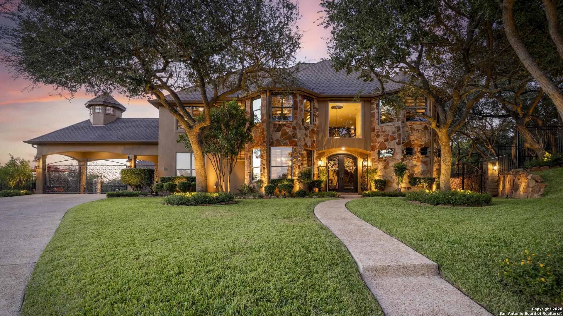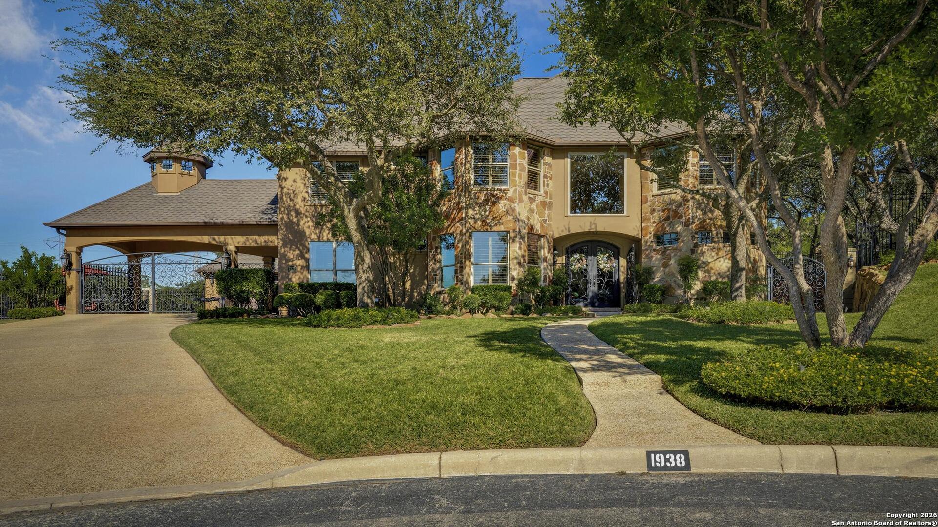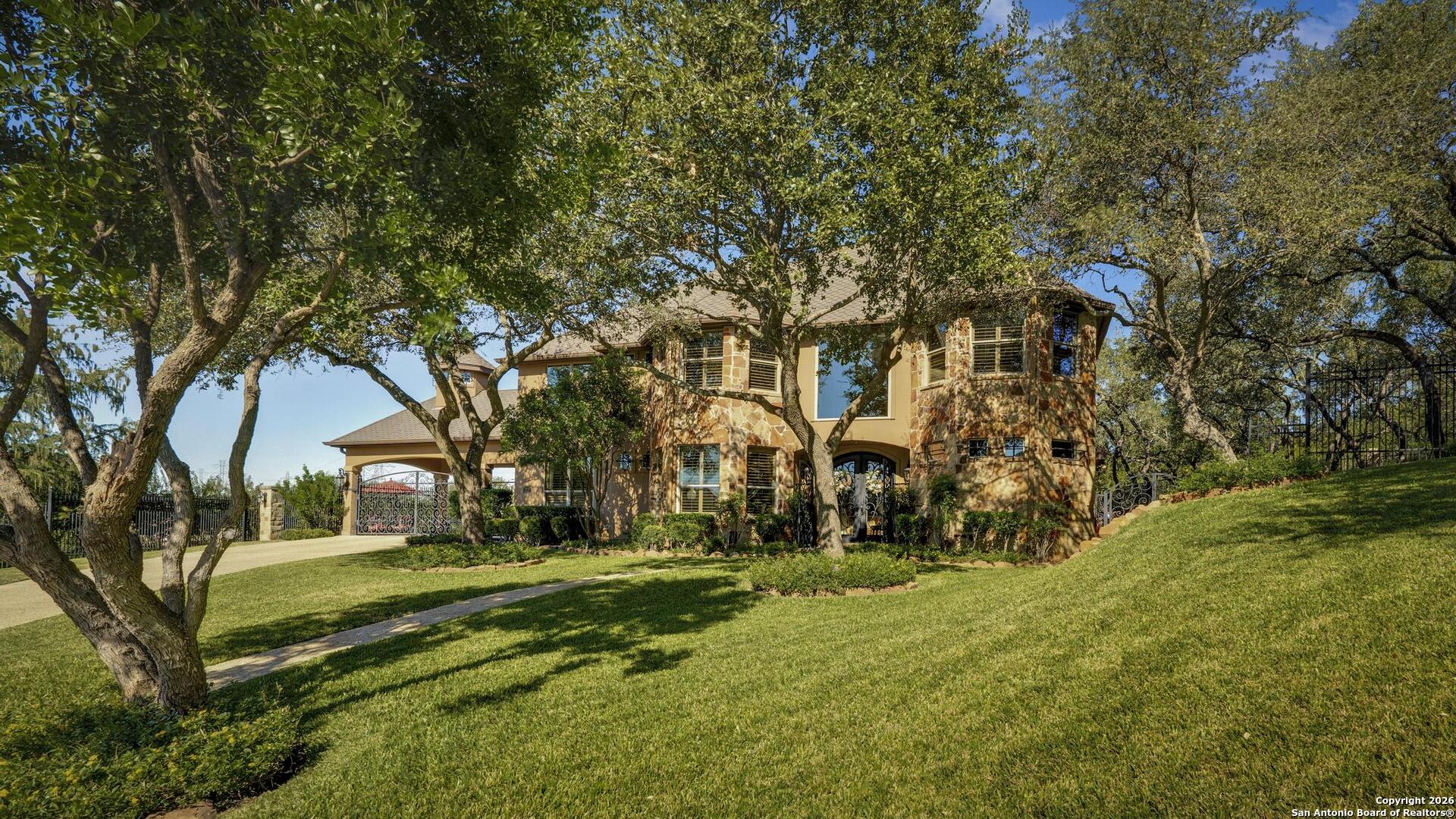 Grand and Custom Tuscan Home, located at the end of a cul-de-sac, at the top of a hill, in the gated and upscale neighborhood; The Province of Vineyard. Stone and stucco constructed 5 bed 4.5 bath, architecturally designed floorplan with custom built grand staircase, Rotunda entry, and high ceilings throughout. Primary and 2nd bed/study with full bath located down, 3 generous sized bedrooms and game room up, with 2.5 baths. Gourmet kitchen with custom cabinets and lighting, granite counters, luxury stainless appliances to include a 6-burner gas cooktop with pot filler and built in Kitchen Aid fridge; with full size wet bar in the center of the home for entertaining. Alderwood plantation shutters throughout! Oversized primary bedroom, with your own Roman luxury bath. Warm and inviting fixtures and paint, with rich wood floors and travertine tile. Outdoors you will find multiple living spaces, separate fenced back yard areas, a huge covered patio to enjoy those relaxing afternoons, and backs to a large green space. Lot size is huge, with over 1/2 acre of beautiful landscaped grounds, and a ultra luxurious outdoor lighting system, that will compete with the most detailed and experienced home owner. Enter through the private electric gate, and park under the oversized Porte Cochere, or pull through to the garage space. This home has been meticulously gone through, from top to bottom, and exquisitely maintained at the highest level. This is the one-of-a-kind property; you would dream to find!