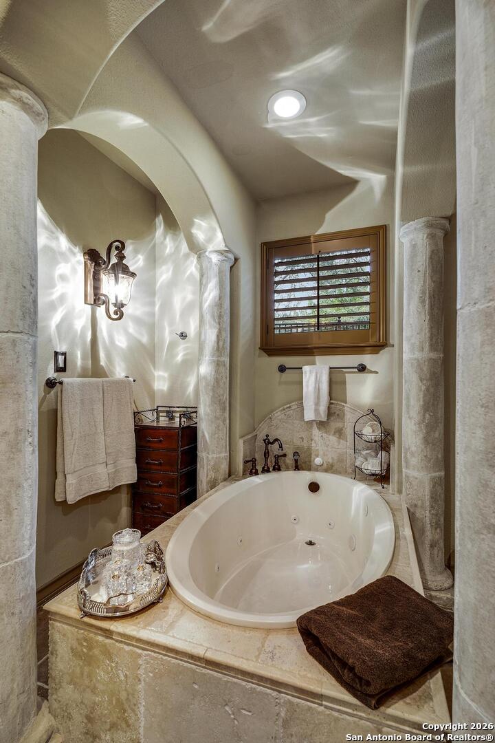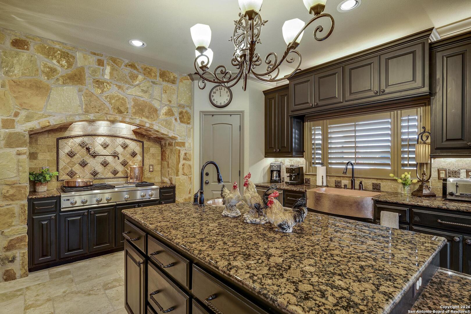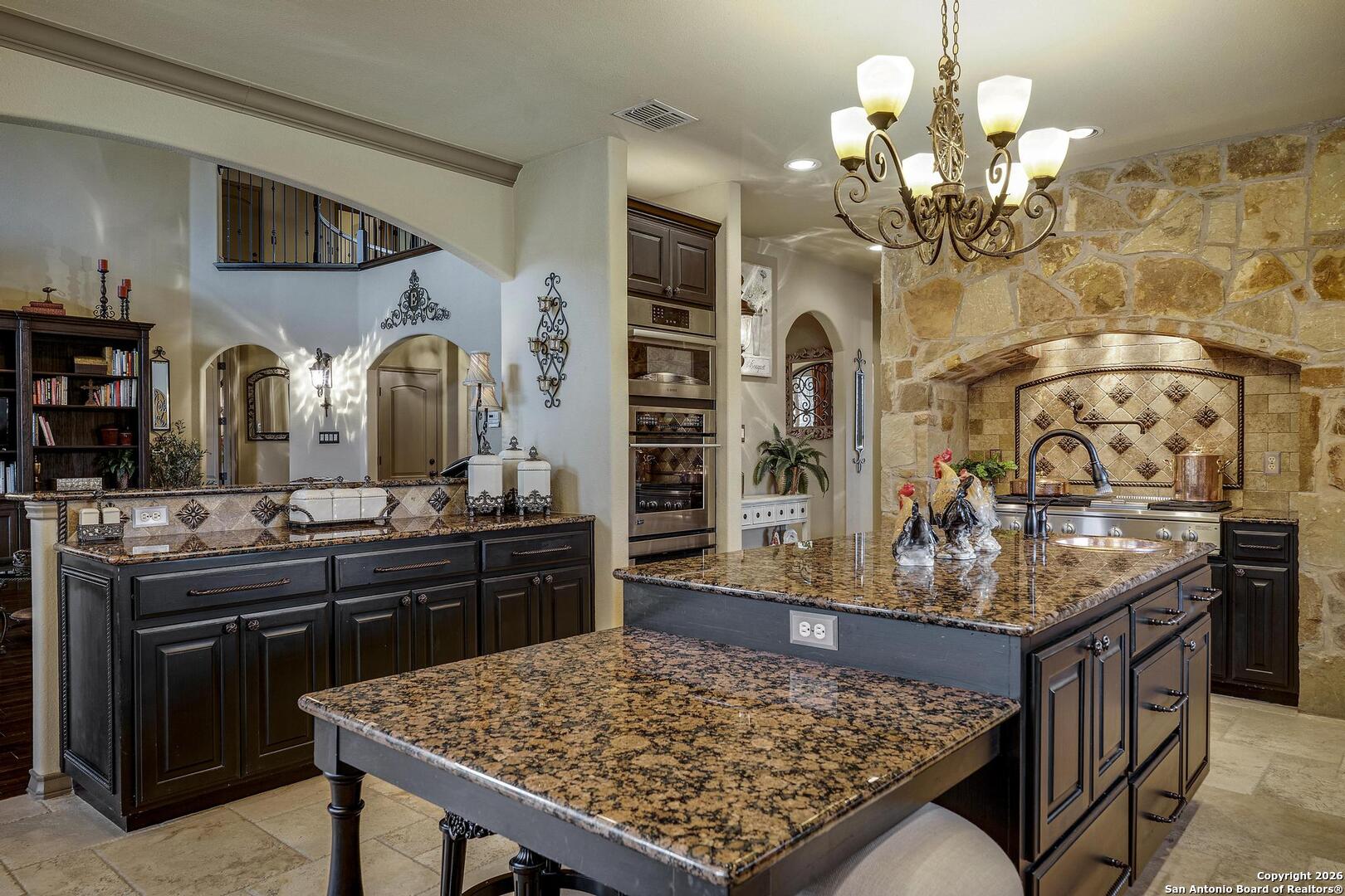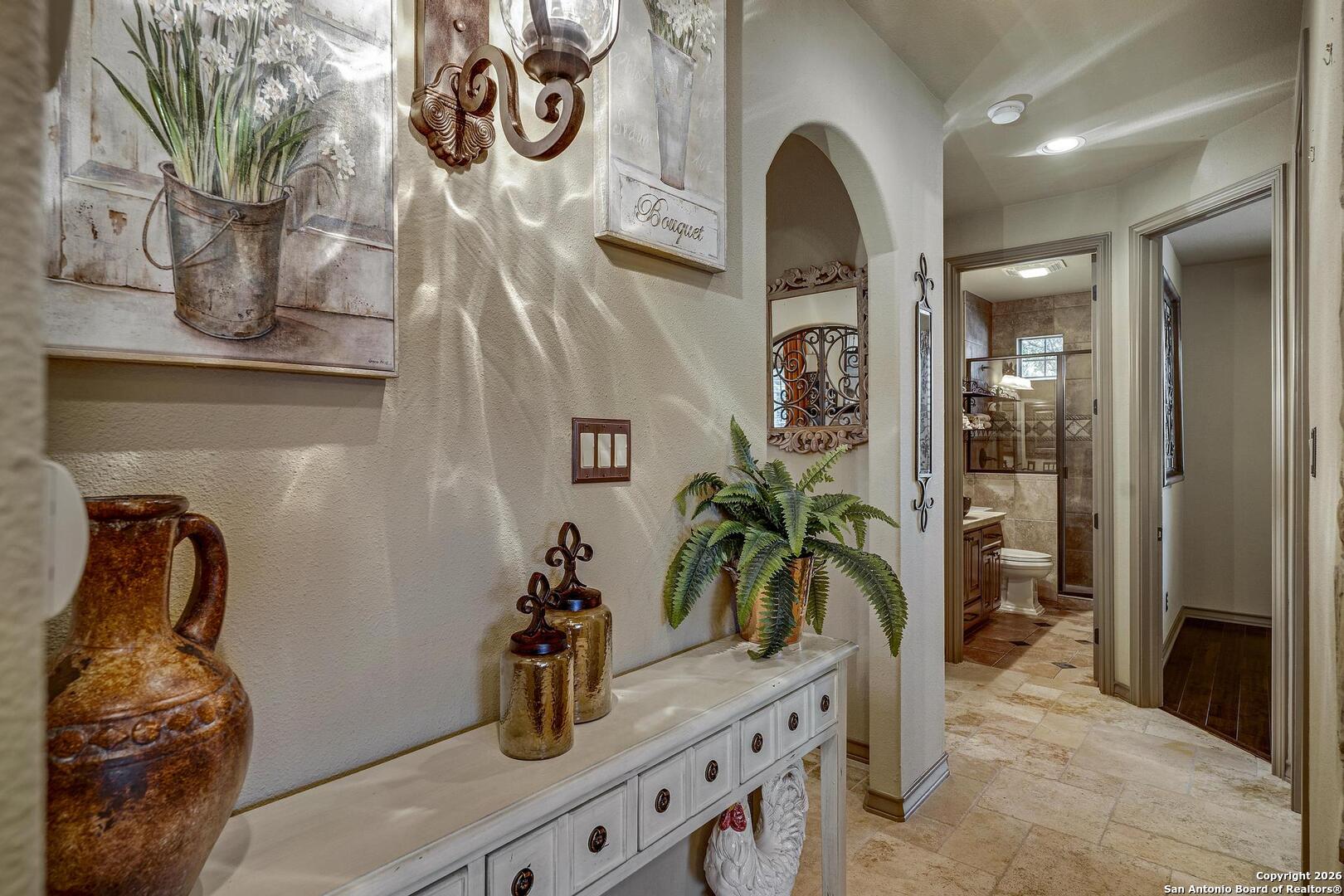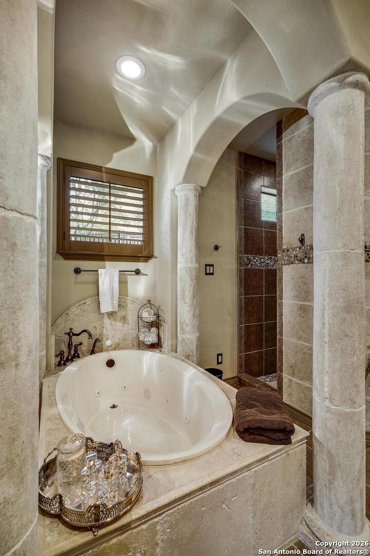 Grand and Custom Tuscan Home, located at the end of a cul-de-sac, at the top of a hill, in the gated and upscale neighborhood; The Province of Vineyard. Stone and stucco constructed 5 bed 4.5 bath, architecturally designed floorplan with custom built grand staircase, Rotunda entry, and high ceilings throughout. Primary and 2nd bed/study with full bath located down, 3 generous sized bedrooms and game room up, with 2.5 baths. Gourmet kitchen with custom cabinets and lighting, granite counters, luxury stainless appliances to include a 6-burner gas cooktop with pot filler and built in Kitchen Aid fridge; with full size wet bar in the center of the home for entertaining. Alderwood plantation shutters throughout! Oversized primary bedroom, with your own Roman luxury bath. Warm and inviting fixtures and paint, with rich wood floors and travertine tile. Outdoors you will find multiple living spaces, separate fenced back yard areas, a huge covered patio to enjoy those relaxing afternoons, and backs to a large green space. Lot size is huge, with over 1/2 acre of beautiful landscaped grounds, and a ultra luxurious outdoor lighting system, that will compete with the most detailed and experienced home owner. Enter through the private electric gate, and park under the oversized Porte Cochere, or pull through to the garage space. This home has been meticulously gone through, from top to bottom, and exquisitely maintained at the highest level. This is the one-of-a-kind property; you would dream to find!