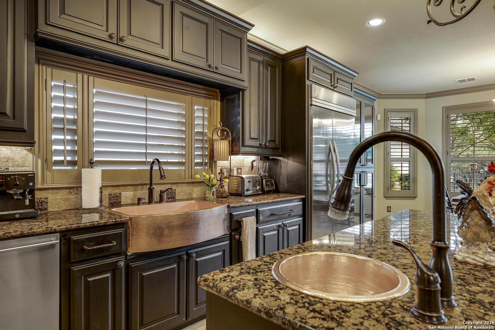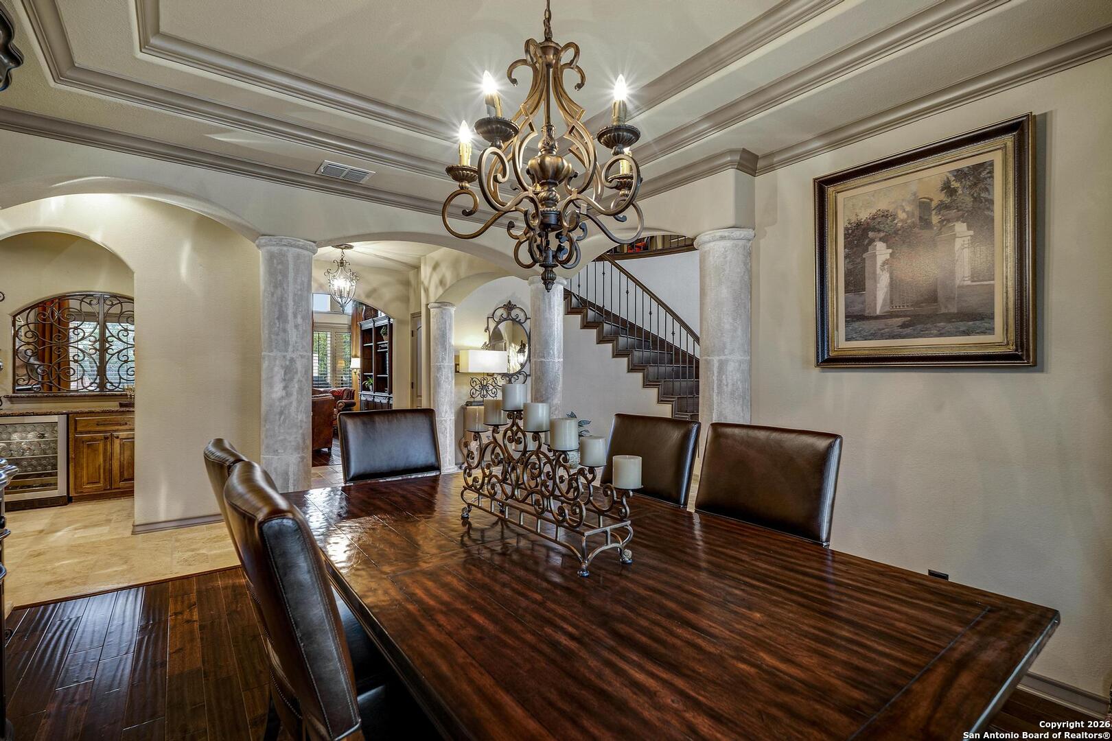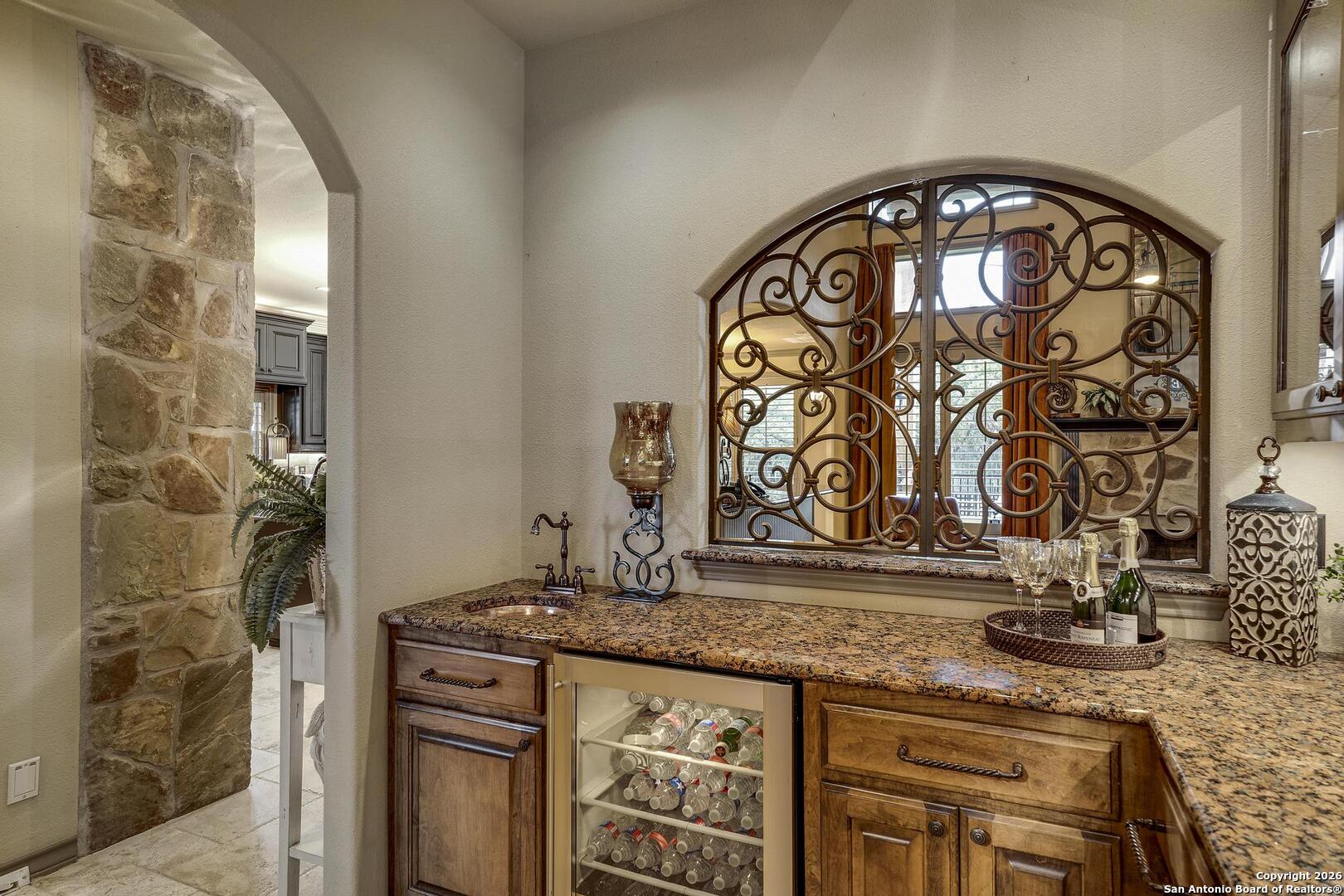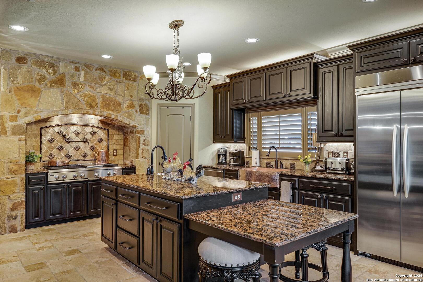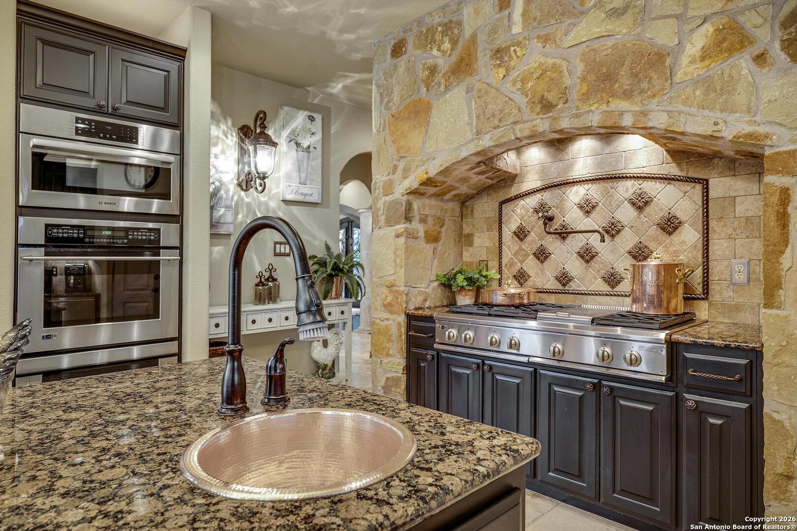 Grand and Custom Tuscan Home, located at the end of a cul-de-sac, at the top of a hill, in the gated and upscale neighborhood; The Province of Vineyard. Stone and stucco constructed 5 bed 4.5 bath, architecturally designed floorplan with custom built grand staircase, Rotunda entry, and high ceilings throughout. Primary and 2nd bed/study with full bath located down, 3 generous sized bedrooms and game room up, with 2.5 baths. Gourmet kitchen with custom cabinets and lighting, granite counters, luxury stainless appliances to include a 6-burner gas cooktop with pot filler and built in Kitchen Aid fridge; with full size wet bar in the center of the home for entertaining. Alderwood plantation shutters throughout! Oversized primary bedroom, with your own Roman luxury bath. Warm and inviting fixtures and paint, with rich wood floors and travertine tile. Outdoors you will find multiple living spaces, separate fenced back yard areas, a huge covered patio to enjoy those relaxing afternoons, and backs to a large green space. Lot size is huge, with over 1/2 acre of beautiful landscaped grounds, and a ultra luxurious outdoor lighting system, that will compete with the most detailed and experienced home owner. Enter through the private electric gate, and park under the oversized Porte Cochere, or pull through to the garage space. This home has been meticulously gone through, from top to bottom, and exquisitely maintained at the highest level. This is the one-of-a-kind property; you would dream to find!