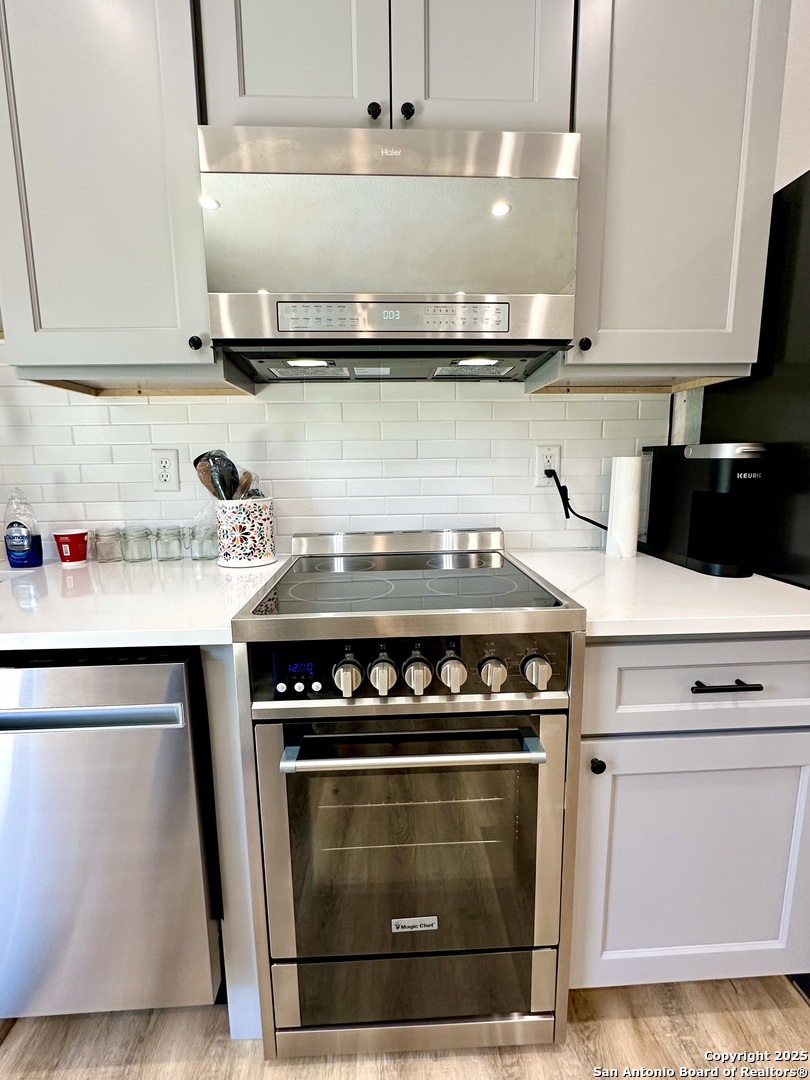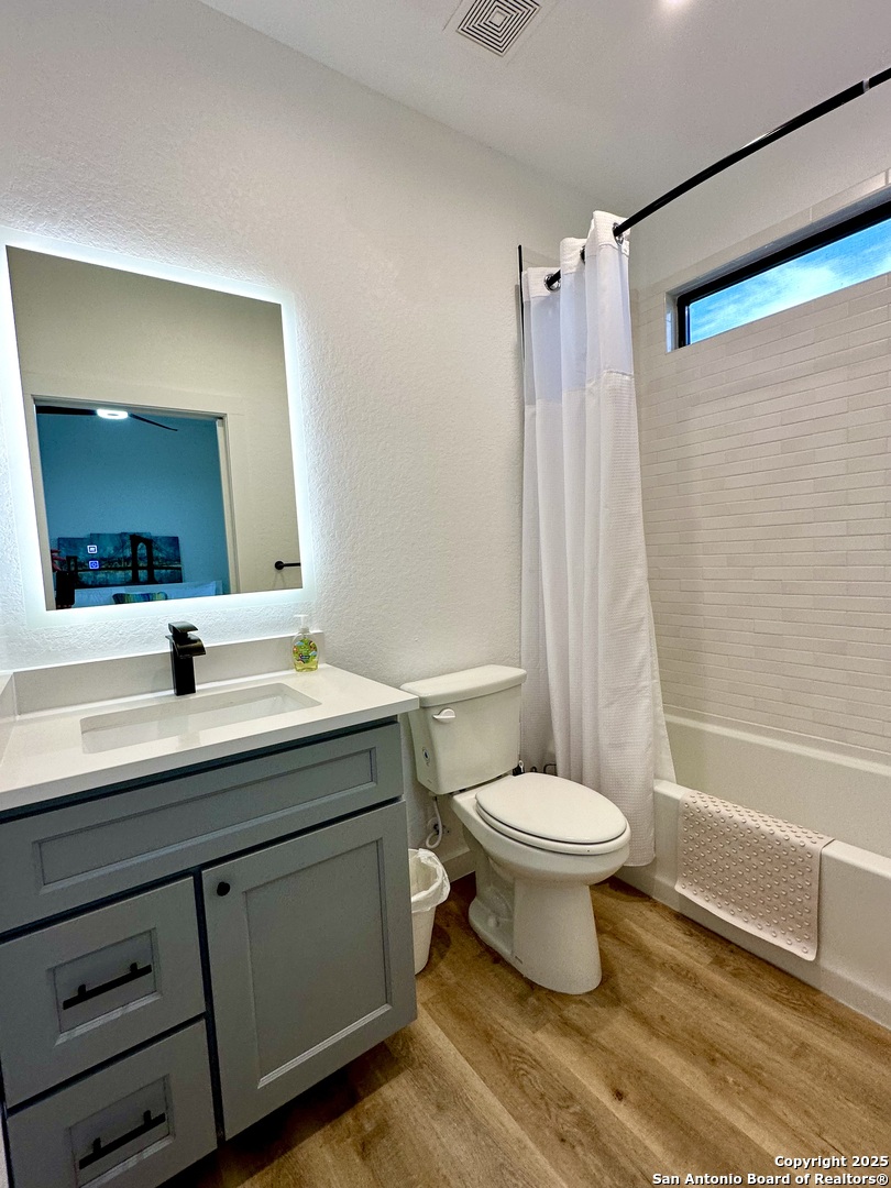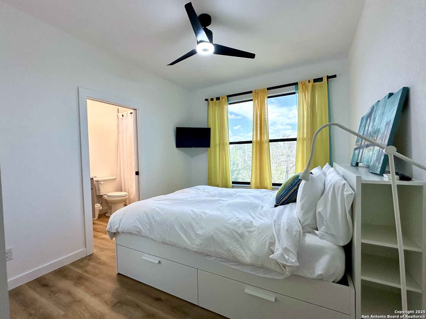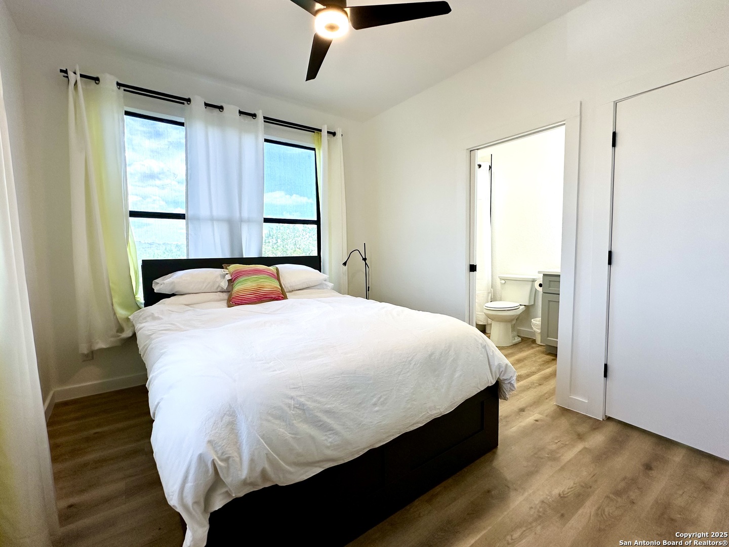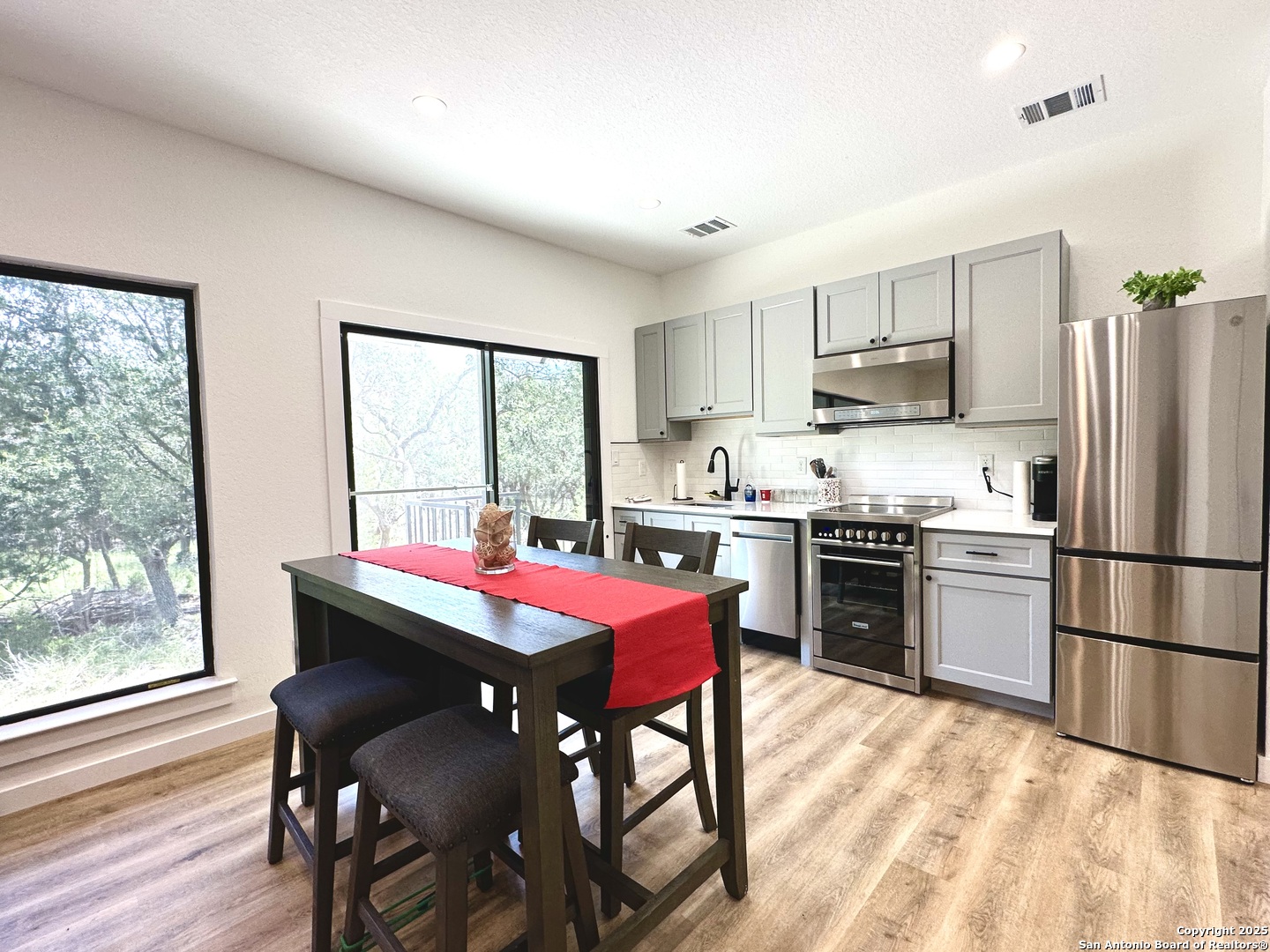 Stylish Canyon Lake mid-century modern home* Dual Master Bedrooms(2) both with In-suite Full Bath(2)* Beautiful view/Big Bay Windows to Greenbelt* Upscale finish out includes: white Maple Shaker cabinets, Quartz countertops, Stainless steel appliances, Chic Magic Chef cooking range, LVP flooring, backlit LED Mirrors, Recessed Lighting, Matte black Hardware & Moen plumbing fixtures* Popular Half bath downstairs* Home has an open floor plan with majestic 9ft ceilings and tons of light. Priva