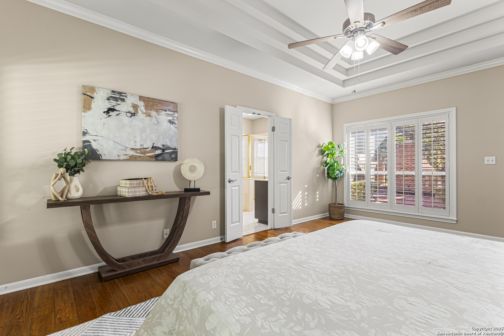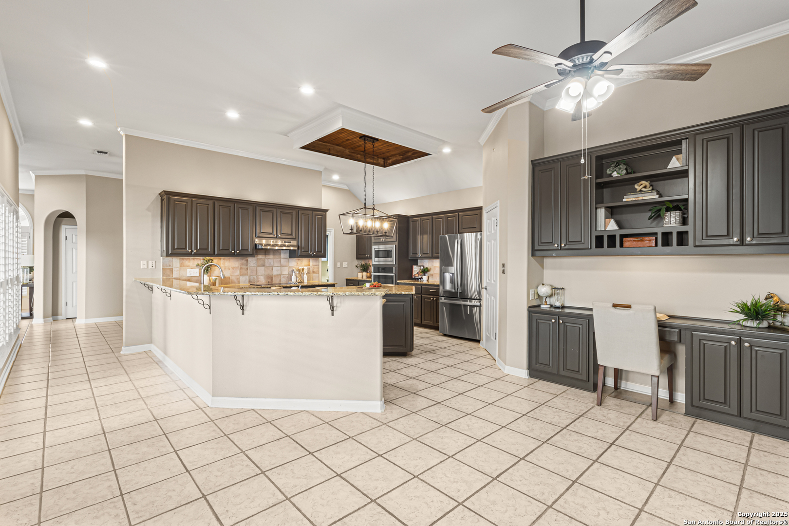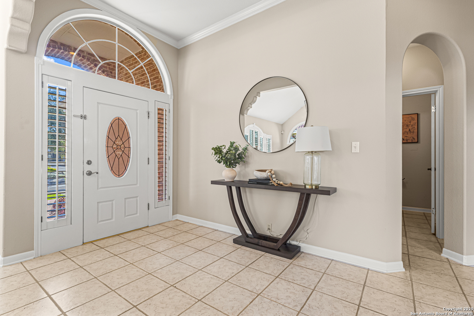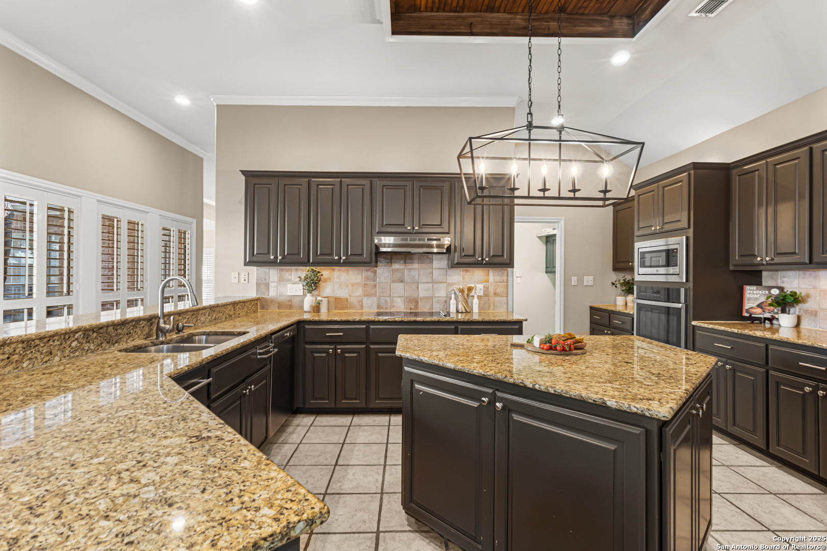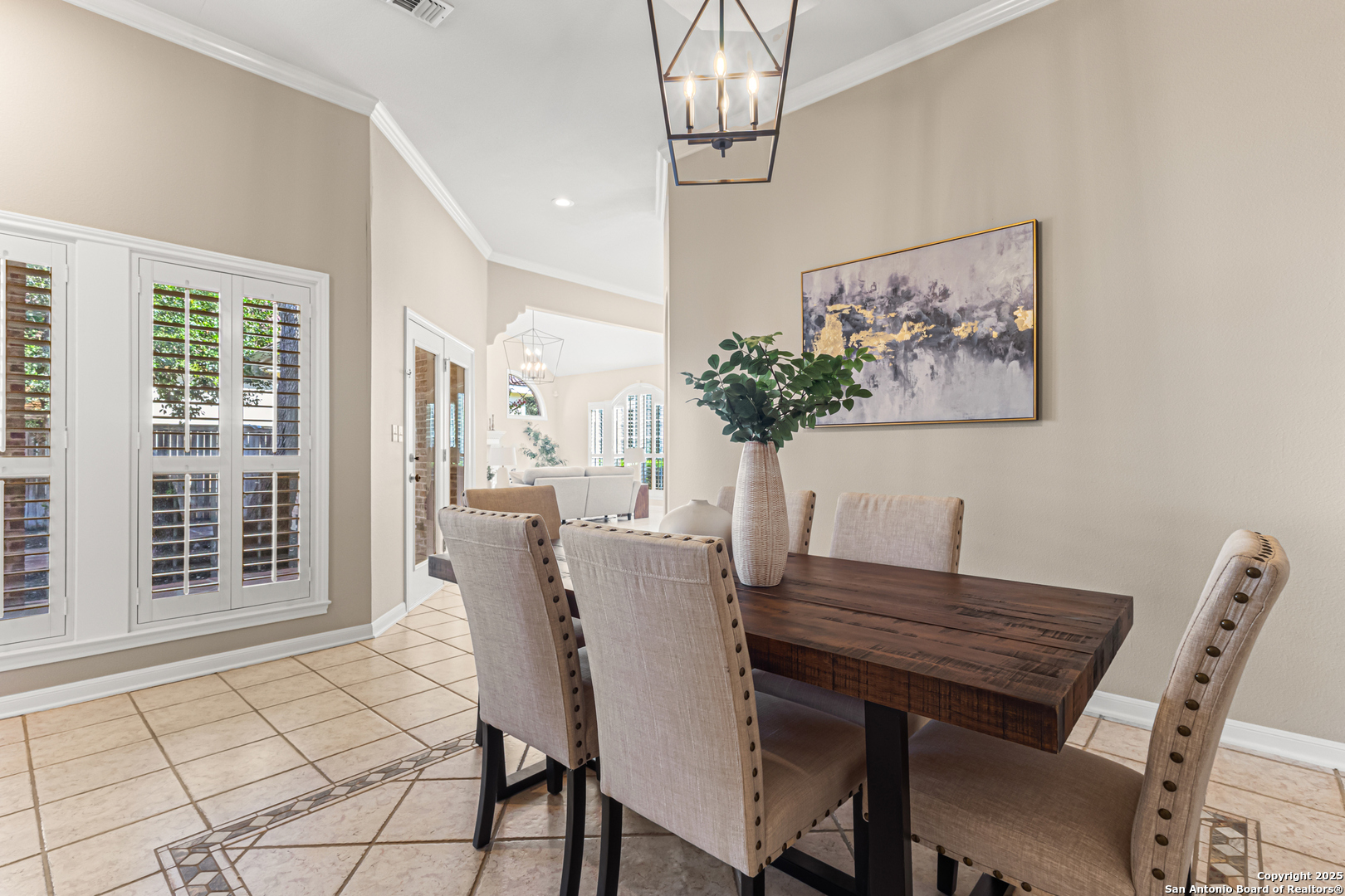 Welcome Home to Sonterra! This meticulously maintained one-story home sits on a quiet street in the prestigious Sonterra community. An open floor plan and soaring ceilings create a light, airy, and modern feel throughout. The island kitchen is a chef's delight, featuring custom cabinetry, granite countertops, stainless steel appliances, and a breakfast bar. The living, dining, and kitchen areas all overlook the covered patio and beautifully landscaped backyard with flagstone - the perfect setting for entertaining or relaxing evenings. The private primary suite offers a cozy sitting area with direct patio access, and a spa-like bath designed for comfort. Enjoy the Sonterra lifestyle with golf course (golf cart) and club access from the neighborhood all while being minutes from top-rated hospitals, shopping, dining, and major highways (1604 & 281). With five golf courses nearby, this home is a golfer's or downsizing dream!