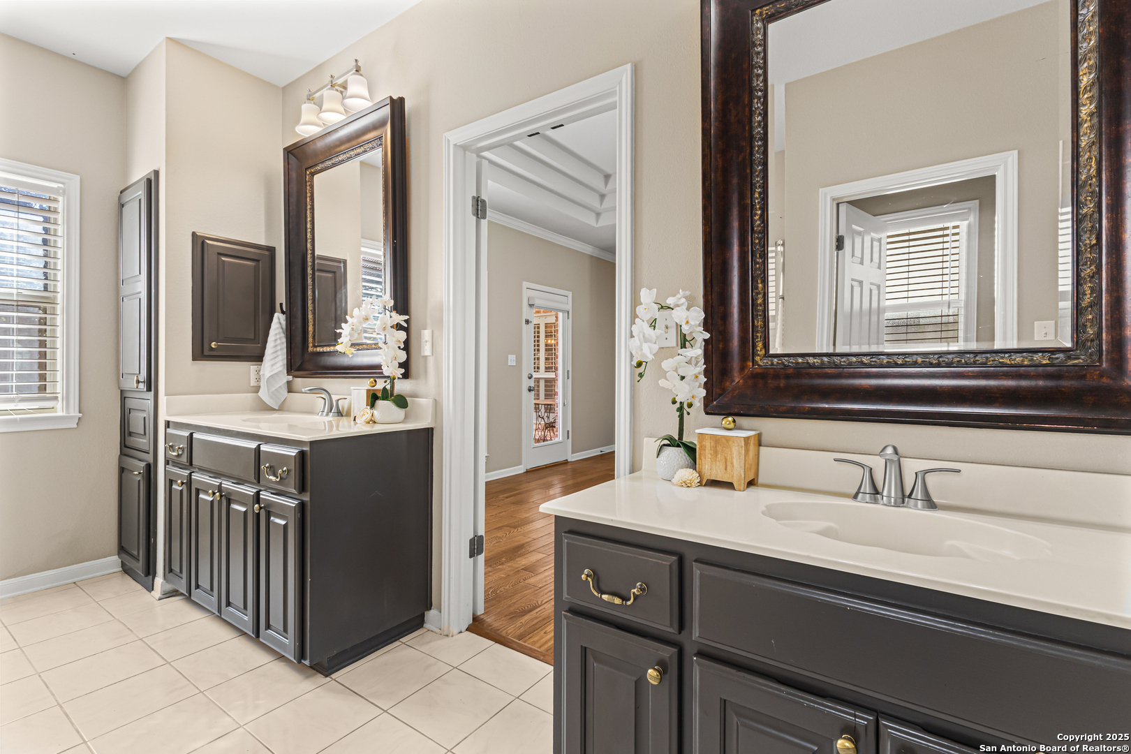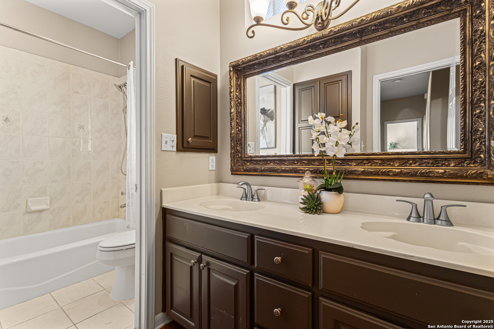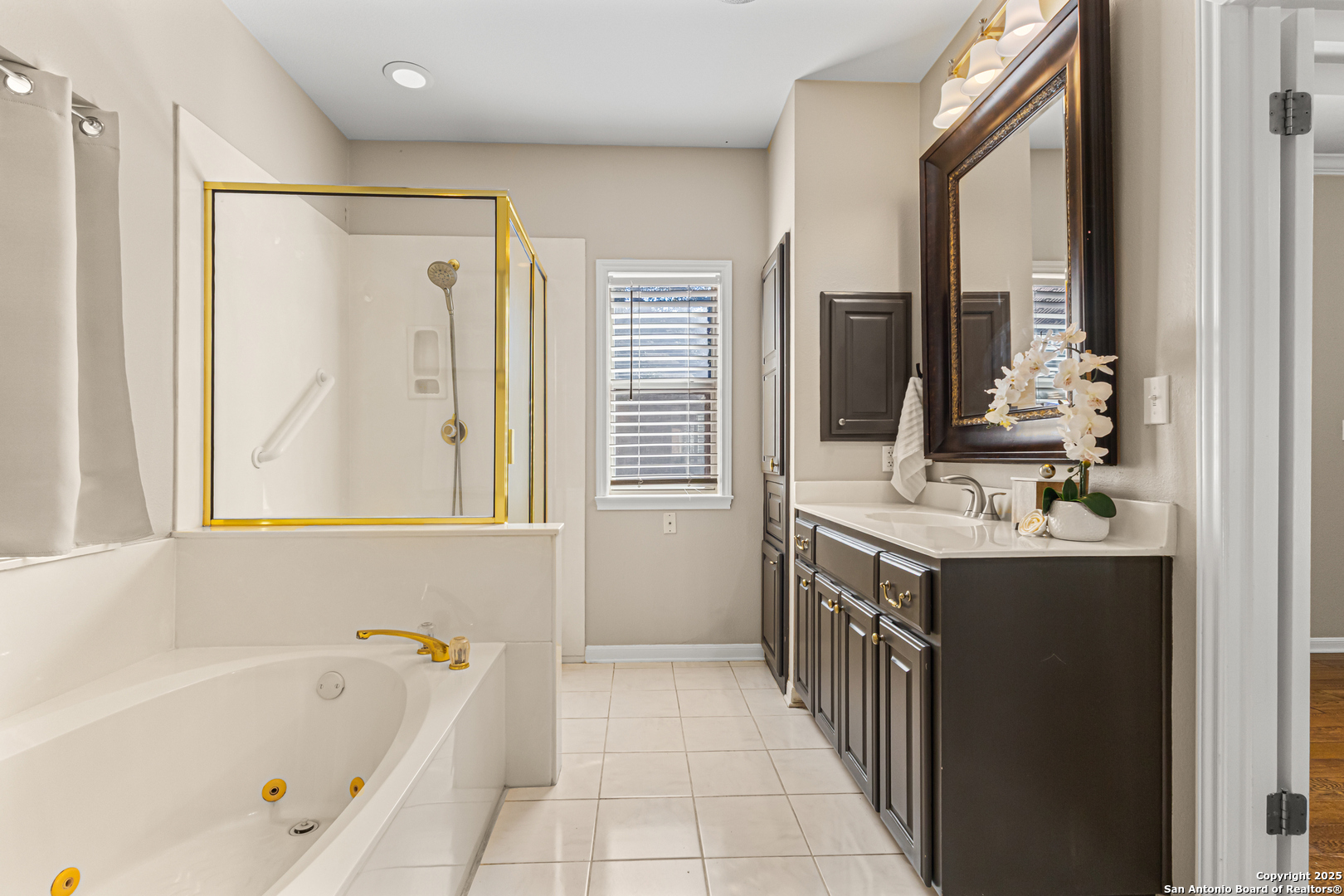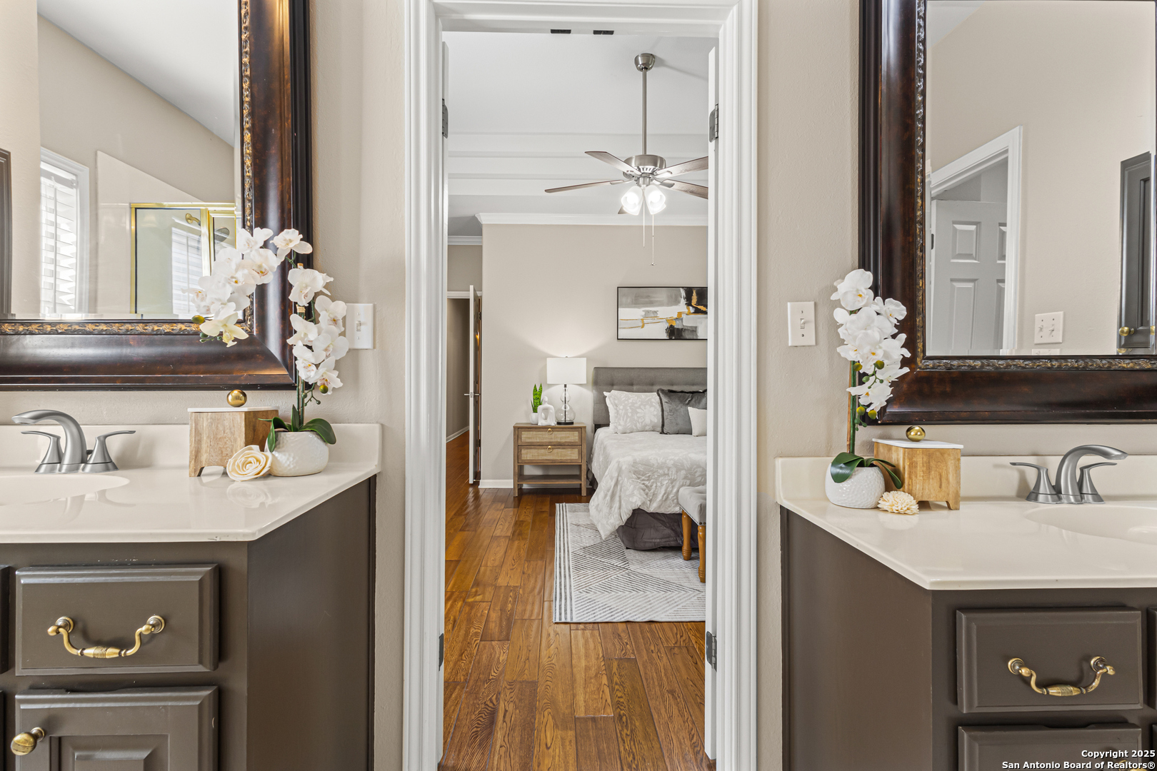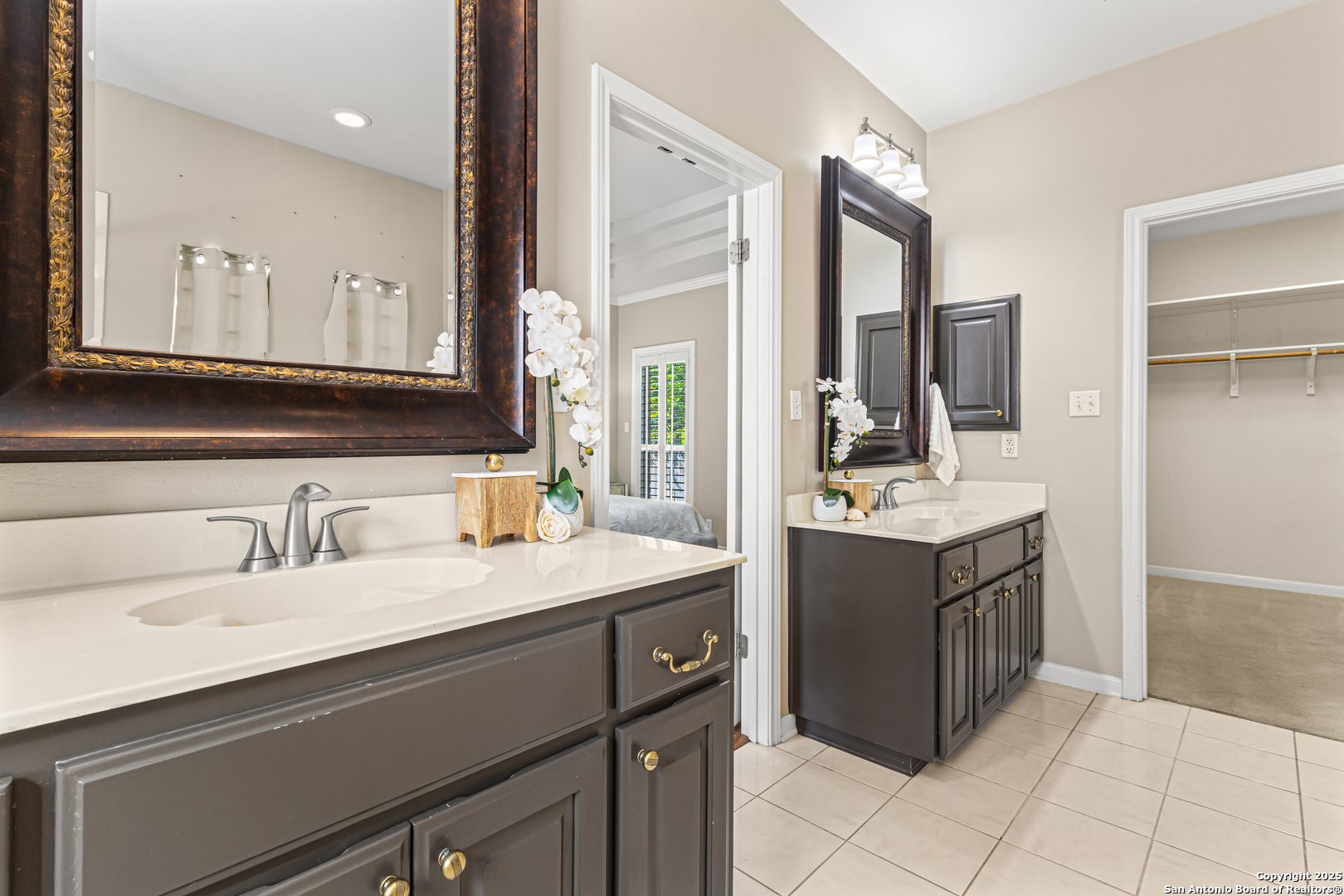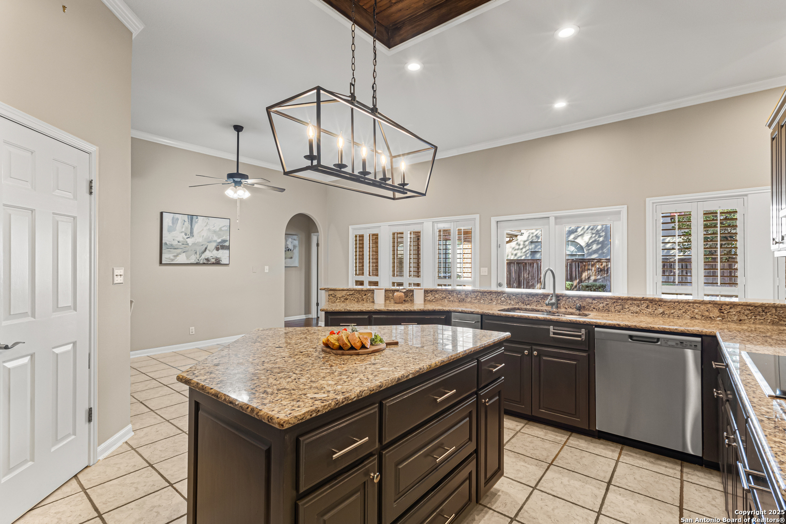 Welcome Home to Sonterra! This meticulously maintained one-story home sits on a quiet street in the prestigious Sonterra community. An open floor plan and soaring ceilings create a light, airy, and modern feel throughout. The island kitchen is a chef's delight, featuring custom cabinetry, granite countertops, stainless steel appliances, and a breakfast bar. The living, dining, and kitchen areas all overlook the covered patio and beautifully landscaped backyard with flagstone - the perfect setting for entertaining or relaxing evenings. The private primary suite offers a cozy sitting area with direct patio access, and a spa-like bath designed for comfort. Enjoy the Sonterra lifestyle with golf course (golf cart) and club access from the neighborhood all while being minutes from top-rated hospitals, shopping, dining, and major highways (1604 & 281). With five golf courses nearby, this home is a golfer's or downsizing dream!