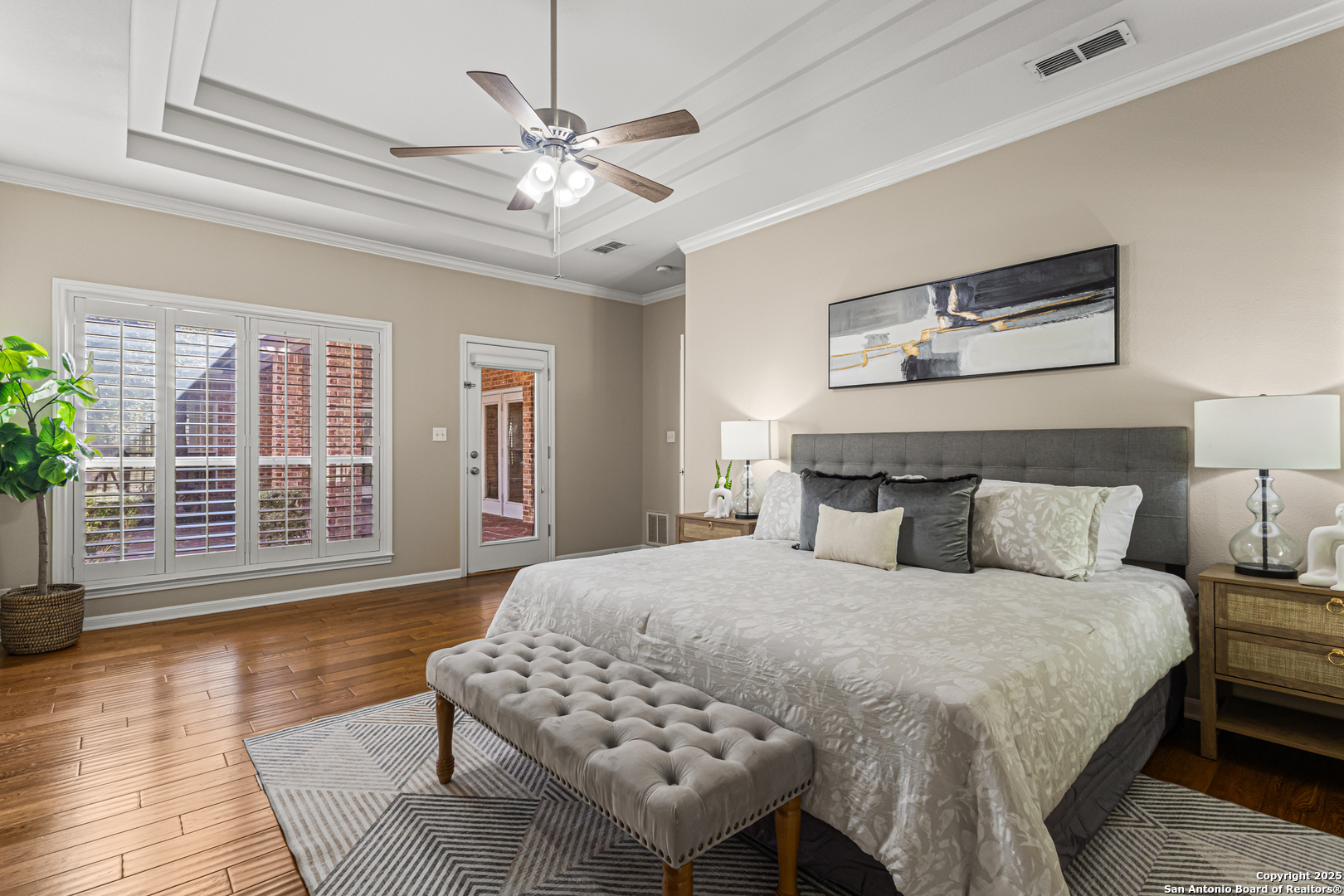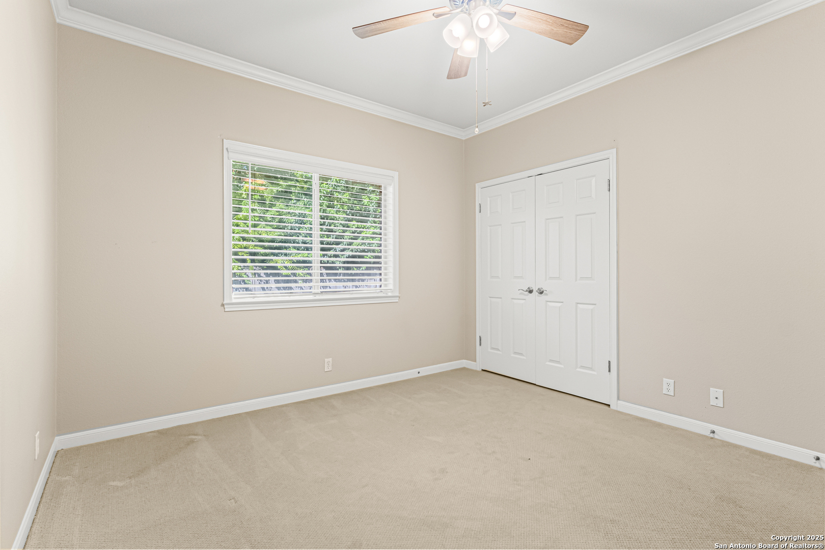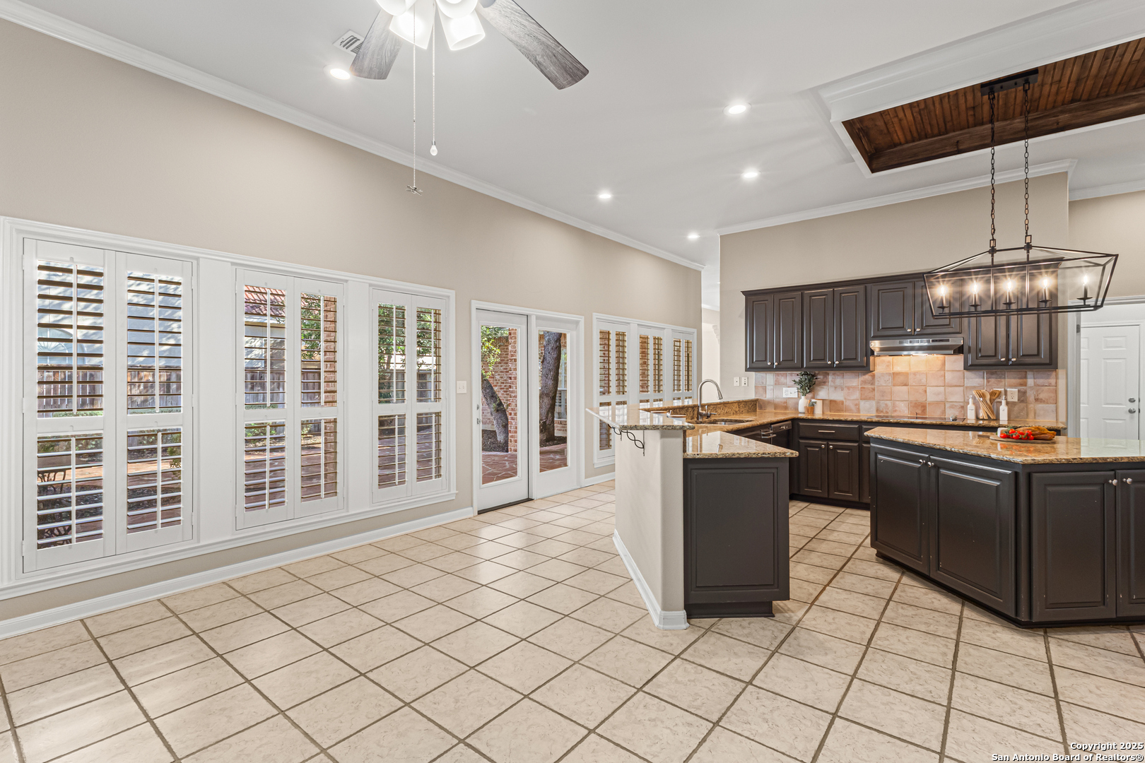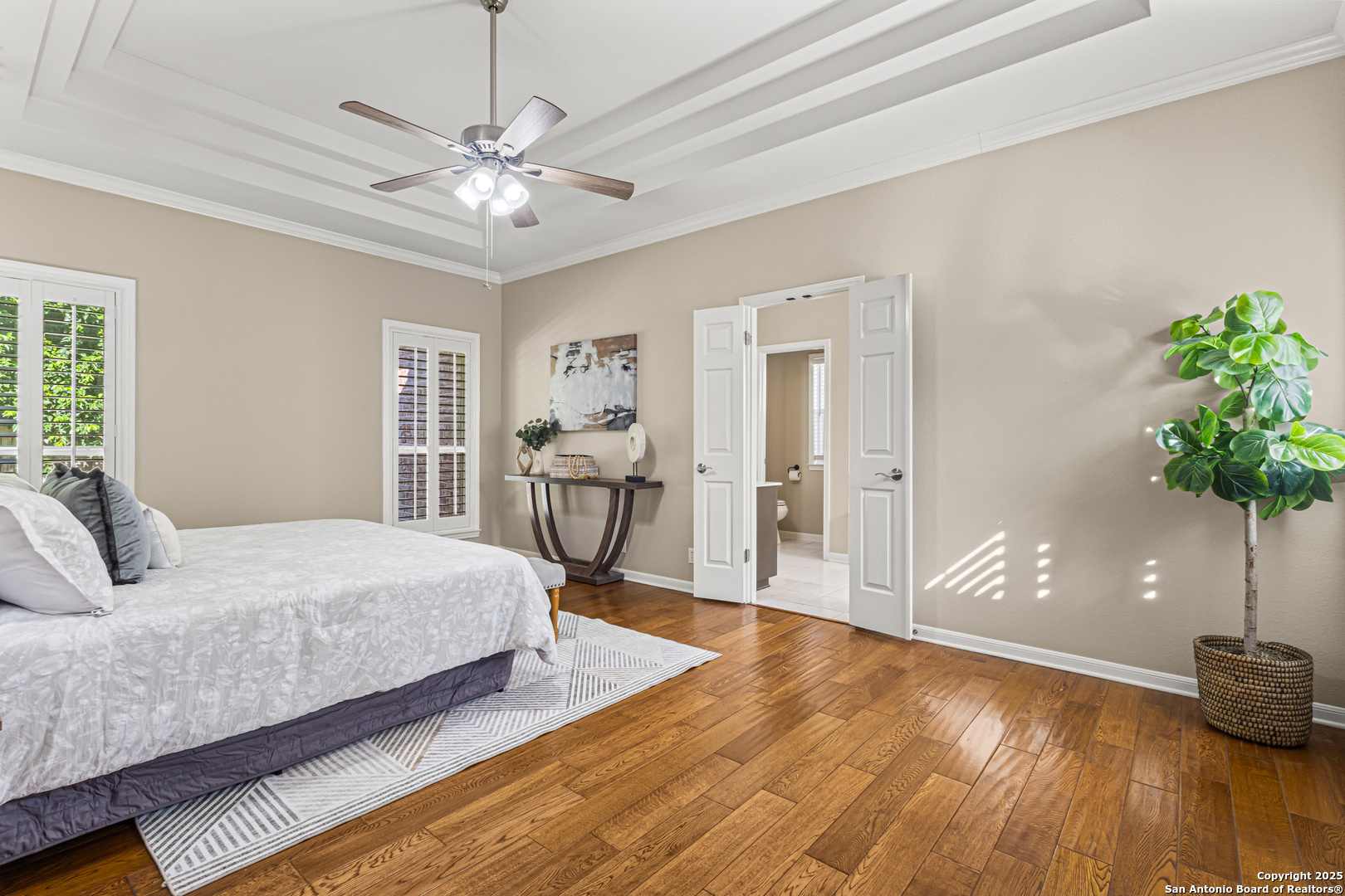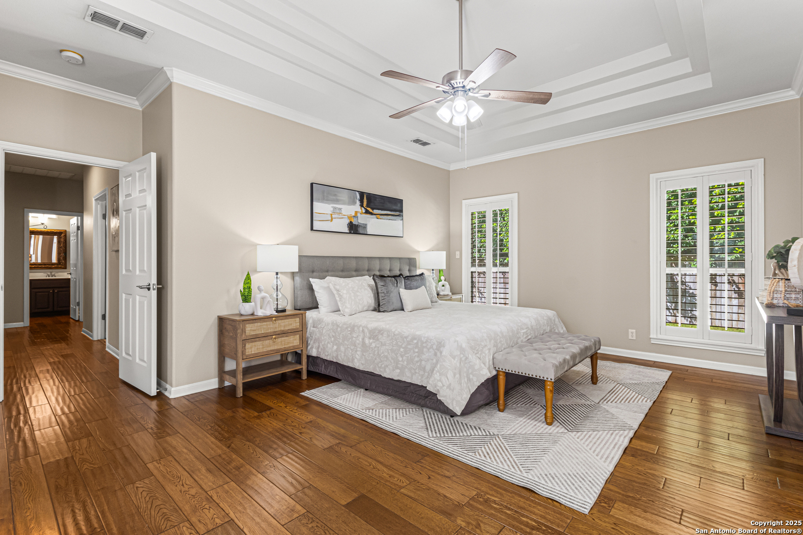 Welcome Home to Sonterra! This meticulously maintained one-story home sits on a quiet street in the prestigious Sonterra community. An open floor plan and soaring ceilings create a light, airy, and modern feel throughout. The island kitchen is a chef's delight, featuring custom cabinetry, granite countertops, stainless steel appliances, and a breakfast bar. The living, dining, and kitchen areas all overlook the covered patio and beautifully landscaped backyard with flagstone - the perfect setting for entertaining or relaxing evenings. The private primary suite offers a cozy sitting area with direct patio access, and a spa-like bath designed for comfort. Enjoy the Sonterra lifestyle with golf course (golf cart) and club access from the neighborhood all while being minutes from top-rated hospitals, shopping, dining, and major highways (1604 & 281). With five golf courses nearby, this home is a golfer's or downsizing dream!
