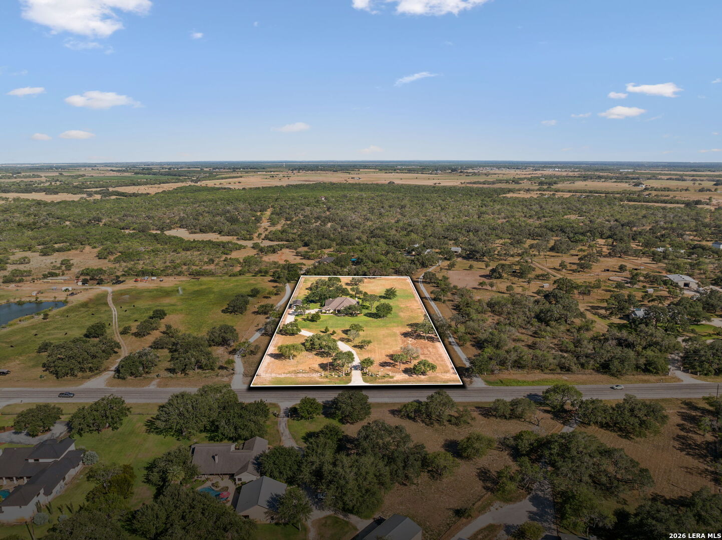 Luxury properties like this one don't become available very often, especially less than half an hour from downtown San Antonio. Welcome to your dream home nestled on 5 acres! This meticulously maintained paradise offers a single-story transitional custom home and a custom built workshop. The home features 3 bedrooms, 2 full bathrooms and 1 half bath, which has outdoor access to the sparkling pool and patio. Upon entry, you are greeted by a bright and open design with views of the pool through the seamless wall of windows. To the right is the home office/flex space with glass & wood French doors and views of the lushly landscaped front yard. As you enter into the living room, you are greeted with a wall of televisions for the ultimate entertainment experience, including surround sound speakers that extend to the primary bedroom and bath as well as the front and back patios: all controlled from the designated media closet. The fabulous open floorplan is perfect for entertaining family and friends. The gourmet island kitchen is a chef's dream, complete with state-of-the-art JennAir appliances: 6 burner gas cook top, under counter microwave drawer, plus double wall ovens, dishwasher, and refrigerator in the open concept butler's kitchen and a walk-in pantry. The breakfast area offers plenty of space for casual dining or adding a more formal touch with the coffee/wine bar and mini wine refrigerator. The peaceful primary suite enjoys outside access to the patio and pool and features a stunning bath with his and her walk-in closets, dual vanities, oversized walk-in shower that includes a rain shower system with body jets, walk-in linen closet, and custom drawers with leather granite counters (this space is plumbed for a garden tub). The separate guest wing offers two additional bedrooms and a magnificent bathroom with oversized dual vanity space. The laundry room has a farm sink, separate utility closet and plenty of space for an additional refrigerator. The garage entry space welcomes you with a catch-all custom cabinetry, wall of hooks and a bench. The residence also features a generous oversized two-car garage with separate bays and additional storage space. The custom workshop is approximately 1,200 square feet, fully insulated and plumbed for bathroom, with single car garage door, attached carport: can equip two cars, RV, boat, or lawn equipment. The resort-style backyard is a serene oasis complete with gorgeous pool (built in late 2023), wood burning fireplace, and outdoor kitchen: Bull gas grill, sink and mini refrigerator. It's perfect for hosting and enjoying the evenings under the big Texas starlit sky. The property is professionally landscaped, including a sprinkler system that extends approximately 1 1/2 acres and drip irrigation for all the flower beds, filled with a variety of oak trees and highlighted by professional lighting. The property has its own water well, in addition to access to the co-op water supply system. It is secured by an automatic custom iron gate, surrounded by five-row barbwire fencing and overlayed with ranch fencing. With the convenience of being just a few minutes from both IH-37 and US Hwy 281 and less than 30 minutes to downtown San Antonio, this is your opportunity to make this exceptional property your home!