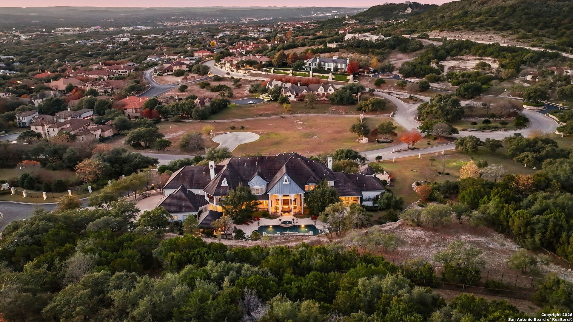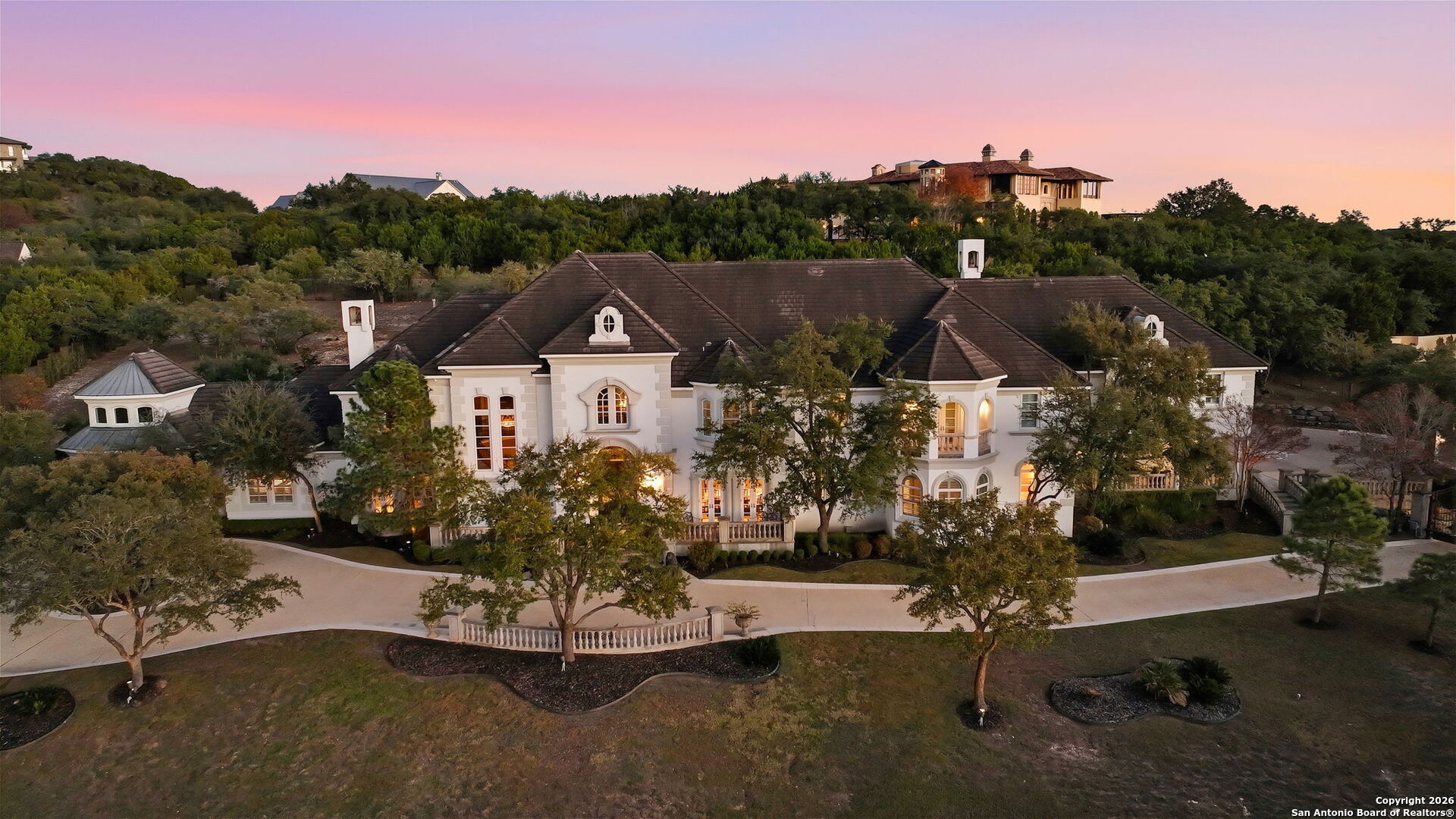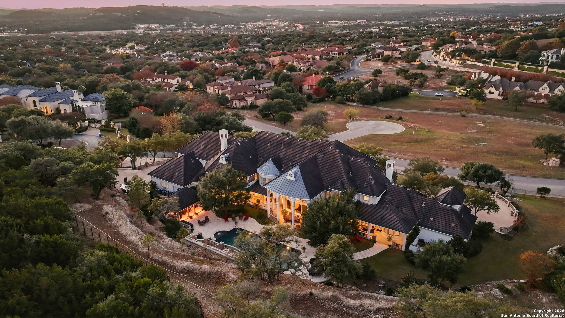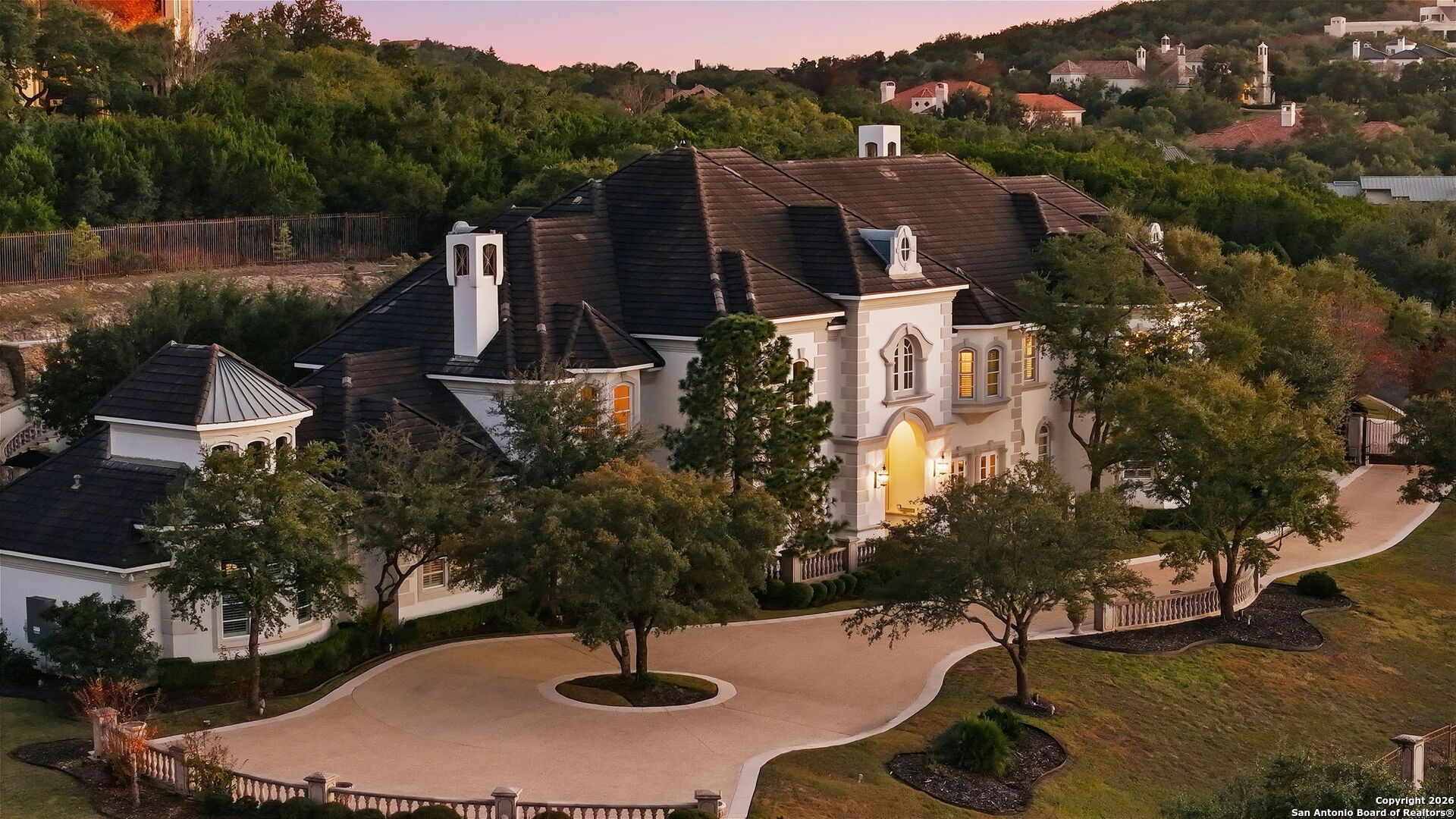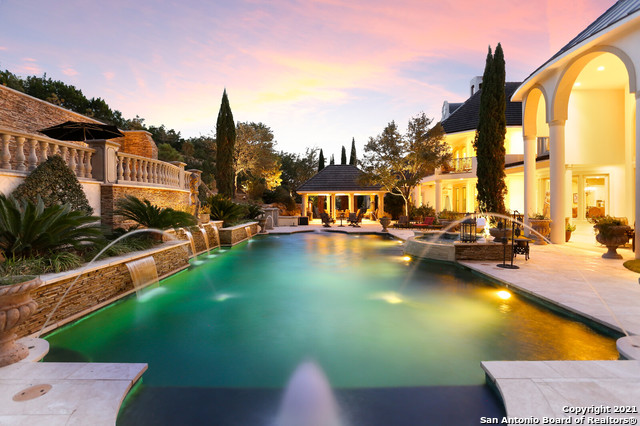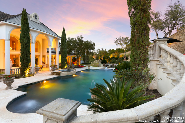 Perched gracefully atop a hill, this enchanting estate welcomes the most discerning buyer to experience timeless elegance and effortless luxury. A true French classic, 2 Admirals Way is a masterpiece of refined architecture and thoughtful design. Beyond the intricate wrought-iron gates, you're greeted by a sense of serenity and privacy, where lush, manicured grounds gently guide you home. Inside, soaring ceilings and expansive windows flood the residence with natural light, creating a seamless connection between the indoors and the breathtaking surroundings. Grand living spaces frame stunning views of the Hollywood-style pool, spa, and gazebo-perfectly designed for both intimate gatherings and unforgettable celebrations, blending indoor comfort with resort-style outdoor living. The Owner's retreat is a sanctuary unto itself, offering a lavish bath, private exercise room, and an elegant study or library-ideal for work, relaxation, or quiet reflection. Impeccably maintained, this seven-bedroom, eight-bath estate is perfectly suited for hosting family and friends and for memorable staycations. Located within The Crescent at The Dominion, one of San Antonio's most prestigious guarded and gated communities, this exceptional home offers a lifestyle defined by privacy, prestige, and grace. A MUST SEE!!