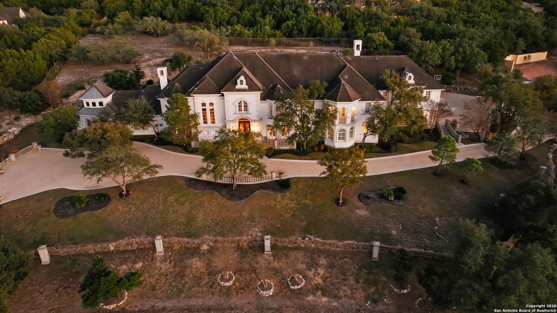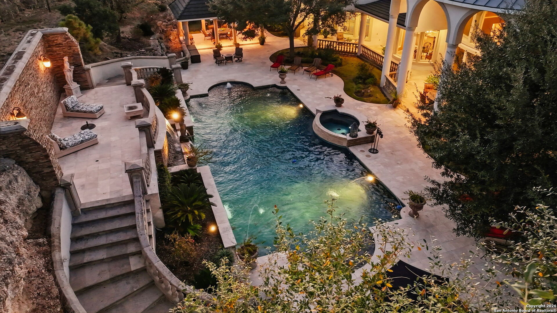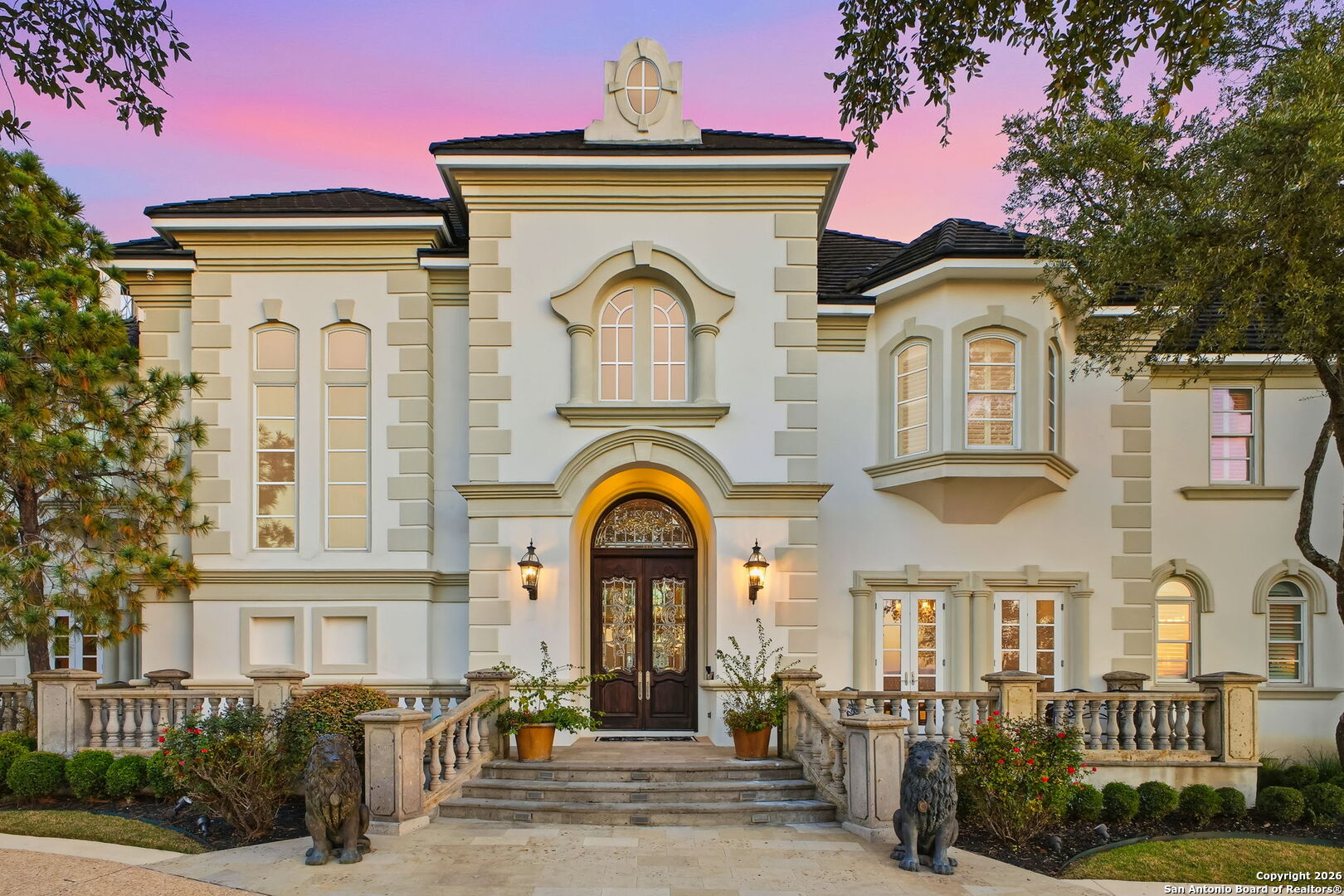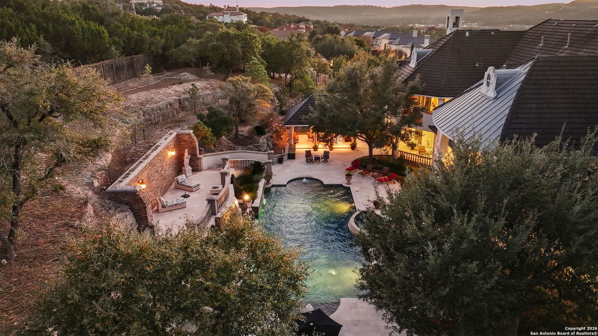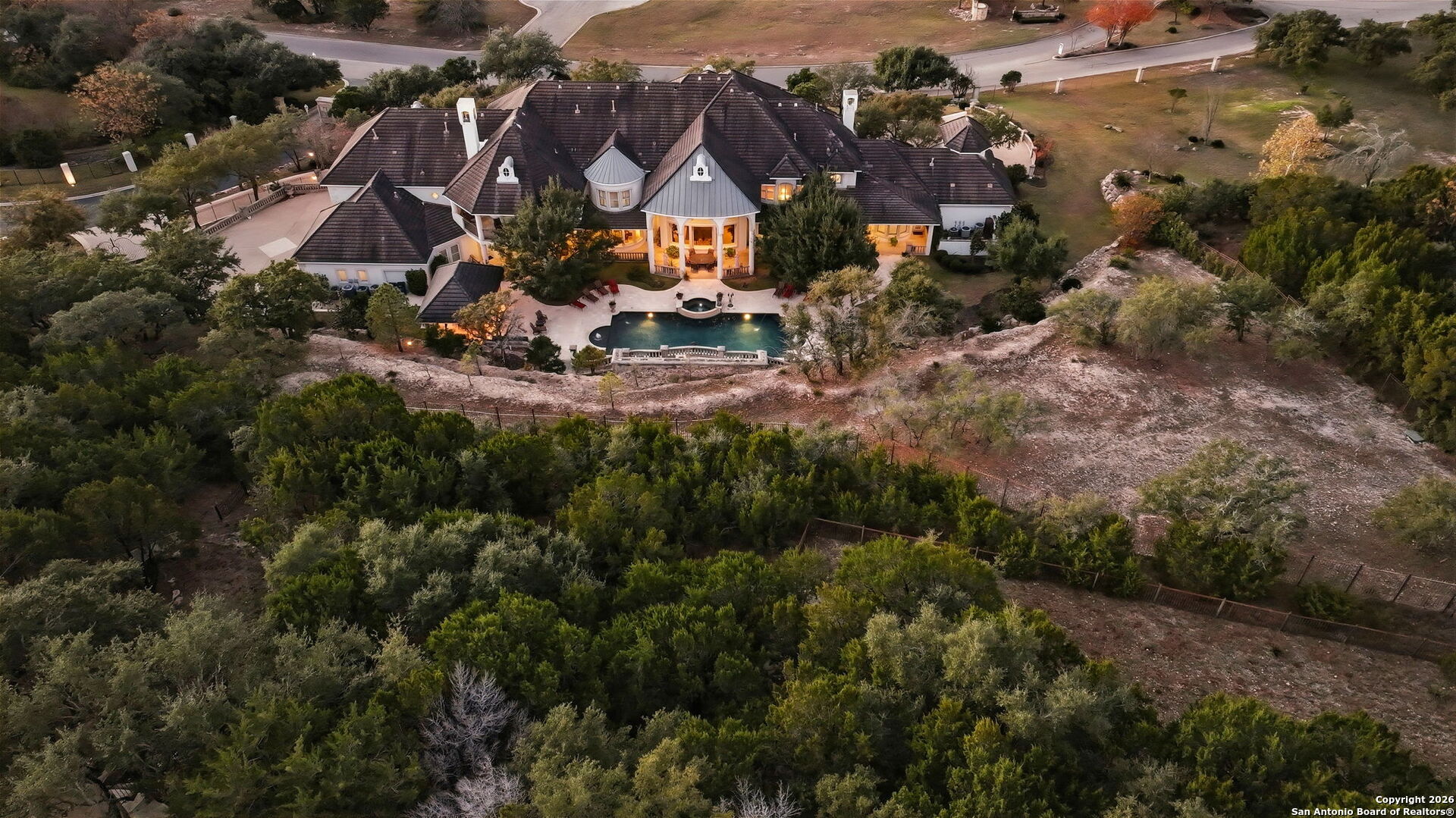 Perched gracefully atop a hill, this enchanting estate welcomes the most discerning buyer to experience timeless elegance and effortless luxury. A true French classic, 2 Admirals Way is a masterpiece of refined architecture and thoughtful design. Beyond the intricate wrought-iron gates, you're greeted by a sense of serenity and privacy, where lush, manicured grounds gently guide you home. Inside, soaring ceilings and expansive windows flood the residence with natural light, creating a seamless connection between the indoors and the breathtaking surroundings. Grand living spaces frame stunning views of the Hollywood-style pool, spa, and gazebo-perfectly designed for both intimate gatherings and unforgettable celebrations, blending indoor comfort with resort-style outdoor living. The Owner's retreat is a sanctuary unto itself, offering a lavish bath, private exercise room, and an elegant study or library-ideal for work, relaxation, or quiet reflection. Impeccably maintained, this seven-bedroom, eight-bath estate is perfectly suited for hosting family and friends and for memorable staycations. Located within The Crescent at The Dominion, one of San Antonio's most prestigious guarded and gated communities, this exceptional home offers a lifestyle defined by privacy, prestige, and grace. A MUST SEE!!