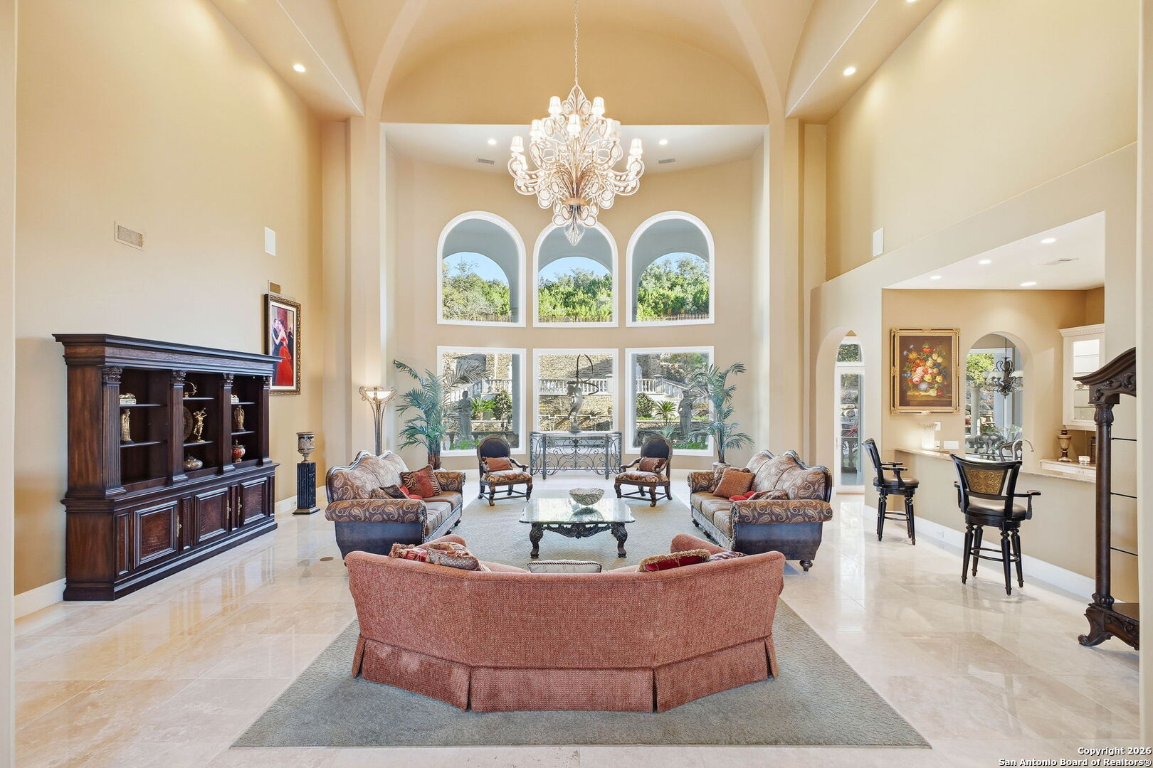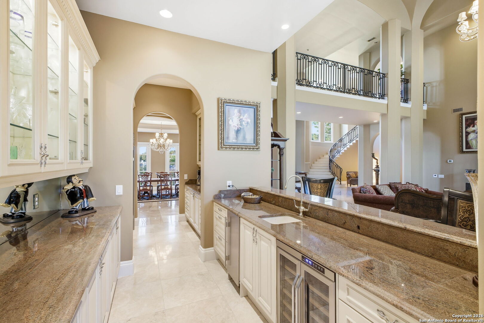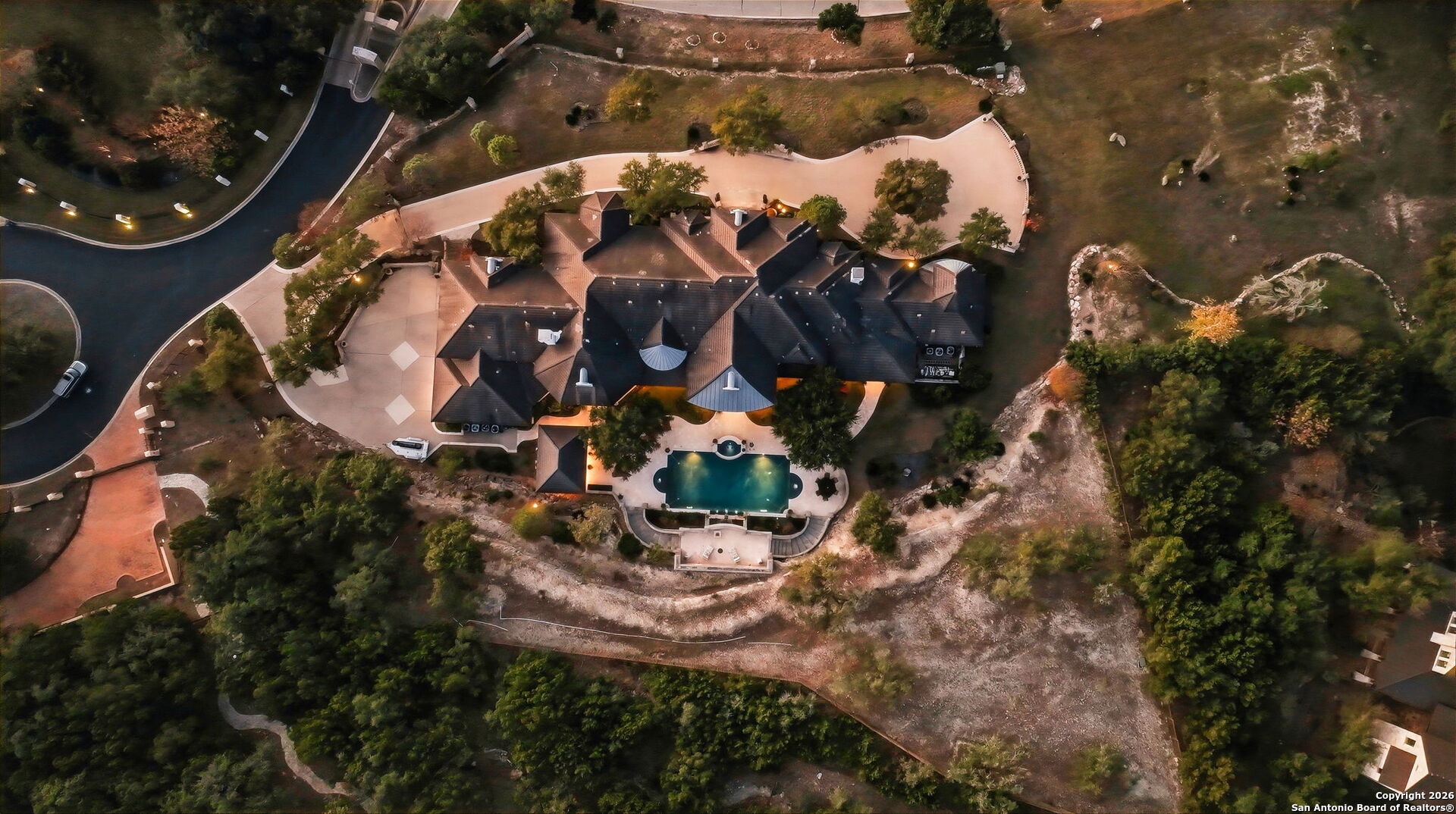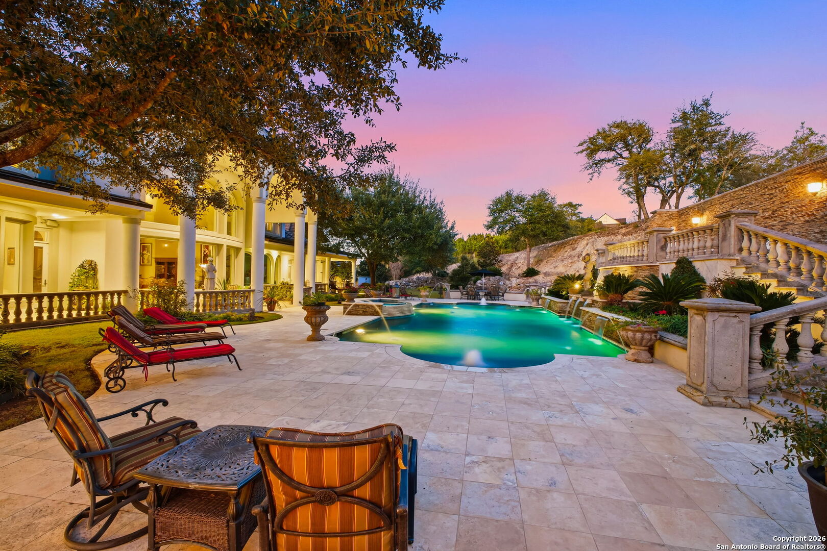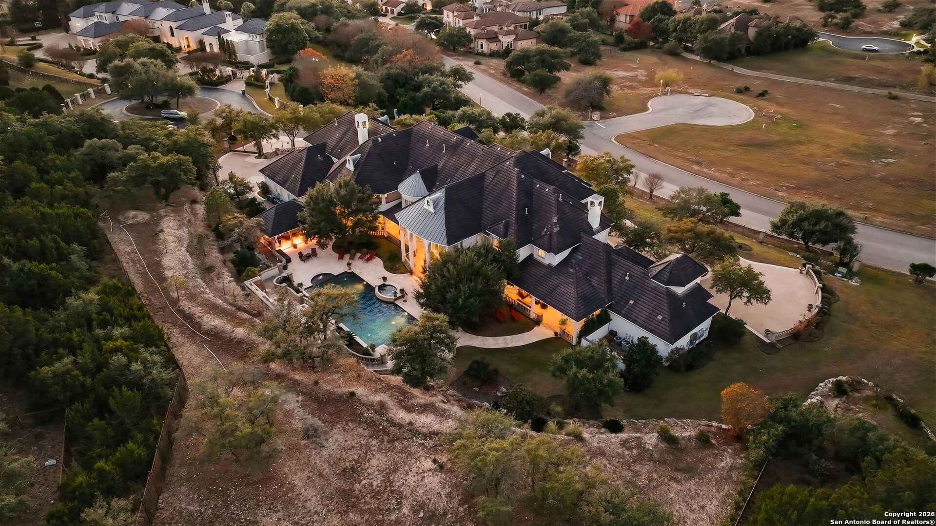 Perched gracefully atop a hill, this enchanting estate welcomes the most discerning buyer to experience timeless elegance and effortless luxury. A true French classic, 2 Admirals Way is a masterpiece of refined architecture and thoughtful design. Beyond the intricate wrought-iron gates, you're greeted by a sense of serenity and privacy, where lush, manicured grounds gently guide you home. Inside, soaring ceilings and expansive windows flood the residence with natural light, creating a seamless connection between the indoors and the breathtaking surroundings. Grand living spaces frame stunning views of the Hollywood-style pool, spa, and gazebo-perfectly designed for both intimate gatherings and unforgettable celebrations, blending indoor comfort with resort-style outdoor living. The Owner's retreat is a sanctuary unto itself, offering a lavish bath, private exercise room, and an elegant study or library-ideal for work, relaxation, or quiet reflection. Impeccably maintained, this seven-bedroom, eight-bath estate is perfectly suited for hosting family and friends and for memorable staycations. Located within The Crescent at The Dominion, one of San Antonio's most prestigious guarded and gated communities, this exceptional home offers a lifestyle defined by privacy, prestige, and grace. A MUST SEE!!