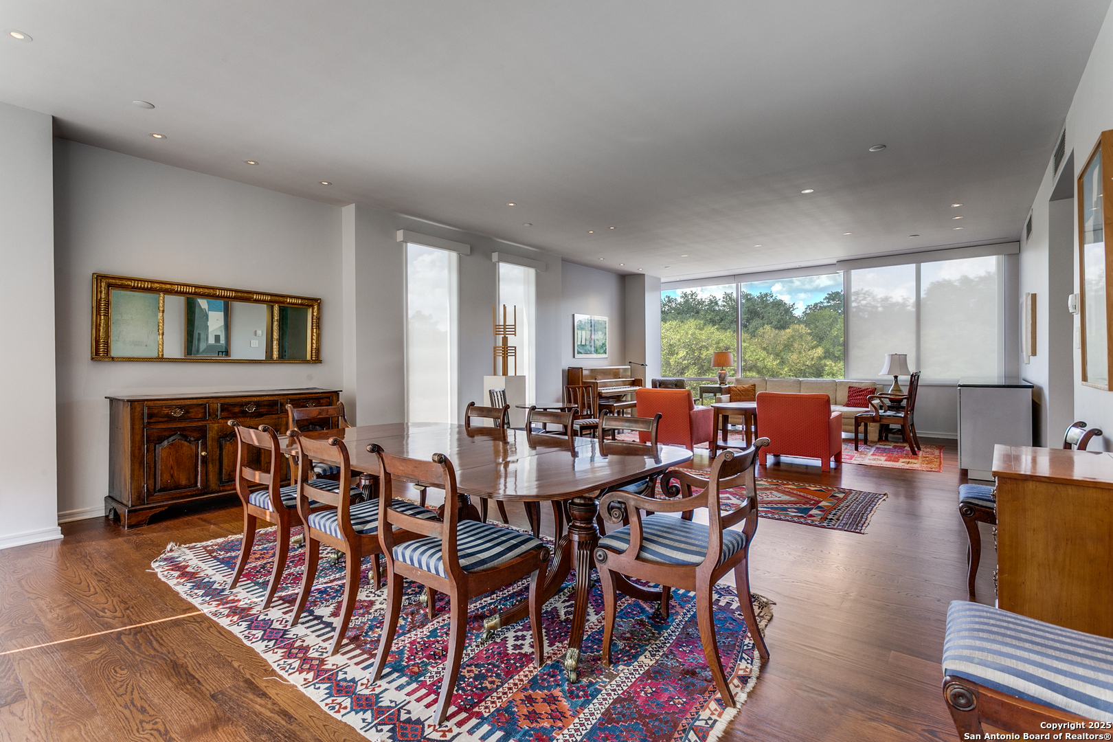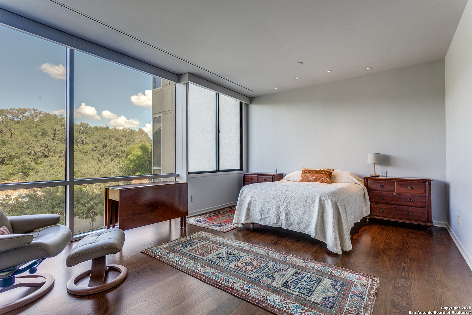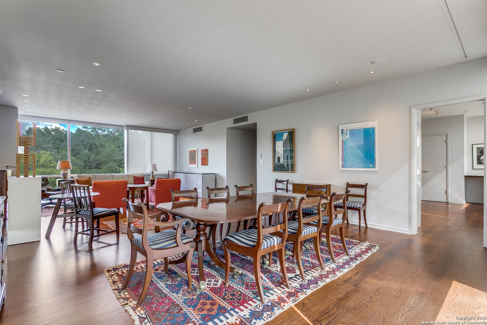 Luxurious condo living awaits at one of San Antonio's premier high rise buildings ideally located at the head waters of the San Antonio river. This end unit has lush treetop views with hardwood flooring throughout. The combined living and dining room is expansive with windows on three sides providing abundant natural lighting. The kitchen has ample storage, multiple ovens, and excellent work space. The main bedroom has a generous walk-in closet and luxurious bathroom with spa tub, walk-in shower, and double vanity. The second bedroom makes a great study or second living space. 2 Parking spaces. Building amenities include swimming pool, tennis and pickle ball courts, and walking trails.