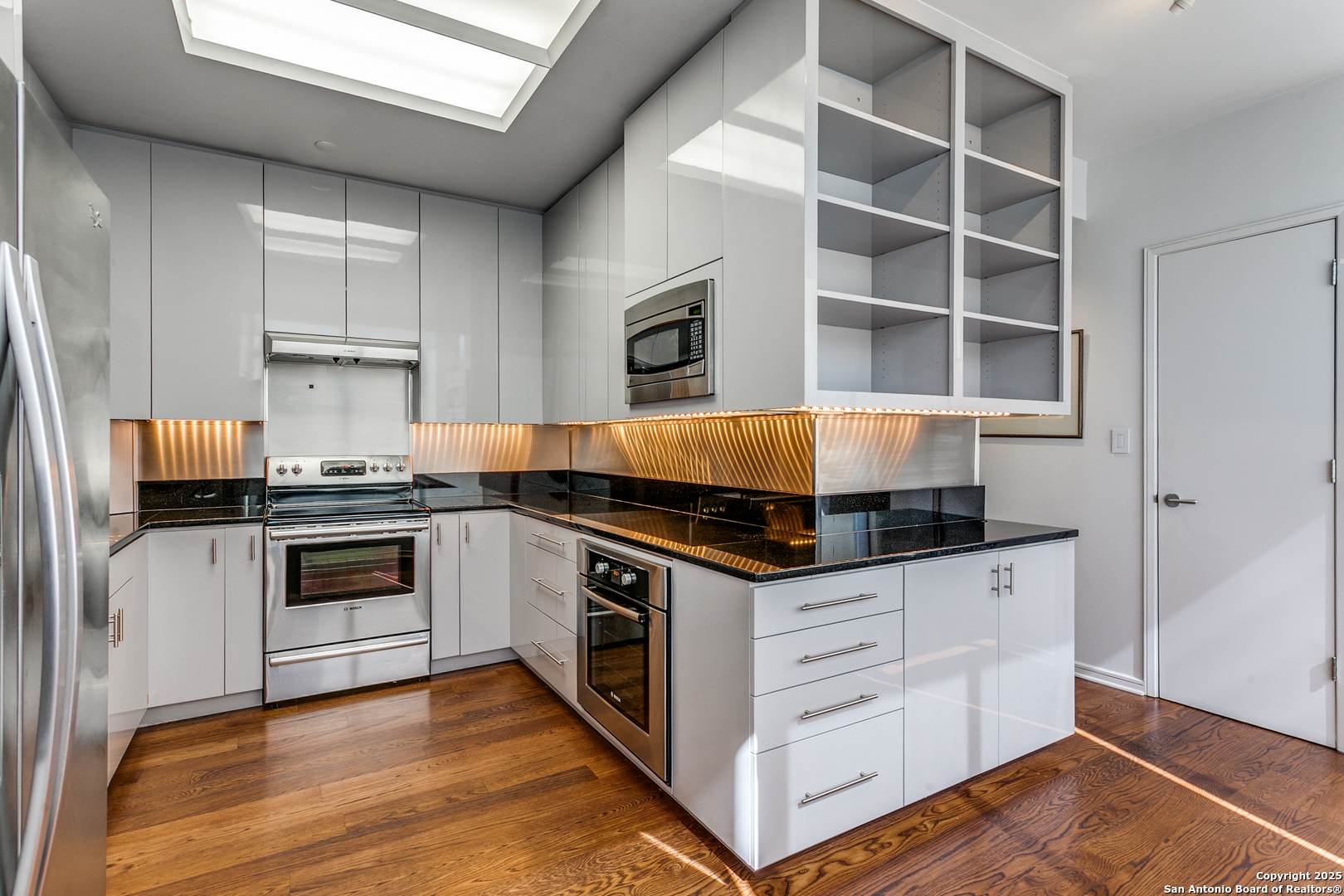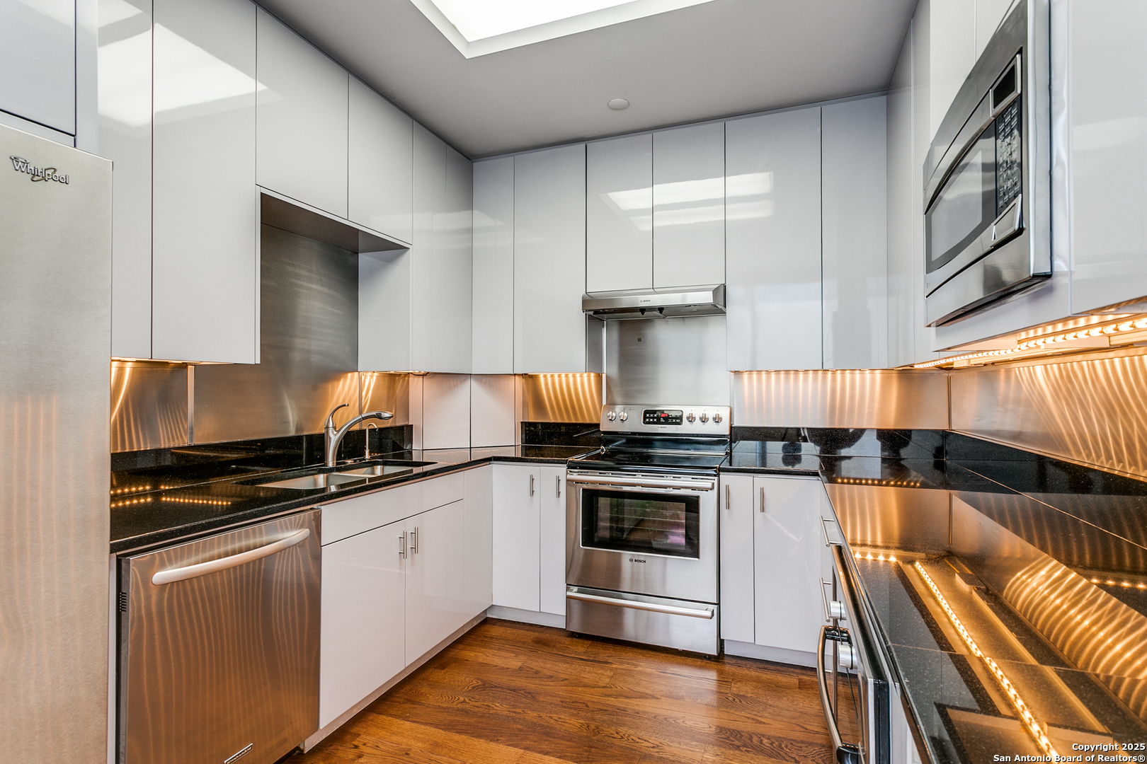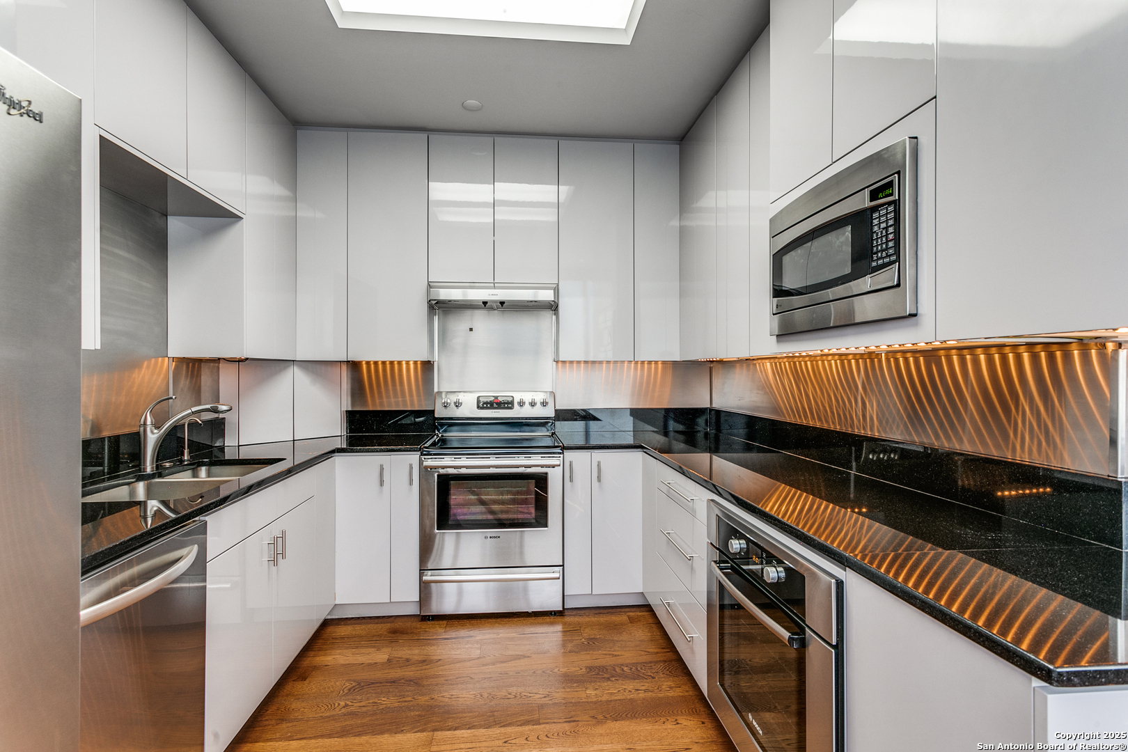 Luxurious condo living awaits at one of San Antonio's premier high rise buildings ideally located at the head waters of the San Antonio river. This end unit has lush treetop views with hardwood flooring throughout. The combined living and dining room is expansive with windows on three sides providing abundant natural lighting. The kitchen has ample storage, multiple ovens, and excellent work space. The main bedroom has a generous walk-in closet and luxurious bathroom with spa tub, walk-in shower, and double vanity. The second bedroom makes a great study or second living space. 2 Parking spaces. Building amenities include swimming pool, tennis and pickle ball courts, and walking trails.
