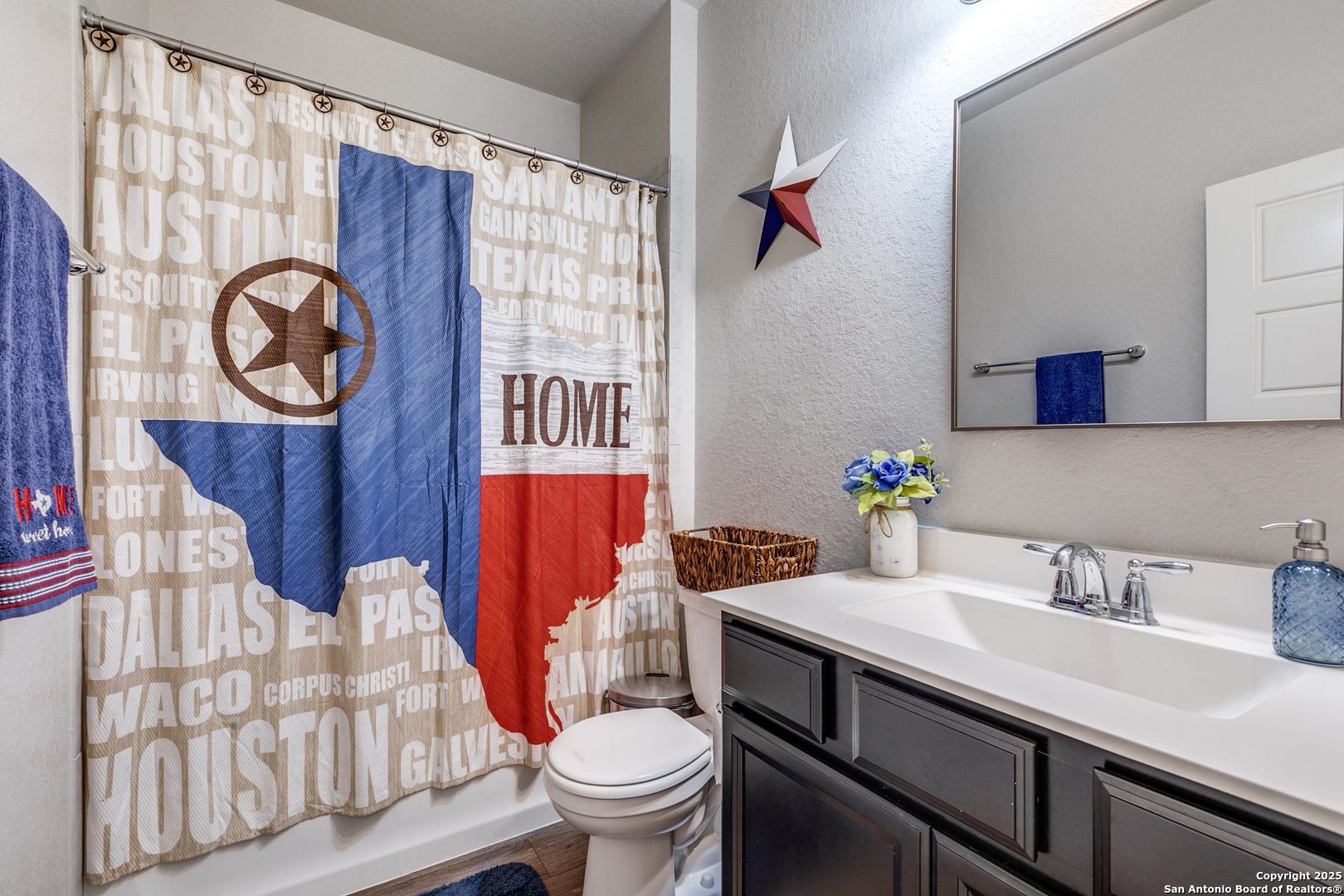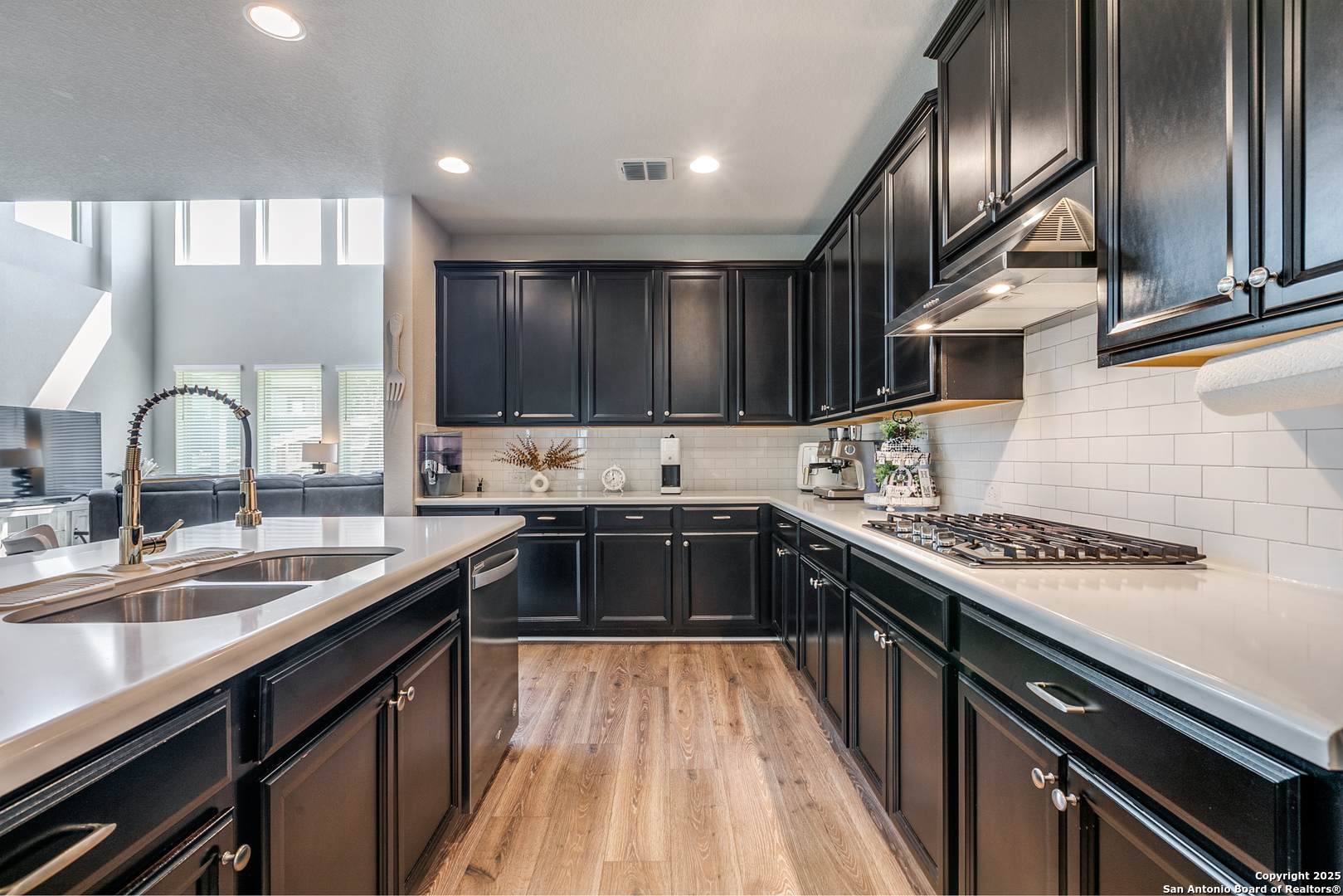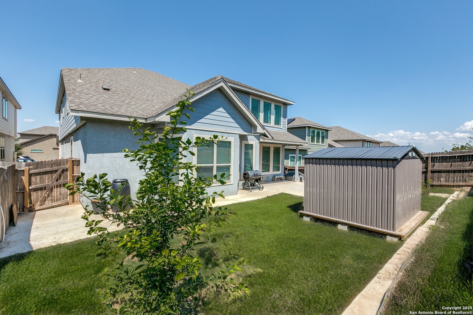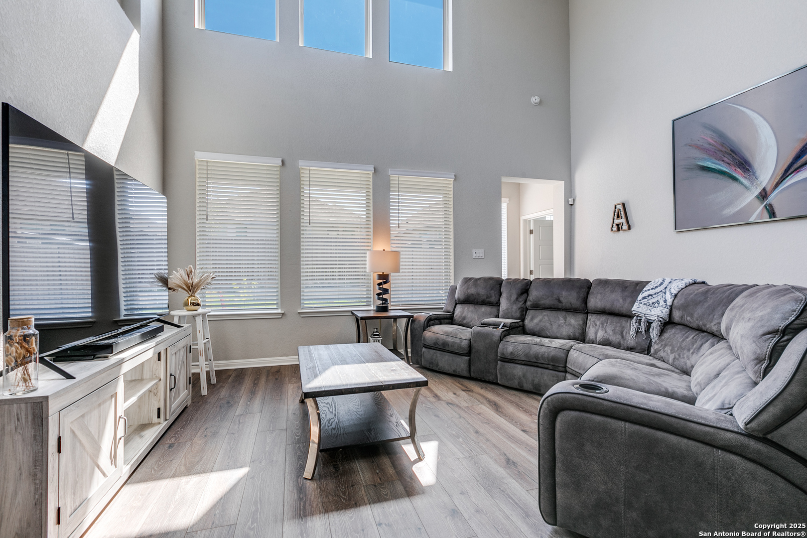 Welcome to your dream home in the heart of San Antonio! This stunning 5-bedroom, 4-bath home offers the perfect blend of space, style, and comfort. Step inside to soaring ceilings, an abundance of natural light, and an open-concept floor plan designed for modern living. The chef's kitchen is a true centerpiece with an island that opens to the living area, complete with stainless steel appliances, gas cooktop, built-in oven/microwave, recessed lighting, and rich espresso cabinets. Fresh laminate wood floors flow throughout the main living spaces, creating a warm and inviting atmosphere. The first-floor owner's retreat is your private getaway, featuring dual walk-in closets, a spa-like bath with a large garden tub, and a separate walk-in shower. The main level also includes a dedicated office, a full guest bath, and a built-in mudroom conveniently located off the oversized laundry room. Upstairs, you'll find endless entertainment space with a game room, media room, and a built-in workstation-perfect for work or study. Two bedrooms share a Jack-and-Jill bath, while two additional bedrooms have their own full bath. Enjoy evenings on your covered patio overlooking the large backyard for outdoor fun. Bonus features include: walk-in closets in every bedroom, soft interior paint colors, a gas port for outdoor grilling, and an ADT security system that conveys with the sale. Conveniently located near top-rated schools, shopping, and major highways for an easy commute. This home truly has it all-space, upgrades, and a lifestyle you'll love!