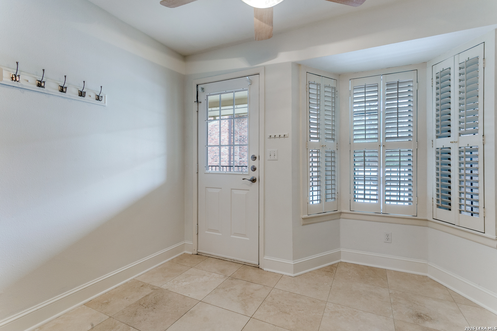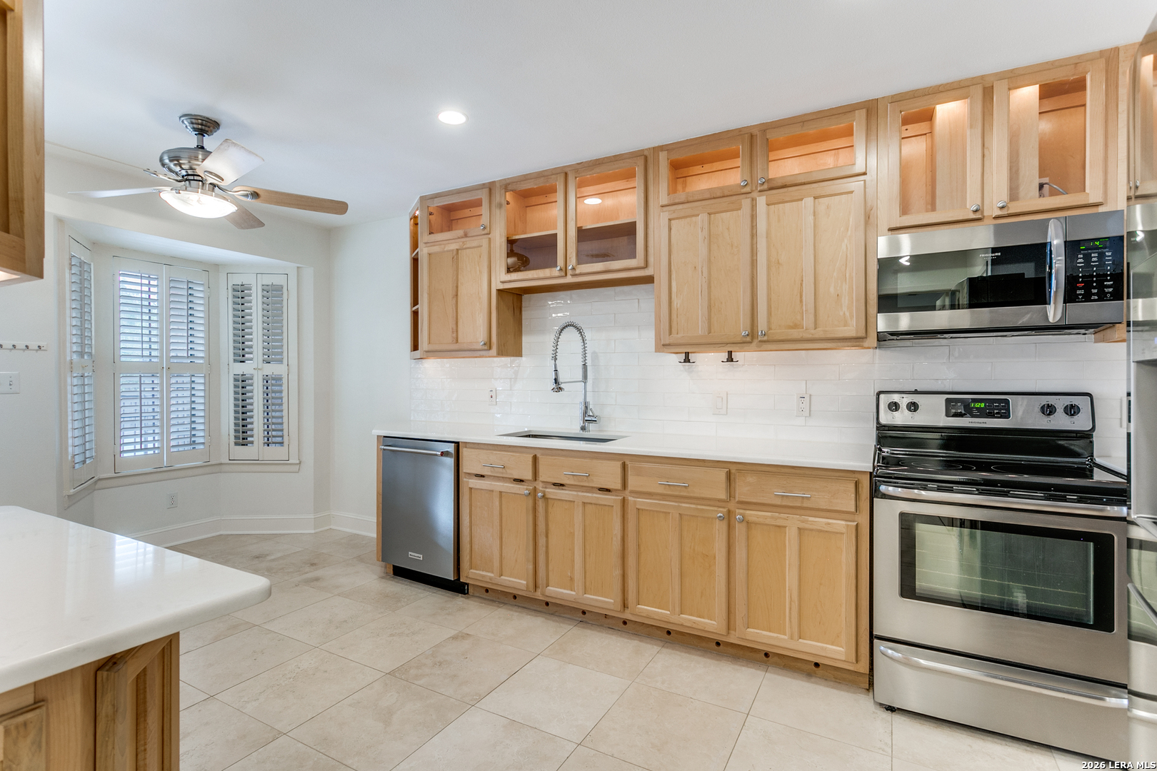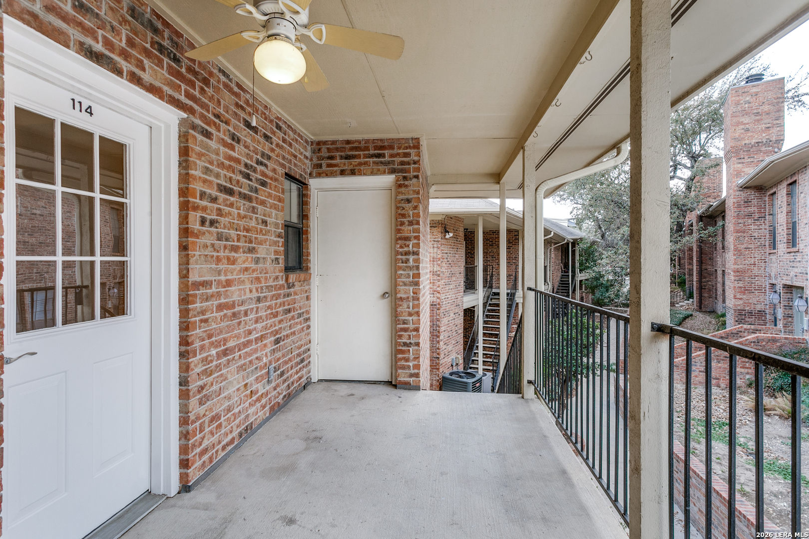 Get ready to move right in! This second floor condominium in the heart of Alamo Heights is a perfect, low-maintenance home for busy professionals or those looking for easy lock-and-leave lifestyle. Freshly painted, the combined living room-dining area is bright and spacious with plantation shutters and a wood-burning fireplace with an eye-catching surround and mantel. The dining area has a handsome built-in bookcase for enhanced storage and display. The updated kitchen boasts recent, stainless appliances, maple cabinets, light solid counters providing great work space and storage. A breakfast nook allows room for casual dining. The primary bedroom is sized nicely with a walk-in closet and en-suite bathroom that is updated with a double vanity and separate shower and tub. The second bedroom has ample closets. Stacked washer/dryer in unit. Enjoy some outdoor space on the balcony with extra storage closet. One covered carport space.