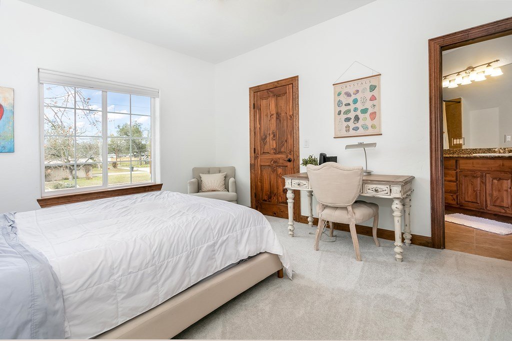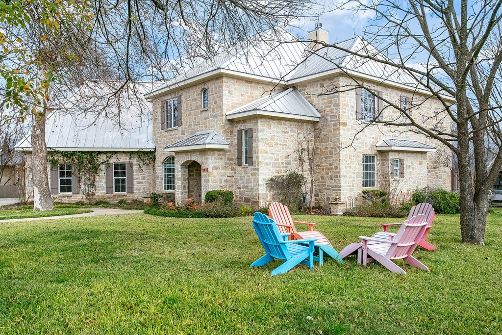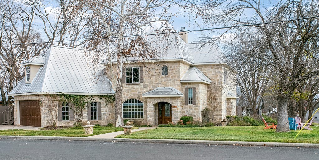 PERMITTED SHORT TERM RENTAL, OR GREAT HOME ONE BLOCK FROM MAIN! This corner lot LOCATION couldn't be better-whether you want to continue this highly successful bnb or make this your primary residence, you are truly in the HEART of all that we love about Fredericksburg, TX! Inside you'll find soaring ceilings, loads of natural light, stainless appliances, and black custom cabinetry. The stone masonry fireplace is a show stopper, the perfect place to gather with friends and family. With 5 bedrooms and 4.5 baths there truly is space for everyone! Comes furnished and bookings convey. STR # 8056002018