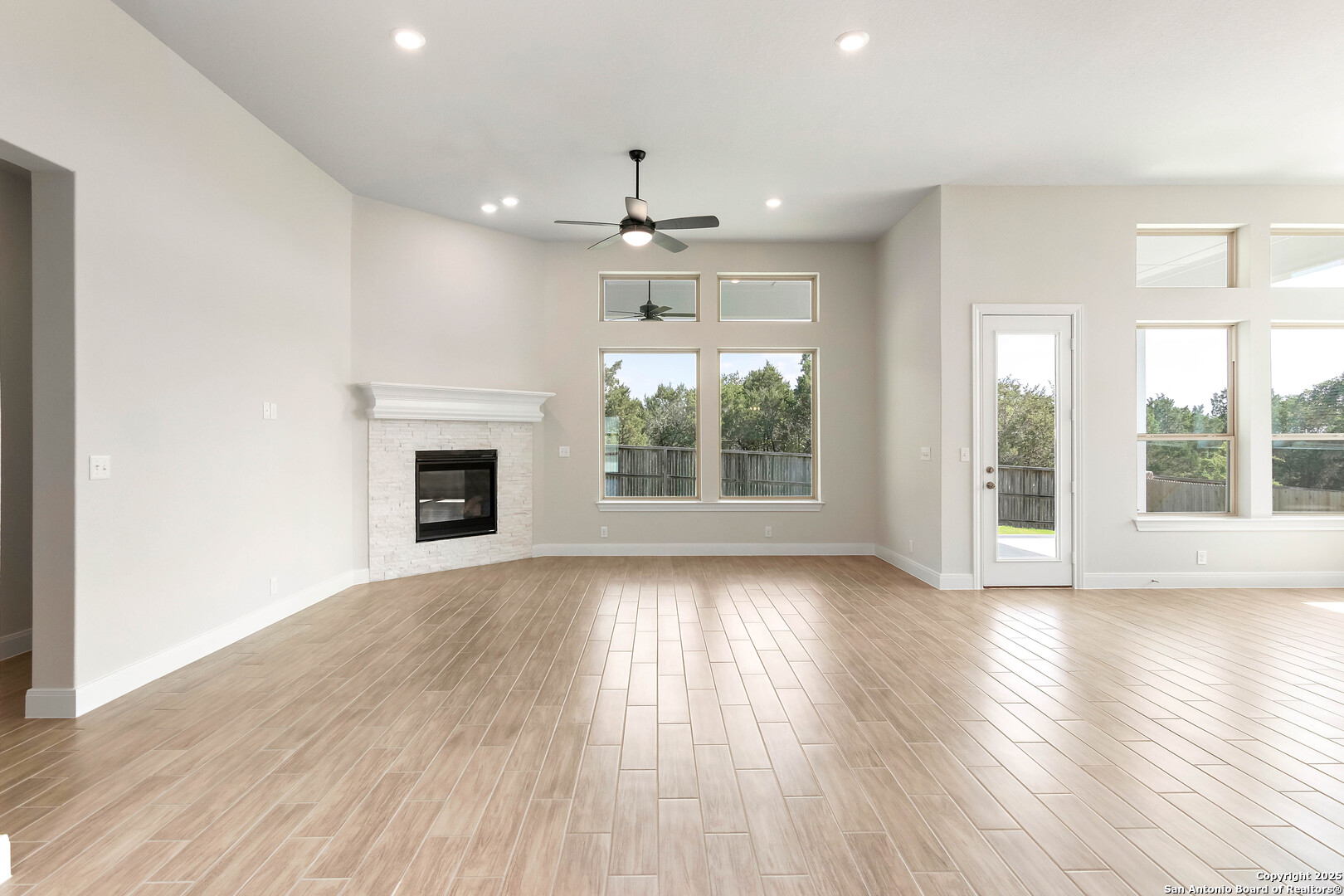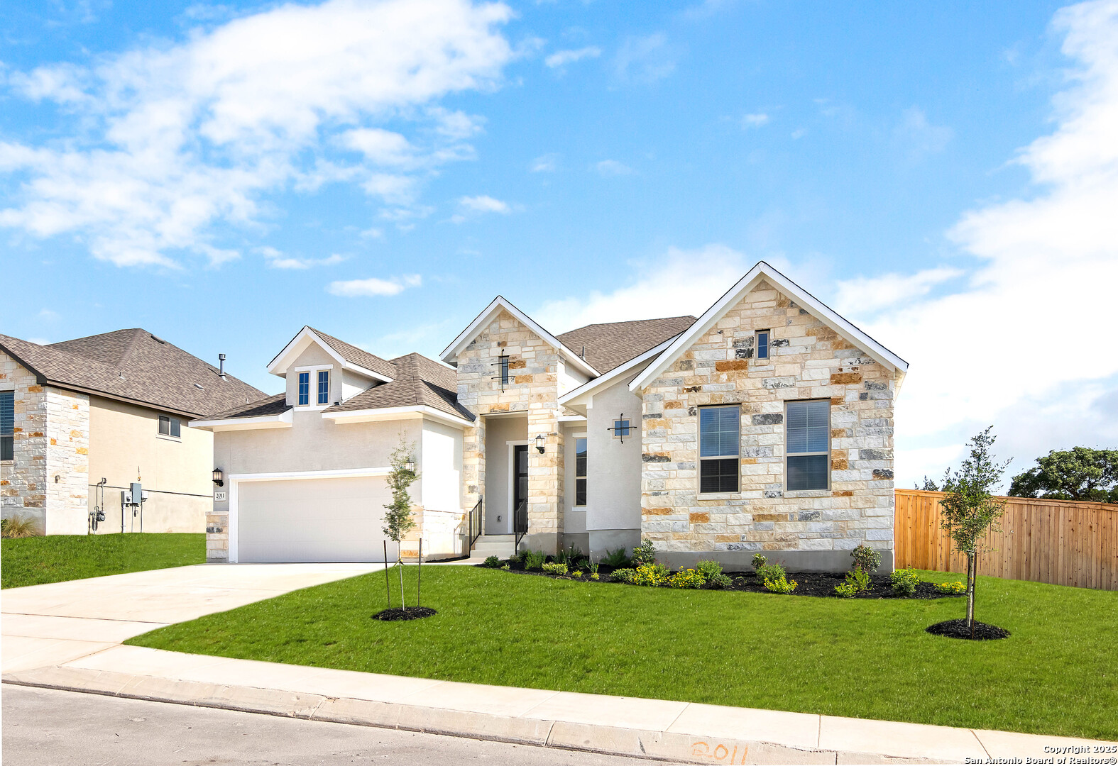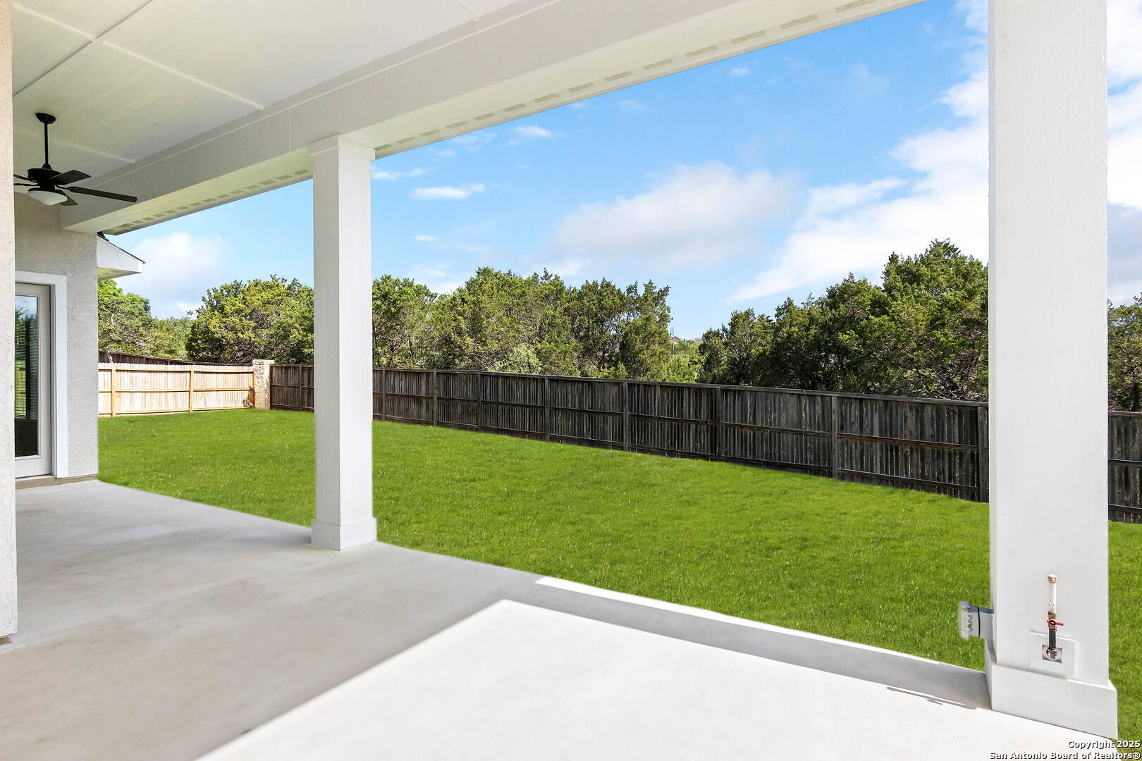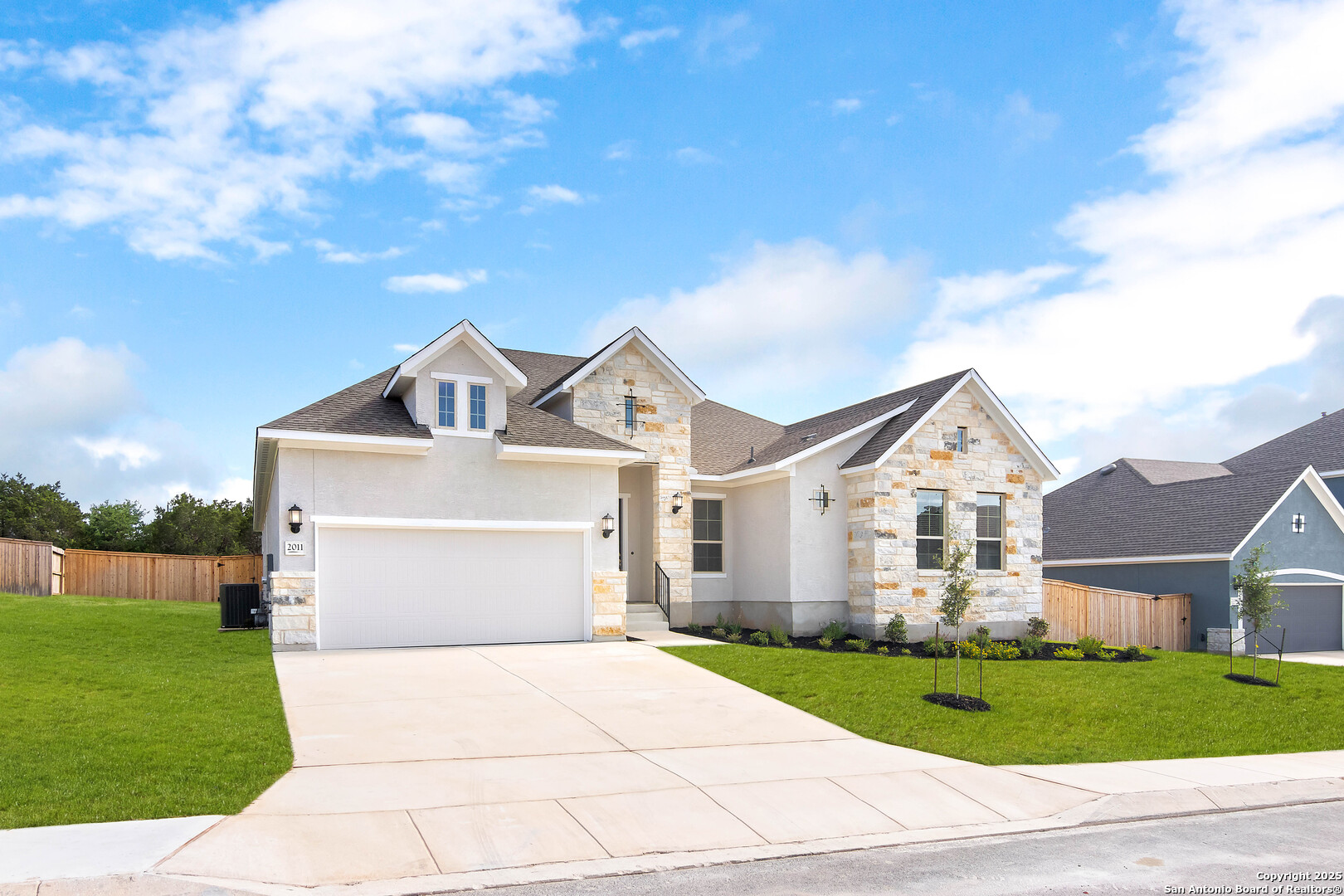 Stunning 3 Bedroom, 3.5 Bath home in Hastings Ridge at Kinder Ranch! This David Weekly single-story design combines modern living with everyday comfort.. Featuring 3 bedrooms, each with its own private bath, plus a guest powder room. The spacious open layout includes 12-foot ceilings, a chef-inspired kitchen with a 14-foot island, walk-in pantry, gas cooktop, and built-in stainless steel appliances. The primary suite features a Large shower with 9 ft ceilings, double vanities, and a walk-in closet. Additional spaces include a study, bonus room, and laundry room, all on one level. Enjoy a covered patio overlooking the greenbelt and hill views on a fully fenced .29-acre lot with a sprinkler system. Extras include a four-car tandem garage, water softener, fireplace, and energy-efficient windows. Located in the highly rated Comal ISD and minutes from shopping, dining, and highway access. Come tour today!