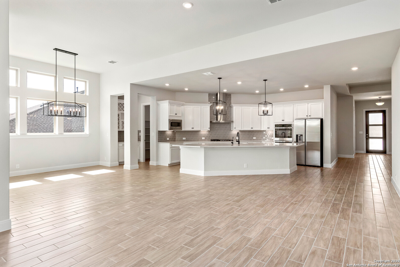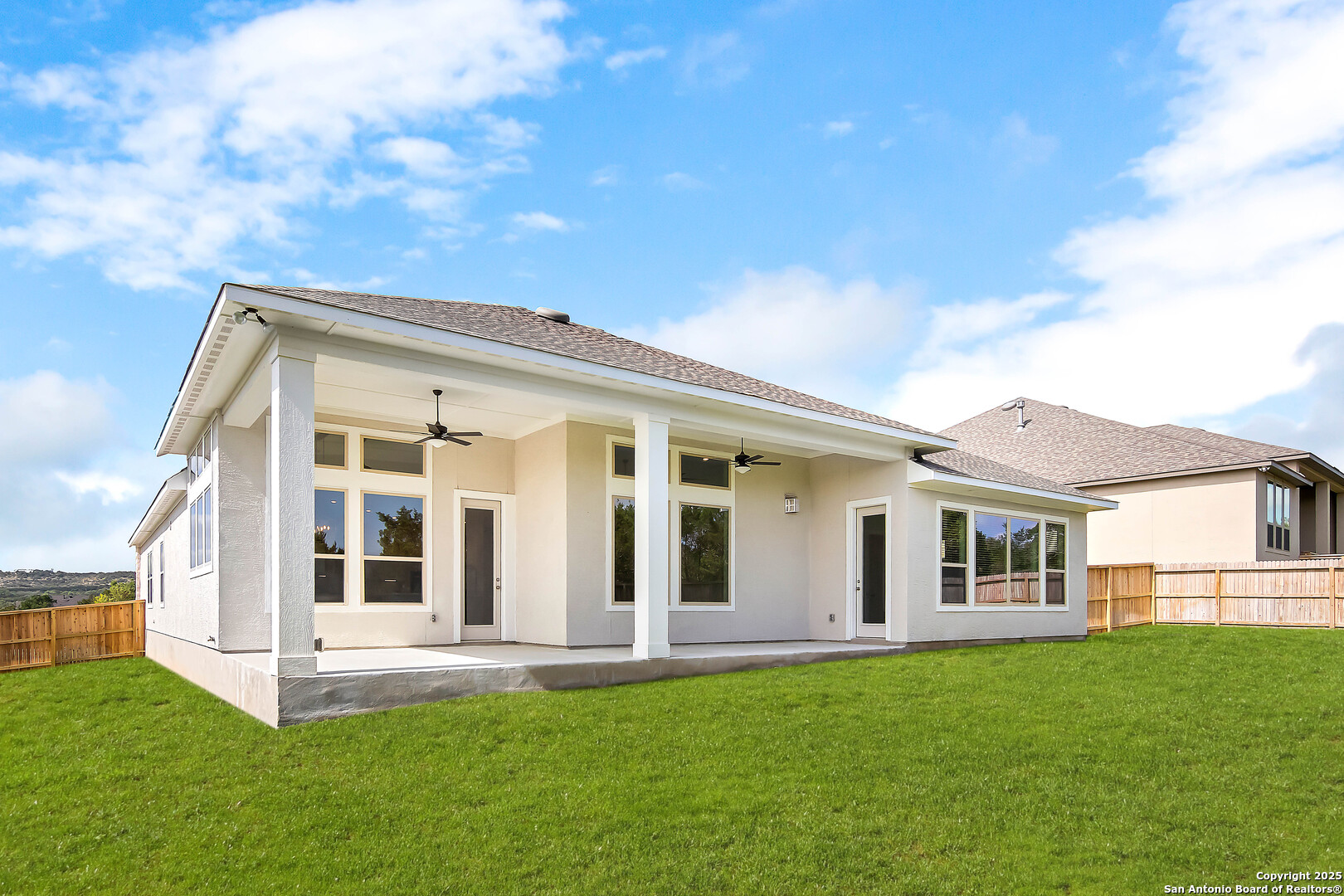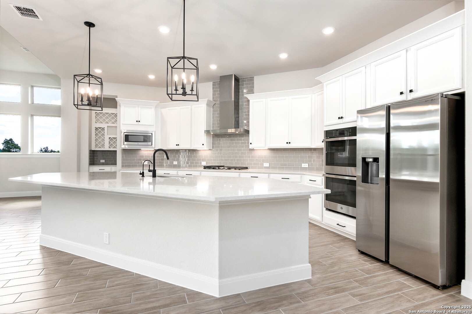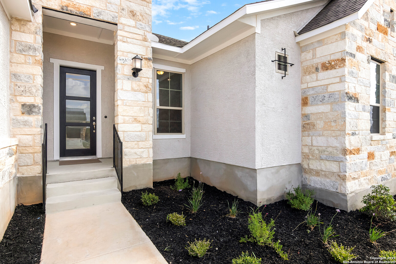 Stunning 3 Bedroom, 3.5 Bath home in Hastings Ridge at Kinder Ranch! This David Weekly single-story design combines modern living with everyday comfort.. Featuring 3 bedrooms, each with its own private bath, plus a guest powder room. The spacious open layout includes 12-foot ceilings, a chef-inspired kitchen with a 14-foot island, walk-in pantry, gas cooktop, and built-in stainless steel appliances. The primary suite features a Large shower with 9 ft ceilings, double vanities, and a walk-in closet. Additional spaces include a study, bonus room, and laundry room, all on one level. Enjoy a covered patio overlooking the greenbelt and hill views on a fully fenced .29-acre lot with a sprinkler system. Extras include a four-car tandem garage, water softener, fireplace, and energy-efficient windows. Located in the highly rated Comal ISD and minutes from shopping, dining, and highway access. Come tour today!