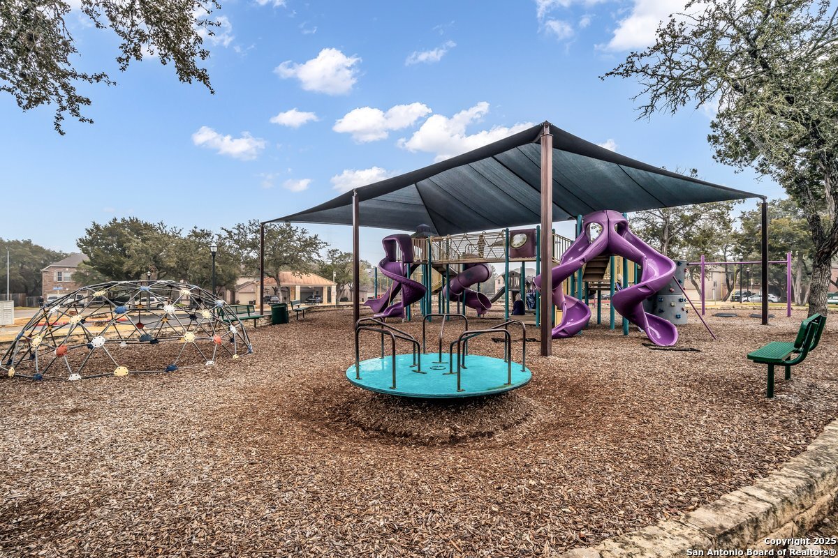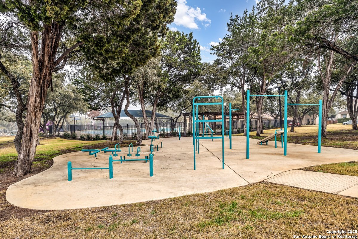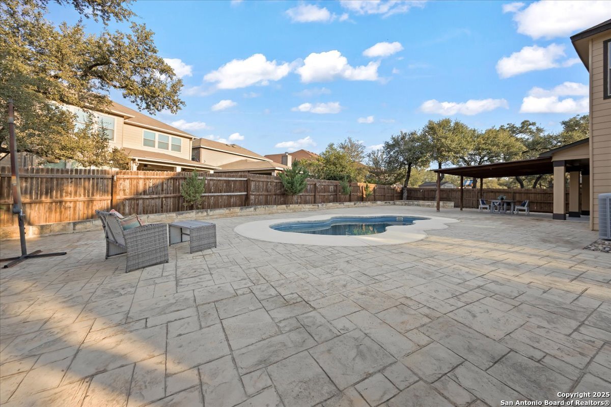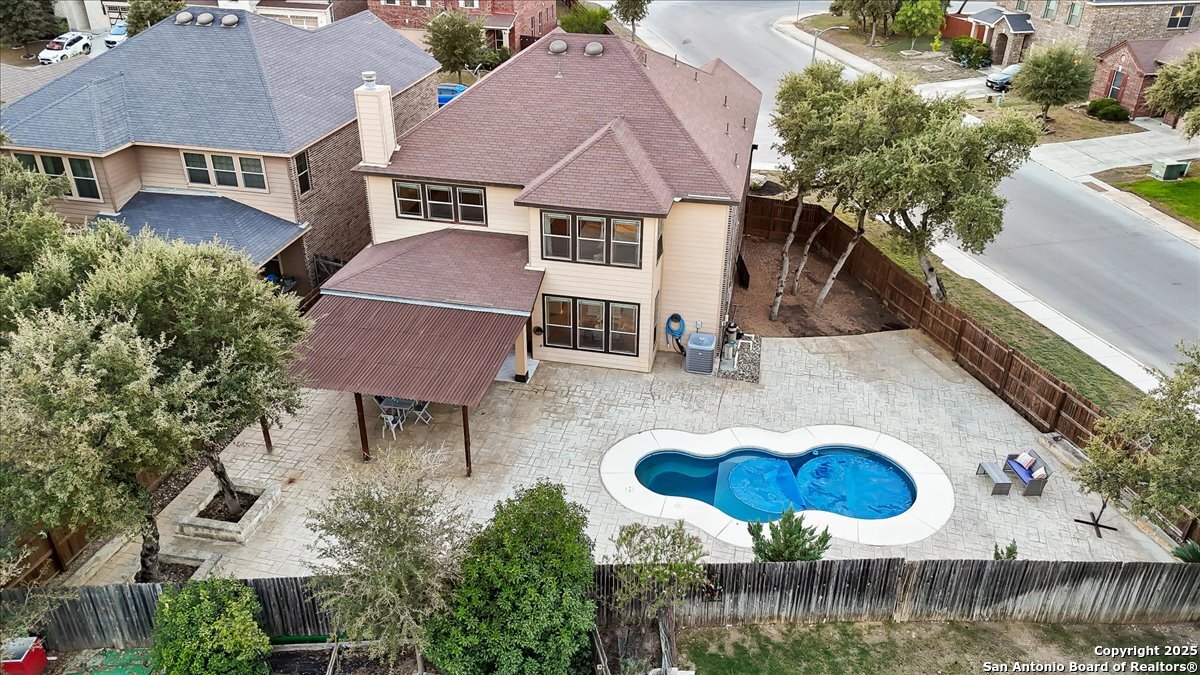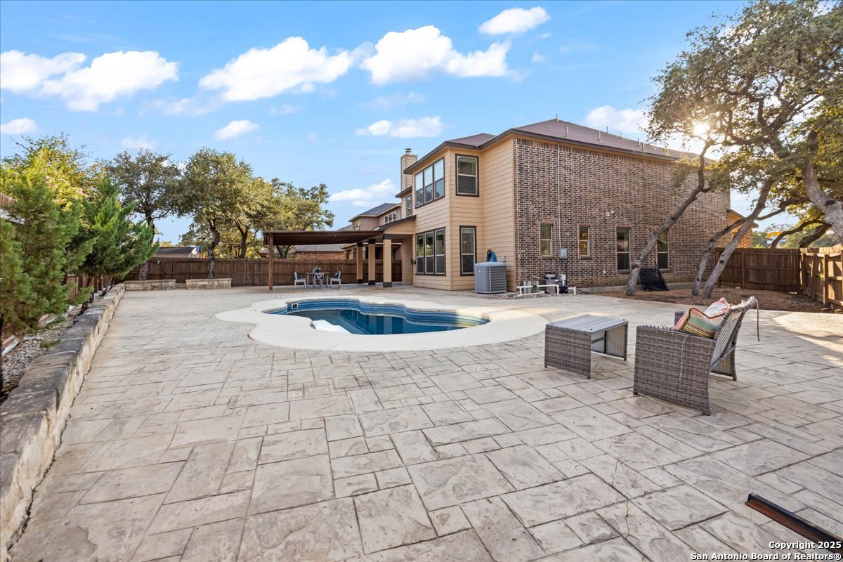 Stunning 4 bedroom home with pool in highly desirable Fox Grove! Fresh paint throughout, a private study, and a spacious game room make this home both functional and inviting. The island kitchen with granite and stainless appliances opens to the family room with a rock fireplace. Primary suite features a walk-in closet with custom built-ins, garden tub, and separate shower. Corner lot offers extra privacy, extended covered patio, pergola and flat work area - perfect for relaxing or entertaining! Tile floors downstairs, garage with its own AC unit, and excellent storage add convenience. Enjoy top-rated NEISD schools, fantastic community amenities such as a pool and playground, and a prime North San Antonio location with easy access to Loop 1604, Hwy 281, Randolph AFB, and Fort Sam Houston. Welcome home!