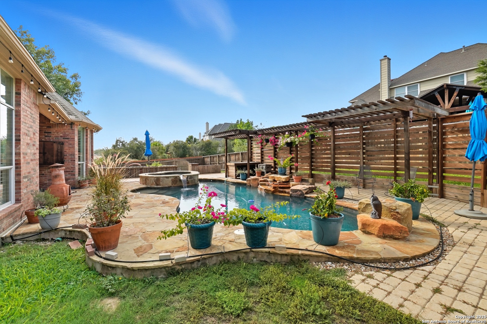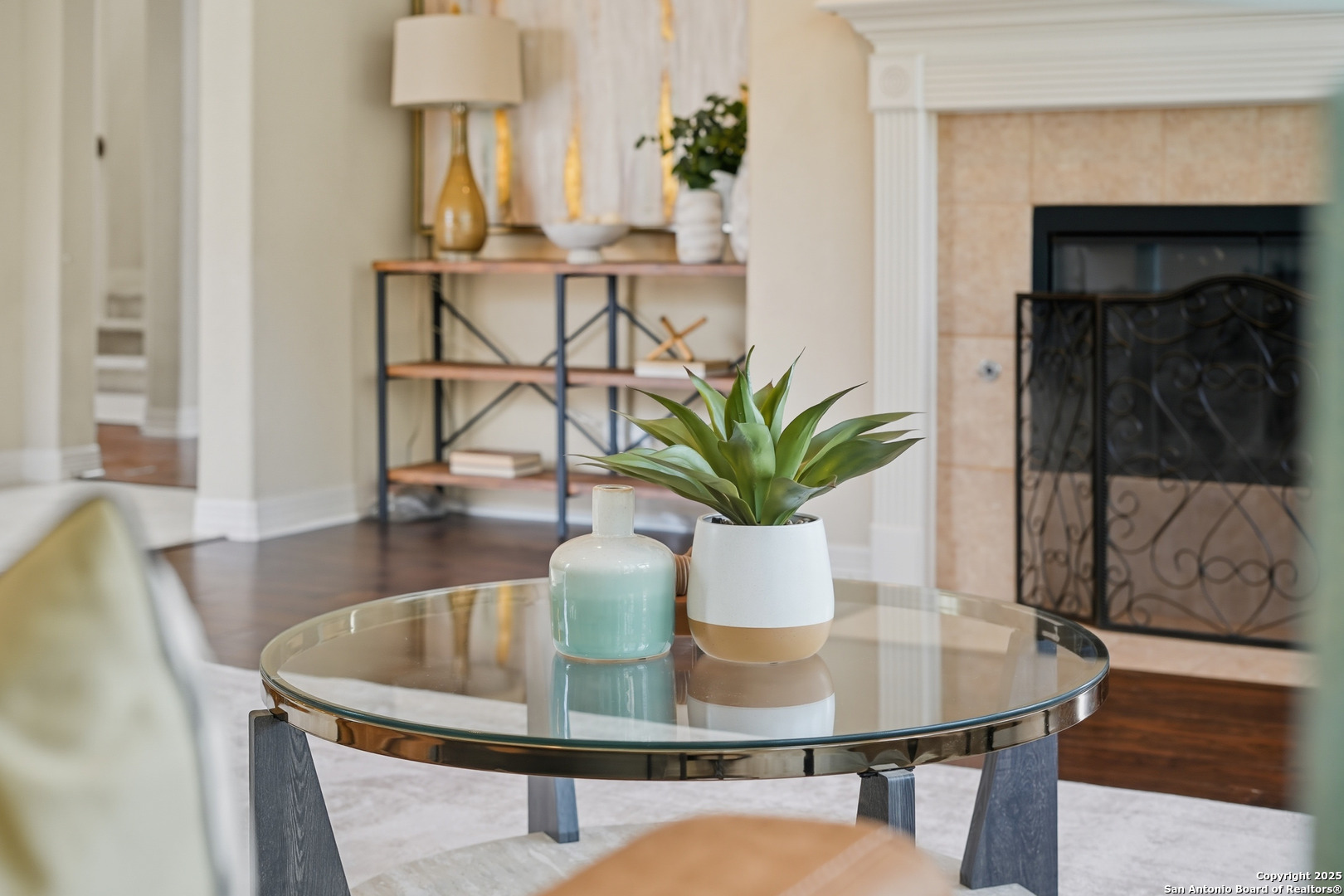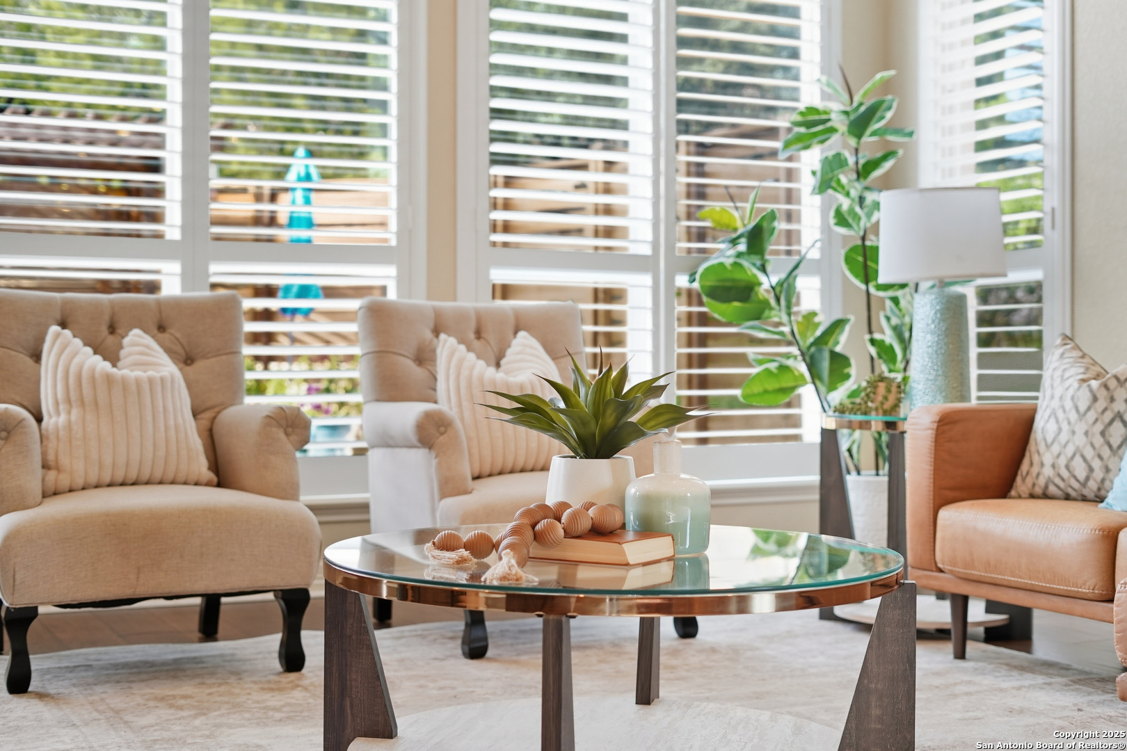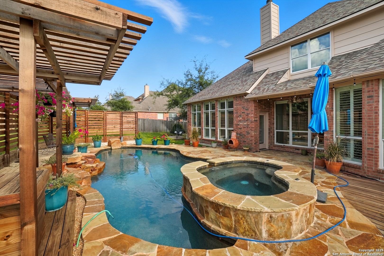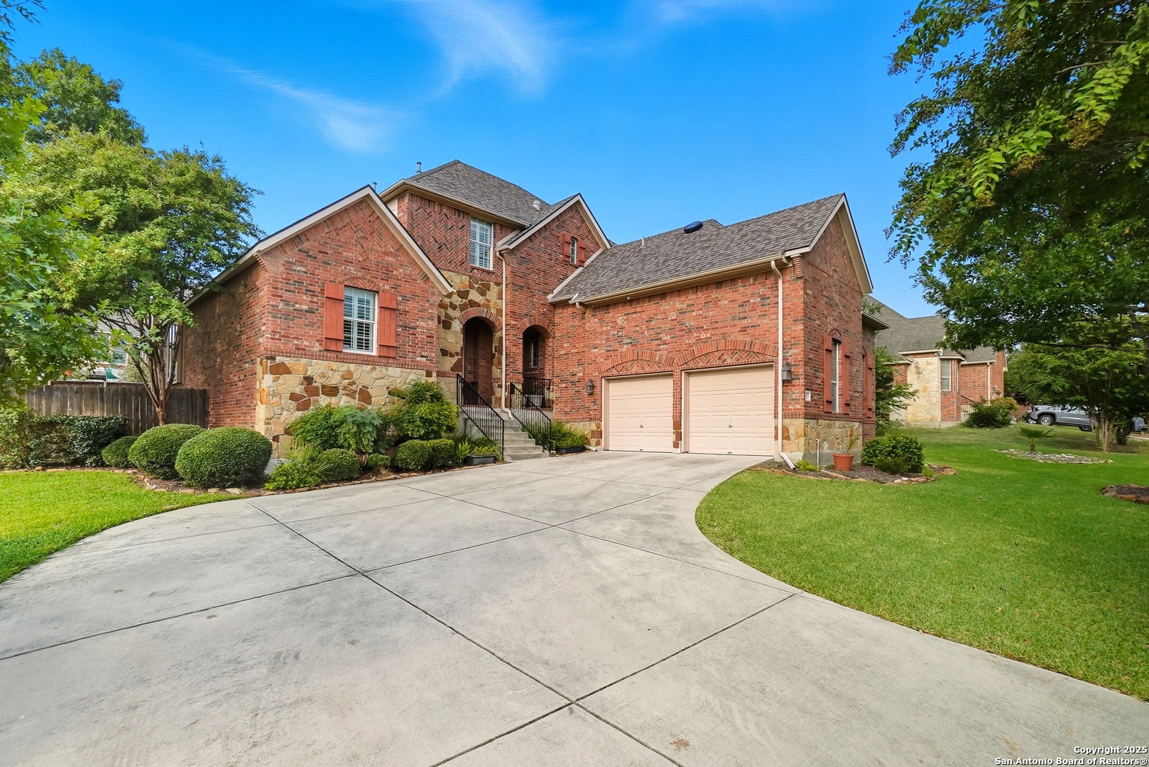 Nestled in the gated enclave of the Stone Oak Mesa Grande, this stately residence sits on a beautifully landscaped .36-acre lot. Featuring five bedrooms plus a dedicated study, the layout includes a private upstairs guest suite-ideal for visitors or multigenerational living. The expansive open-concept living room impresses with soaring ceilings, abundant natural light, and a cozy gas fireplace. The spacious island kitchen features gas cooking, extensive cabinetry, and generous prep space for any culinary endeavor. Upstairs offers a large second living room- perfect for media, play, or fitness, and a versatile bonus room. The primary suite is a peaceful retreat, complete with a sitting area. Step outside into a resort-style backyard oasis, highlighted by a custom heated pool and spa designed by Keith Zars Pools. Surrounded by mature landscaping and ample patio space, it's perfect for year-round entertaining. Additional highlights includes abundant storage space in the garage.