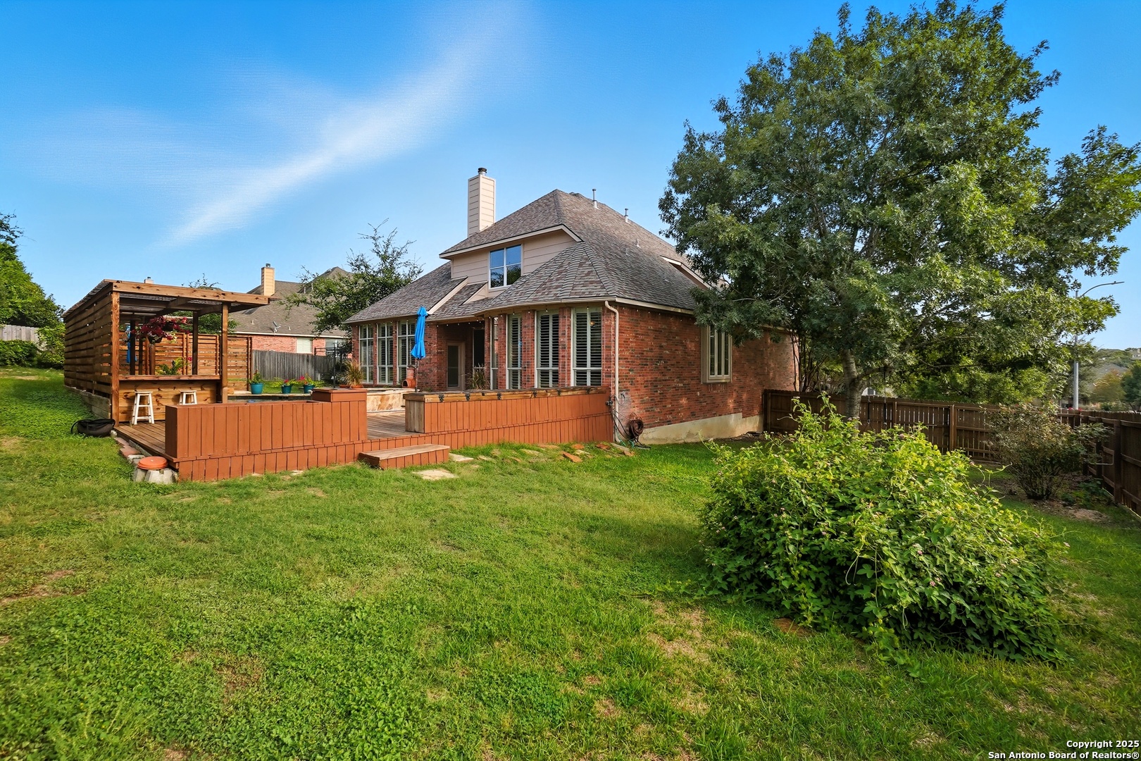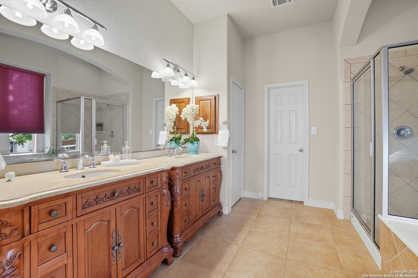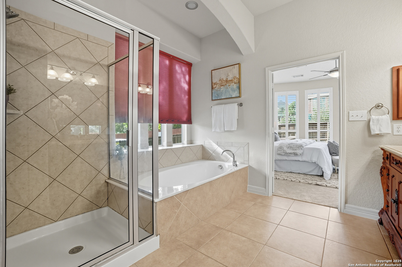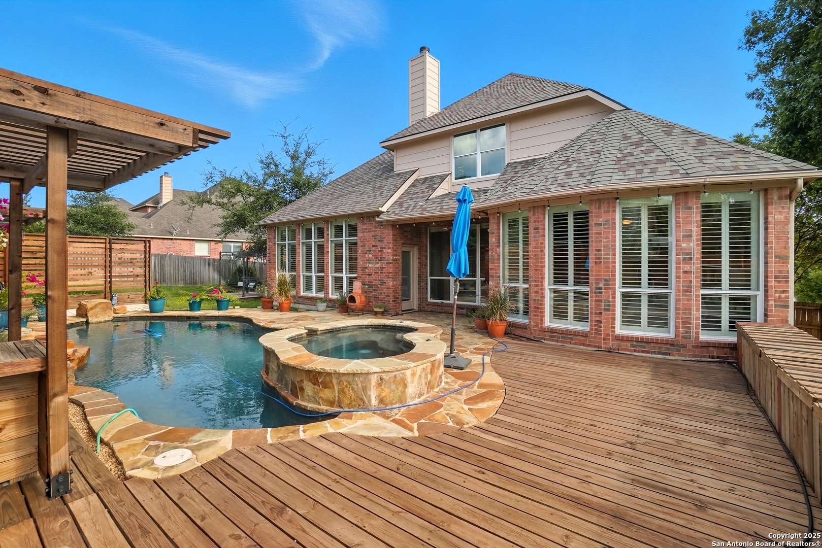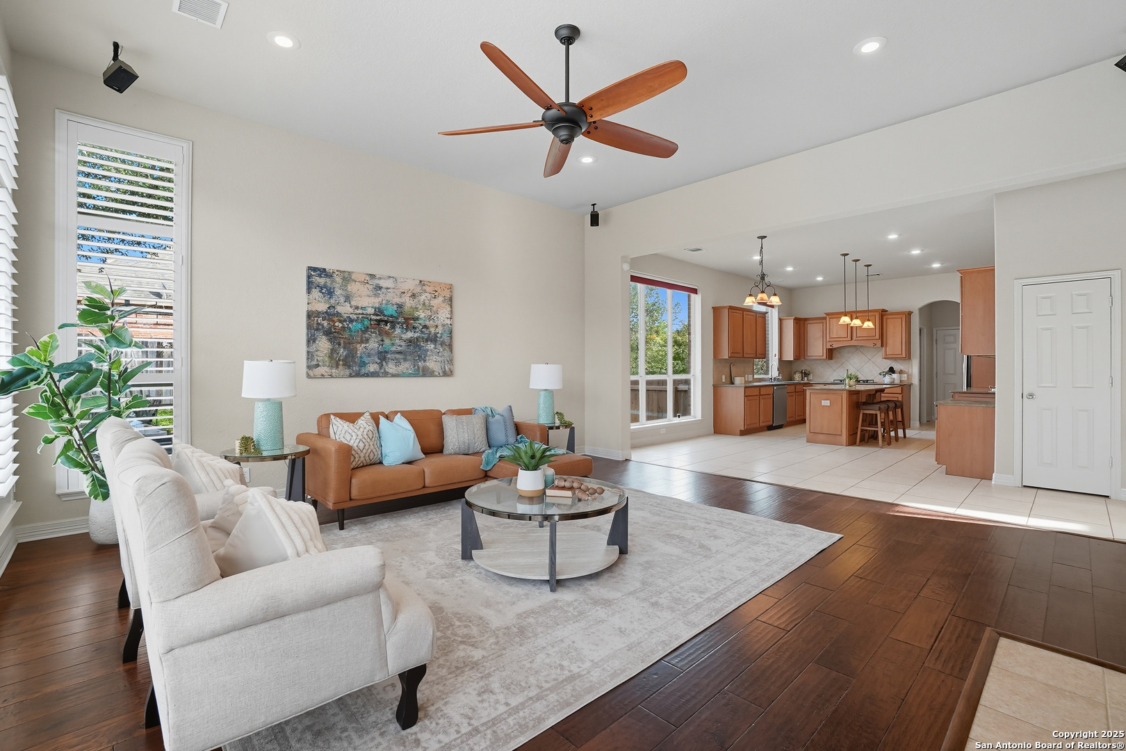 Nestled in the gated enclave of the Stone Oak Mesa Grande, this stately residence sits on a beautifully landscaped .36-acre lot. Featuring five bedrooms plus a dedicated study, the layout includes a private upstairs guest suite-ideal for visitors or multigenerational living. The expansive open-concept living room impresses with soaring ceilings, abundant natural light, and a cozy gas fireplace. The spacious island kitchen features gas cooking, extensive cabinetry, and generous prep space for any culinary endeavor. Upstairs offers a large second living room- perfect for media, play, or fitness, and a versatile bonus room. The primary suite is a peaceful retreat, complete with a sitting area. Step outside into a resort-style backyard oasis, highlighted by a custom heated pool and spa designed by Keith Zars Pools. Surrounded by mature landscaping and ample patio space, it's perfect for year-round entertaining. Additional highlights includes abundant storage space in the garage.