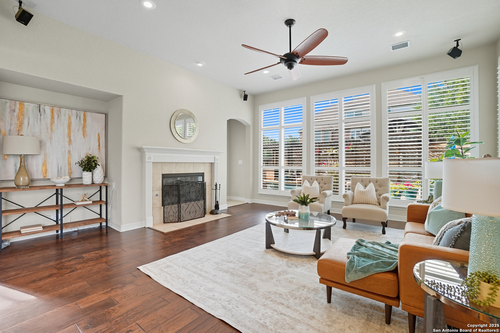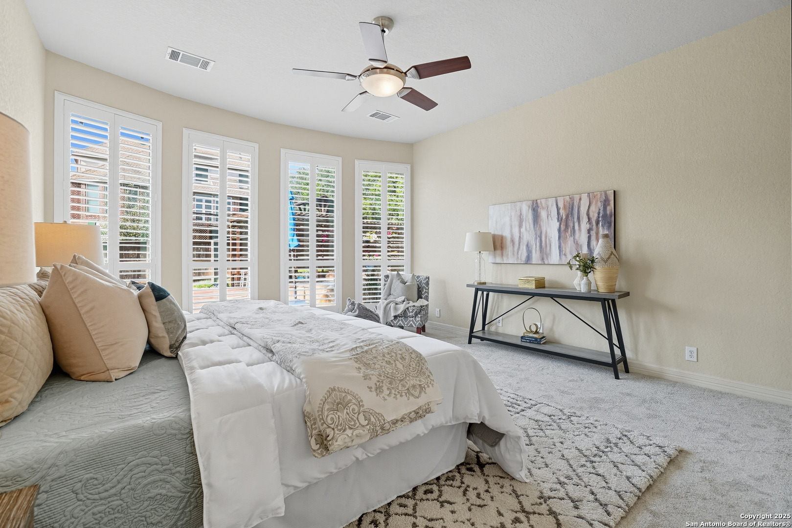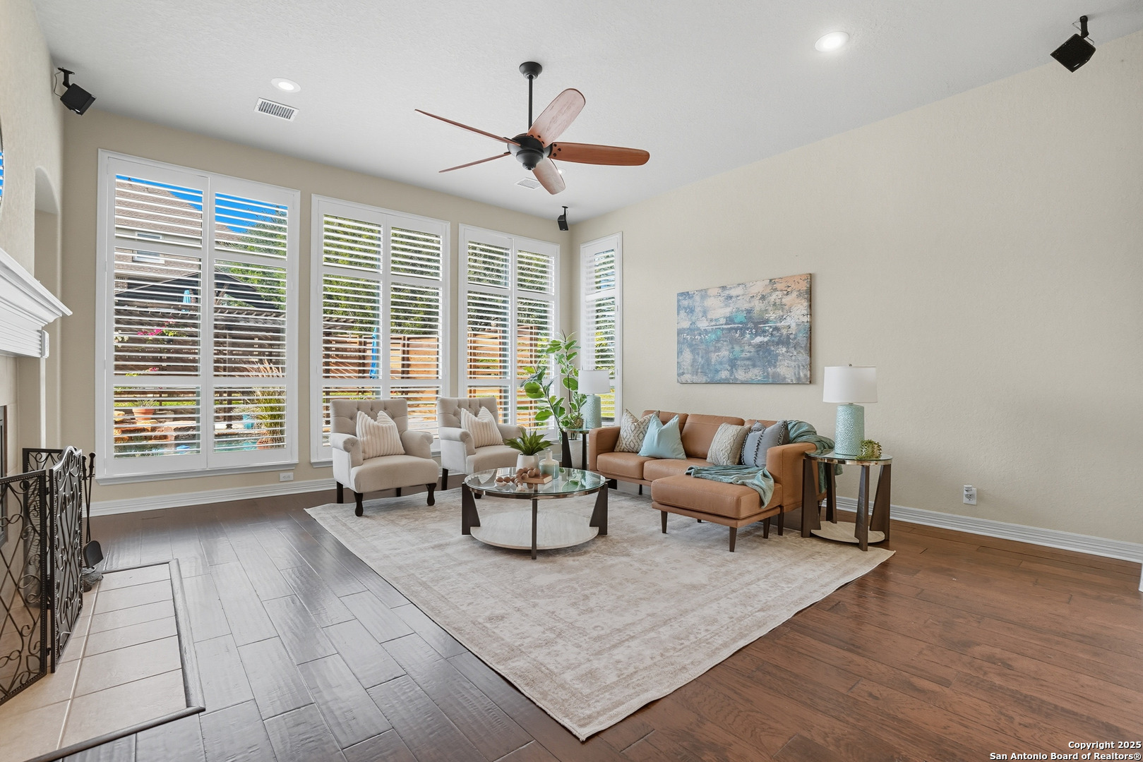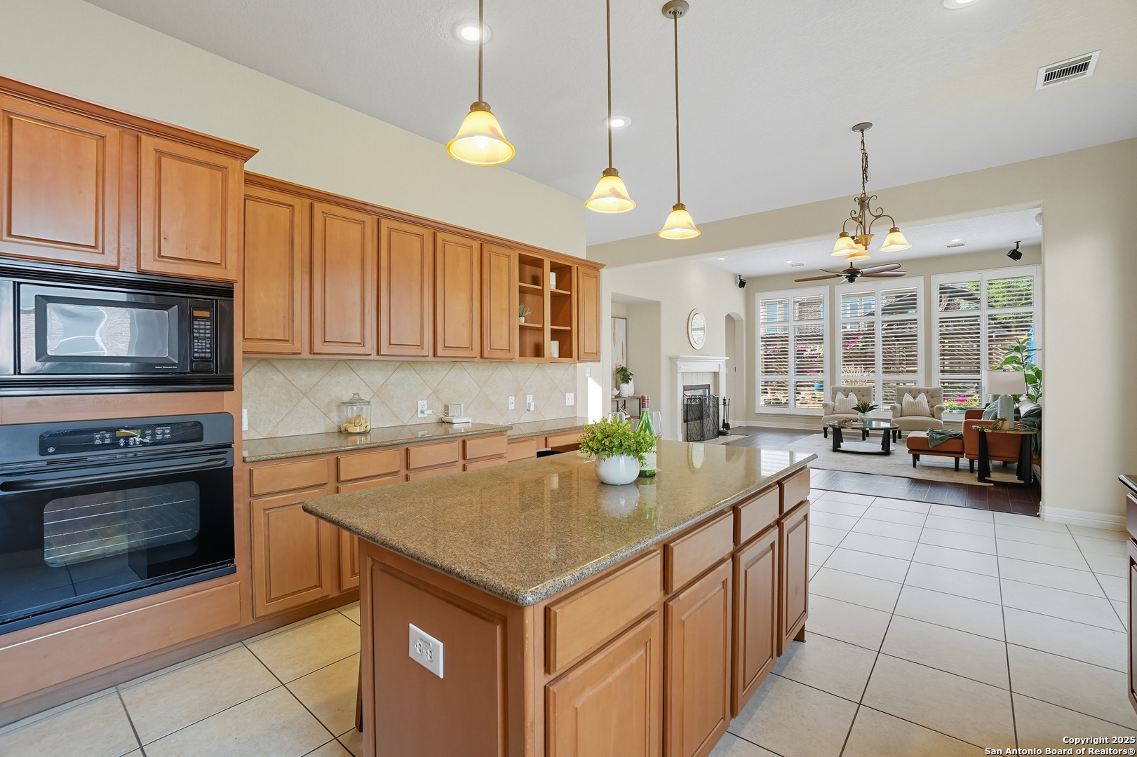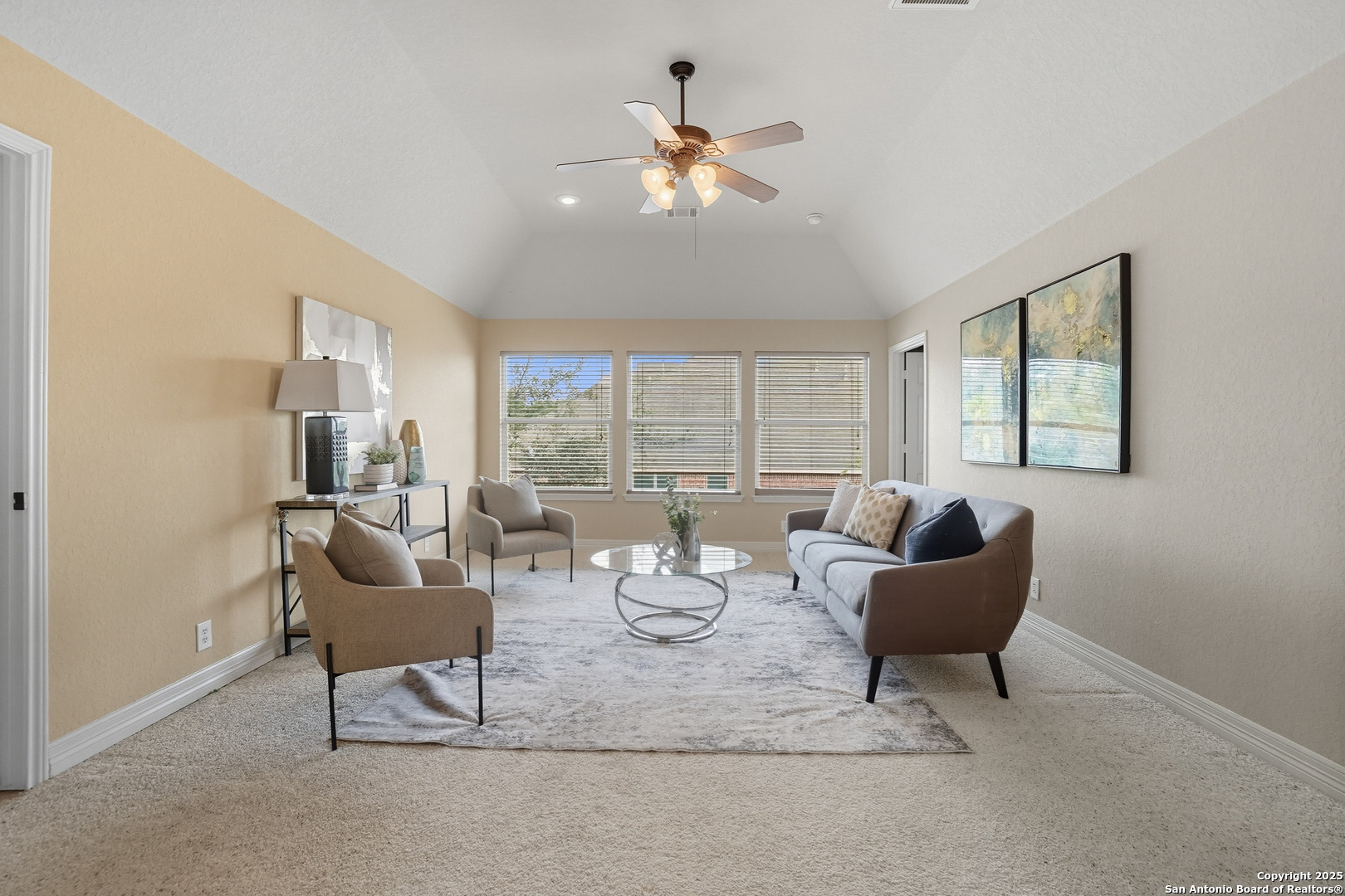 Nestled in the gated enclave of the Stone Oak Mesa Grande, this stately residence sits on a beautifully landscaped .36-acre lot. Featuring five bedrooms plus a dedicated study, the layout includes a private upstairs guest suite-ideal for visitors or multigenerational living. The expansive open-concept living room impresses with soaring ceilings, abundant natural light, and a cozy gas fireplace. The spacious island kitchen features gas cooking, extensive cabinetry, and generous prep space for any culinary endeavor. Upstairs offers a large second living room- perfect for media, play, or fitness, and a versatile bonus room. The primary suite is a peaceful retreat, complete with a sitting area. Step outside into a resort-style backyard oasis, highlighted by a custom heated pool and spa designed by Keith Zars Pools. Surrounded by mature landscaping and ample patio space, it's perfect for year-round entertaining. Additional highlights includes abundant storage space in the garage.